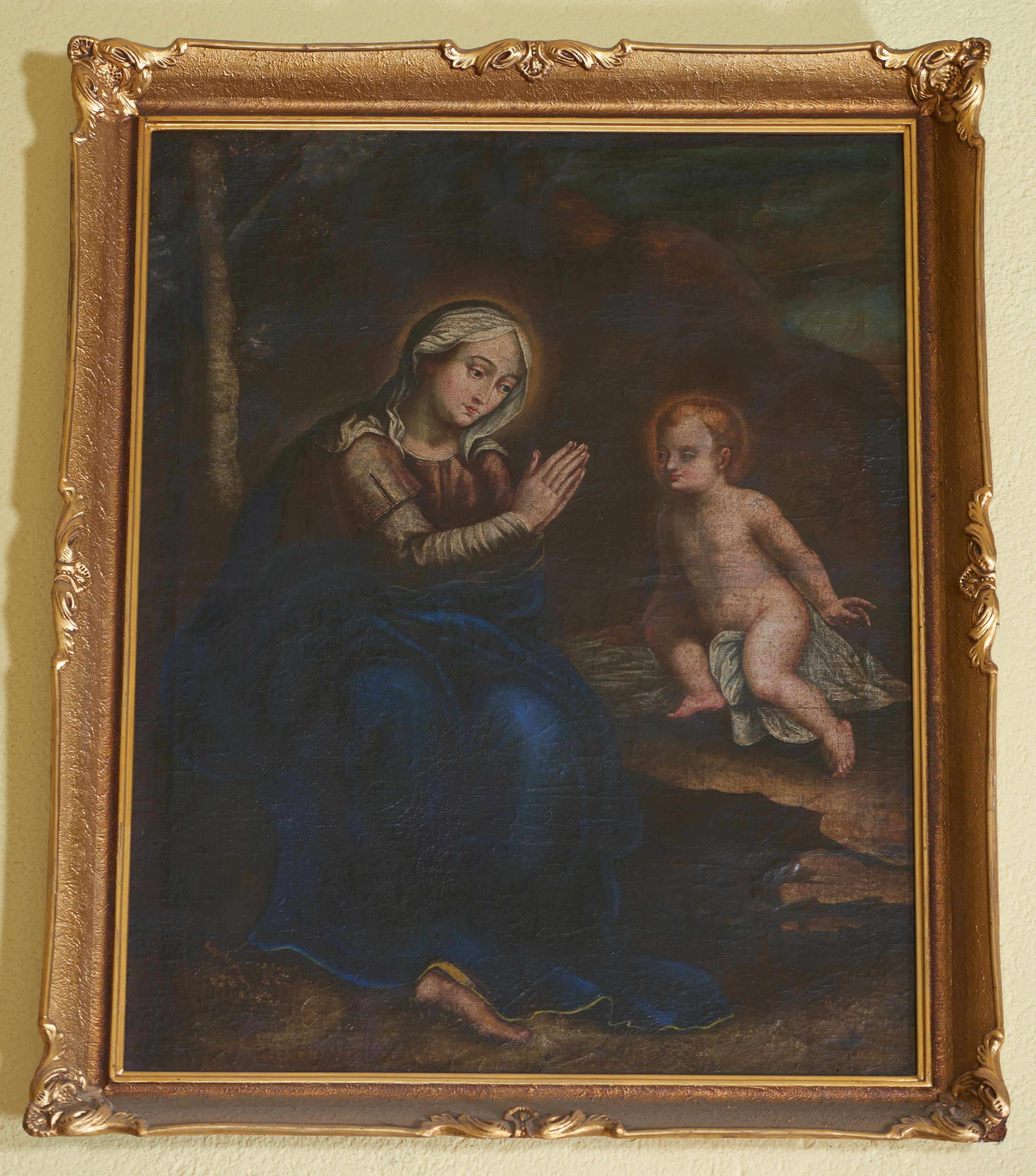 Obraz w formie stojącego prostokąta. W centrum siedząca postać Marii zwrócona trzy czwarte w lewo, delikatnie pochylona z rękami złożonymi w geście modlitwy. Przed nią siedzące na skale Dzieciątko, zwrócone trzy czwarte w prawo, delikatnie pochylone, opierające ciężar ciała na prawej ręce. Maria o delikatnych rysach: owalnej twarzy, małym nosie i drobnych ustach. Na głowie ma biały welon przykrywający jej włosy. Ubrana jest w bladoróżową suknię oraz silnie udrapowany ciemnogranatowy płaszcz, spod którego widoczna jest bosa stopa. Dzieciątko o jasnej, różowawej karnacji. Twarz pełna o małym nosie i głęboko osadzonych oczach. Głowę okalają krótkie, złote włosy. Wokół głów Marii i Dzieciątka złote, świetliste nimby. W tle pejzaż z widocznymi fragmentami drzew w brunatnej i ciemnozielonej tonacji. Rama złocona, fakturowana, w narożach i pośrodku boków zdobiona stylizowaną wicią roślinną.