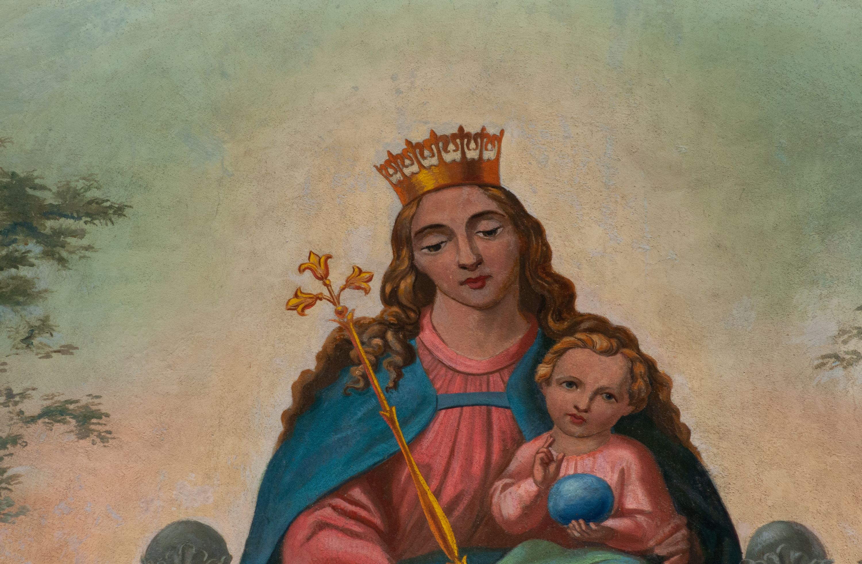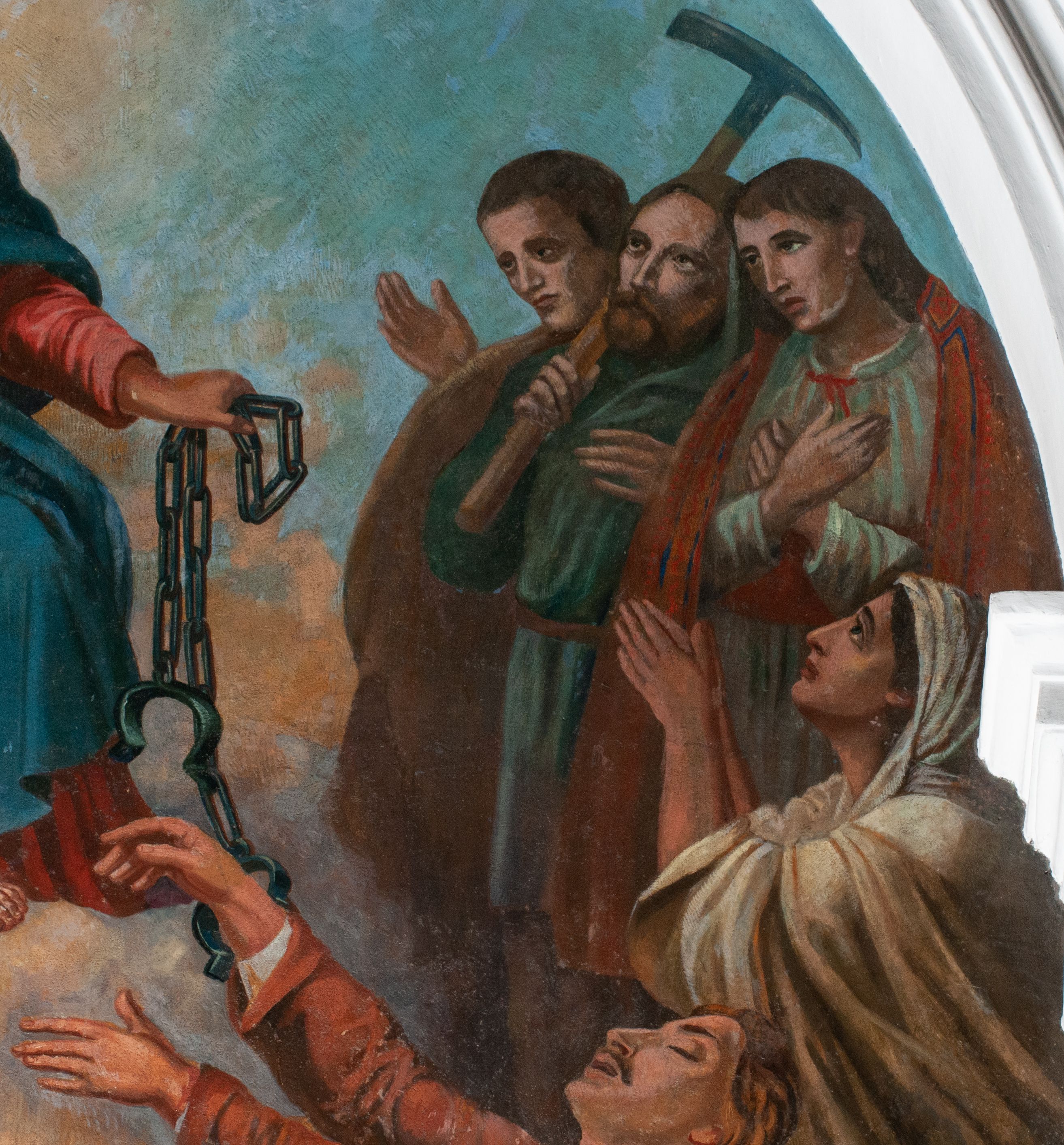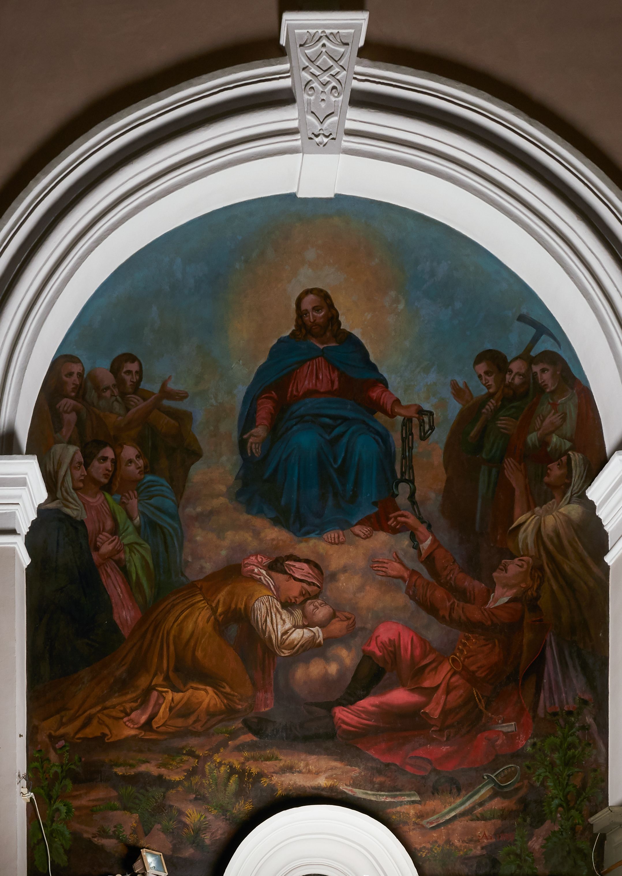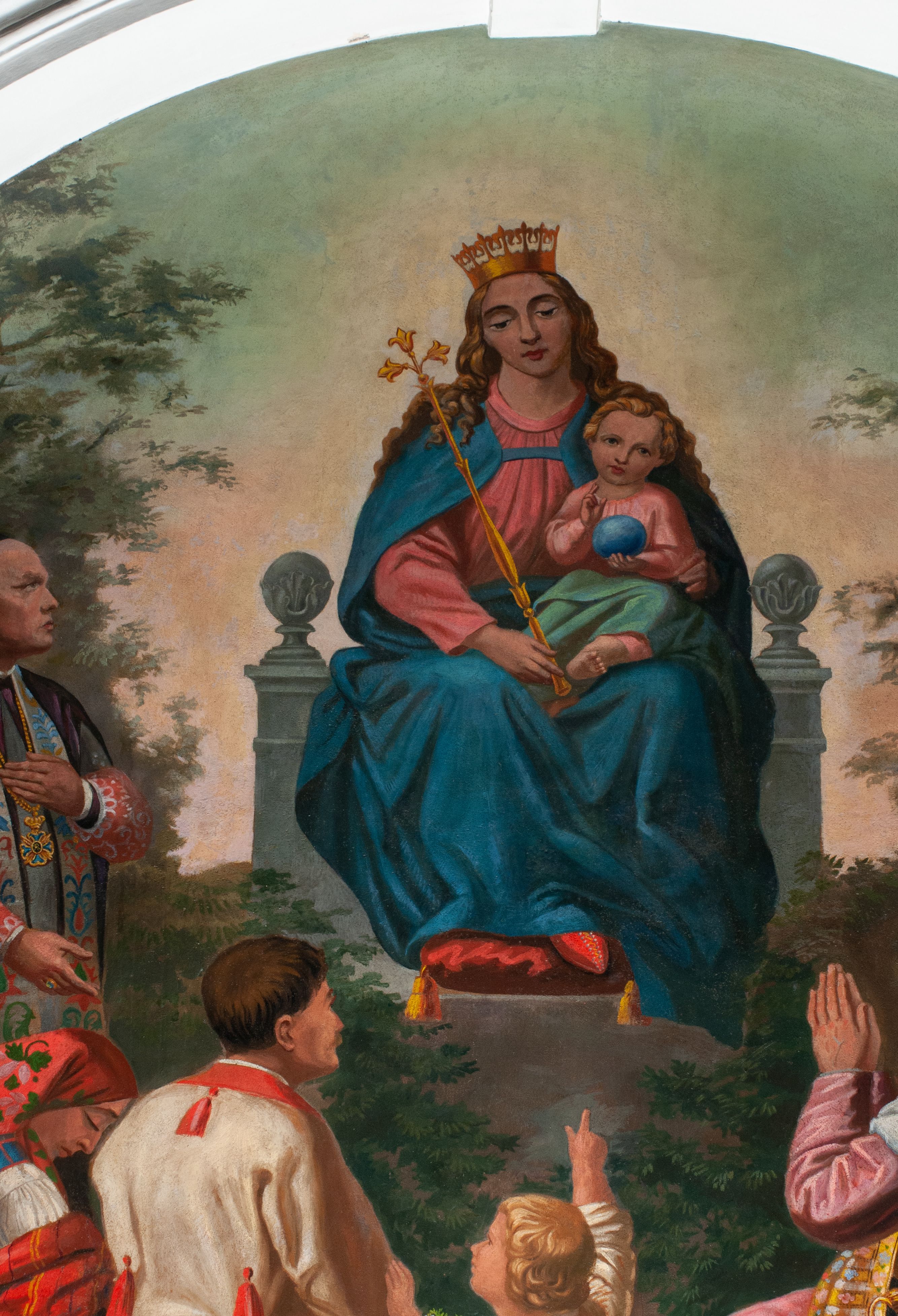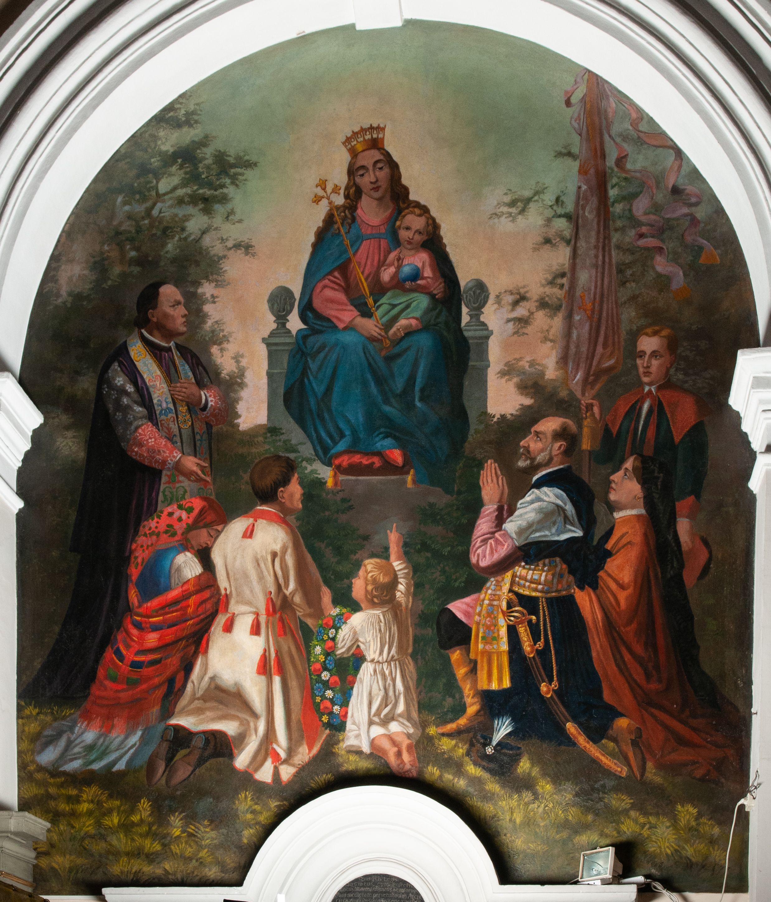 Fresk wkomponowany w arkadę zamkniętą półkoliście, w ścianie południowej prezbiterium, nad portalem do aneksu. Ukazuje siedzącą na tronie Matkę Boską z Dzieciątkiem na kolanach oraz klęczących i stojących przed nią od lewej proboszcza Józefa Krzemińskiego, rodzinę w stroju ludowym, Izabelę i Felicjana Szybalskich oraz chłopca z chorągwią w ręku.