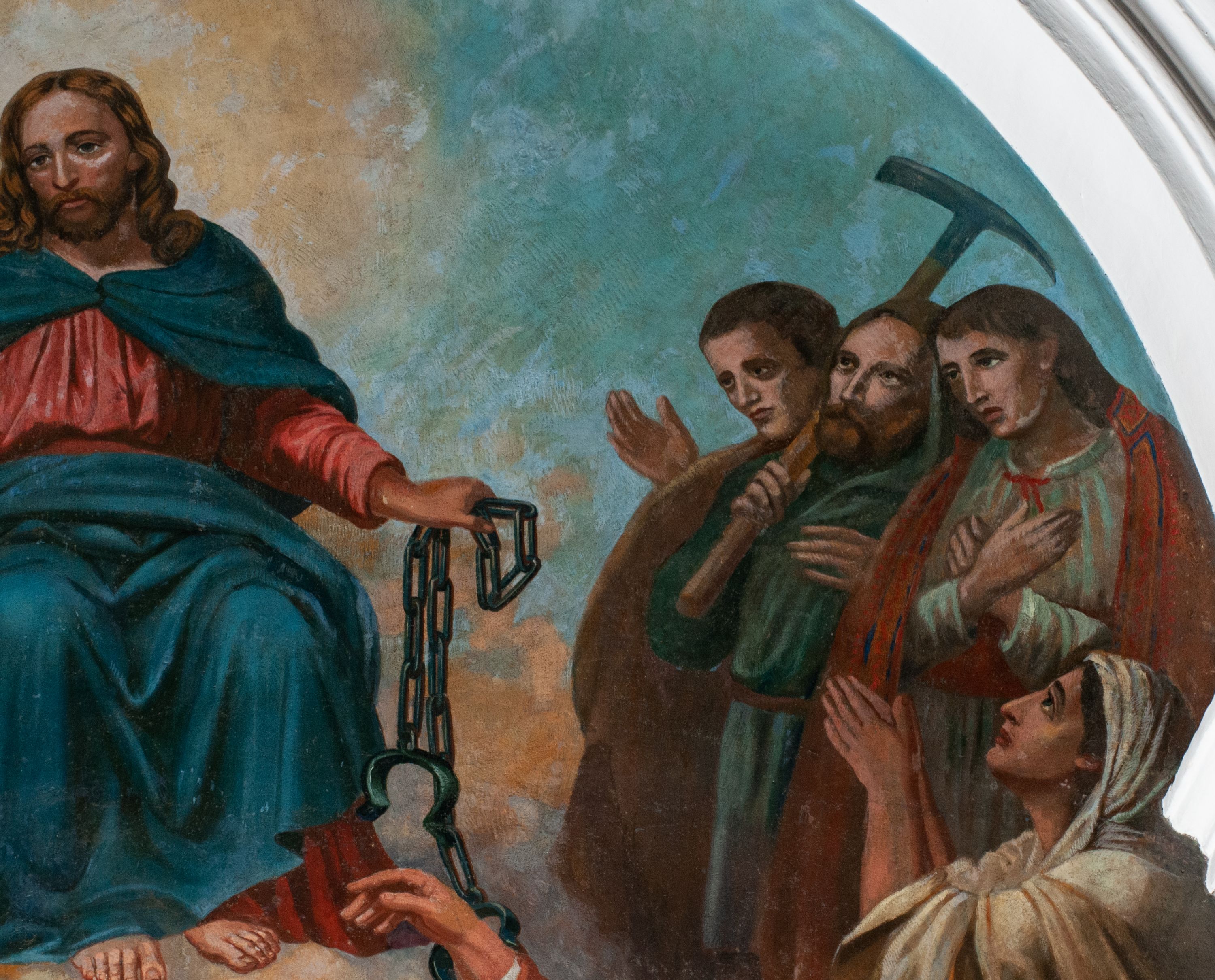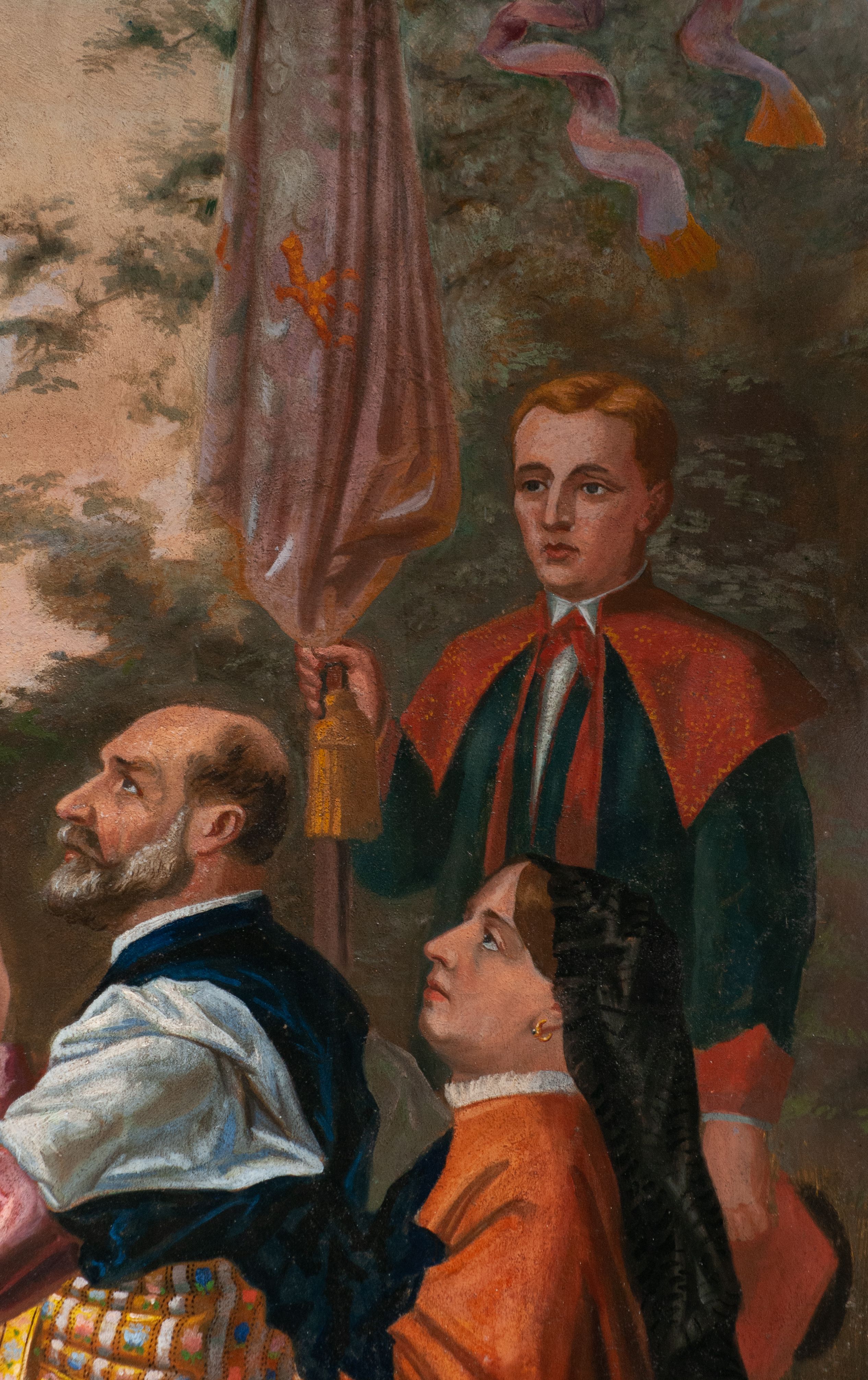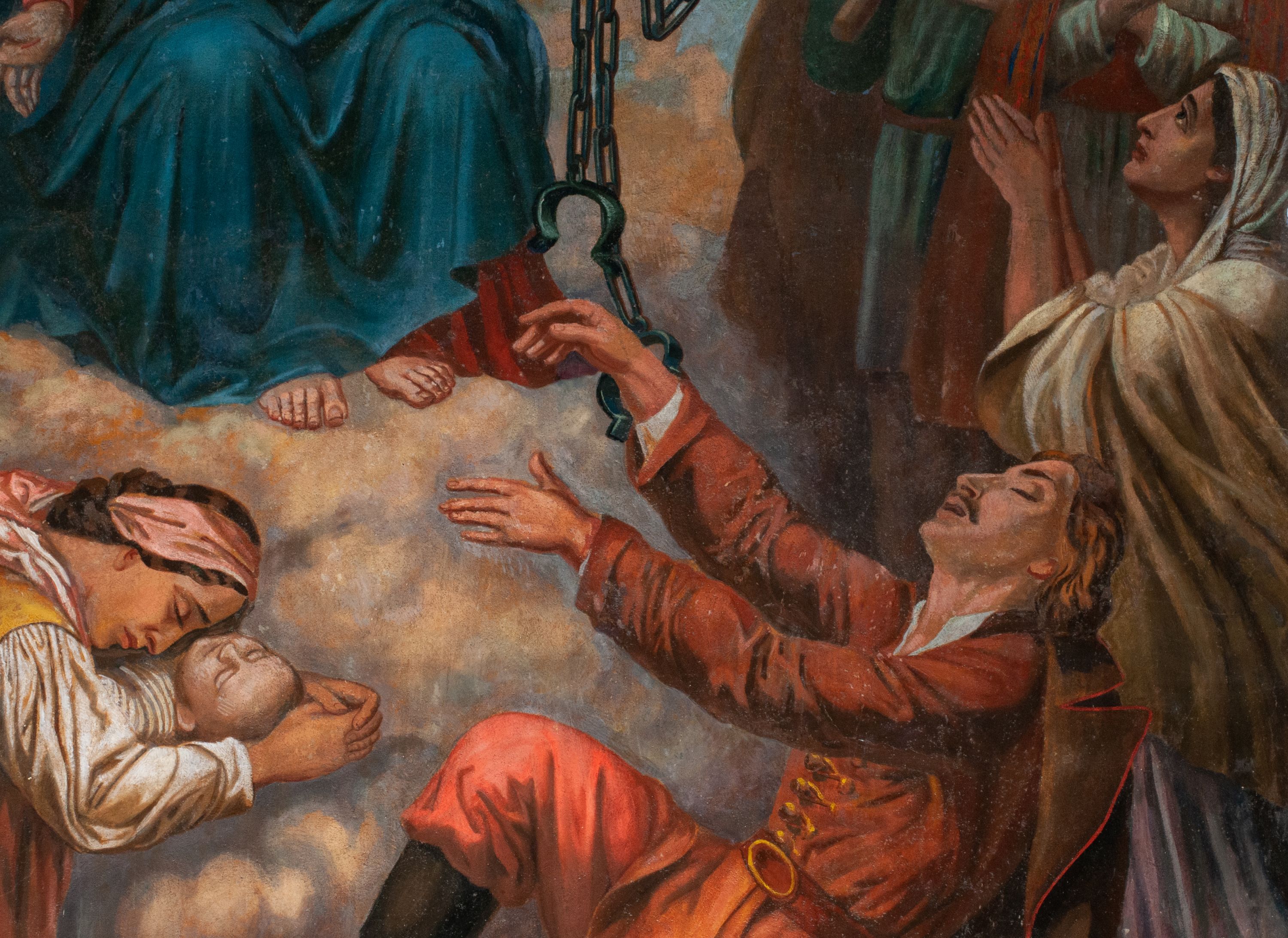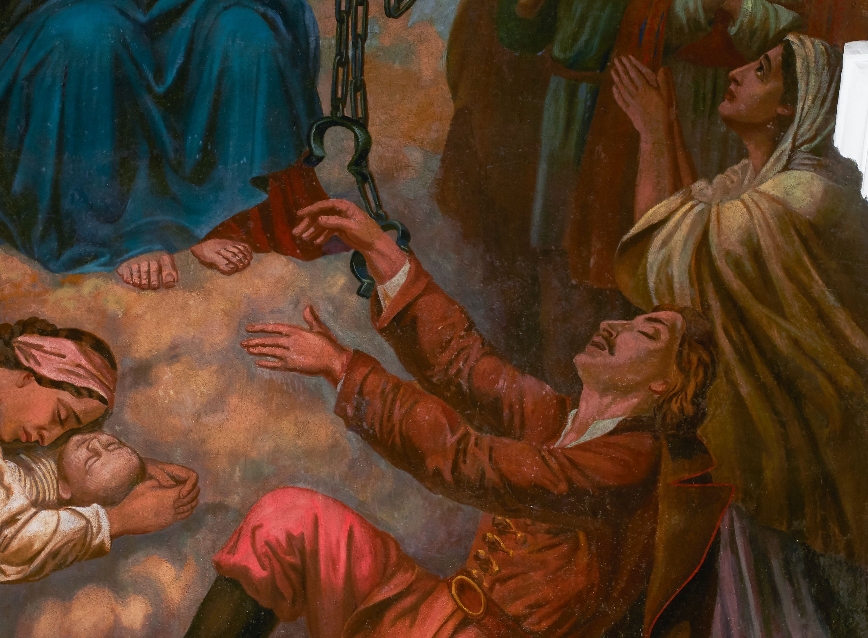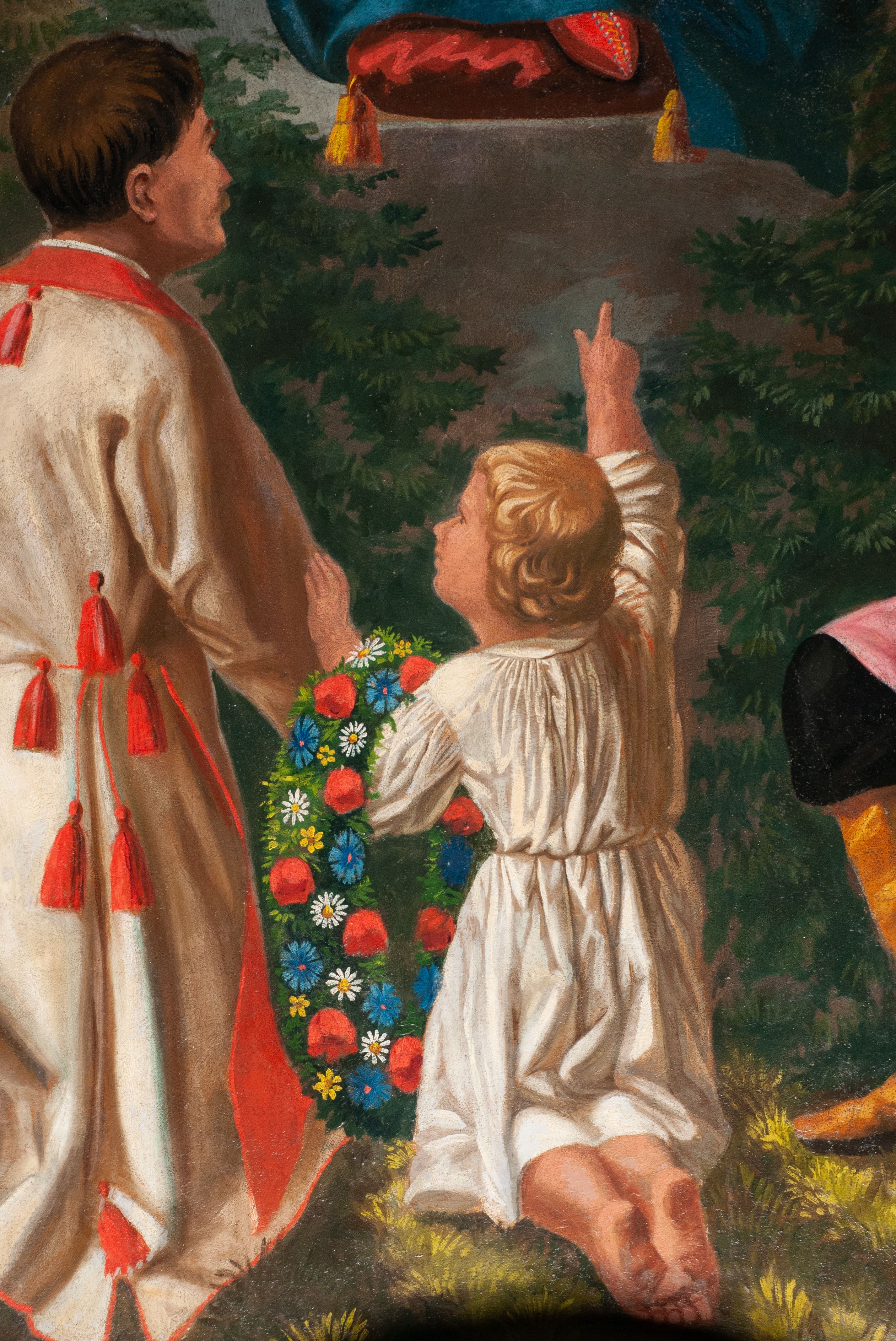 Fresk wkomponowany w arkadę zamkniętą półkoliście, w ścianie południowej prezbiterium, nad portalem do aneksu. Ukazuje siedzącą na tronie Matkę Boską z Dzieciątkiem na kolanach oraz klęczących i stojących przed nią od lewej proboszcza Józefa Krzemińskiego, rodzinę w stroju ludowym, Izabelę i Felicjana Szybalskich oraz chłopca z chorągwią w ręku.
