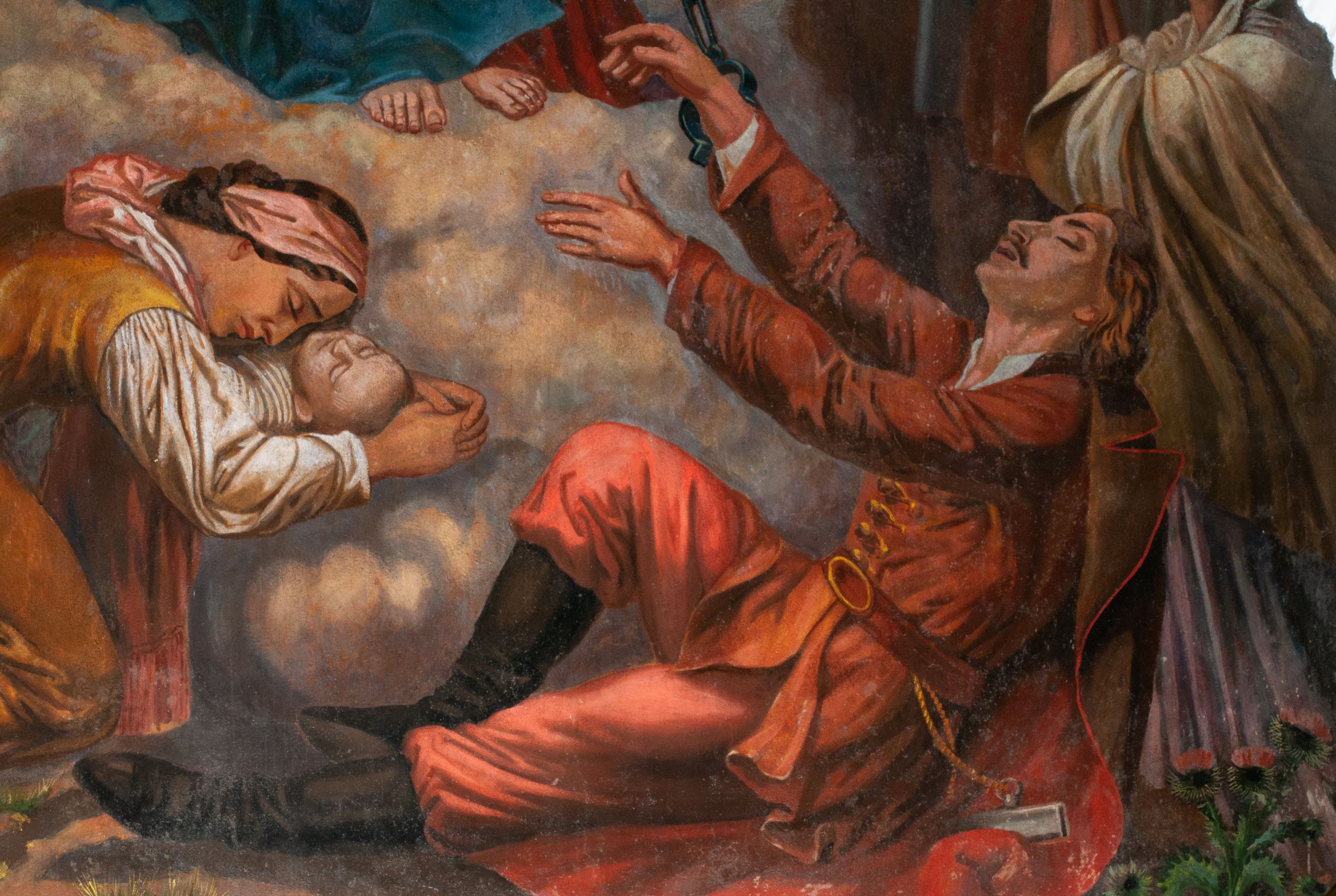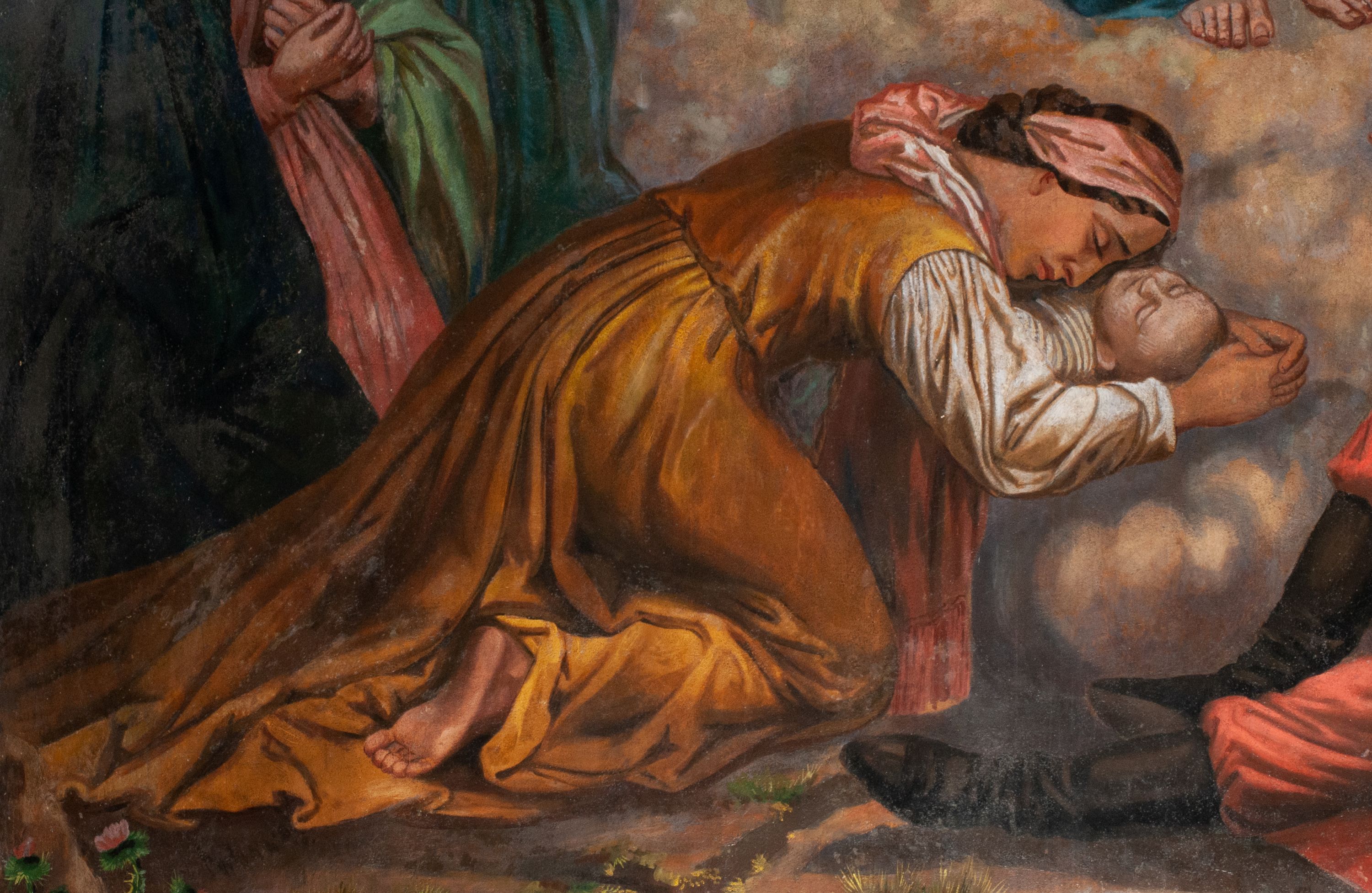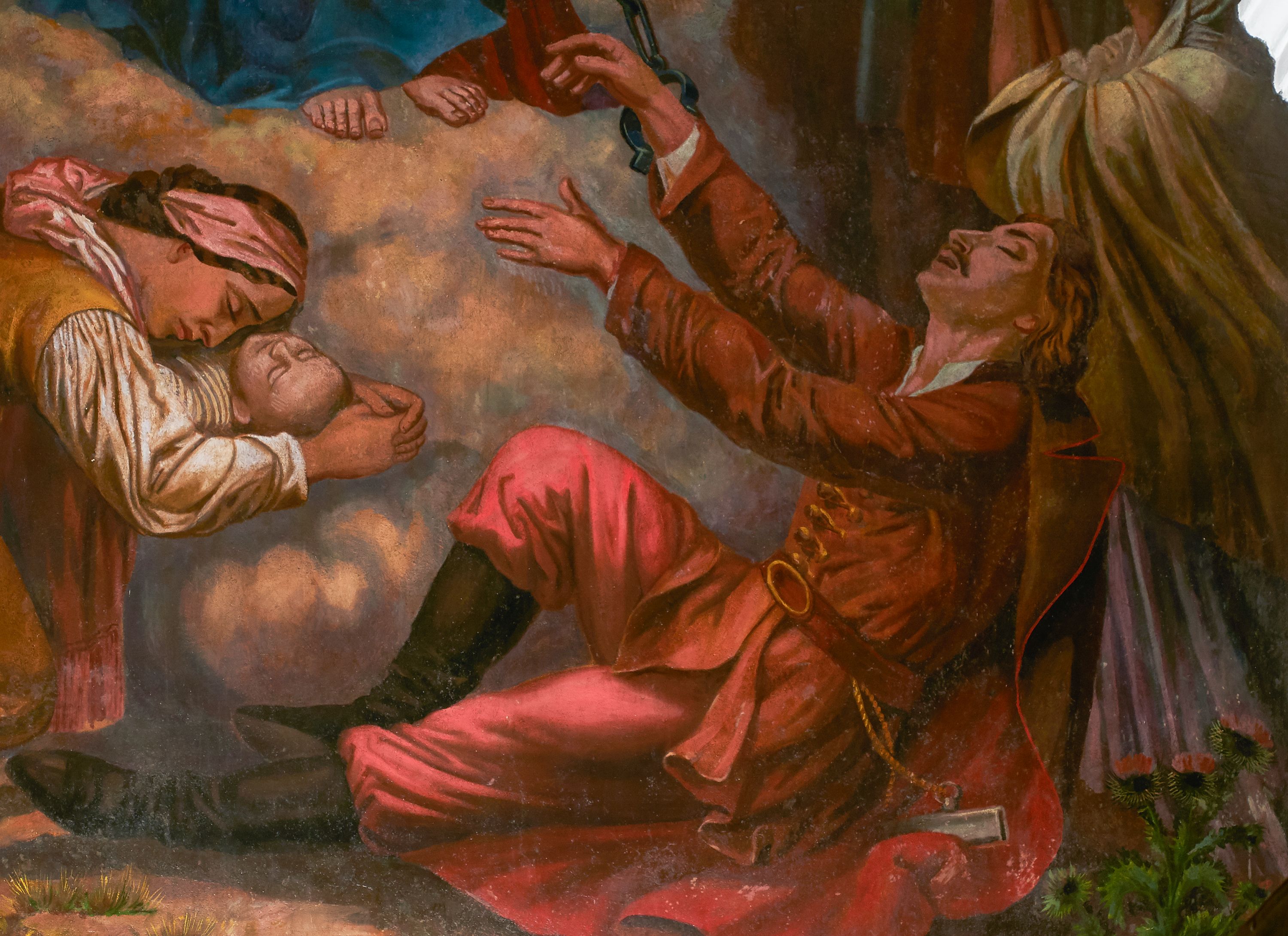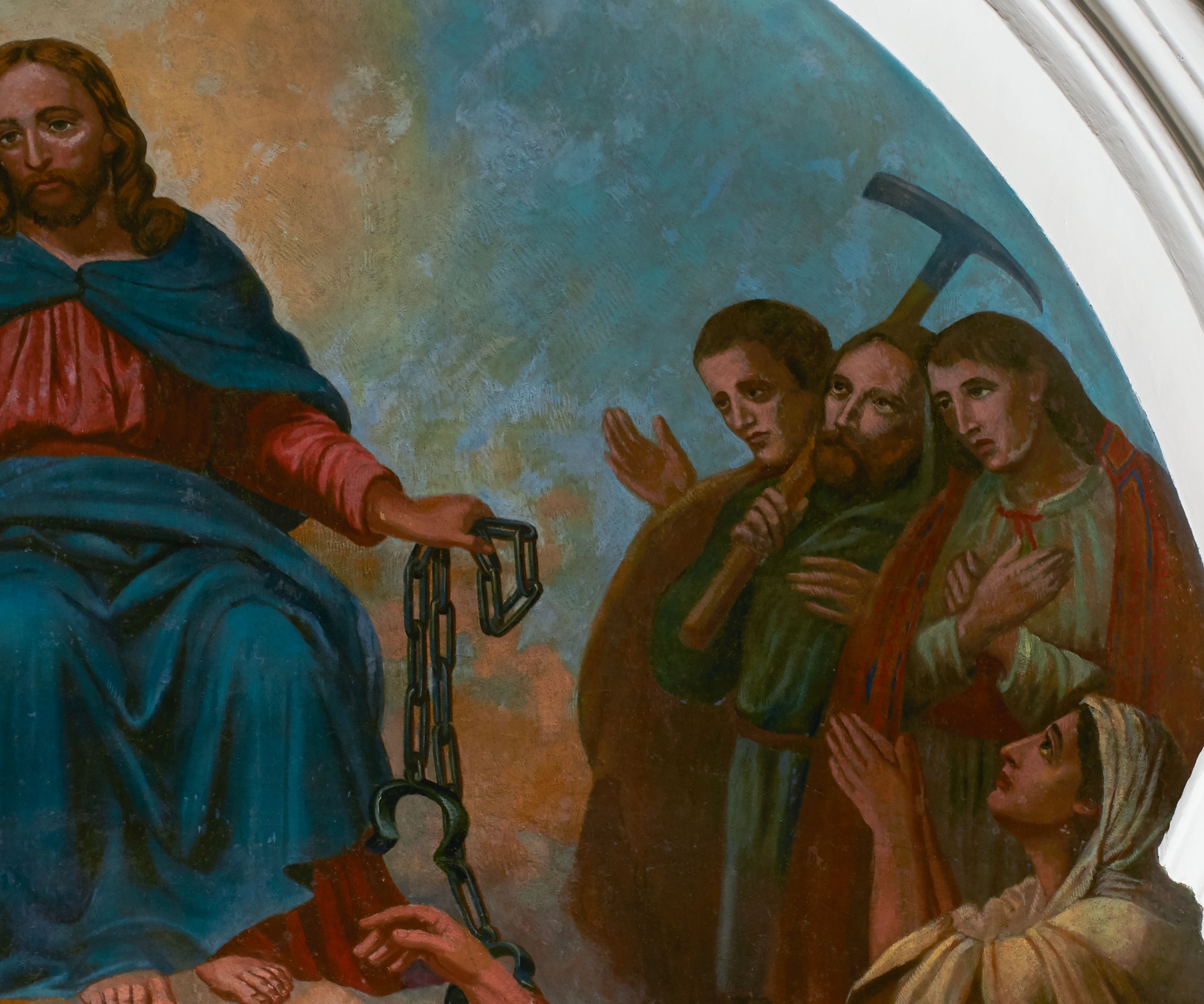 Fresk wkomponowany w arkadę zamkniętą półkoliście, w ścianie południowej prezbiterium, nad portalem do aneksu. Ukazuje siedzącą na tronie Matkę Boską z Dzieciątkiem na kolanach oraz klęczących i stojących przed nią od lewej proboszcza Józefa Krzemińskiego, rodzinę w stroju ludowym, Izabelę i Felicjana Szybalskich oraz chłopca z chorągwią w ręku.