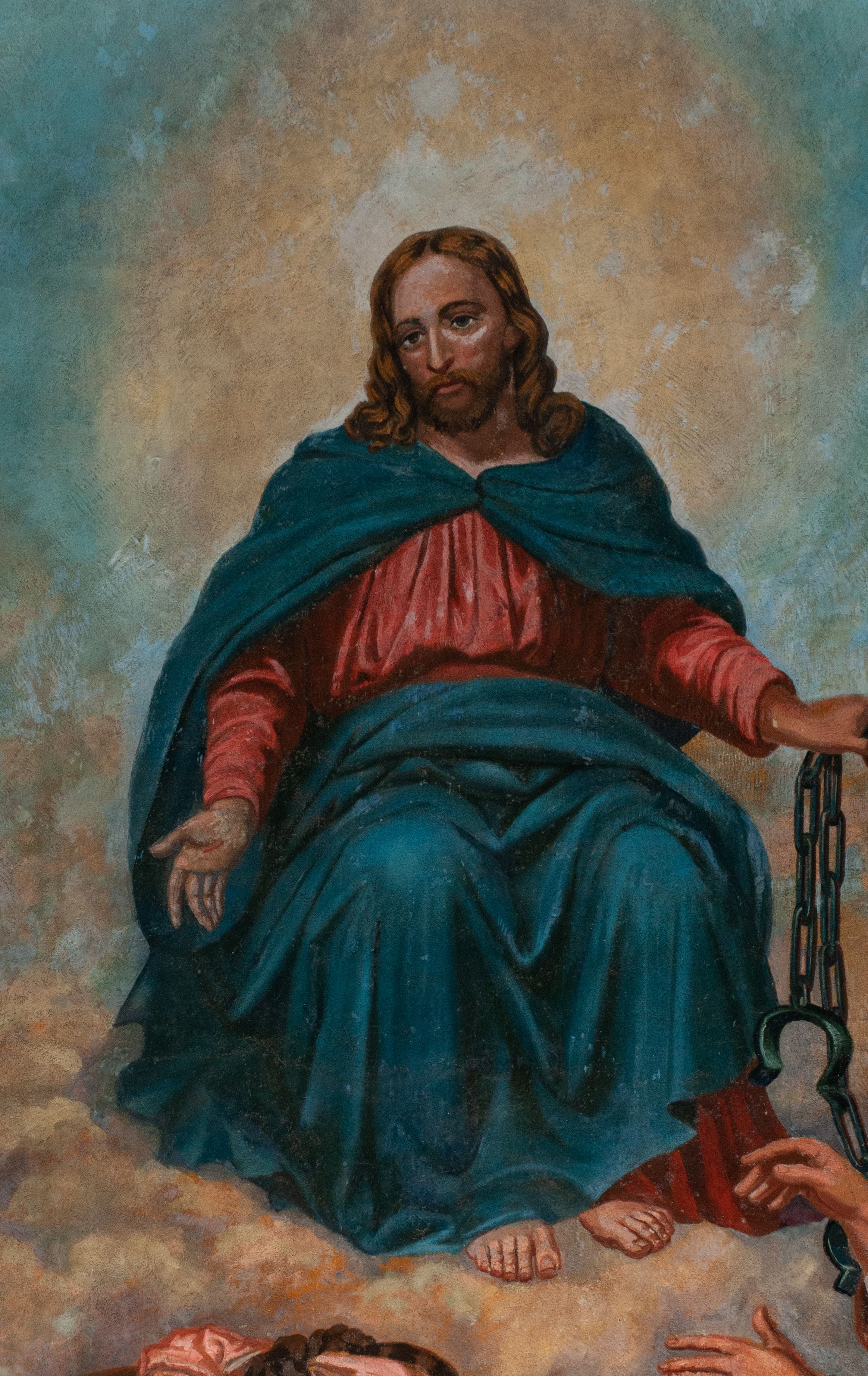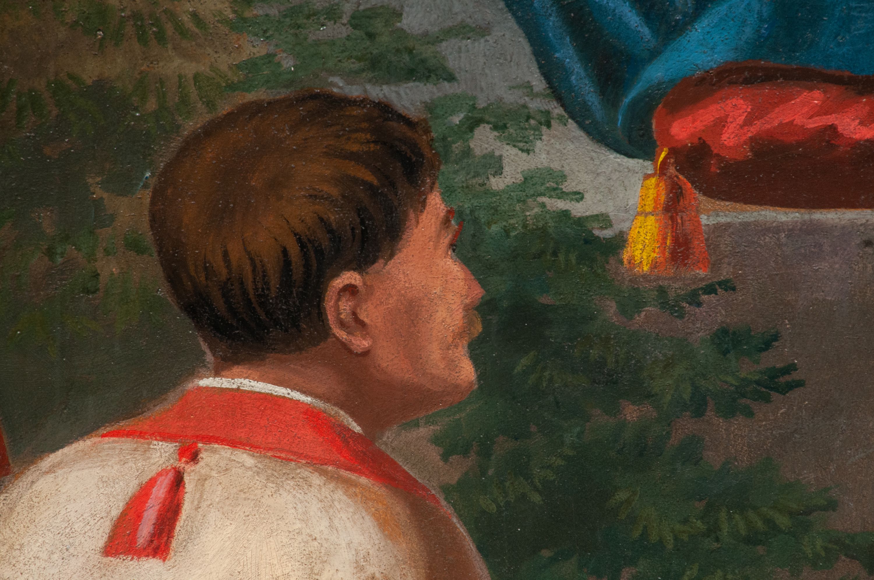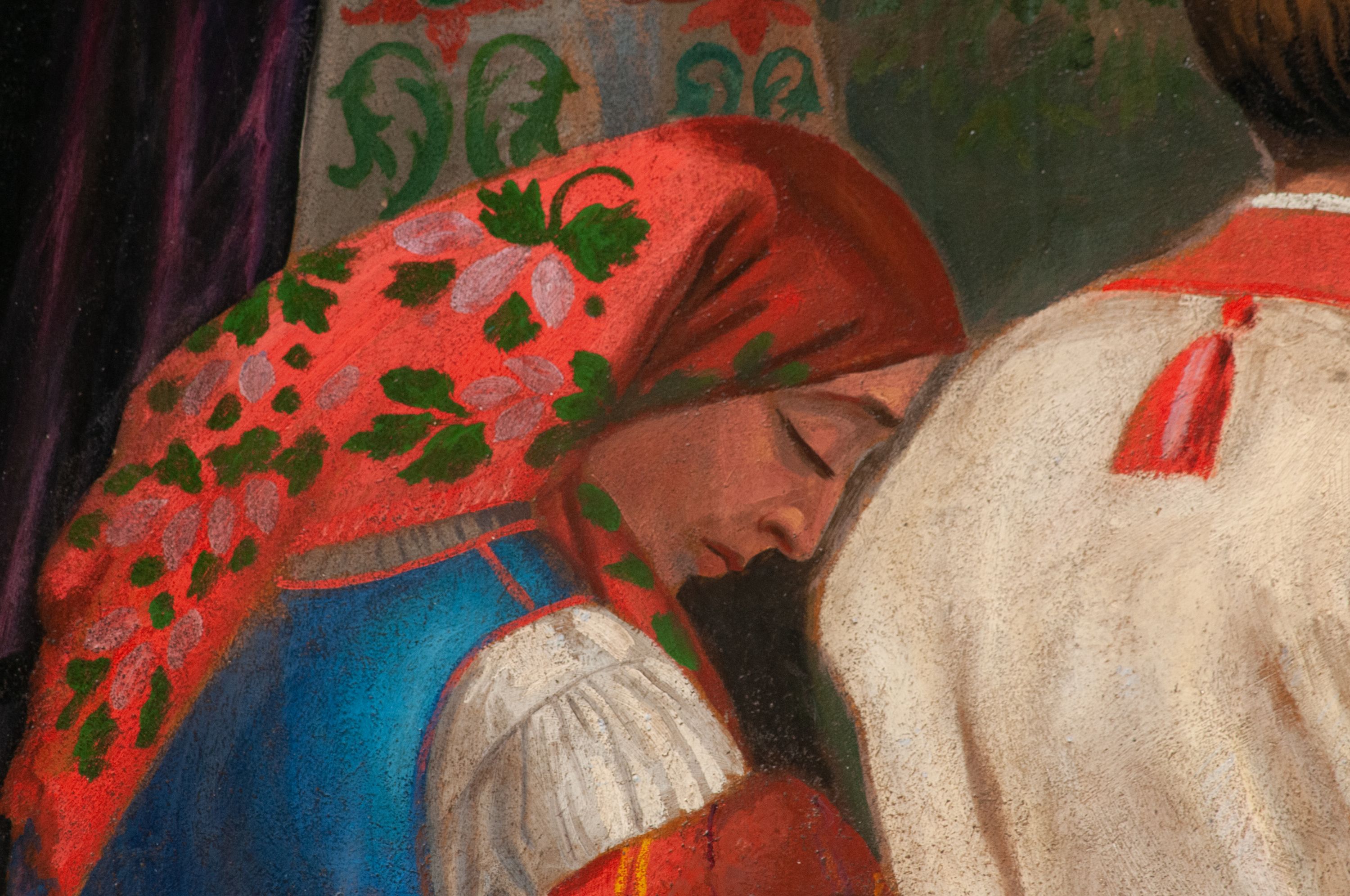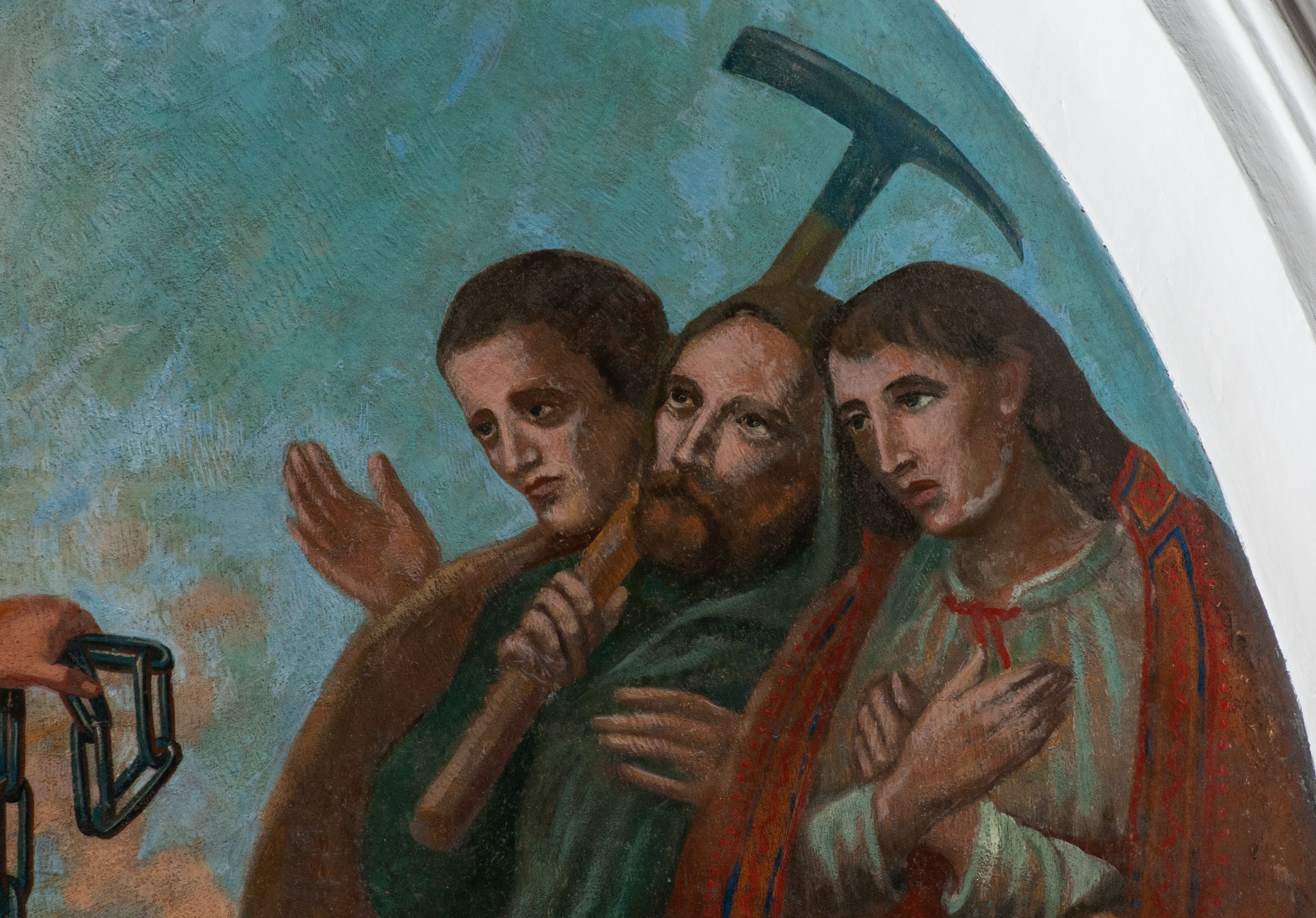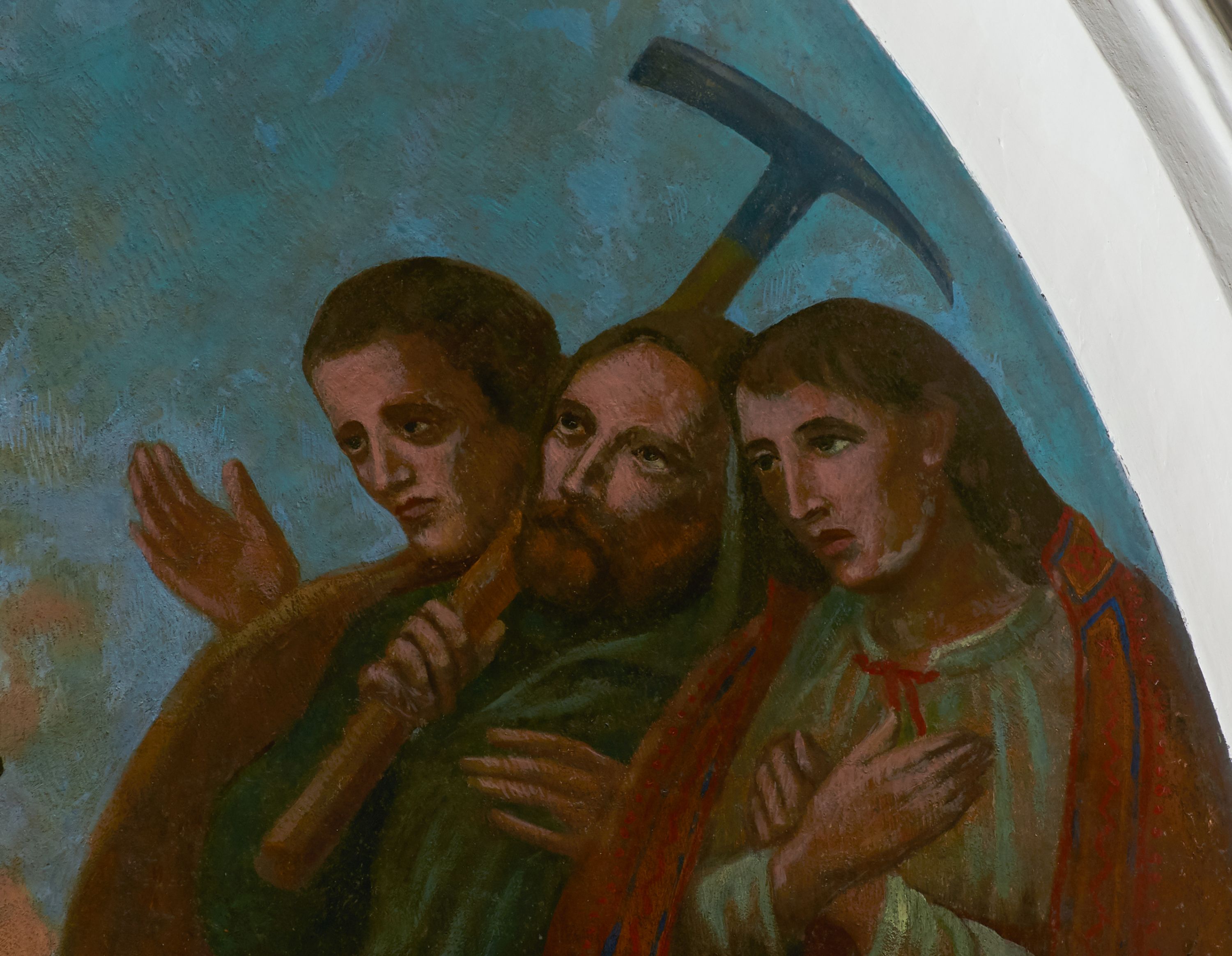 Fresk wkomponowany w arkadę zamkniętą półkoliście, w ścianie południowej prezbiterium, nad portalem do aneksu. Ukazuje siedzącą na tronie Matkę Boską z Dzieciątkiem na kolanach oraz klęczących i stojących przed nią od lewej proboszcza Józefa Krzemińskiego, rodzinę w stroju ludowym, Izabelę i Felicjana Szybalskich oraz chłopca z chorągwią w ręku.
