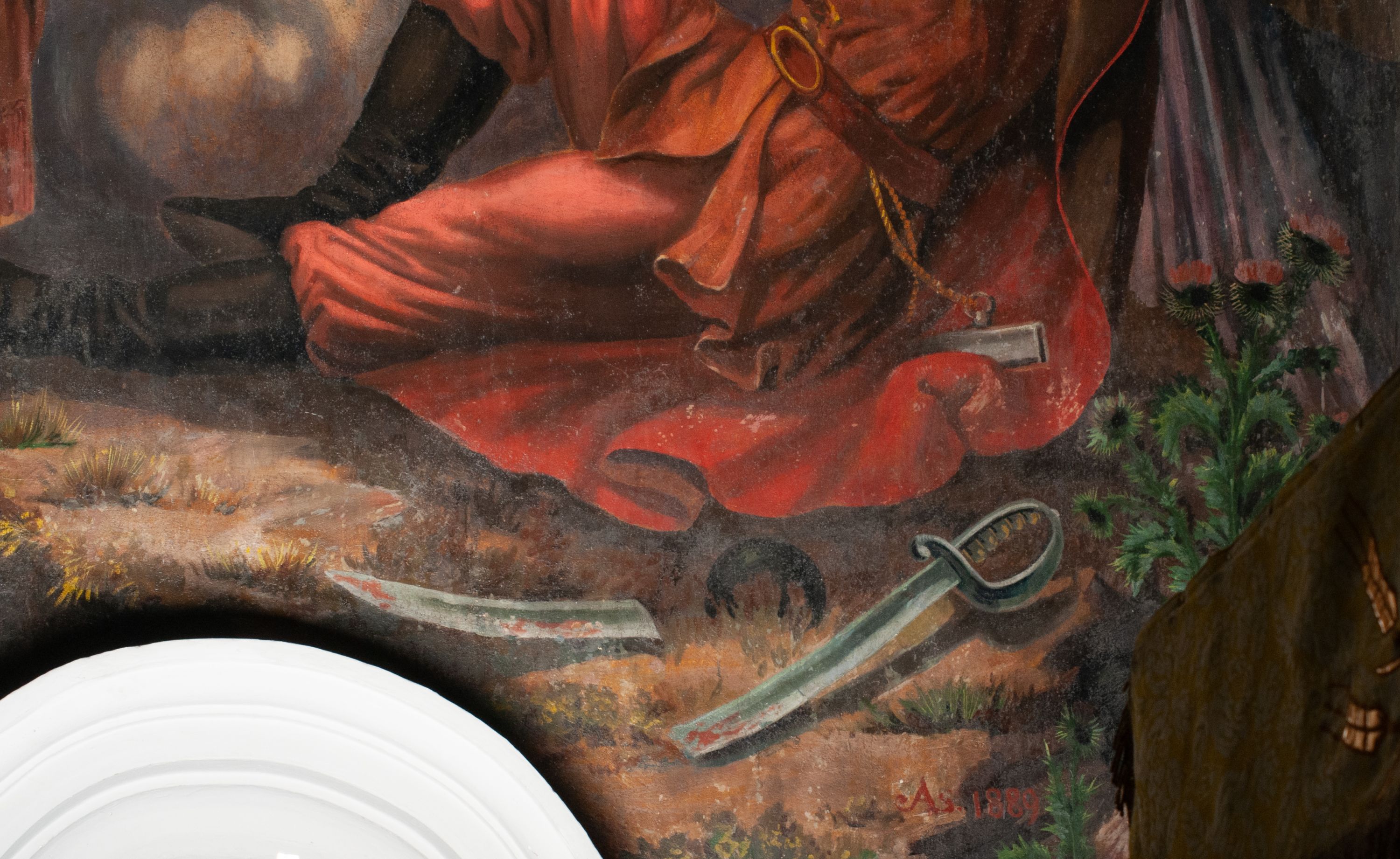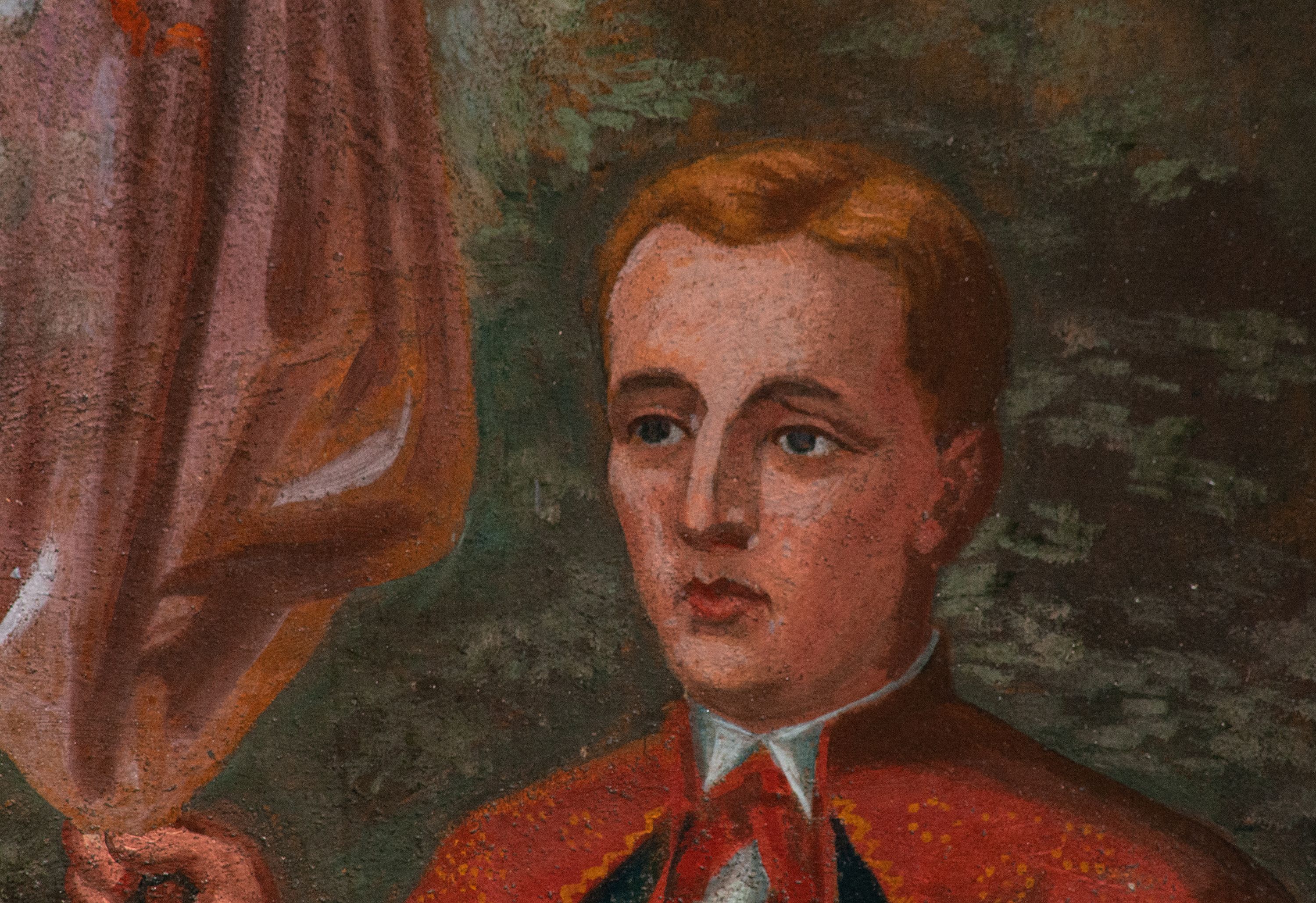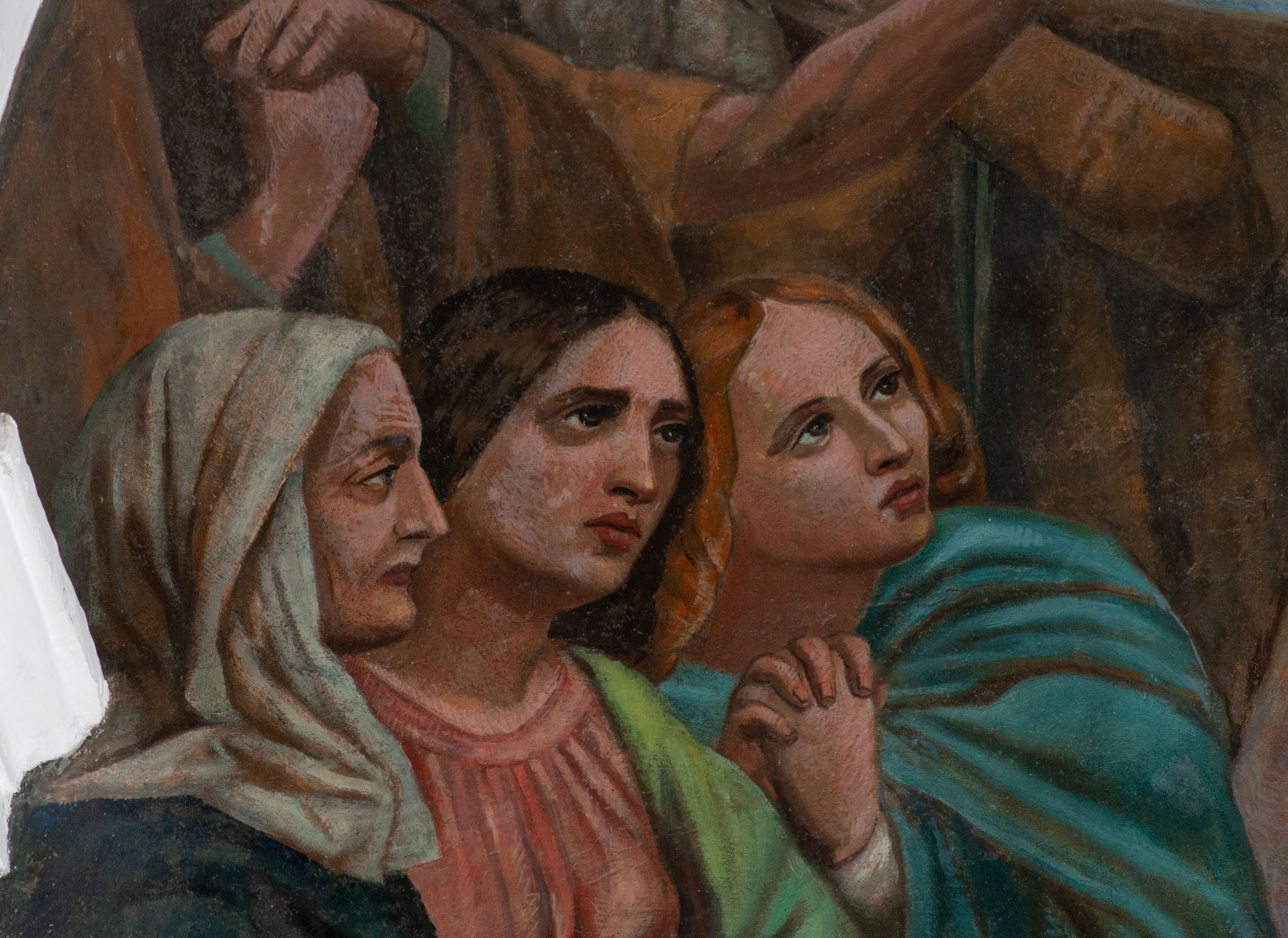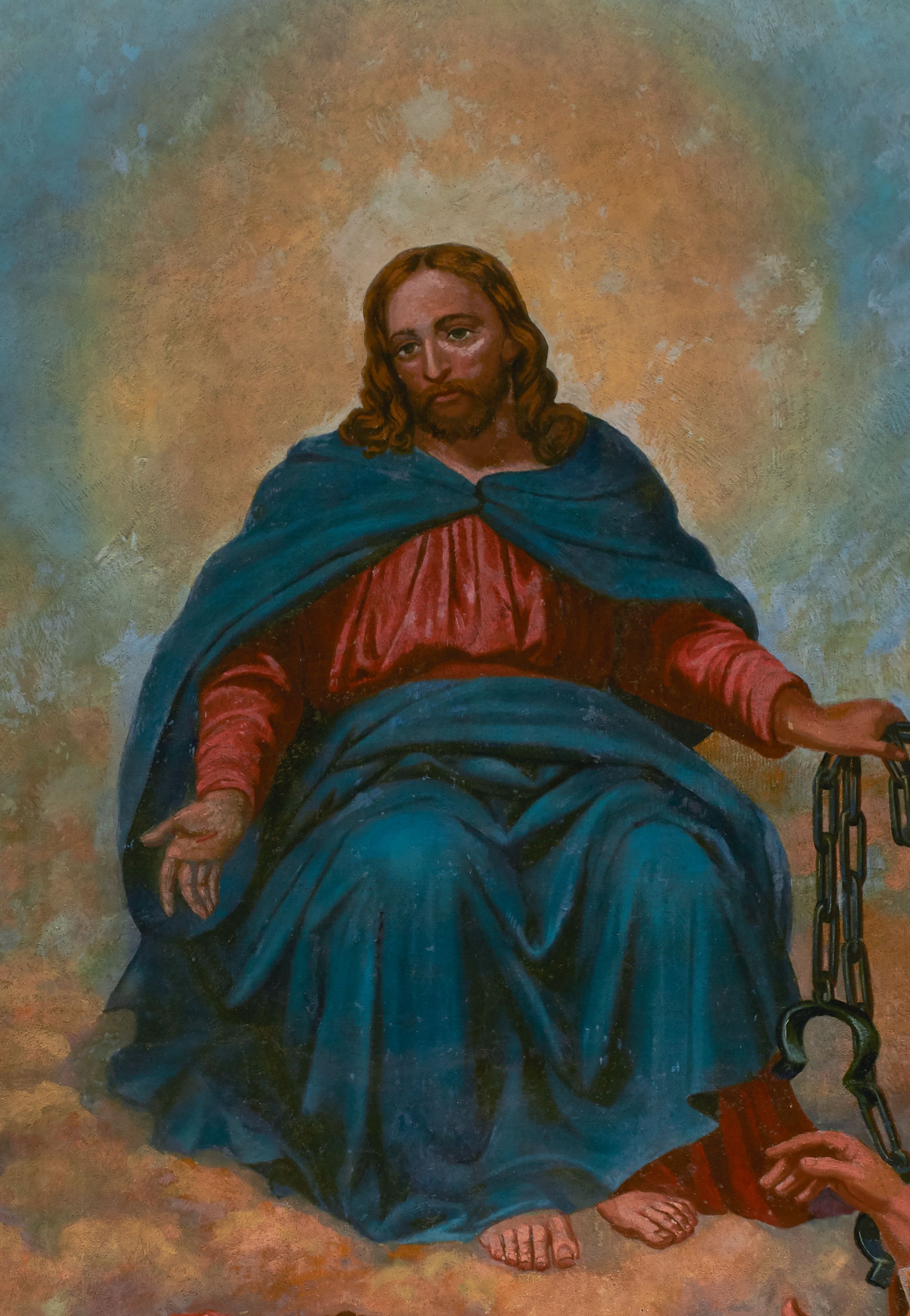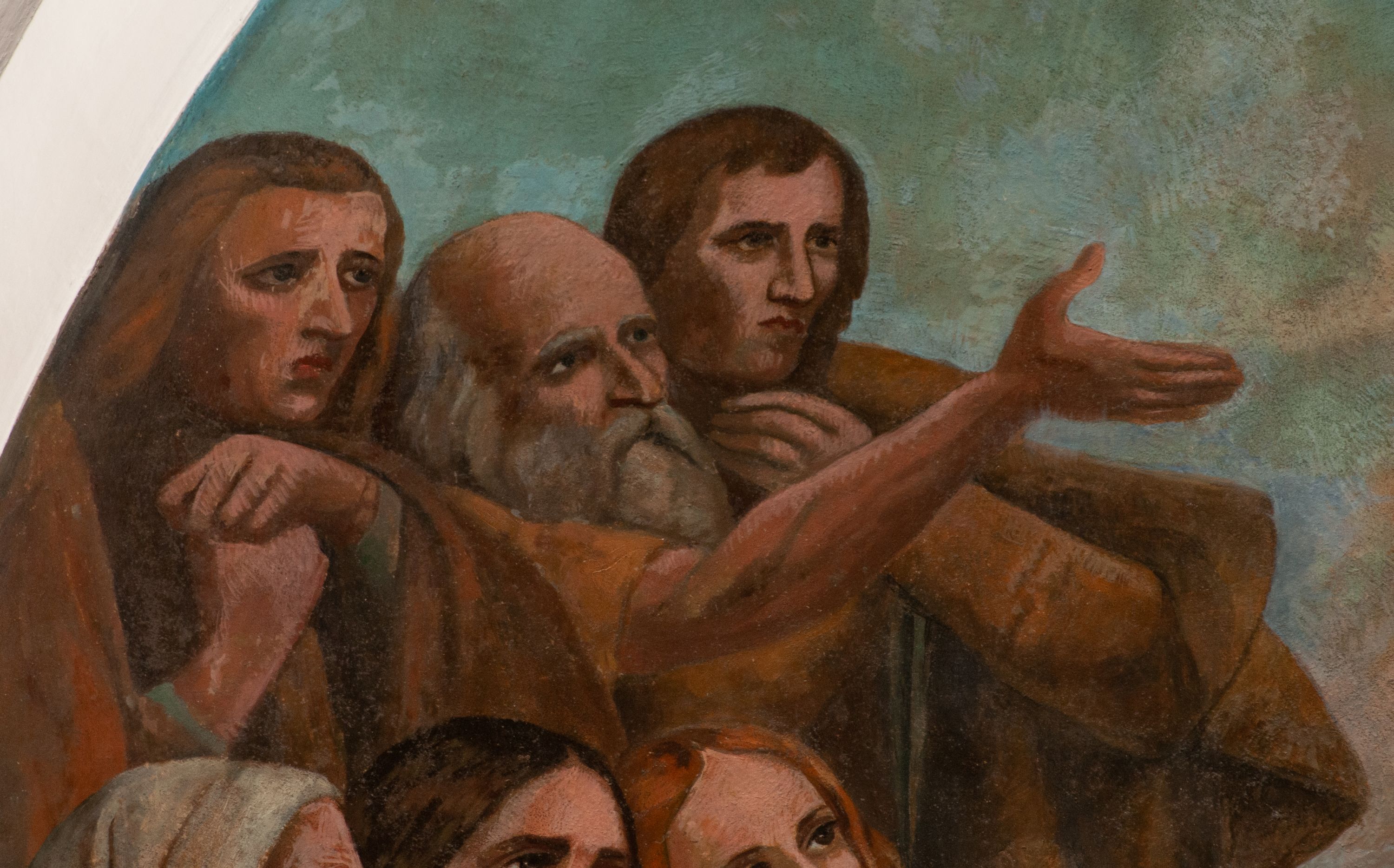Fresk wkomponowany w arkadę zamkniętą półkoliście, w ścianie południowej prezbiterium, nad portalem do aneksu. Ukazuje siedzącą na tronie Matkę Boską z Dzieciątkiem na kolanach oraz klęczących i stojących przed nią od lewej proboszcza Józefa Krzemińskiego, rodzinę w stroju ludowym, Izabelę i Felicjana Szybalskich oraz chłopca z chorągwią w ręku.
