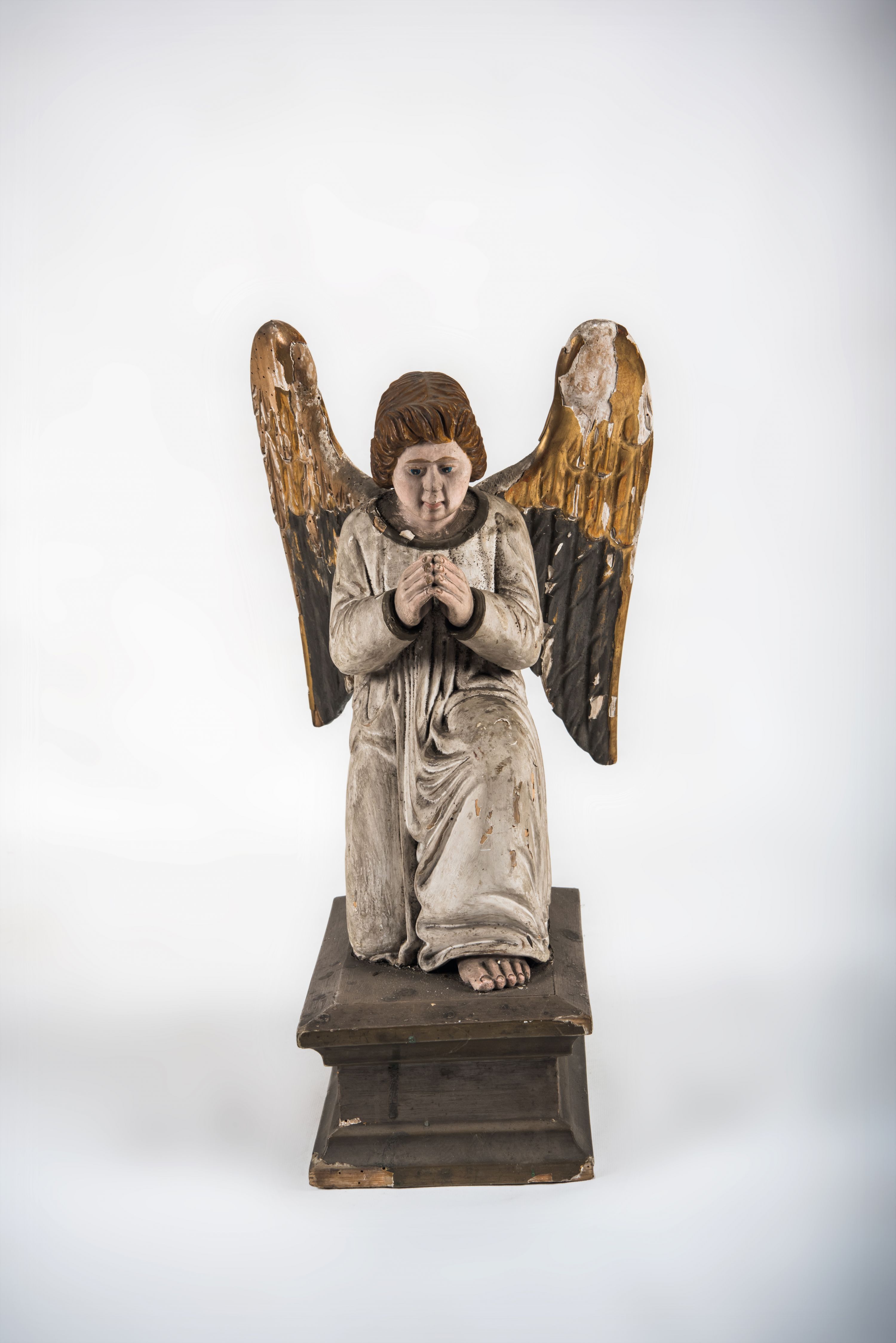 Pełnoplastyczna figura ukazuje przyklękającego na prawe kolano uskrzydlonego anioła. Anioł o lekko pochylonej głowie do przodu ma modlitewnie złożone ręce przed sobą. Jego owalną twarz o jasnej karnacji, drobnym nosie i ustach otaczają krótkie brązowe włosy. Postać ubrana jest w białą, luźną tunikę. Umieszono ją na prostopadłościennym drewnianym postumencie zaopatrzonym w niski profilowany cokół oraz gzyms.