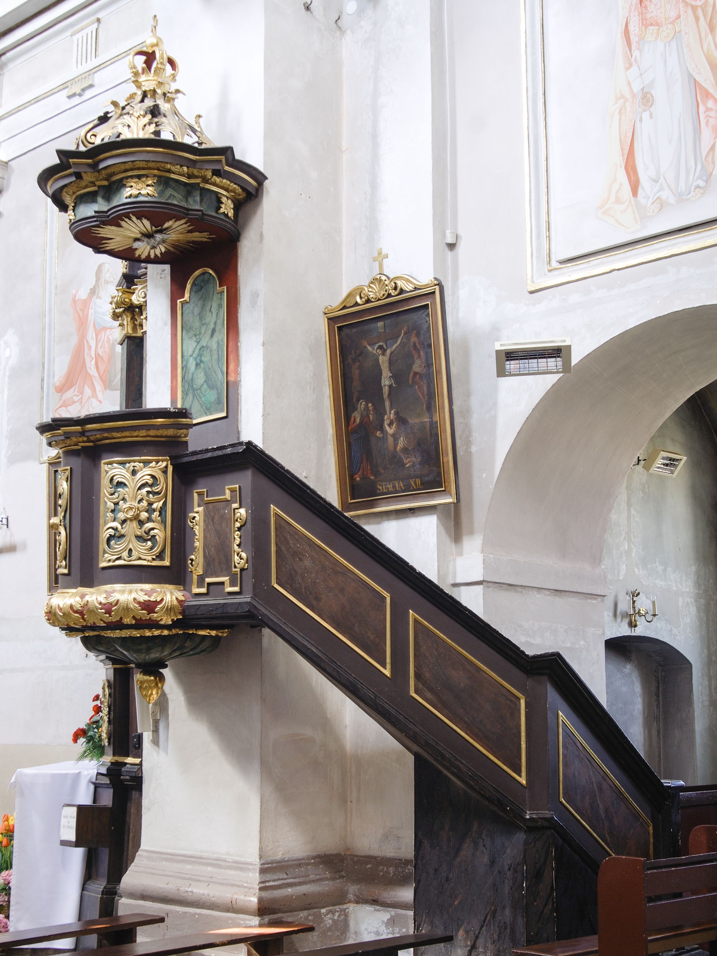 Ambona wisząca, przyścienna, umieszczona na ścianie łuku tęczowego, z parapetem dziś nieistniejących schodów od strony prezbiterium i usytuowanej przy nim kaplicy. Kosz ambony założony na rzucie trójliścia z trójkątnymi występami, wsparty na puklowanej konsoli z podwieszoną szyszką. Dolna część ambony wybrzuszona, pokryta rozłożystymi liśćmi akantu, kosz prosty na rzucie odcinków koła z prostokątnymi płycinami wypełnionymi liśćmi akantu, zakończony profilowanym gzymsem. Zaplecek z profilowaną płyciną zakończoną łukiem półkolistym nadwieszonym. Nad koszem baldachim powielający rzut kosza, zwieńczony silnie wystającym gzymsem, z podwieszoną w podniebieniu gołębicą Ducha Świętego na tle glorii promienistej. Nad baldachimem kabłąki w formie spływów wolutowych opatrzonych liśćmi akantu, podtrzymujące koronę zamkniętą z kulą i krzyżem. Parapet schodów z dekoracją w postaci trzech płycin w kształcie równoległoboku obwiedzionych profilowanymi ramami. Płycina w polu łączącym parapet schodów z podestem przed amboną w formie stojącego prostokąta z uszakami, ujętego motywami roślinnymi. Ambona w kolorze czarnym, z zielonymi i czerwonymi imitacjami marmoryzacji, ze złoconymi ornamentami.