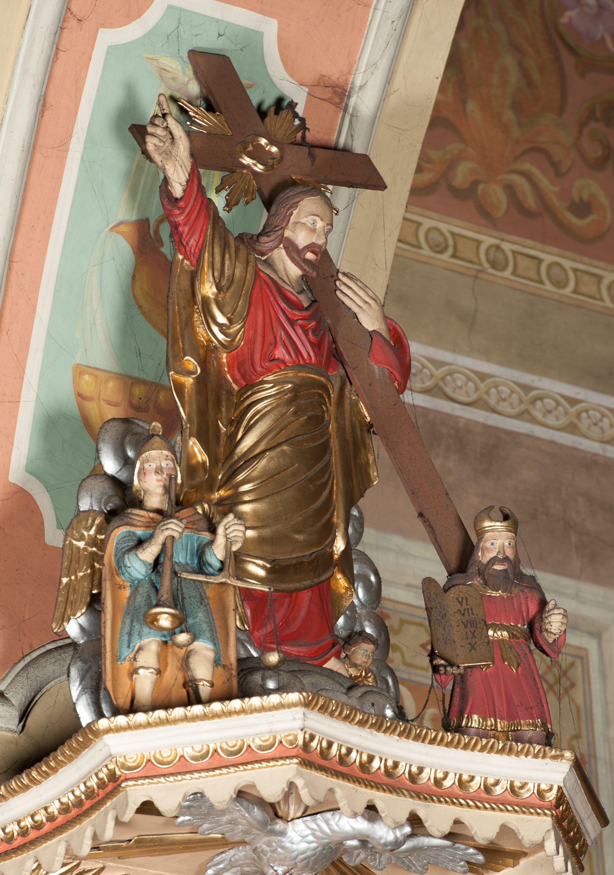Delikatne przetarcia warstwy polichromii, silne zabrudzenia figur na baldachimie. Odmalowana w latach 1903 i 1985.