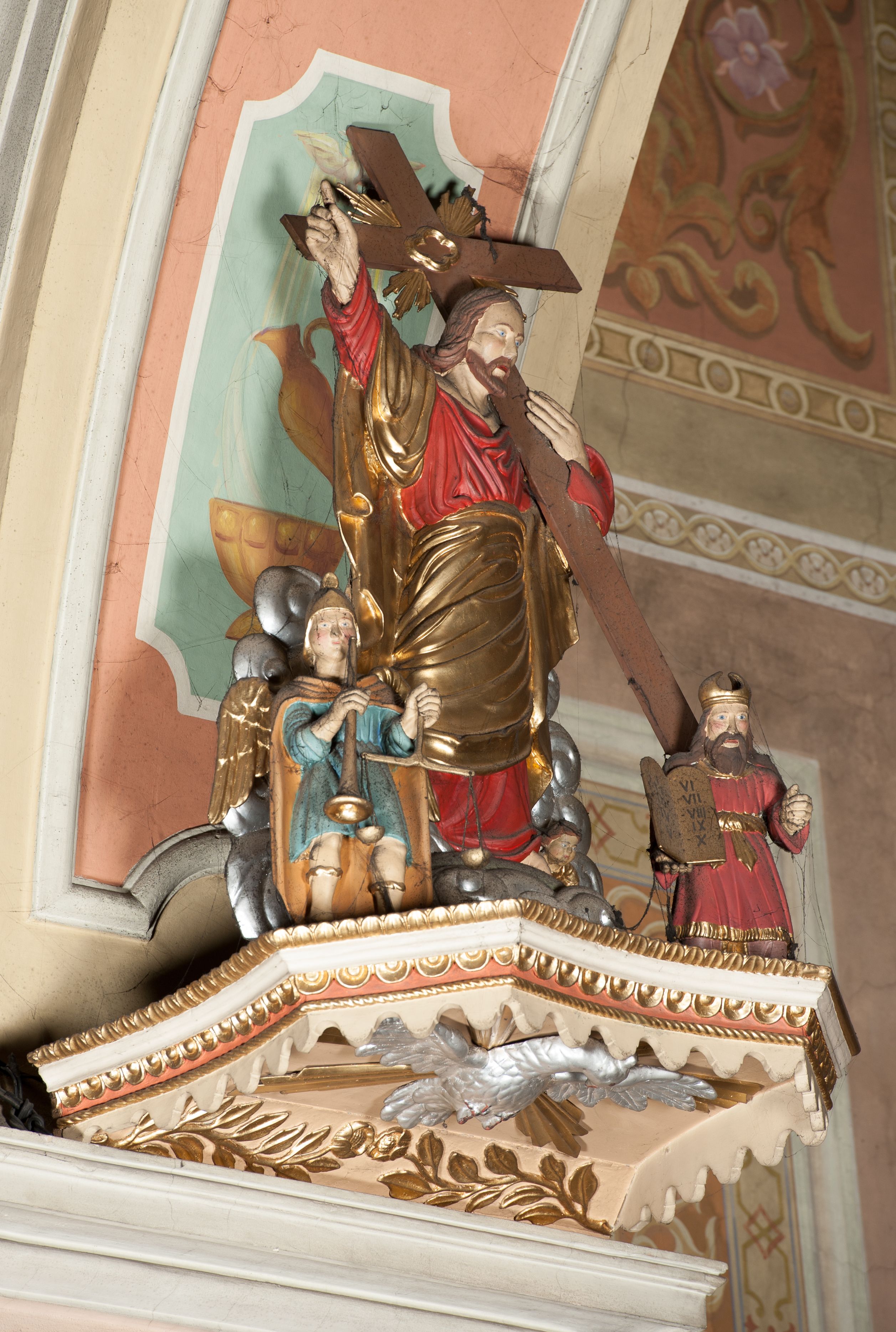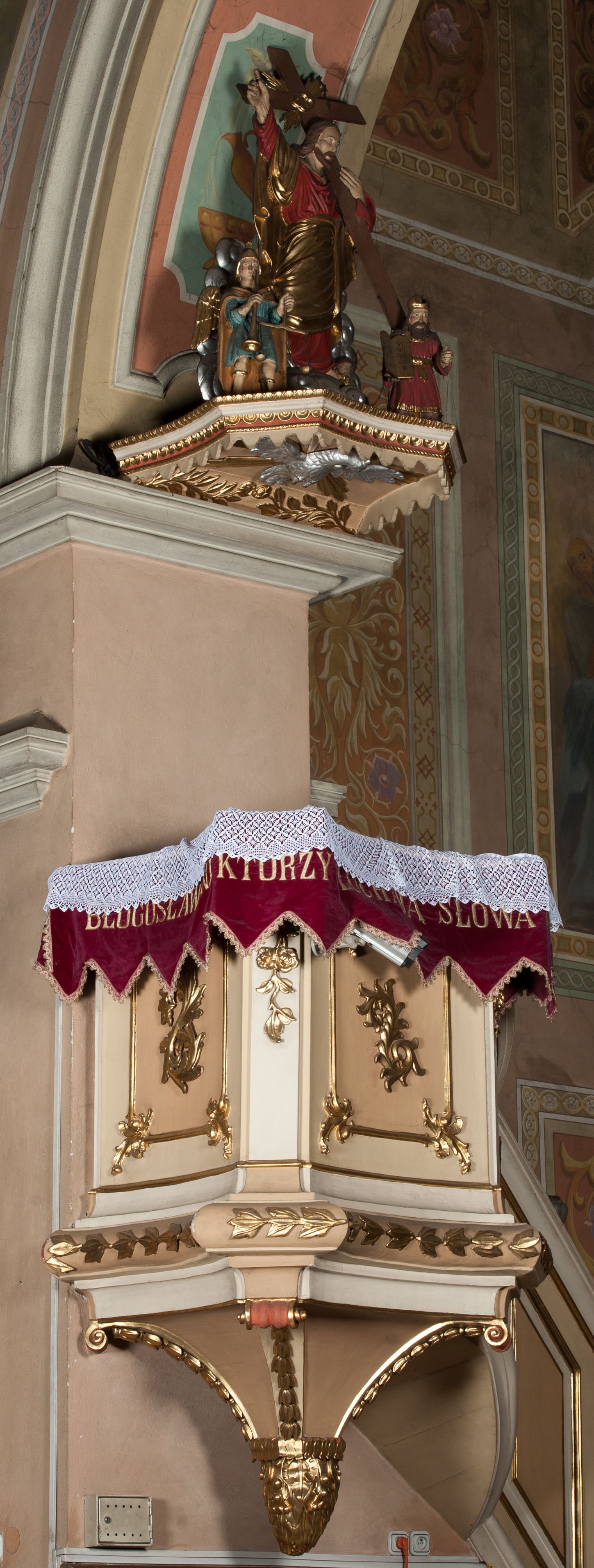 Ambona przyścienna wisząca, z dostępem od strony prezbiterium w postaci dwubiegowych schodów z podestem. Balustrada pełna, na cokole, dekorowana płycinami w formie rombów, z poręczą w postaci gzymsu. Kosz na planie kwadratu o ściętych narożach i wklęsłych bokach, na cokole w formie spłaszczonego wałka dekorowanego kampanulami w układzie poziomym. U spodu podwieszony odwrócony ostrosłup o ściętym wierzchołku i wklęsłych bokach ujęty w narożach spływami wolutowymi, dekorowany kampanulami, zakończony szyszką zdobioną cęgami. Ścianki kosza wydzielone pilastrami w formie wolut, których trzony dekorowane są ukwieconymi gałązkami. Na ściankach rocaille'owe płyciny z ornamentem roślinnym. Parapet w postaci gzymsu. Baldachim na planie analogicznym względem kosza, w formie gzymsu, dekorowany stylizowanym perełkowaniem, z podwieszonym lambrekinem. Na nim, na podstawie utworzonej z obłoków figura Chrystusa, zwróconego frontalnie, trzymającego na lewym ramieniu krzyż, z prawą ręką wskazującą w górę. Po jego lewej figurka Mojżesza z tablicami przykazań, po prawej św. Michała Archanioła trzymającego trąbę i wagę. Na podniebieniu baldachimu płaskorzeźbiona gołębica Ducha Świętego z czterema wiązkami promieni oraz dwie ukwiecone gałązki. Struktura polichromowana w kolorze beżowym, z białym detalem, ornamentyka i profile złocone, obłoki i gołębica srebrzone.