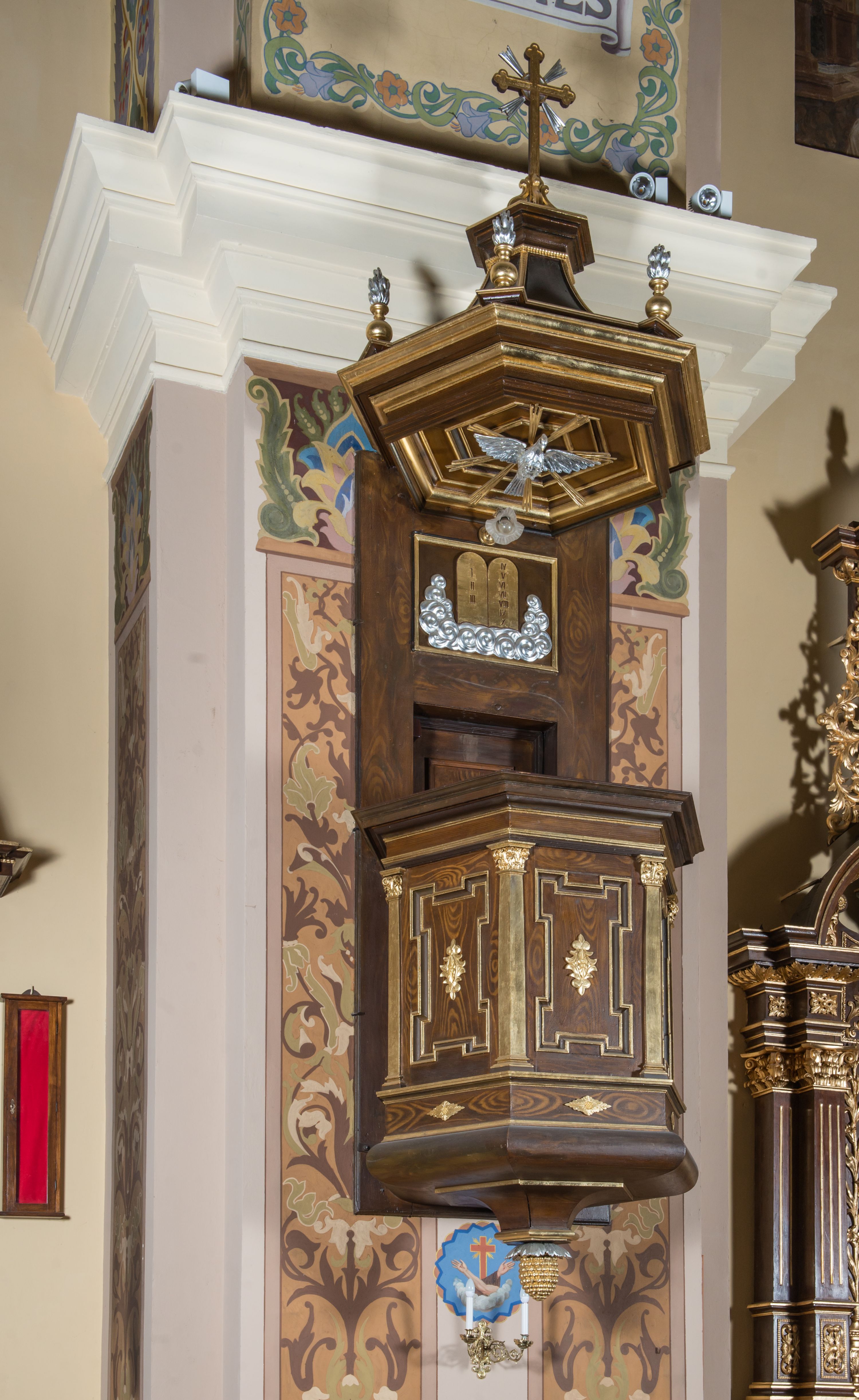 Ambona przyścienna, wisząca, z wejściem od strony zaplecka. Kosz jest na planie ściętego sześcioboku ze ściankami wydzielonymi półfilarami o kapitelach korynckich. Pola ścianek wypełniają płyciny w kształcie stojącego prostokąta o narożach w formie uszaków, ujęte profilowanym obramieniem. Dół kosza obiega belkowanie z wybrzuszonym architrawem, szerokim fryzem i delikatnym gzymsem. Podwieszenie kosza zakończone jest motywem złoconej szyszki. Parapet ambony jest w formie belkowania ze znacznie wysuniętym gzymsem. W dolnej części zaplecka znajdują się prowadzące na ambonę drzwi. Powyżej jest płycina w kształcie leżącego prostokąta z płaskorzeźbioną, złoconą parą tablic Mojżeszowych, ujętych srebrzonymi obłokami. Baldachim na rzucie sześcioboku tworzy sześć wklęsłych płycin, dołem obiega je belkowanie z wydatnym gzymsem. Powyżej gzymsu znajduje się niewysoki cokół wyłamujący się na narożach, na których ustawione są płonące wazony. Baldachim wieńczy krzyż. Płyciny kosza ambony zdobią motywy stylizowanej ornamentyki roślinnej, w podniebiu znajduje się sylwetka gołębicy Ducha Świętego ujętej promienistą glorią. Struktura ambony utrzymana jest w odcieniach brązu, detal architektoniczny i ornamentyka są złocone i srebrzone.