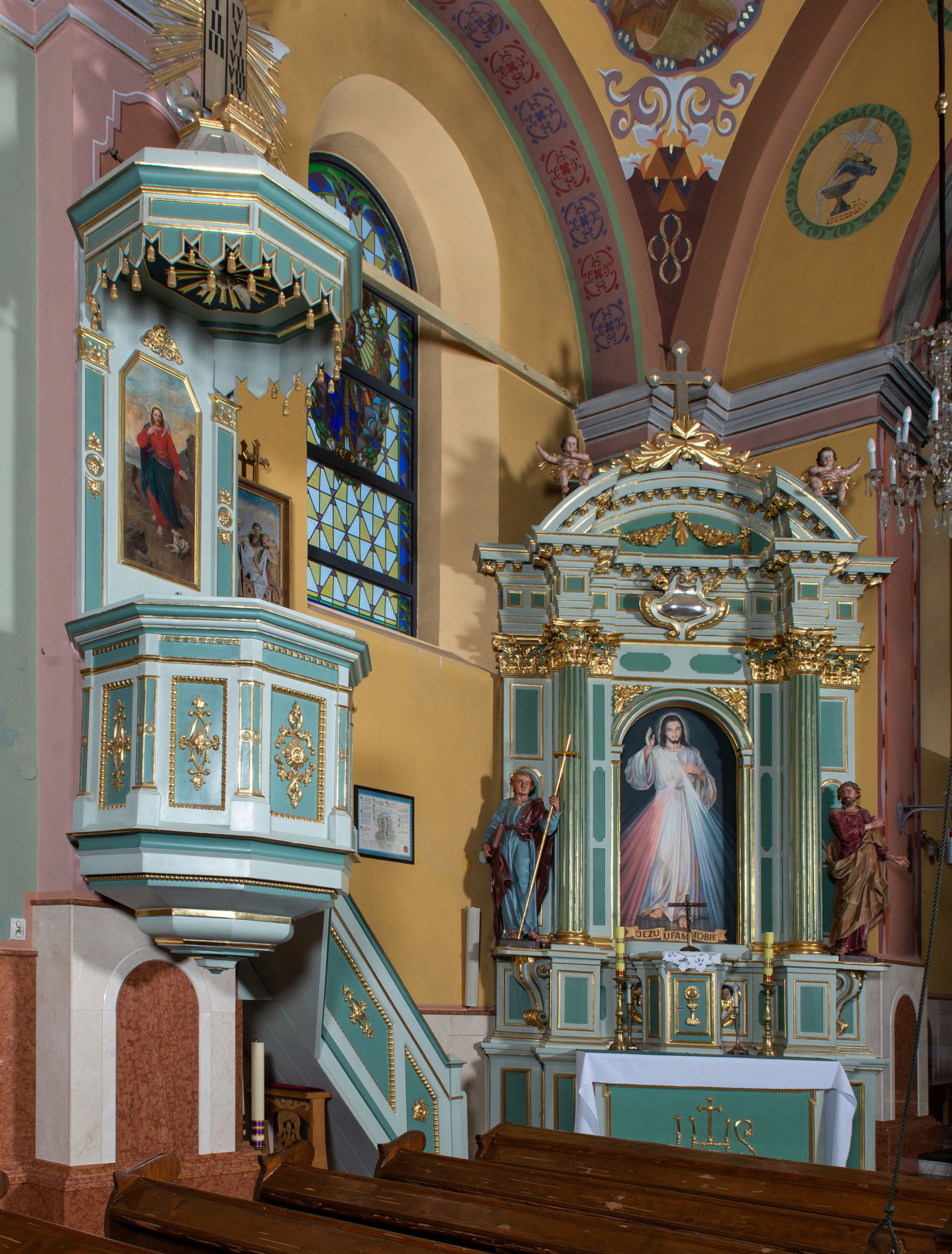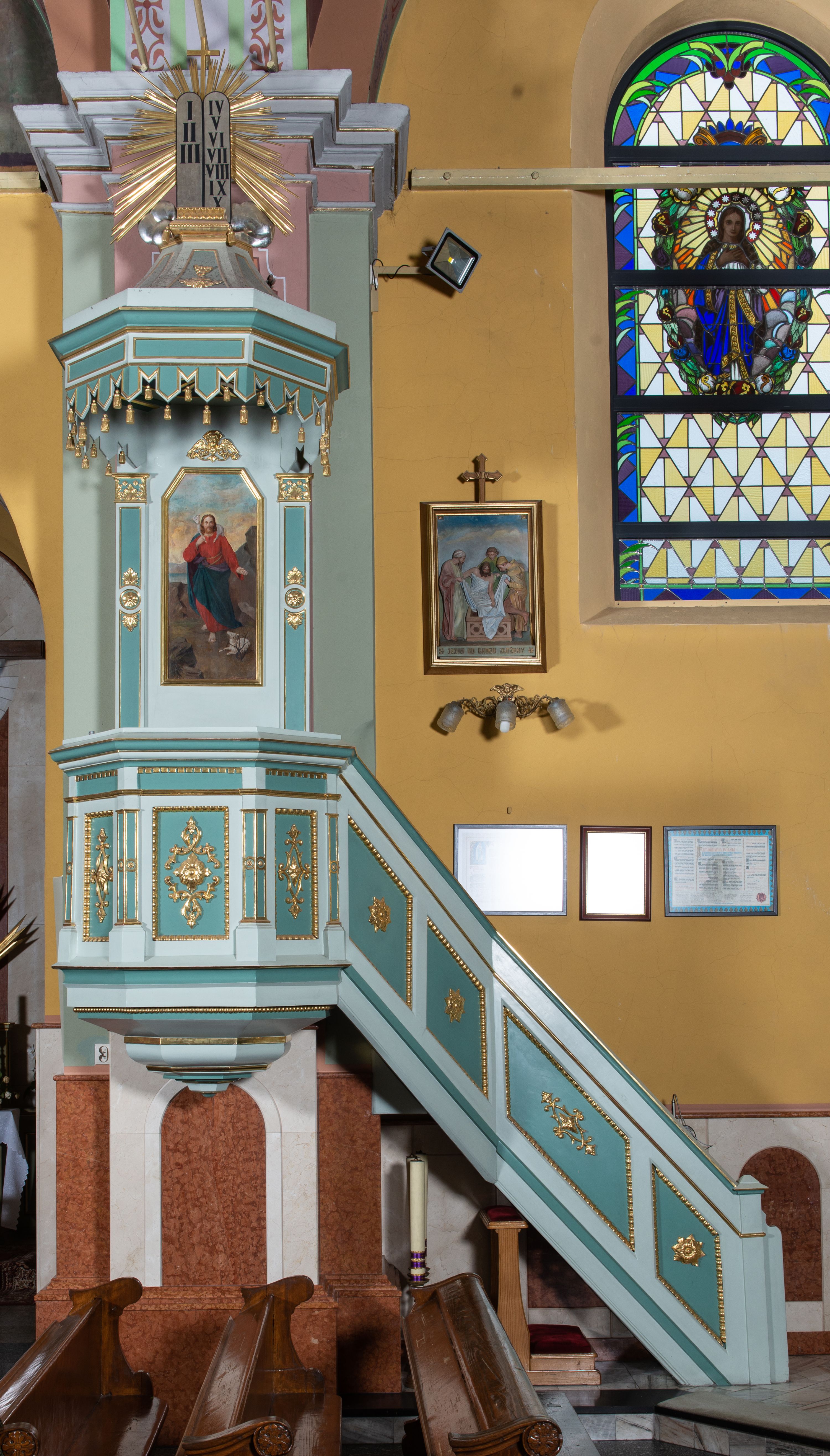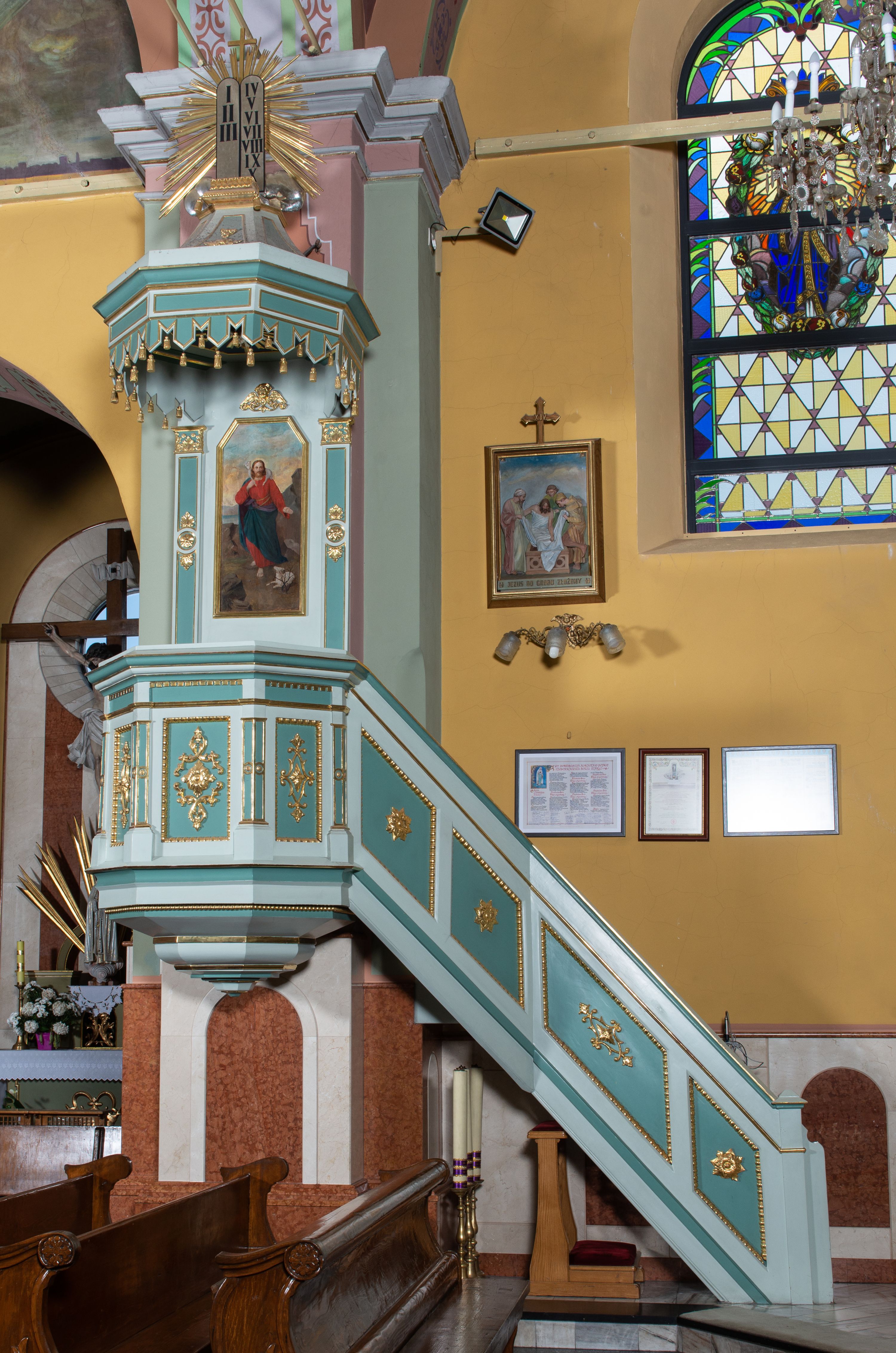 Przyścienna, wisząca ambona składa się z kosza i prowadzących do niego jednobiegowych schodów z balustradą, zaplecka oraz baldachimu. Wieloboczny kosz ustawiono na profilowanym, łamanym cokole. Poniżej widoczne jest podwieszenie utworzone ze zmniejszających się profilów układających się w spłaszczony stożek. Boki kosza artykułowano za pomocą diagonalnie ustawionych filarków na cokolikach podtrzymujących imposty z profilowanym i łamanym belkowaniem. Trzony filarków ozdobiono prostokątnymi płycinami z rozetą w środku. Płaszczyzny pomiędzy filarkami udekorowano prostokątnymi płycinami obwiedzionymi obramieniami z wolich oczu z geometryzowanym, płaskorzeźbionym ornamentem roślinno-kwiatowym w polu. Płyciny pomiędzy impostami przy górnych krawędziach ozdobiono ornamentem kostkowym. Zaplecek ambony ujęto dwoma pilastrami o płaskich głowicach zdobionych motywem stylizowanych liści. Trzony pilastrów przedzielono na środku medalionem z rozetą i dwiema palmetami. Pomiędzy pilastrami umieszczono pole obrazowe w kształcie wydłużonego prostokąta o ściętych narożach w części górnej. W polu znajduje się obraz z całopostaciowym przedstawieniem Chrystusa jako Dobrego Pasterza. Ponad zapleckiem zawieszono wieloboczny baldachim utworzony z łamanego, profilowanego belkowania i podwieszonego lambrekinu, zwieńczony wielobocznymi spływami, na szczycie których umieszczono na poduszce zamkniętą księgę, a za nią na obłokach w otoczeniu promieni dwie tablice Dekalogu. Strukturę architektoniczną ambony polichromowano w kolorze opalizującej zieleni, profile, ornamenty wyzłocona, a tablice Dekalogu i obłoki posrebrzono.