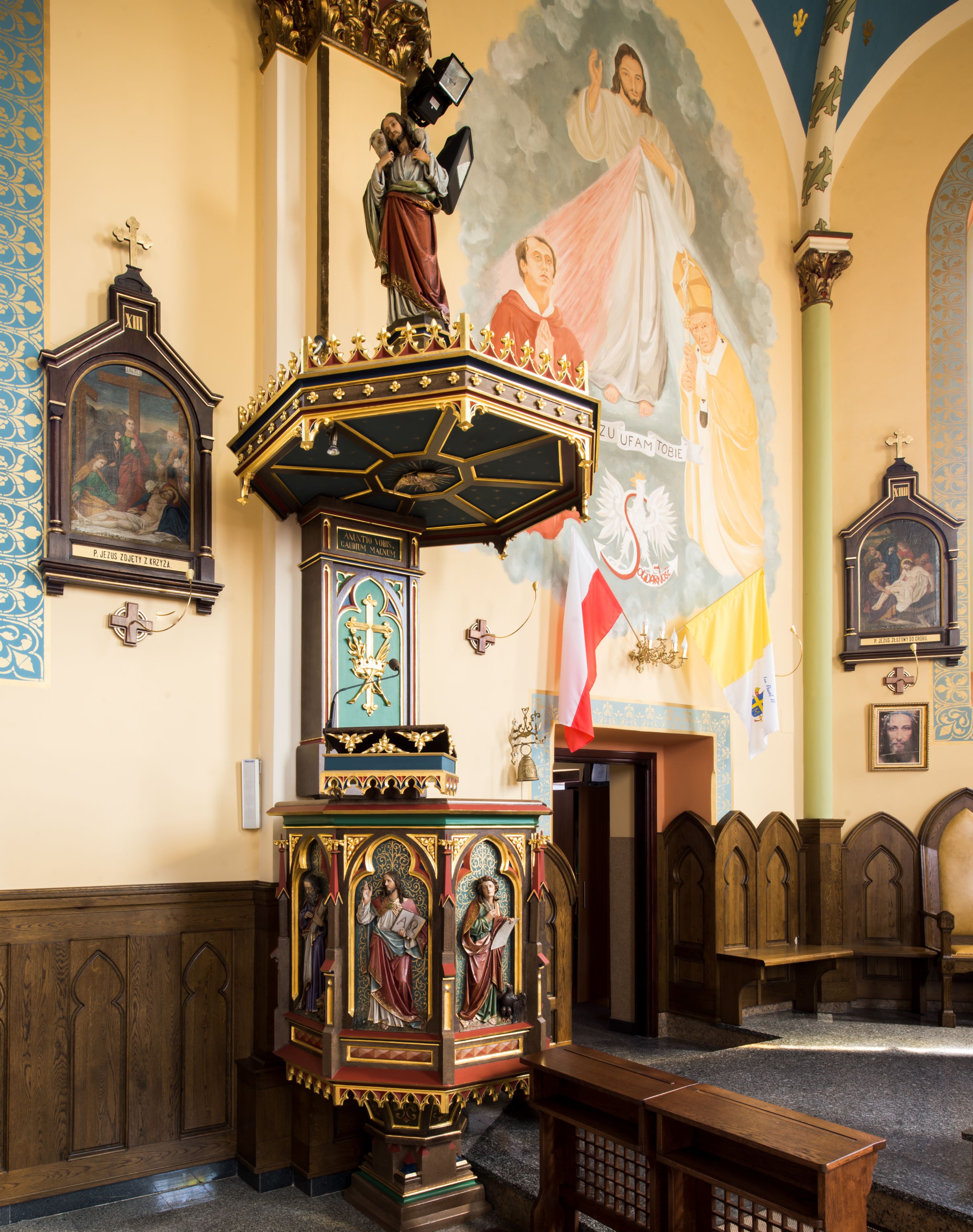 Przyścienna ambona składa się z kosza umieszczonego pierwotnie na wyższym filarze, zaplecku i baldachimu. Kosz ambony wykonano na rzucie ośmioboku, wspierając go na cokole na rzucie kwadratu przechodzącego w ośmiobok, rozszerzający się ku górze. Kosz jest artykułowany za pomocą pinakli z polami zamkniętymi łukiem ostrym z wpisanymi w nie ślepymi maswerskami. W polach znalazło się całopostaciowe przedstawienia Chrystusa oraz czterech ewangelistów. Dolna część została ujęta fryzem utworzonym z maswerków, a górna zwieńczona profilowanym parapetem. Zaplecek, opinający filar arkady tęczowej zdobi pole zamknięte łukiem ostrym z wkomponowanym ślepym maswerkiem. W ściance zaplecka usytuowano krzyż o ramionach zakończonych trójlistnie, na tle którego znajduje się korona z krzyżującymi się palmami. W górnej części zaplecka umieszczono napis: ,,ANUNTIO VOBIS / GAUDIUM MAGNUM”. Baldachim wykonano na rzucie ośmioboku z gołębicą Ducha Świętego na podniebieniu. Wieńczy go figura Chrystusa z barankiem na ramionach. Ambona utrzymana jest w brązowo-czerwono-zielonej tonacji kolorystycznej. Dekoracja architektoniczna i ornamenty są złocone.