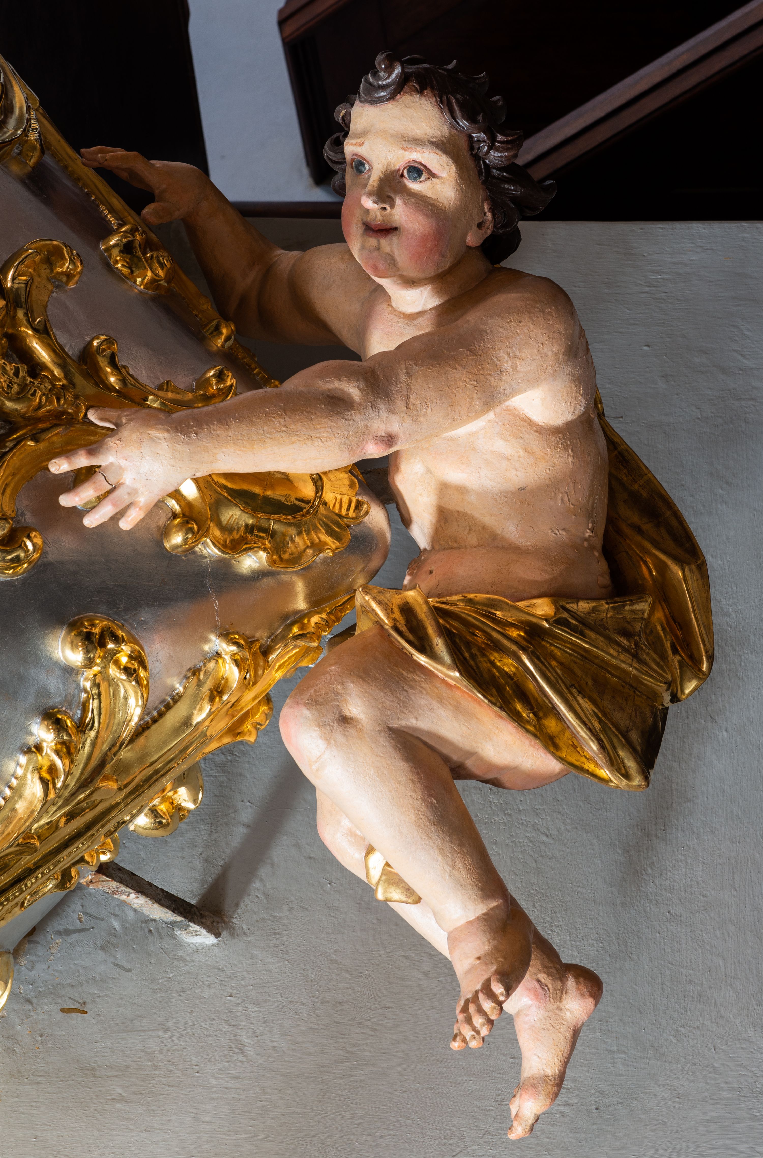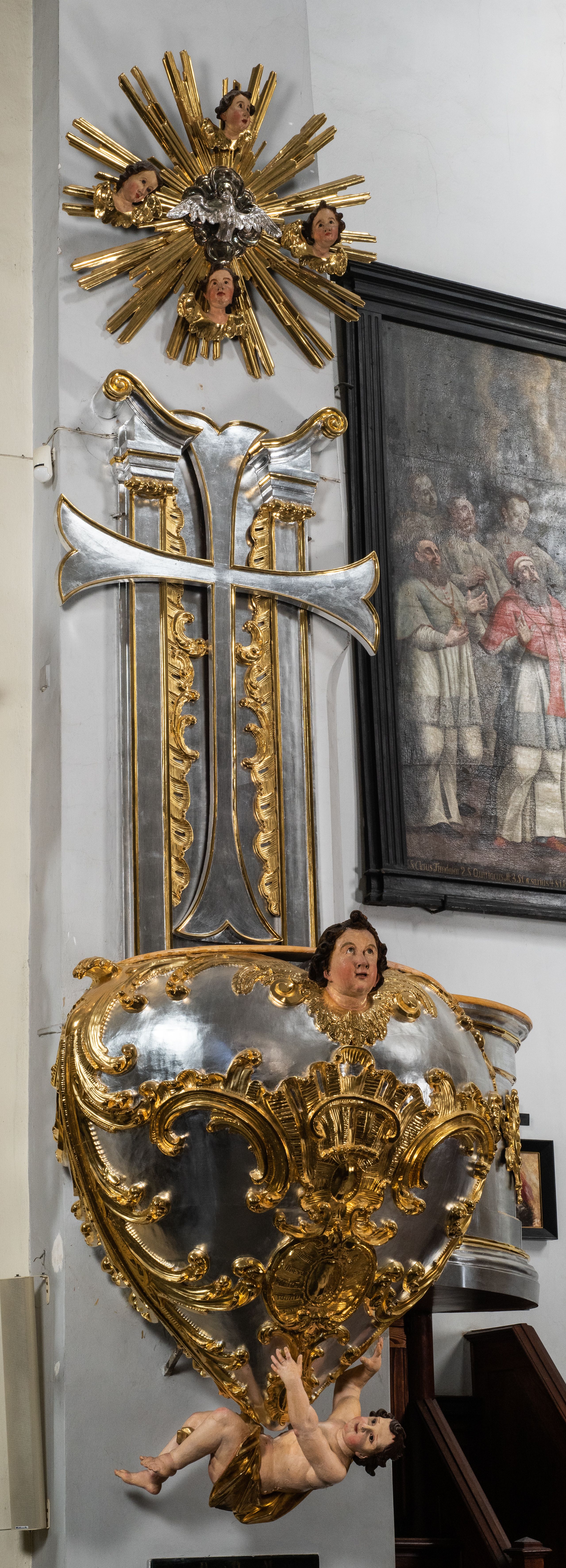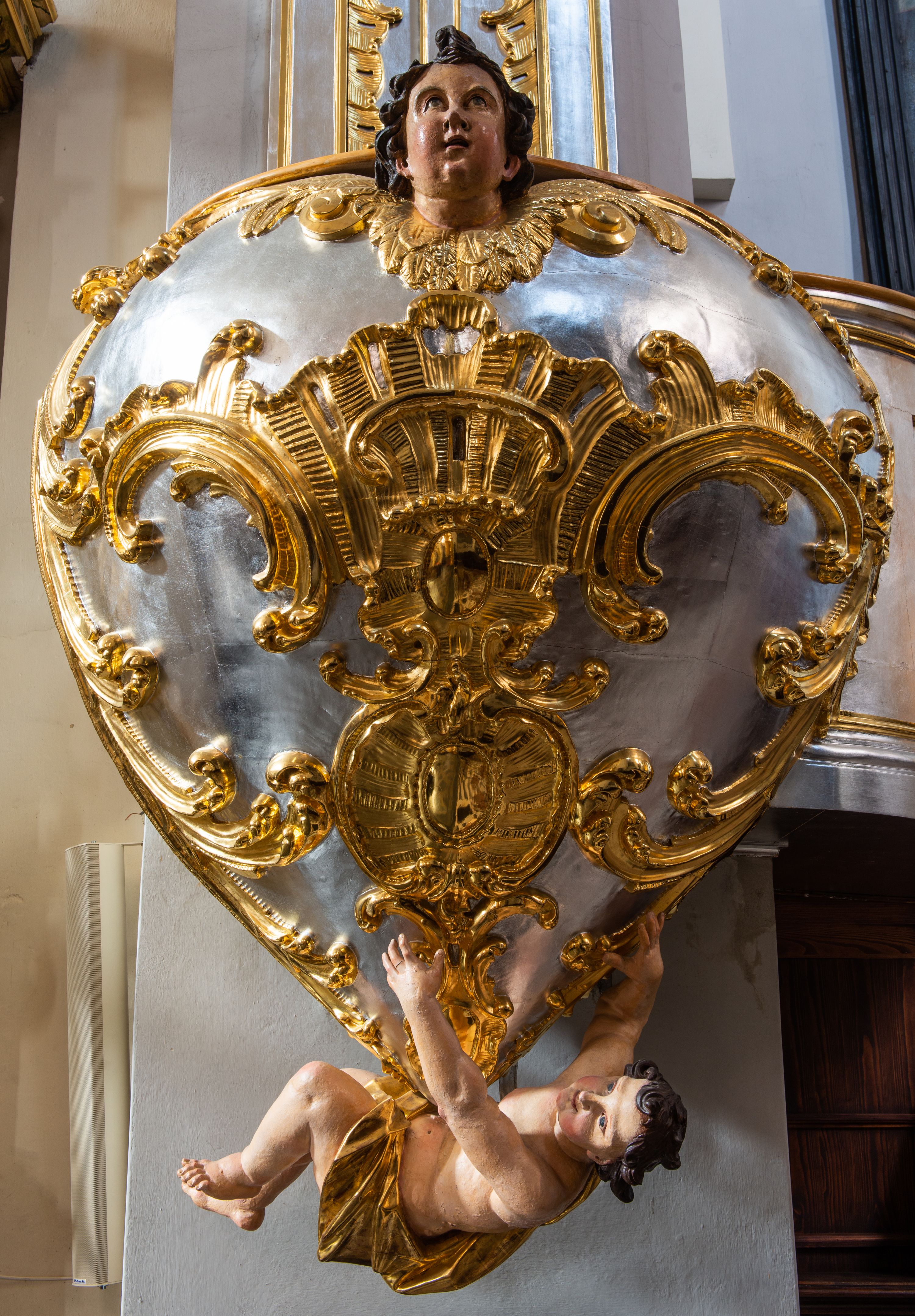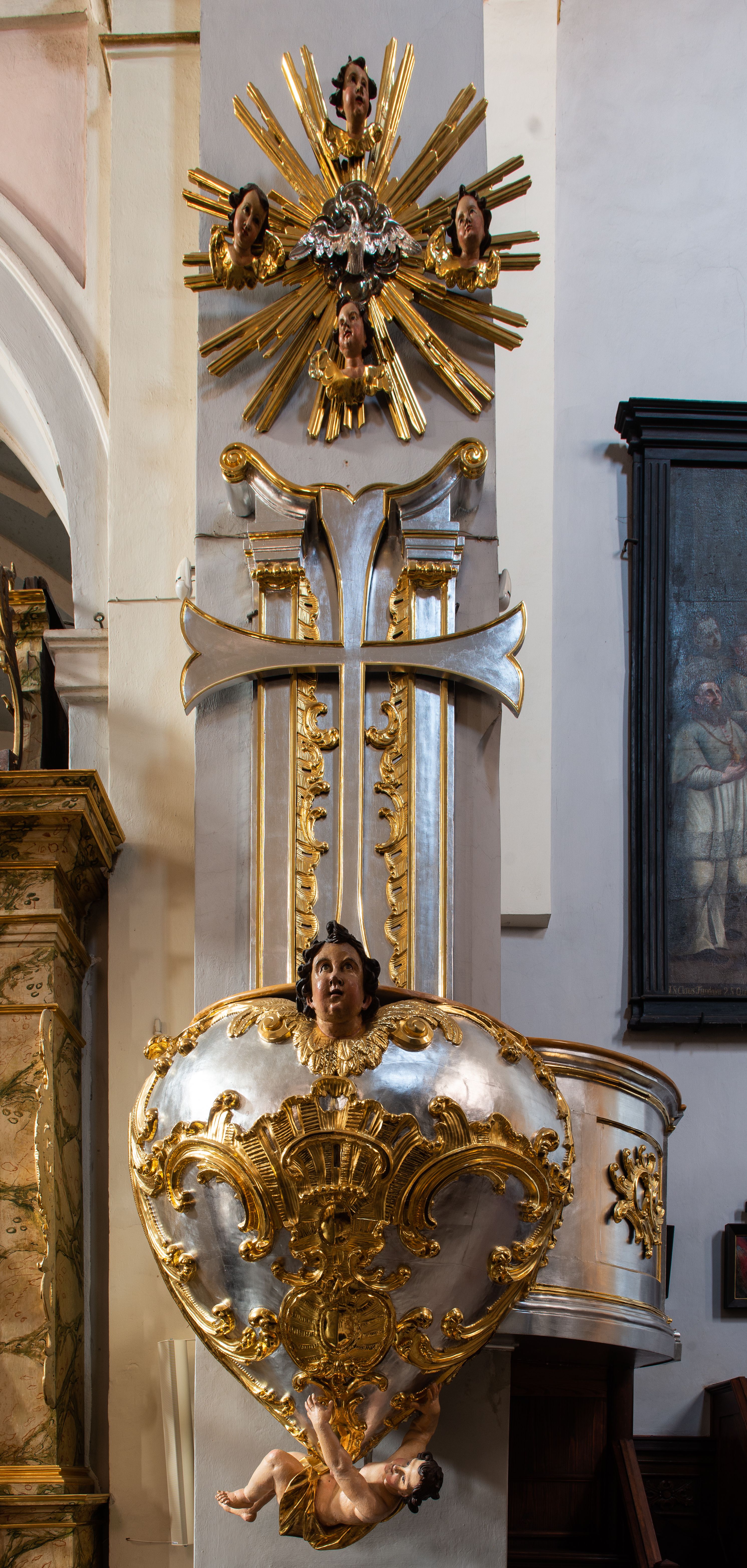 Jest to ambona wisząca, przyścienna, z wejściem od prawej strony. Balustrada na planie półkola, ustawiona na profilowanym cokole, zamknięta silnie wysuniętym gzymsem podtrzymywanym przez pilaster. Ścianka dekorowana płycinami w kształcie leżącego prostokąta po lewej stronie oraz w kształcie stojącego prostokąta po prawej, ozdobione rzeźbionym rocaille’m w polu; schody wąskie, jednobiegowe, połączone ze stojącymi w prezbiterium drewnianymi stallami. Kosz w kształcie serca, wybrzuszonego w górnej części. U spodu podwieszony anioł z rękami wyciągniętymi do góry i ugiętymi w kolanach nogami, w pasie przewiązany złotą tkaniną, silnie drapowaną. W górnej części kosza, pośrodku, uskrzydlona główka aniołka, skierowana na wprost. Twarz owalna o pulchnych policzkach, z wyraźnie zaznaczonym podbródkiem, usta delikatnie otwarte, nos spiczasty, oczy skierowane ku górze; włosy średniej długości, ciemnobrązowe z loczkiem na czubku głowy. Powierzchnia kosza pokryta płaskorzeźbioną dekoracją rocaille’ową. Zaplecek w kształcie stojącego prostokąta, flankowany dwoma pilastrami, podtrzymującymi przerywany, odwrócony, wolutowy przyczółek. W polu wpisany duży, łaciński krzyż o rozszerzających się ramionach, wysunięty poza boki zaplecka. Pilastry od wewnątrz zdobione są pasem gęstej dekoracji rocaille’owej. Nad amboną zawieszona jest gołębica Ducha Świętego na tle promienistej glorii, utworzonej z wiązek promieni o nierównej długości. Na promieniach umieszczone są cztery uskrzydlone główki aniołków. Struktura srebrzona, dekoracja ornamentalna złocona.