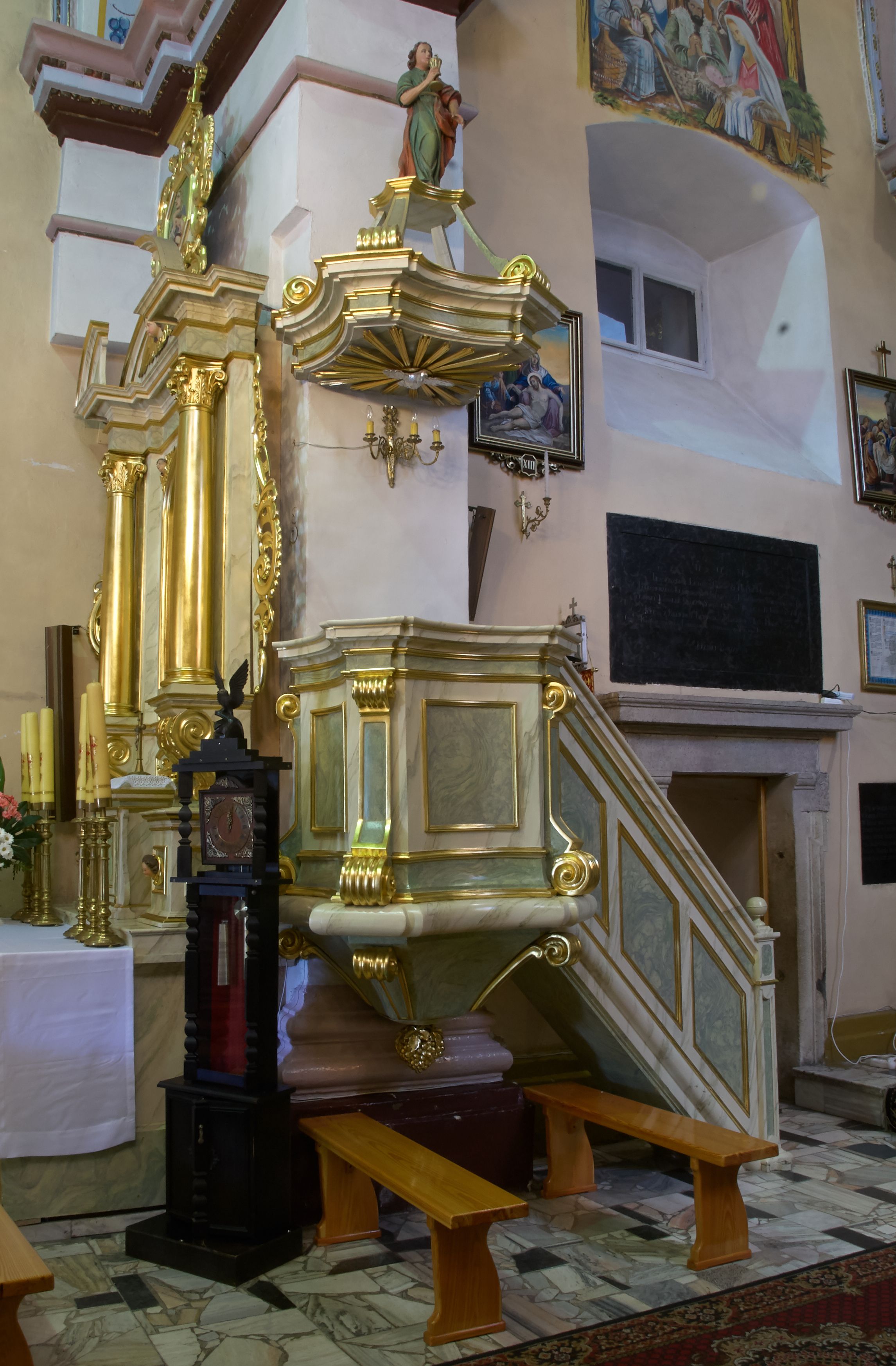 Ambona przyścienna, drewniana, polichromowana i złocona, z baldachimem, dostępna schodkami od strony prezbiterium. Kosz ambony na rzucie czworoboku o ściętych narożach oraz wklęsłych bokach ustawiony na profilowanym cokole, ujęty w narożach wolutowymi pilastrami dźwigającymi bogato profilowane, pełne belkowanie z wydatnym gzymsem. Pola kosza wklęsłe, dekorowane prostokątnymi płycinami. Całość ujęta od dołu czterema wolutami; pod spodem podwieszone pełnoplastyczne, złocone winne grono. Baldachim na rzucie czworoboku o ściętych narożach i wklęsłych bokach; bogato profilowany. Zwieńczony pełnoplastyczną, polichromowaną figurą św. Jana Ewangelisty trzymającego kielich ustawioną na ażurowej konsoli wspartej na wolutach. Na podniebiu płaskorzeźbione, złocone i srebrzone przedstawienie gołębicy Ducha Świętego. Ambona polichromowana (w tym marmoryzowana) w dwóch odcieniach jasnej, pastelowej zieleni. Detale elementów architektonicznych złocone. Figura św. Jana w pełni polichromowana.