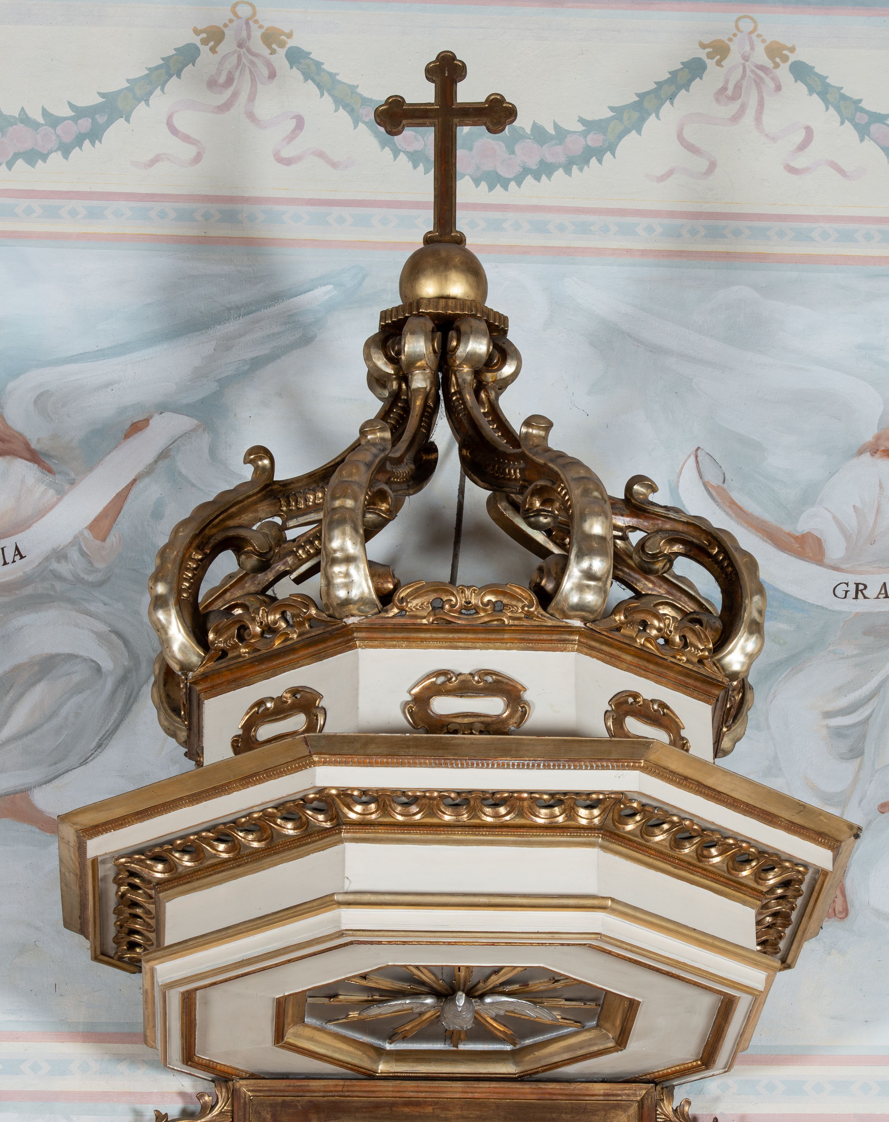 Ambona wisząca, przyścienna, z wejściem od prawej strony. Kosz na planie ośmioboku, na niskim cokole, od dołu ujęty ośmiobocznym podwieszeniem. Ścianki kosza zdobione prostokątnymi płycinami wypełnionymi stylizowaną wicią liści akantu z czteropłatkowym kwiatkiem pośrodku. Parapet w formie prostego belkowania, którego imposty wsparte są małymi hermami – główkami połączonymi z dekoracją naśladującą ornament małżowinowo-chrząstkowy. Zaplecek w kształcie stojącego prostokąta w profilowanej i złoconej ramie, w górnej partii ujęty po bokach wicią akantu ze stylizowanymi podwieszonymi kampanulami; w polu umieszczone tablice dekalogu na obłokach. Baldachim na planie ośmioboku, z wydatnym, profilowanym gzymsem, zwieńczony kabłąkami spiętymi i podtrzymującymi krzyżyk łaciński zatknięty na kuli. Na podniebieniu baldachimu, w ośmiobocznej płycinie rzeźbiona gołębica Ducha Świętego na tle promienistej glorii złożonej z wiązek promieni o nierównej długości. Balustrada schodów zdobiona wydłużonym, stylizowanym ornamentem małżowinowo-chrząstkowym umieszczonym w płytkiej, romboidalnej płycinie. Struktura polichromowana w kolorze beżowym, profile i ornamenty złocone oraz posrebrzone.