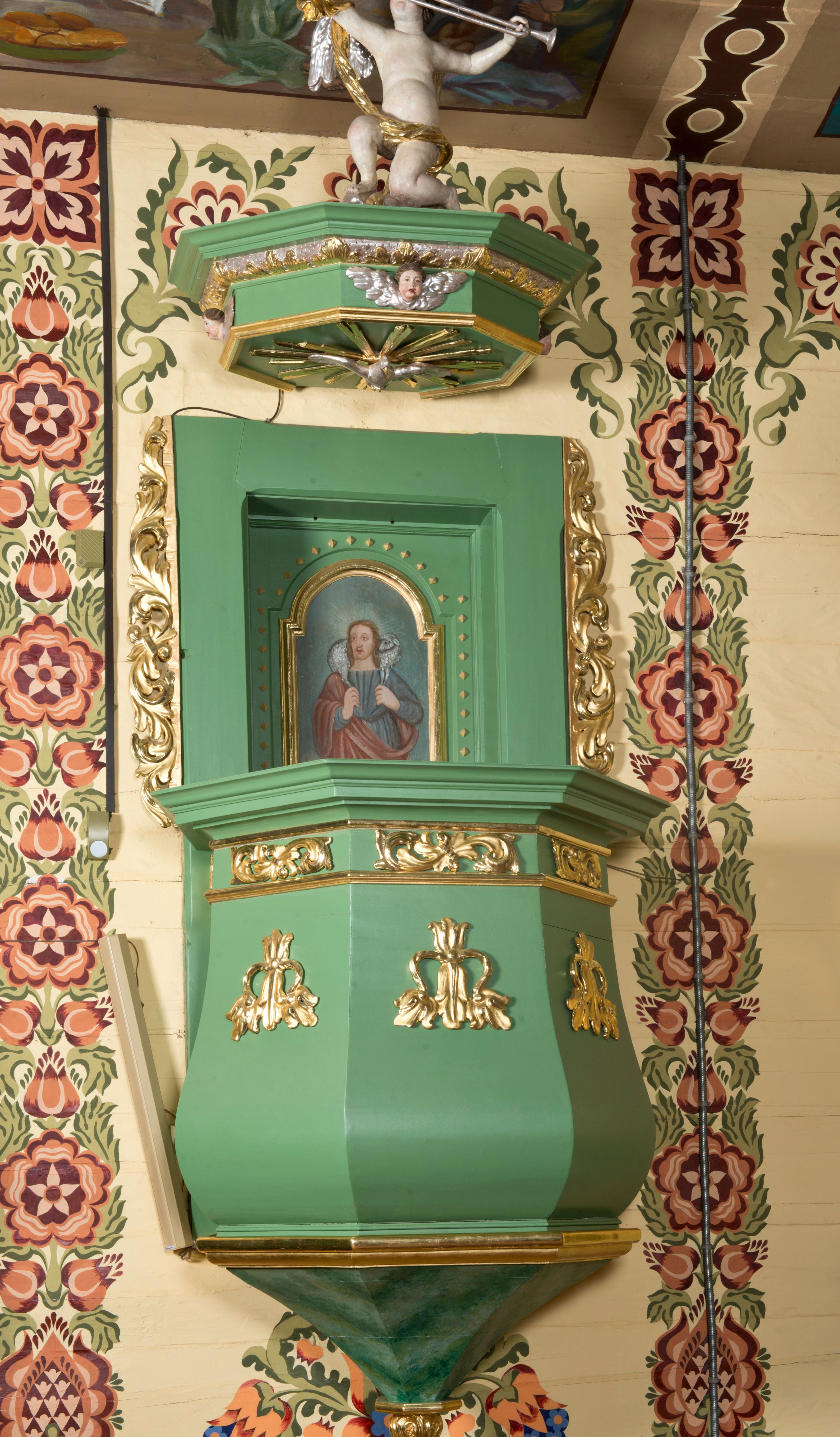 Ambona wisząca, przyścienna złożona z kosza, zaplecka oraz baldachimu. Kosz siedmioboczny, o lekko wybrzuszonej dolnej części, zakończony od góry wydatnym gzymsem. W polach plakiety utworzone z liści, górą fryz z plakietami z rozwijających się liści akantu. Ambona zamknięta od dołu ostrosłupowo, z szyszką. Zaplecek w kształcie stojącego prostokąta ujętego uszakami utworzonymi z liści akantu, z drzwiami dekorowanymi płyciną zamkniętą od góry łukiem nadwieszonym. W płycinie wizerunek Chrystusa Dobrego Pasterza. Baldachim powtarza kształt kosza, składa się z fryzu i gzymsu. W podniebiu ma wizerunek gołębicy Ducha Świętego na tle glorii promienistej, a na trzech ściankach fryzu uskrzydlone główki anielskie, zaś w zwieńczeniu rzeźbę anioła grającego na trąbce i trzymającego hierogram „IHS” . Struktura malowana na zielono; detale i ornamenty złocone i srebrzone.