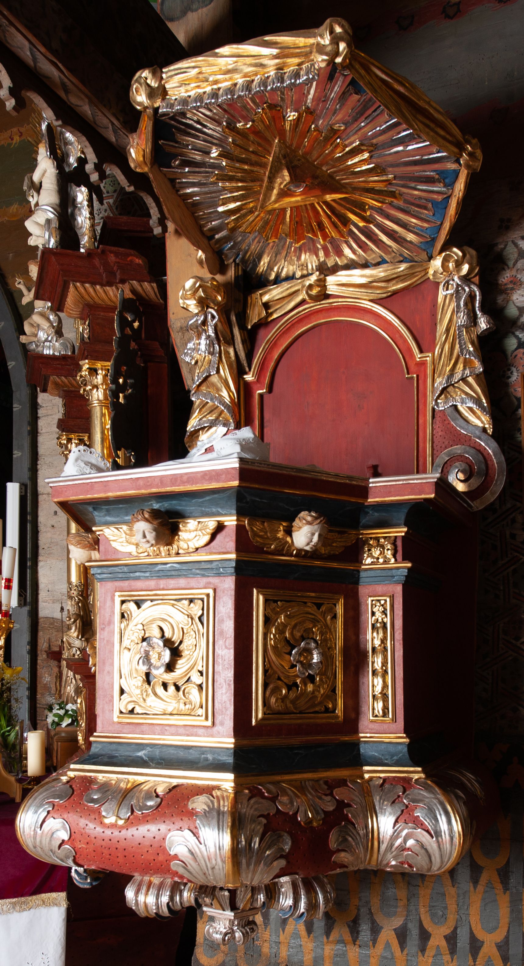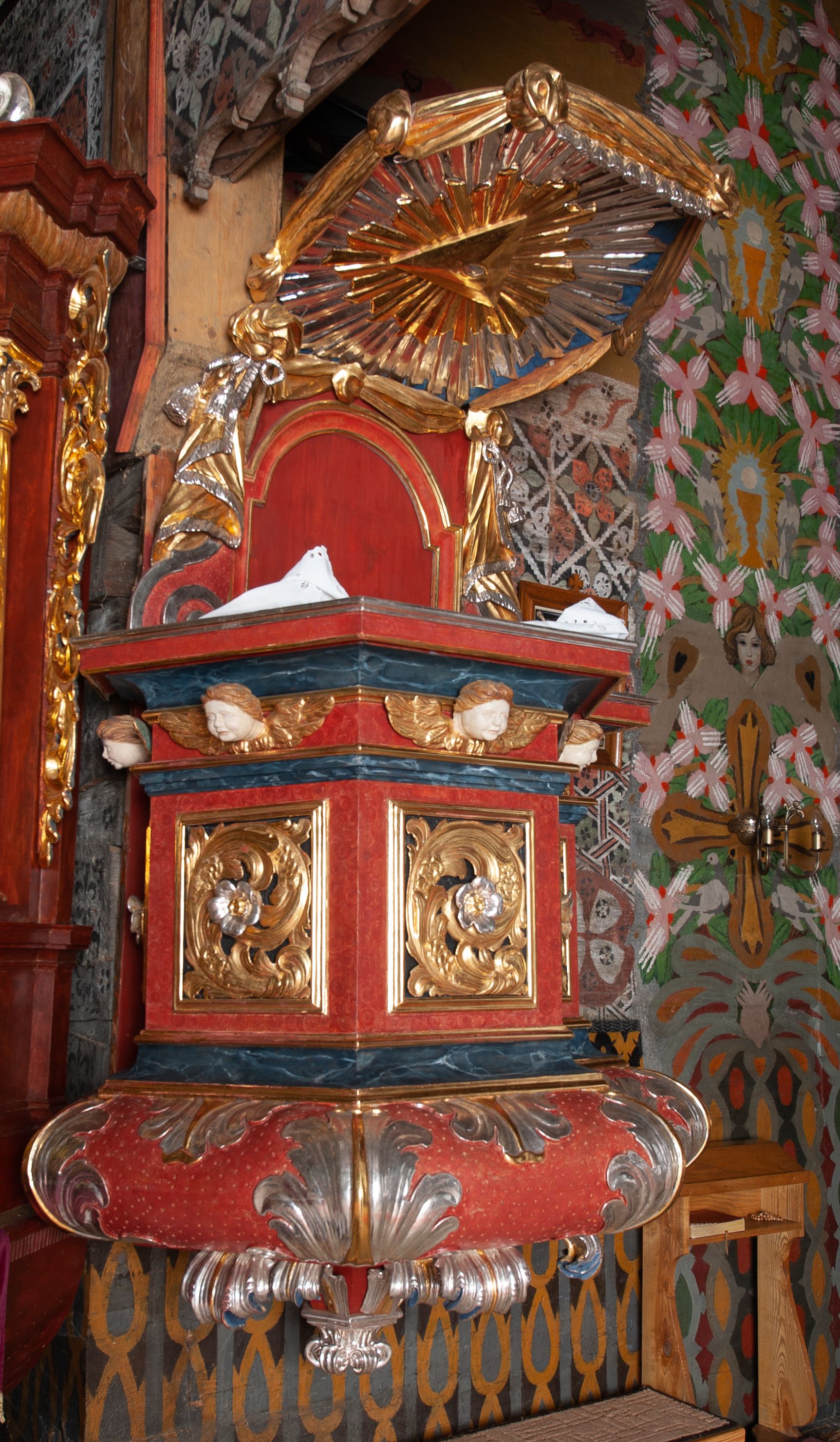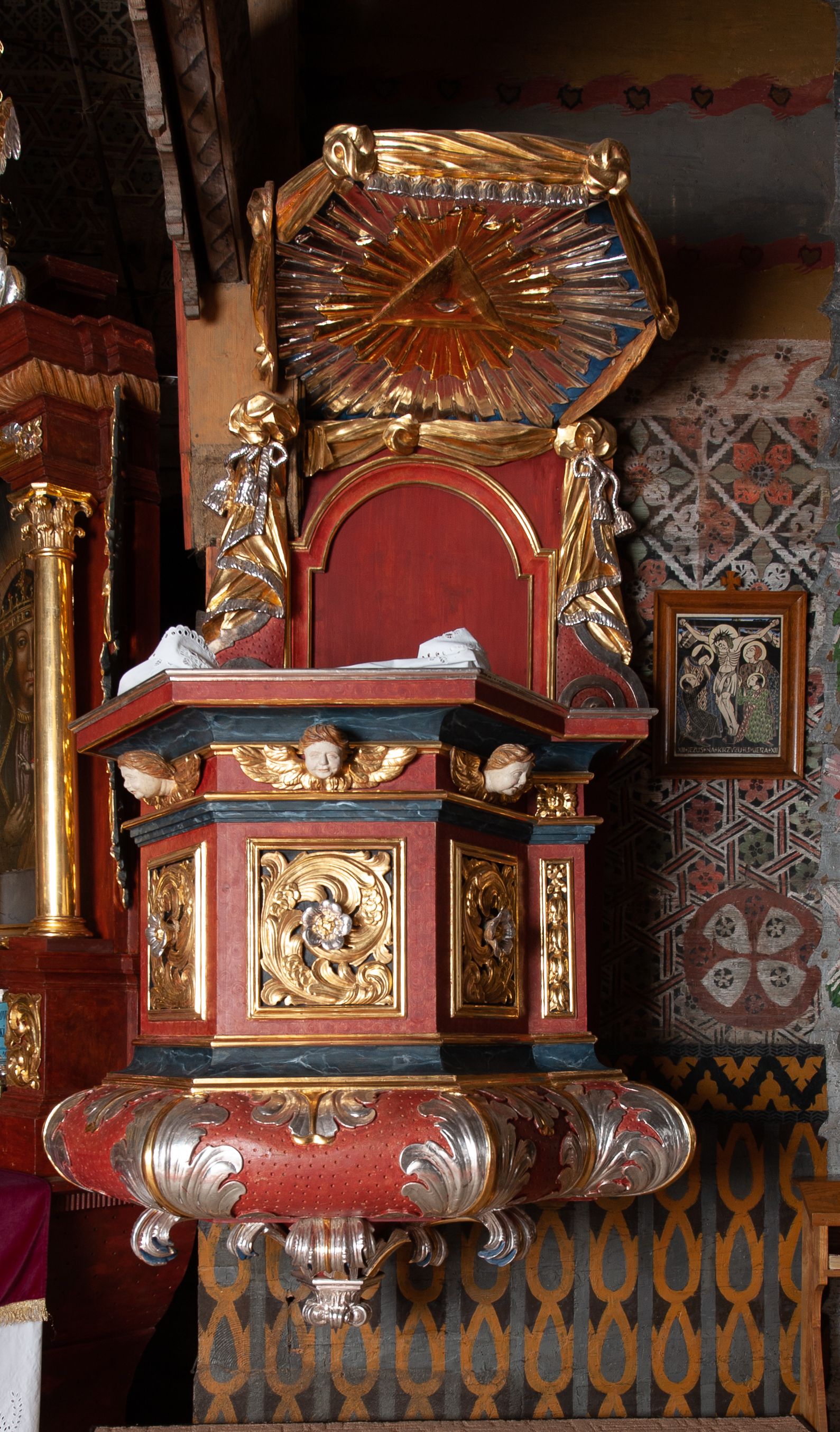 W 1968 roku ambona była polichromowana na kolor popielaty i zdobiona złoconymi ornamentami.