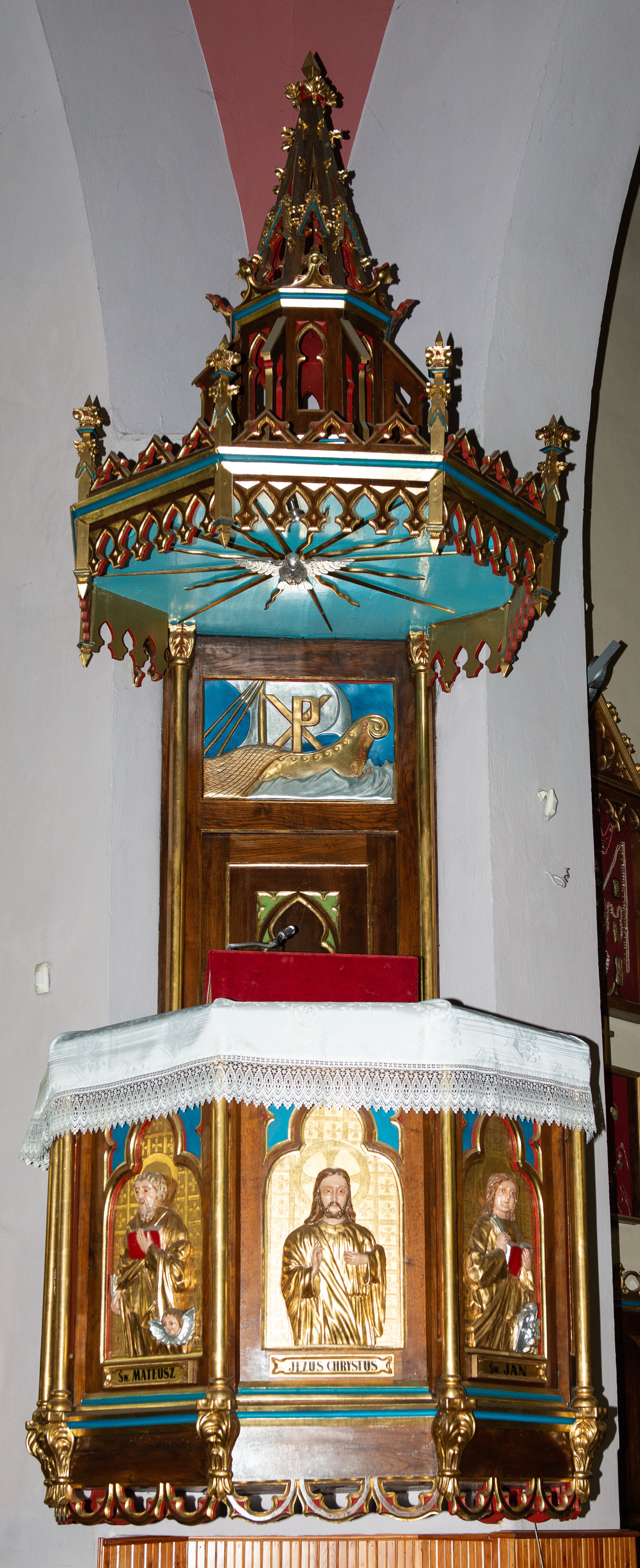Baldachim powtarzający plan kosza, w formie podstawy dla ośmiobocznej ażurowej wieżyczki z blendami w ściankach i łukami przyporowymi, dekorowanej żabkami. Krawędź baldachimu profilowana, dekorowana sterczynami w narożach i neogotyckimi fartuchami u spodu i u góry. W podniebiu rzeźbiona gołębica Ducha Świętego w glorii.