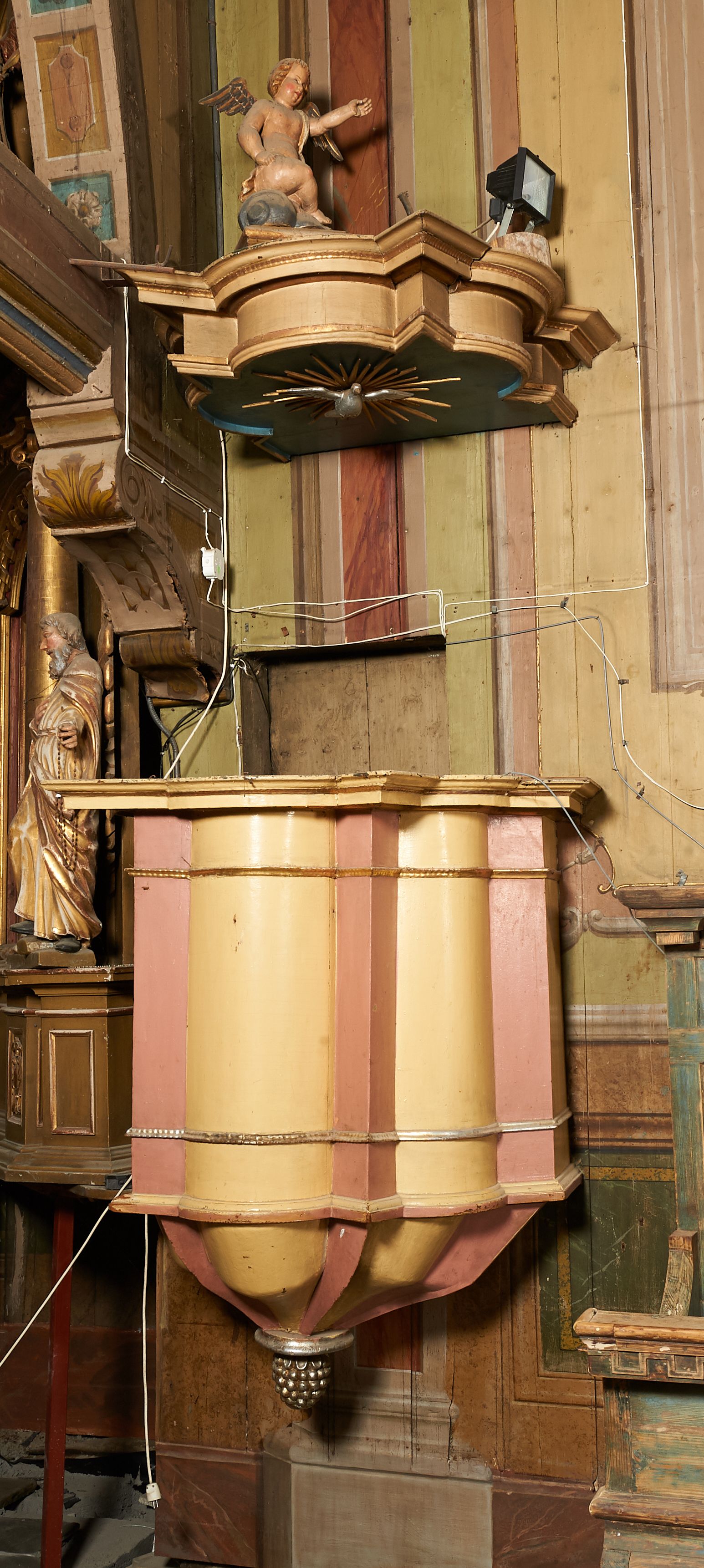 Niemal zupełnie pozbawiona dekoracji, ubytki mechaniczne, przetarcia polichromii, złoceń i srebrzeń. Odspojenia elementów konstrukcyjnych.