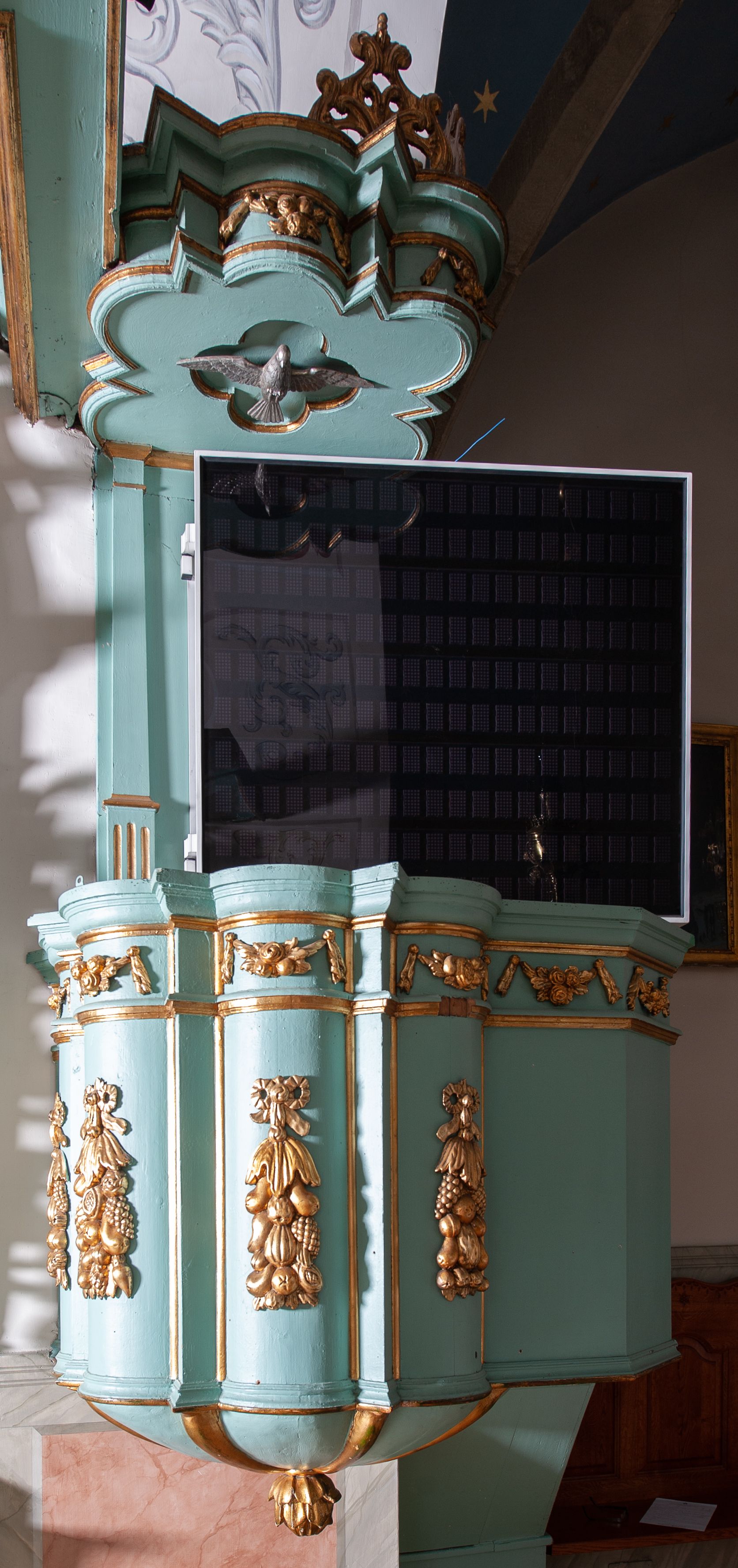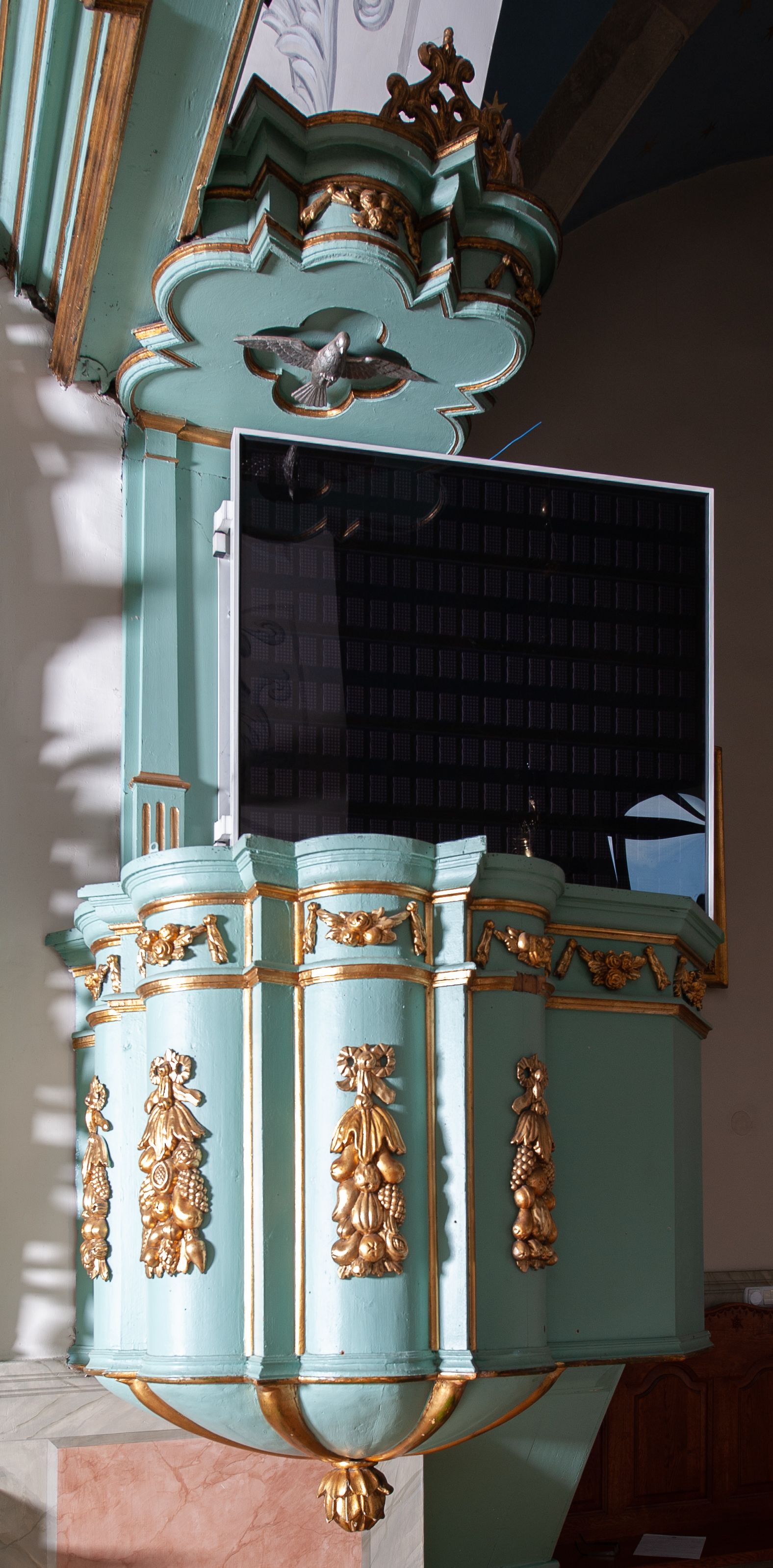 Ambona przyścienna, wisząca z dostępem od strony prezbiterium. Kosz na planie ośmioliścia z trójkątnymi wypustkami pomiędzy ściankami oraz dodatkowym podestem od strony prezbiterium na planie połowy z sześcioboku, do którego prowadzą schody z pełną balustradą. Spód kosza puklowany, zakończony szyszką. Wypukłe ścianki kosza dekorowane płaskorzeźbionymi, owocowymi girlandami podwieszonymi na wstędze; w górnej partii pas wydzielony dwiema listewkami z kwiatowymi girlandami, opasujący kosz i podest. Parapet w formie profilowanego gzymsu. Zaplecek wąski, ujęty pilastrami na kanelowanych cokołach. Baldachim na planie czworoliścia z trójkątnymi wypustkami pomiędzy ściankami; w formie niepełnego belkowania; fryz dekorowany kwiatowymi girlandami. Na baldachimie dwa akroteriony. U spodu czworolistna płycina z rzeźbioną gołębicą Ducha Świętego. Struktura polichromowana w odcieniu bladozielonym, ornamentyka i profile złocone, gołębica srebrzona.