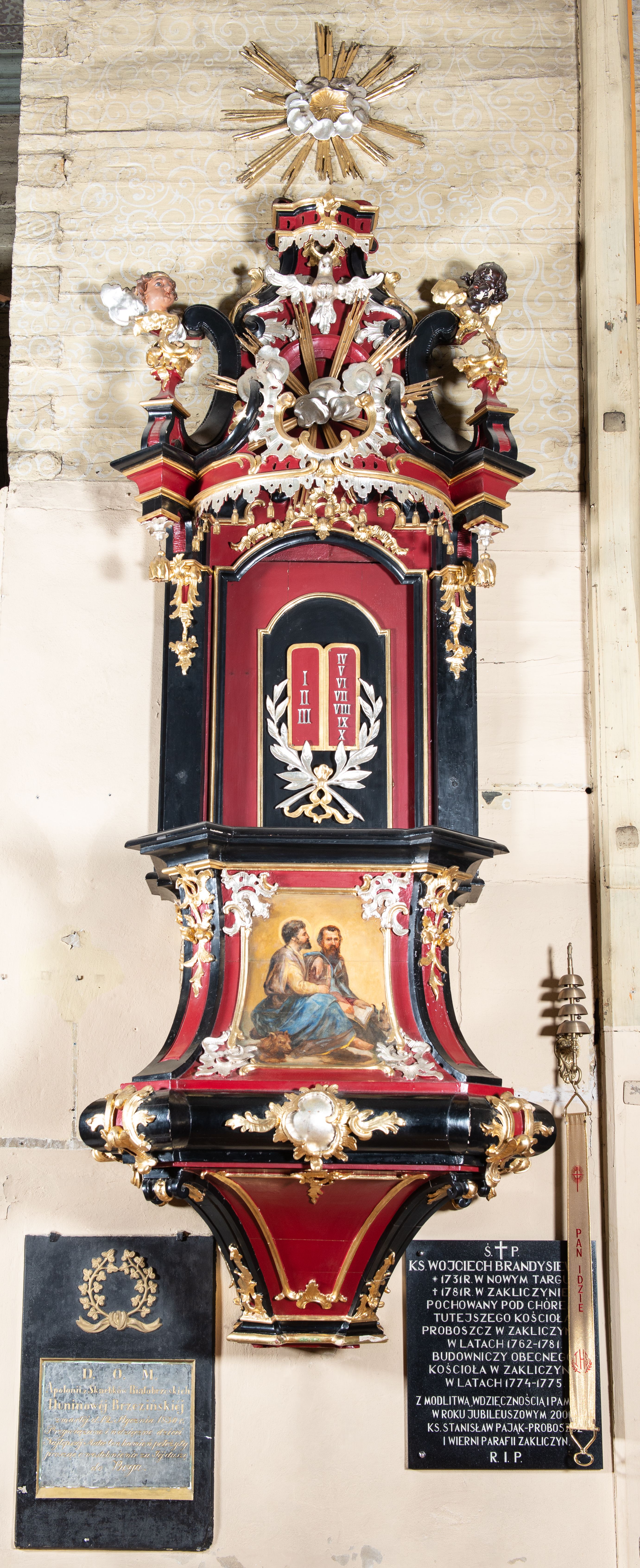 Ambona przyścienna, wisząca z dostępem od zakrystii. Podwieszenie w formie odwróconego ostrosłupa o ściętym wierzchołku, na krawędziach flankowane pilastrami zakończonymi u góry wolutowo, a na ściankach zdobione płycinami. Kosz na planie kwadratu umieszczony na wybrzuszonej podstawie, dekorowanej rocaille'owymi kartuszami, o ściętych górnych narożach; ścianki wklęsłe, zwężające się ku górze, ujęte w narożach pilastrami z trzonami dekorowanymi rocaille'em i zwisami z różanych gałązek. Podpory dźwigają gzyms wyłamany na ich osi, tworzący parapet. W polu ścianek płyciny z rocaille'ami w narożach z malowanymi olejem na desce obrazami przedstawiającymi ewangelistów. Od strony lewej: św. Mateusz z aniołem, pośrodku św. Marek z lwem i św. Łukasz z wołem, a po prawej św. Jan z orłem. Ewangeliści ukazani w pozycji siedzącej z księgami w dłoniach, ubrani w różnokolorowe, powłóczyste szaty na złotym tle. Zaplecek w kształcie stojącego prostokąta, ujęty pilastrami dekorowanymi rocaille'ami. W polu płycina w kształcie stojącego prostokąta, zamkniętego łukiem nadwieszonym z płaskorzeźbionymi tablicami dekalogu, ujętymi od dołu skrzyżowanymi gałązkami oliwnymi, związanymi wstęgą. Belkowanie nad zapleckiem o wypukłej linii, z przerwanym pośrodku gzymsem, od góry wypełnionym rocaille'em, od dołu ozdobionym podwieszonym lambrekinem z chwostami. Zwieńczenie ma formę zbliżoną do trapezu, ujęte jest wolutami spływającymi na belkowanie, na których ustawione są rokokowe wazony. W polu zwieńczenia znajduje się medalion z glorią pośród obłoków, a powyżej gołębica Ducha Świętego. Zwieńczenie flankują umocowane na ścianie, uskrzydlone główki aniołków dobrej i złej rady: po lewej o jasnej karnacji, a po prawej o czarnej karnacji. Szczyt zwieńczenia ma formę gzymsu z podwieszonym lambrekinem. Całość wieńczy zawieszona na ścianie promienista gloria z wieńcem utworzonym z obłoków. Struktura polichromowana jest w kolorze czerwonym, z czarnymi profilami oraz złoconą i srebrzoną ornamentyką.