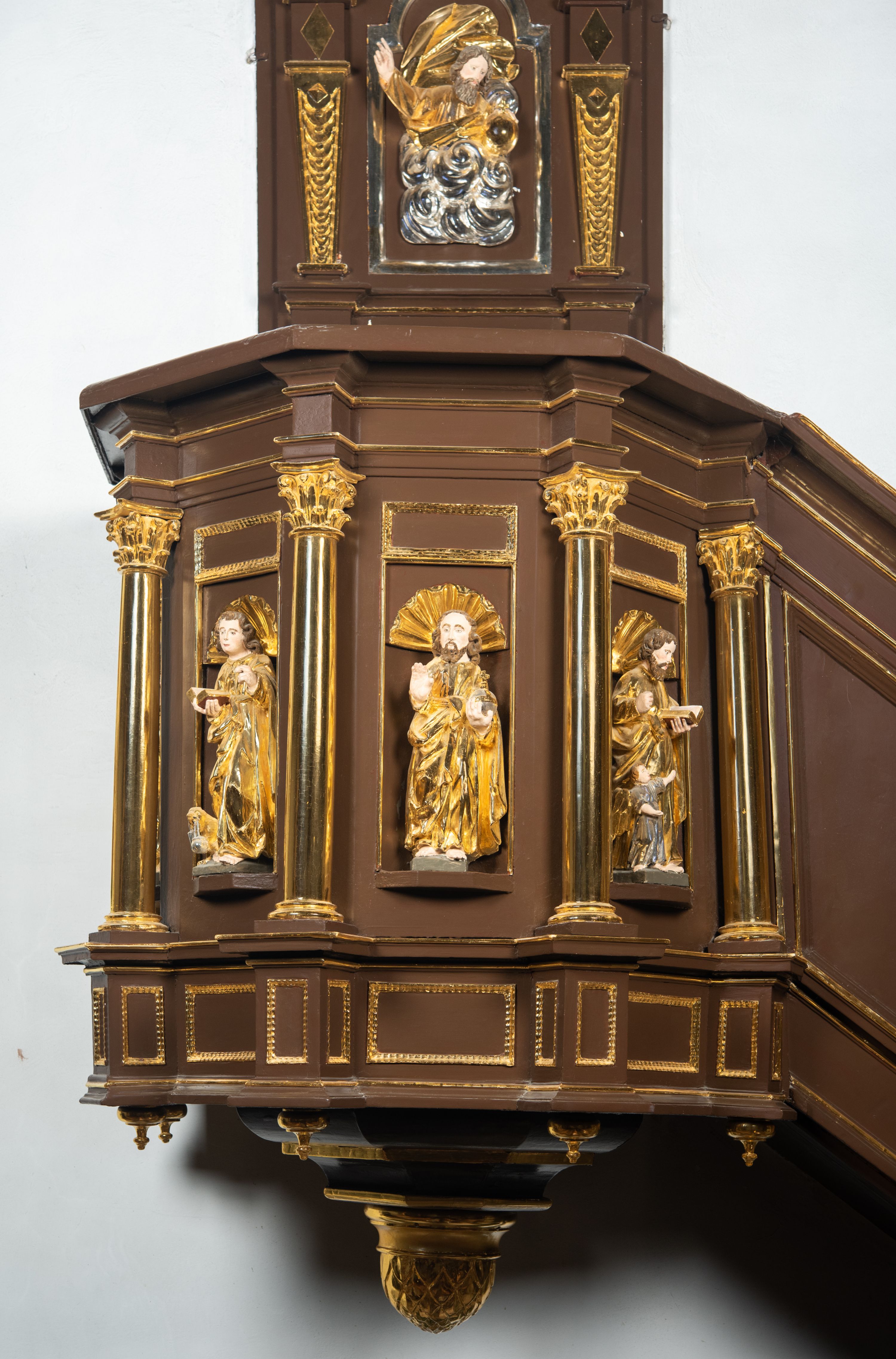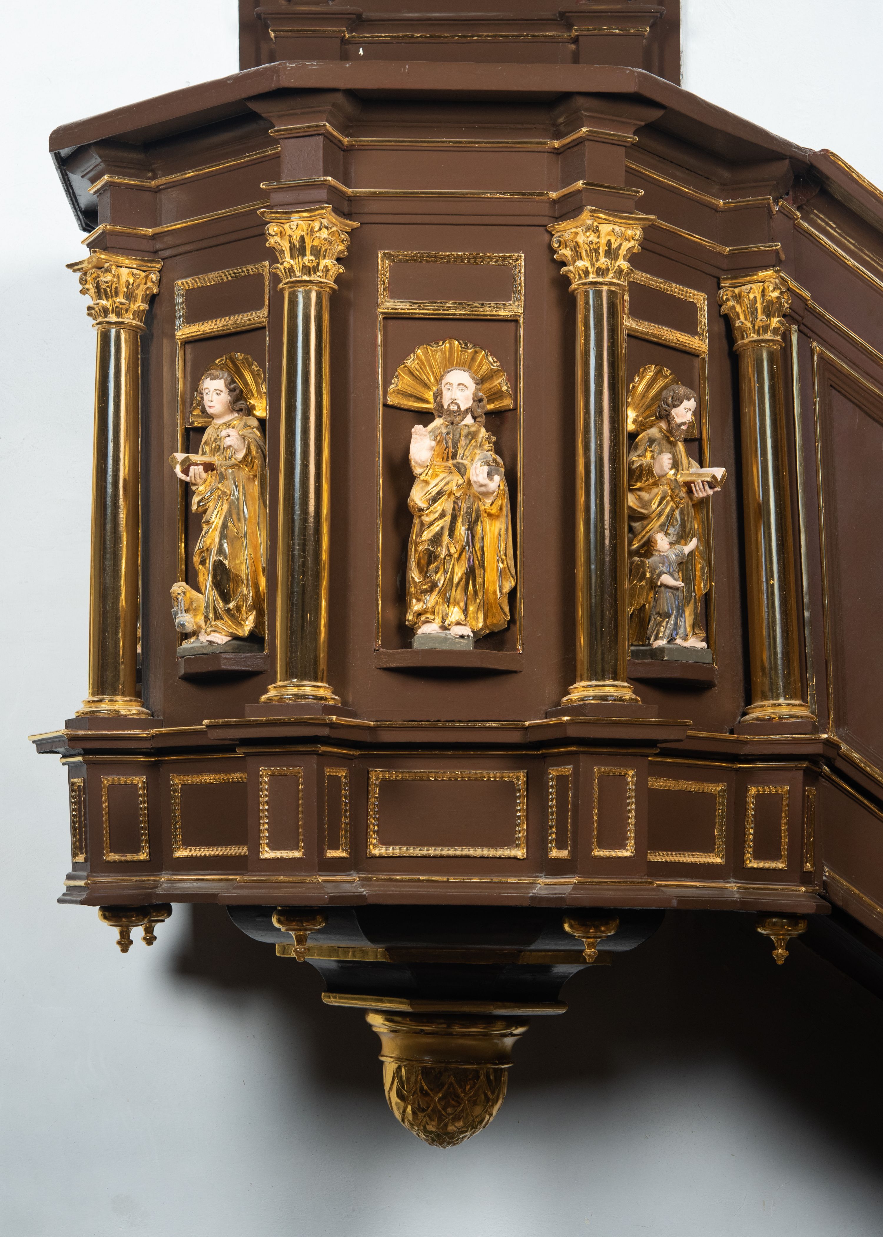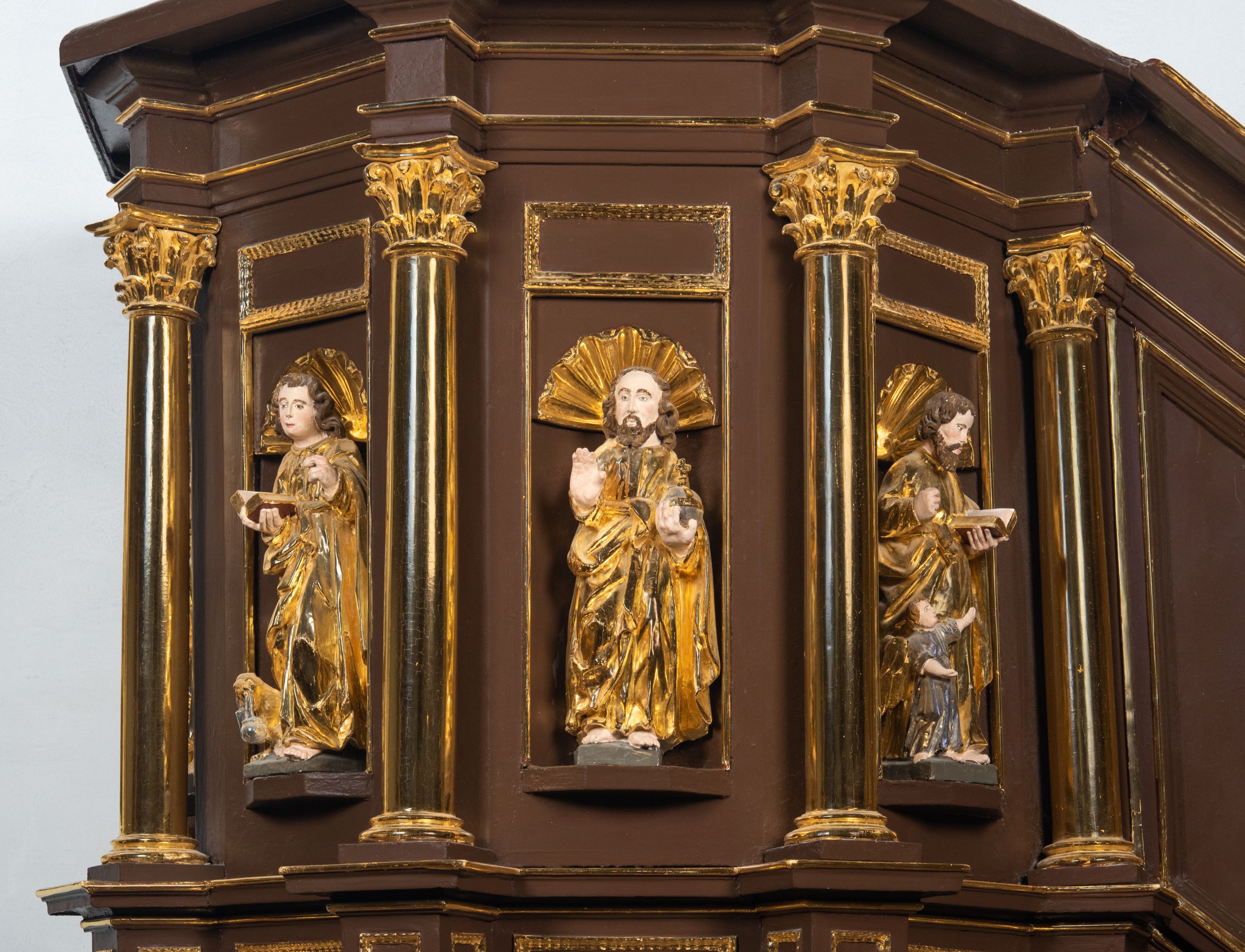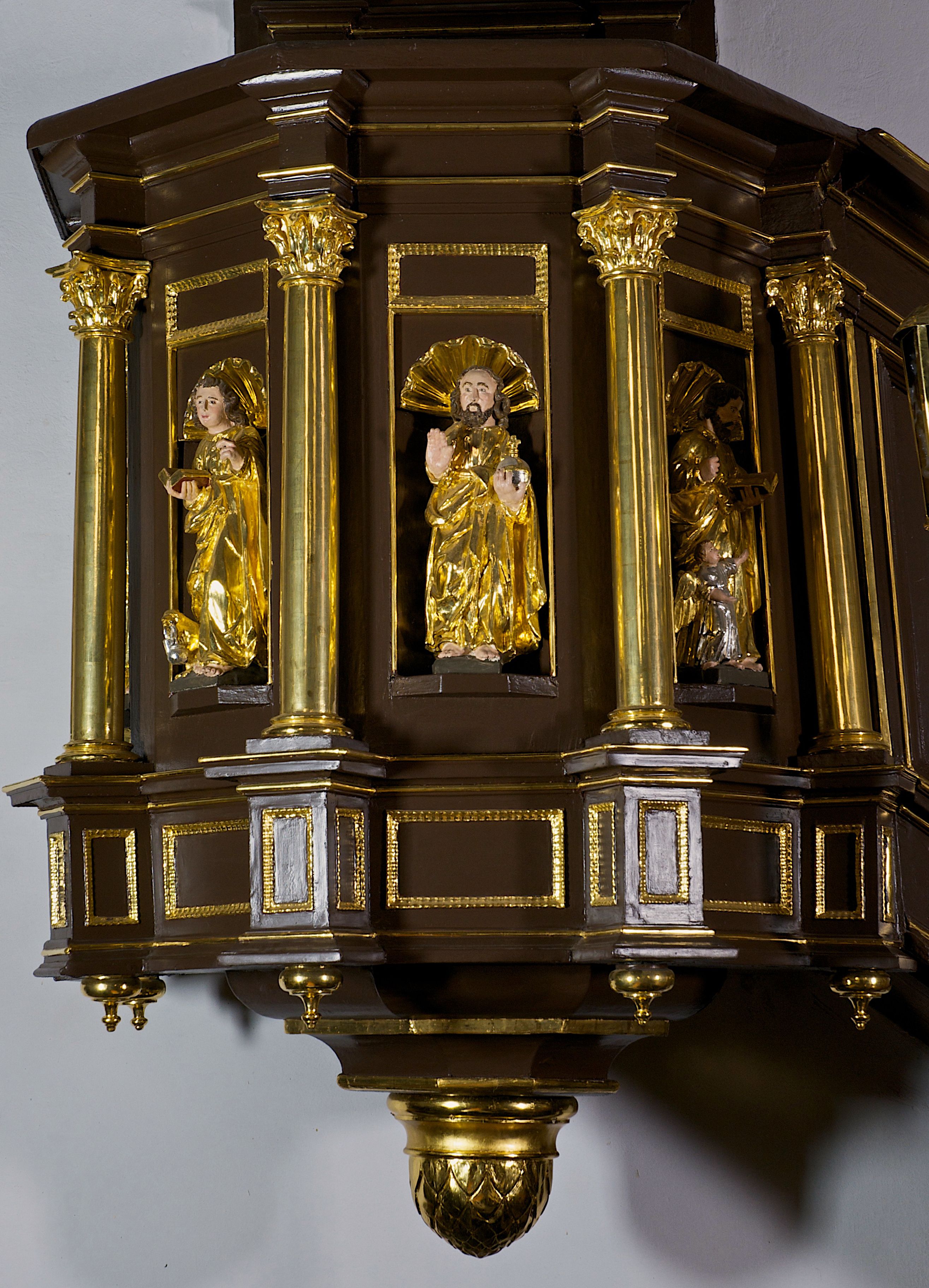 We wnękach rzeźby z przedstawieniami ewangelistów i Chrystusa. Figury drewniane pełnoplastyczne, wydrążone od tyłu, polichromowane, złocone i srebrzone, ustawione na niewielkich prostokątnych podstawach, od lewej: św. Łukasz wsparty prawą nogą na głowie byka, św. Marek wsparty prawą nogą na głowie lwa, św. Jan z orłem przy prawej nodze, Chrystus Salvator Mundi, św. Mateusz z aniołem przy prawej nodze. Ewangeliści trzymają w prawych dłoniach otwarte księgi, z wyjątkiem św. Mateusza, trzymającego kodeks w lewej ręce. Dłonie ewangelistów nieproporcjonalnie duże. Szaty bogato pofałdowane, głęboko cięte.