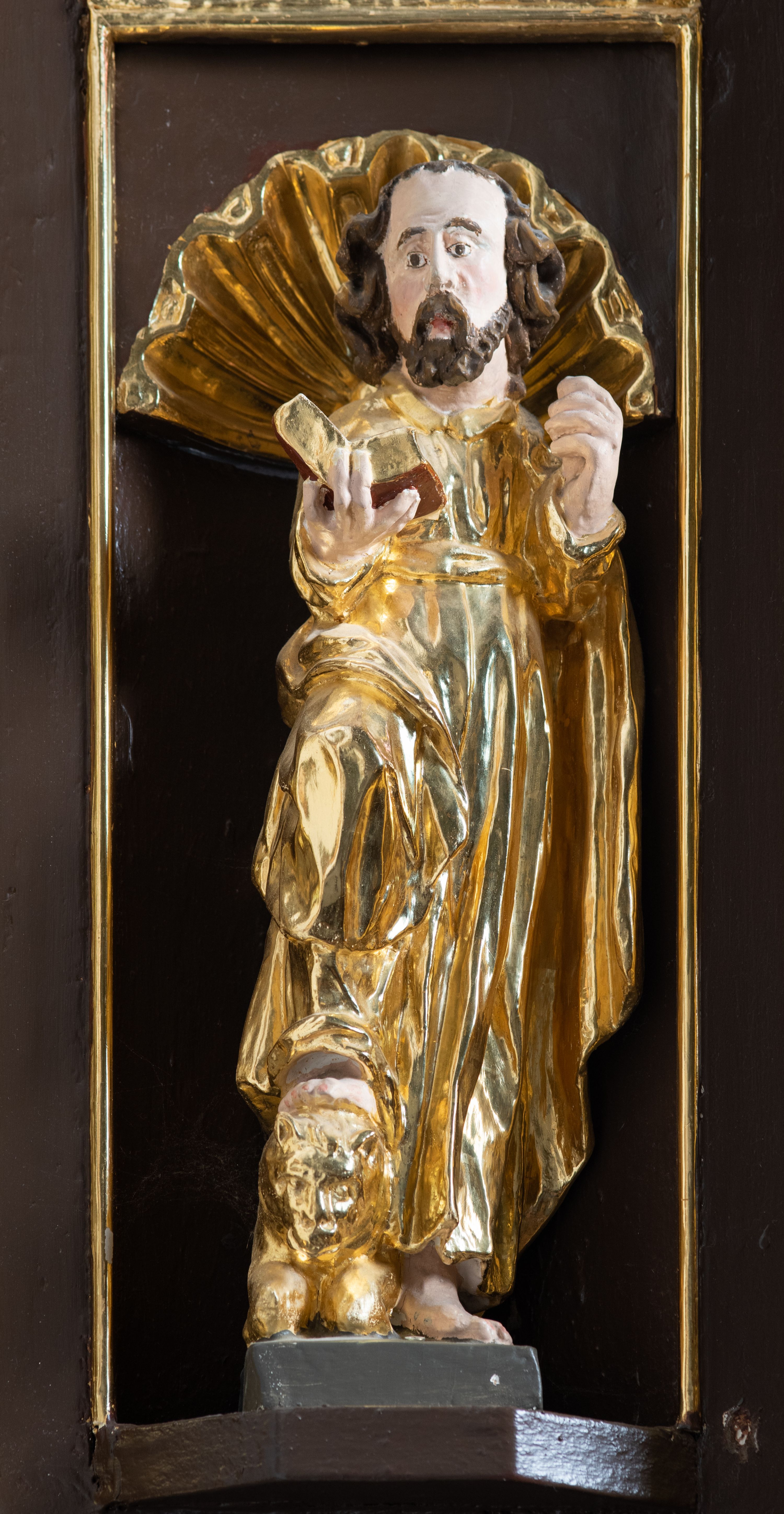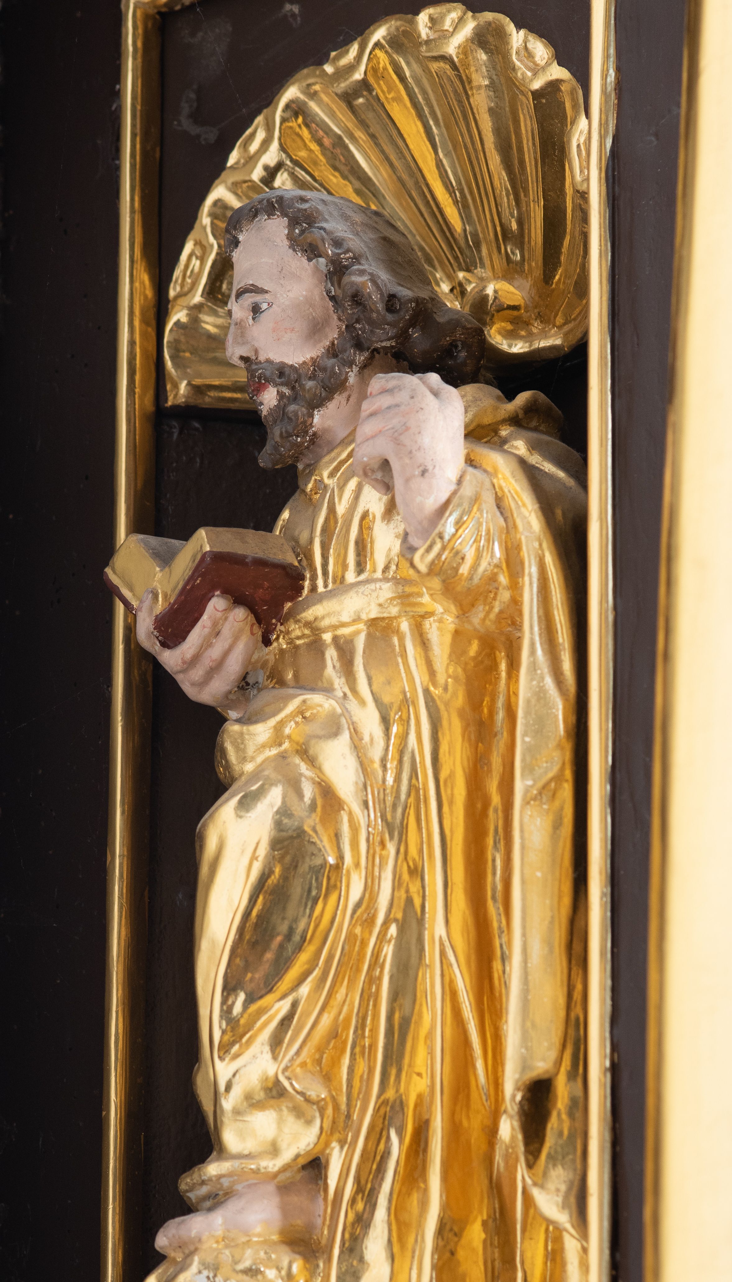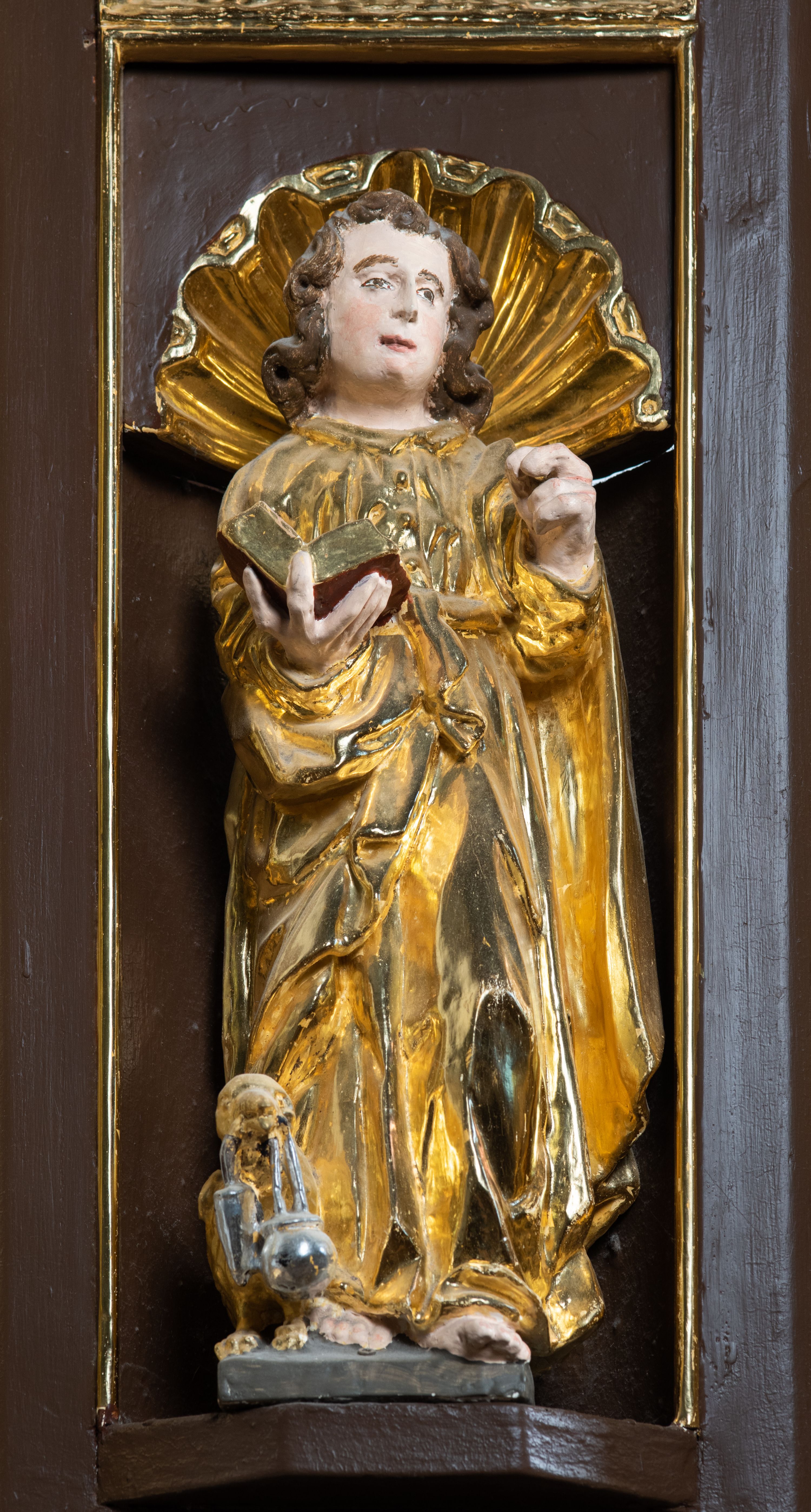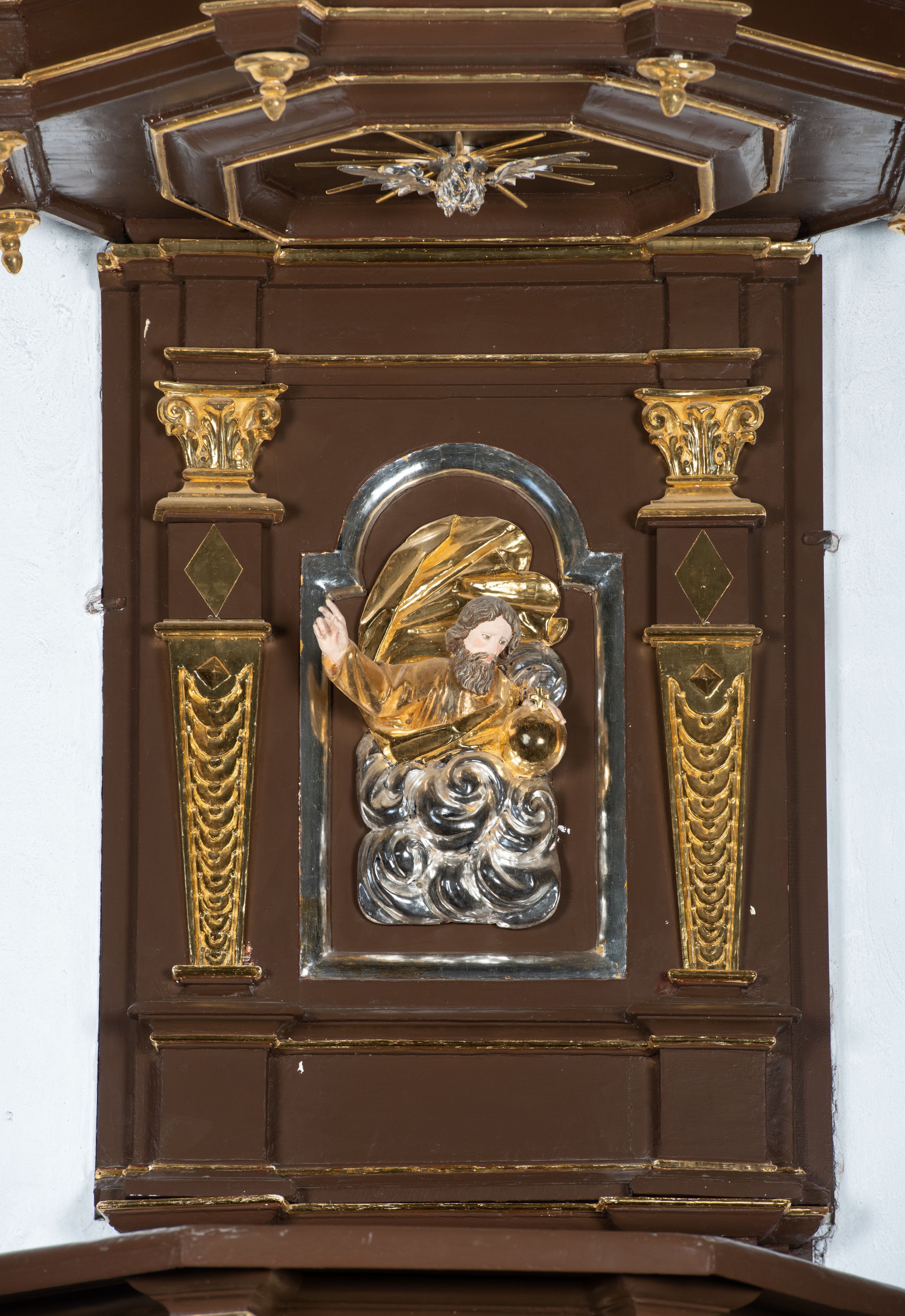 We wnękach rzeźby z przedstawieniami ewangelistów i Chrystusa. Figury drewniane pełnoplastyczne, wydrążone od tyłu, polichromowane, złocone i srebrzone, ustawione na niewielkich prostokątnych podstawach, od lewej: św. Łukasz wsparty prawą nogą na głowie byka, św. Marek wsparty prawą nogą na głowie lwa, św. Jan z orłem przy prawej nodze, Chrystus Salvator Mundi, św. Mateusz z aniołem przy prawej nodze. Ewangeliści trzymają w prawych dłoniach otwarte księgi, z wyjątkiem św. Mateusza, trzymającego kodeks w lewej ręce. Dłonie ewangelistów nieproporcjonalnie duże. Szaty bogato pofałdowane, głęboko cięte.