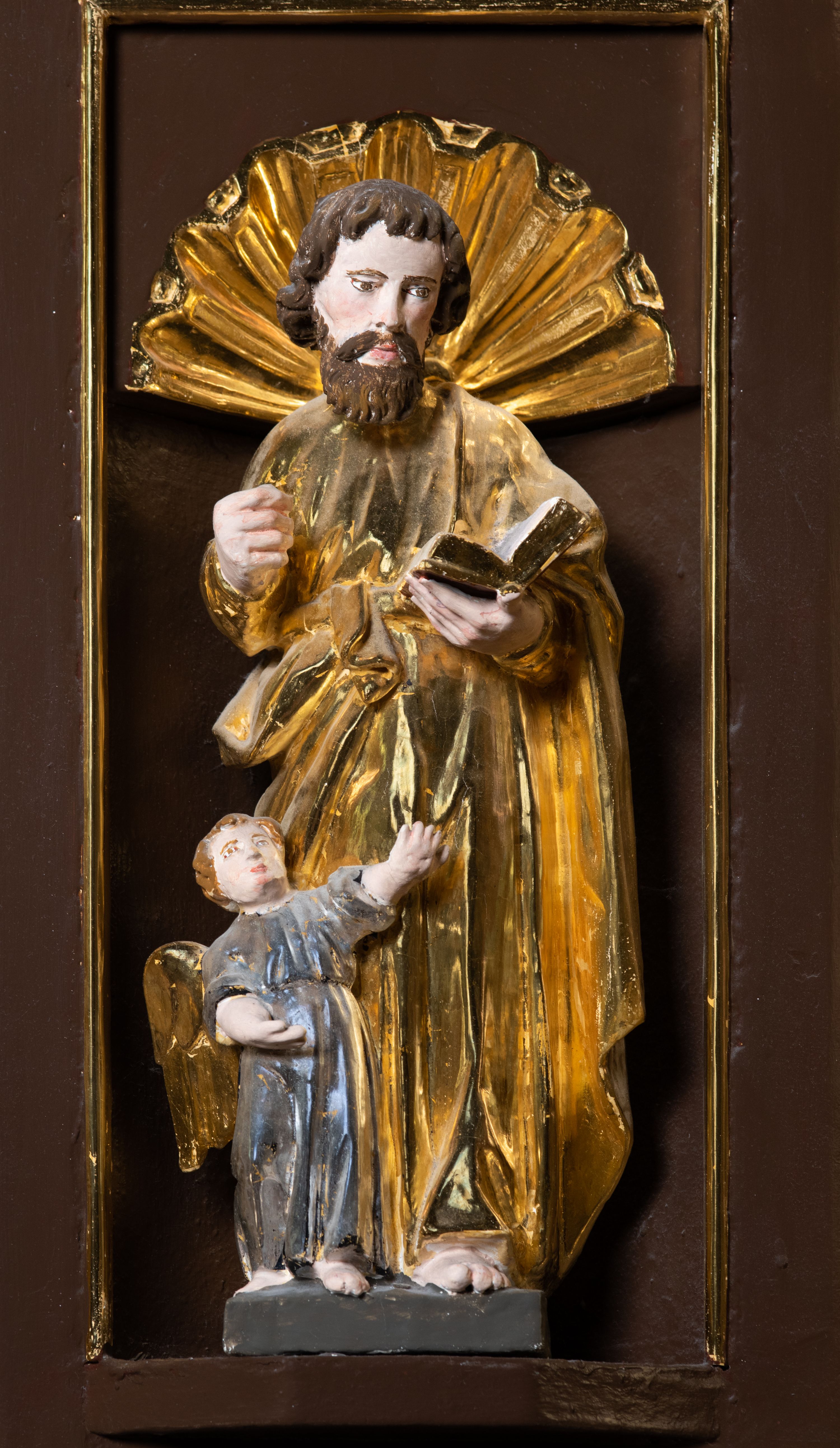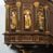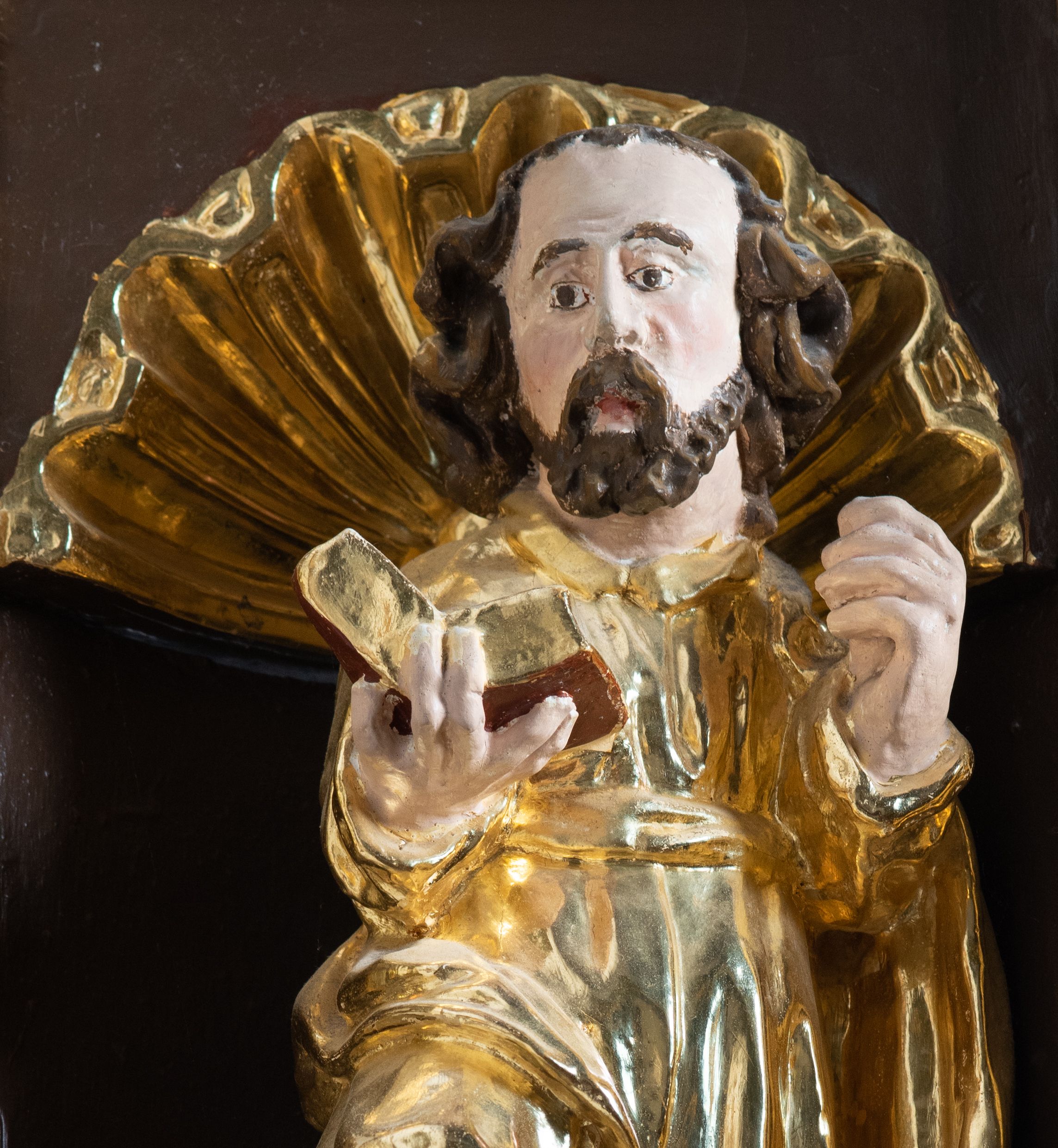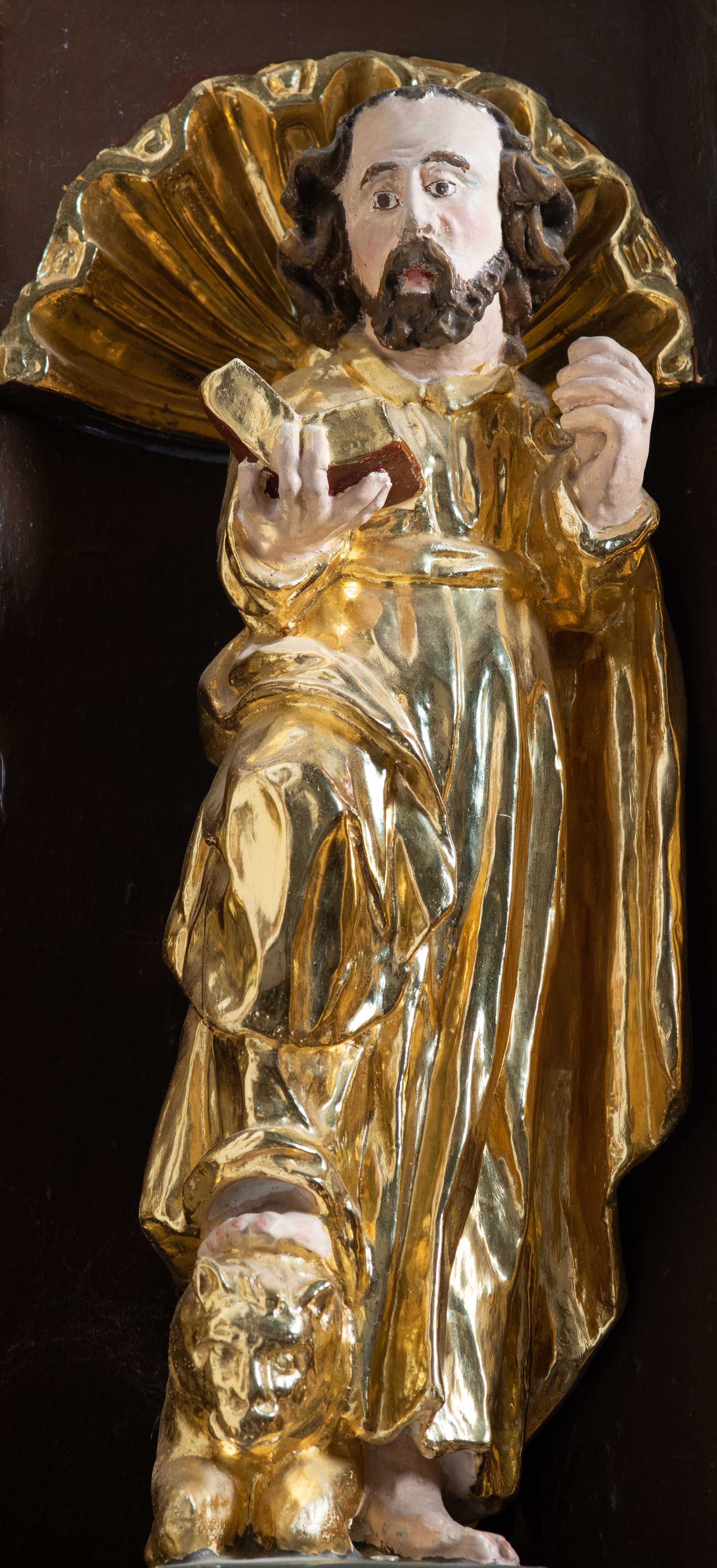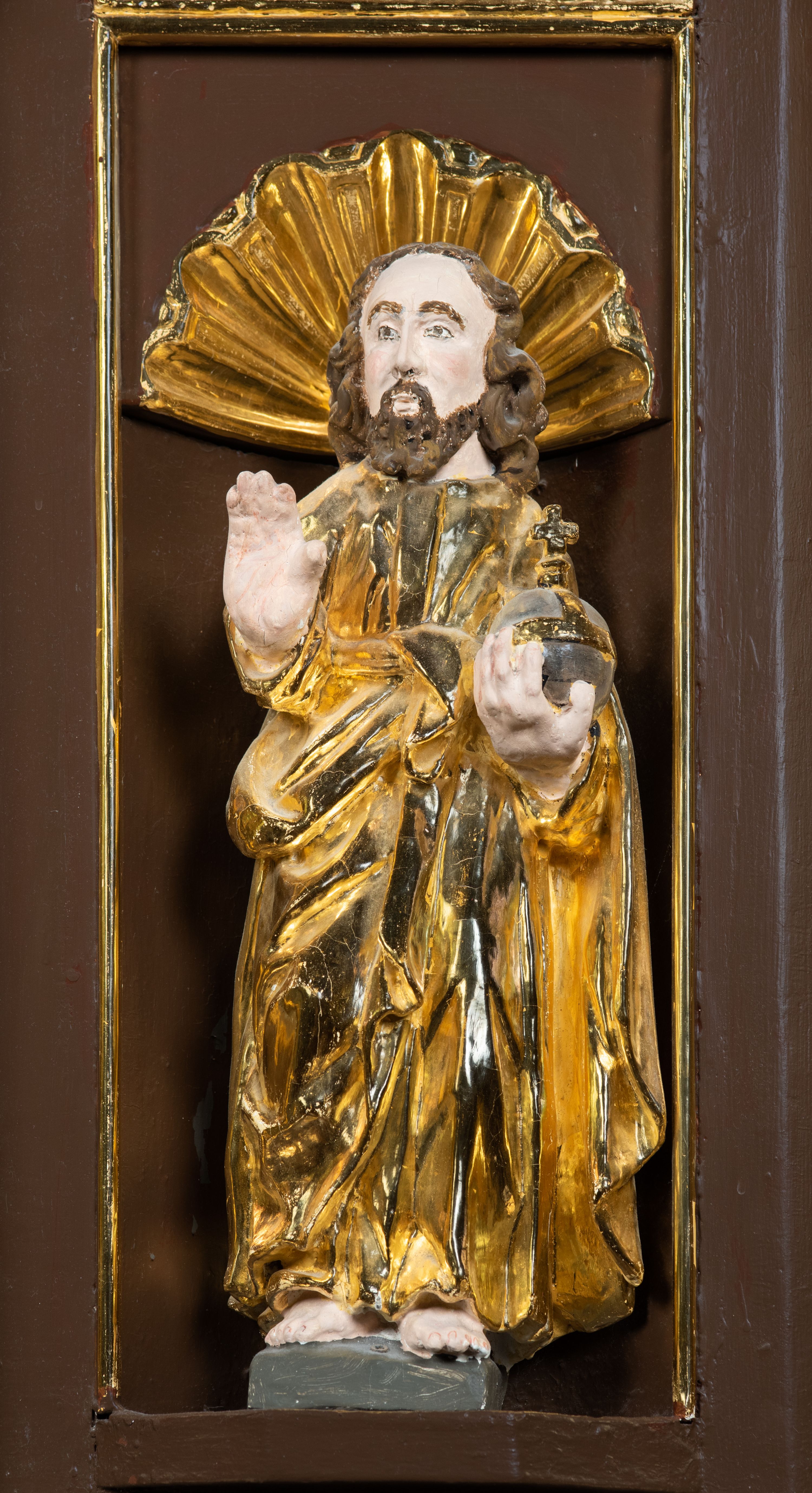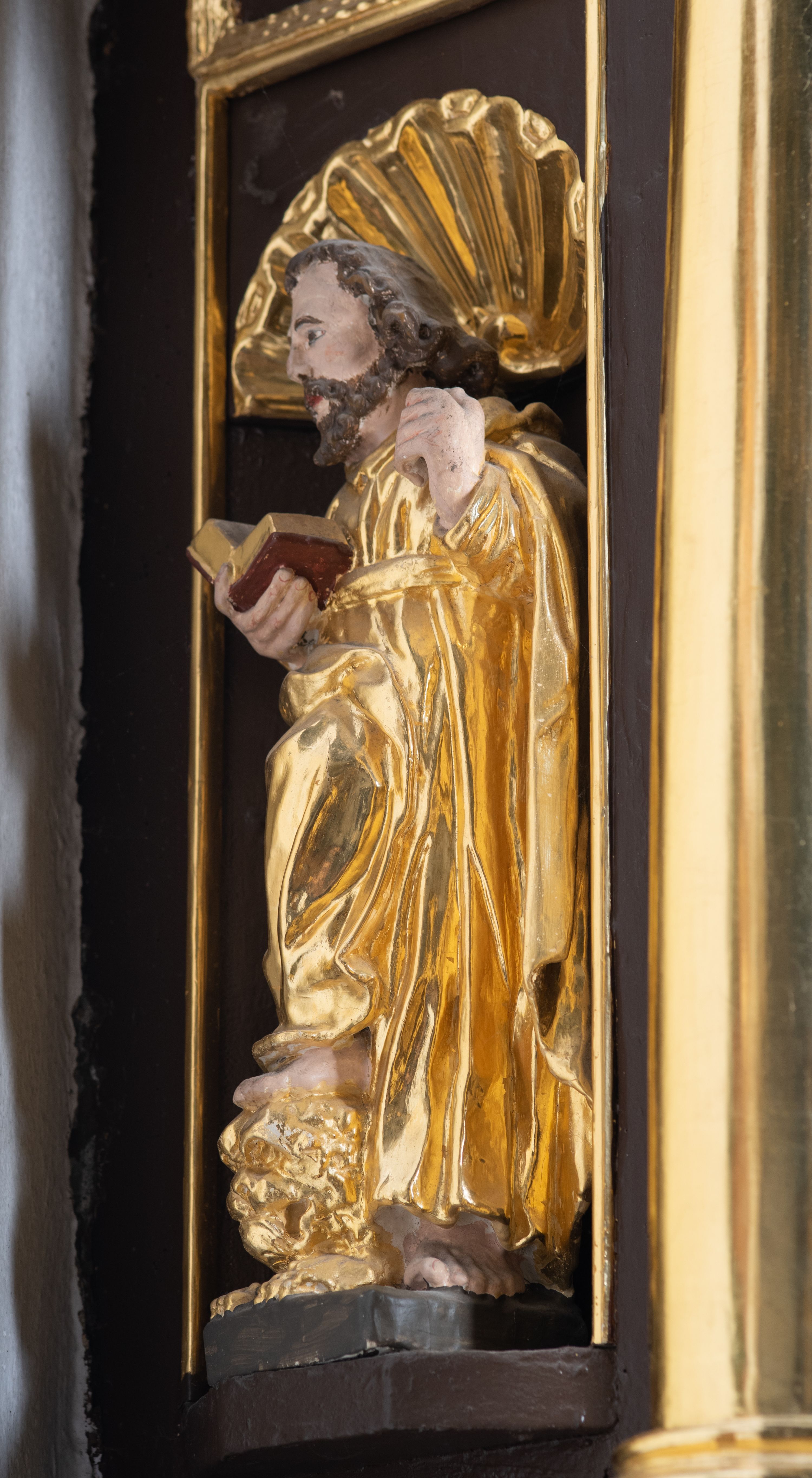 We wnękach rzeźby z przedstawieniami ewangelistów i Chrystusa. Figury drewniane pełnoplastyczne, wydrążone od tyłu, polichromowane, złocone i srebrzone, ustawione na niewielkich prostokątnych podstawach, od lewej: św. Łukasz wsparty prawą nogą na głowie byka, św. Marek wsparty prawą nogą na głowie lwa, św. Jan z orłem przy prawej nodze, Chrystus Salvator Mundi, św. Mateusz z aniołem przy prawej nodze. Ewangeliści trzymają w prawych dłoniach otwarte księgi, z wyjątkiem św. Mateusza, trzymającego kodeks w lewej ręce. Dłonie ewangelistów nieproporcjonalnie duże. Szaty bogato pofałdowane, głęboko cięte.