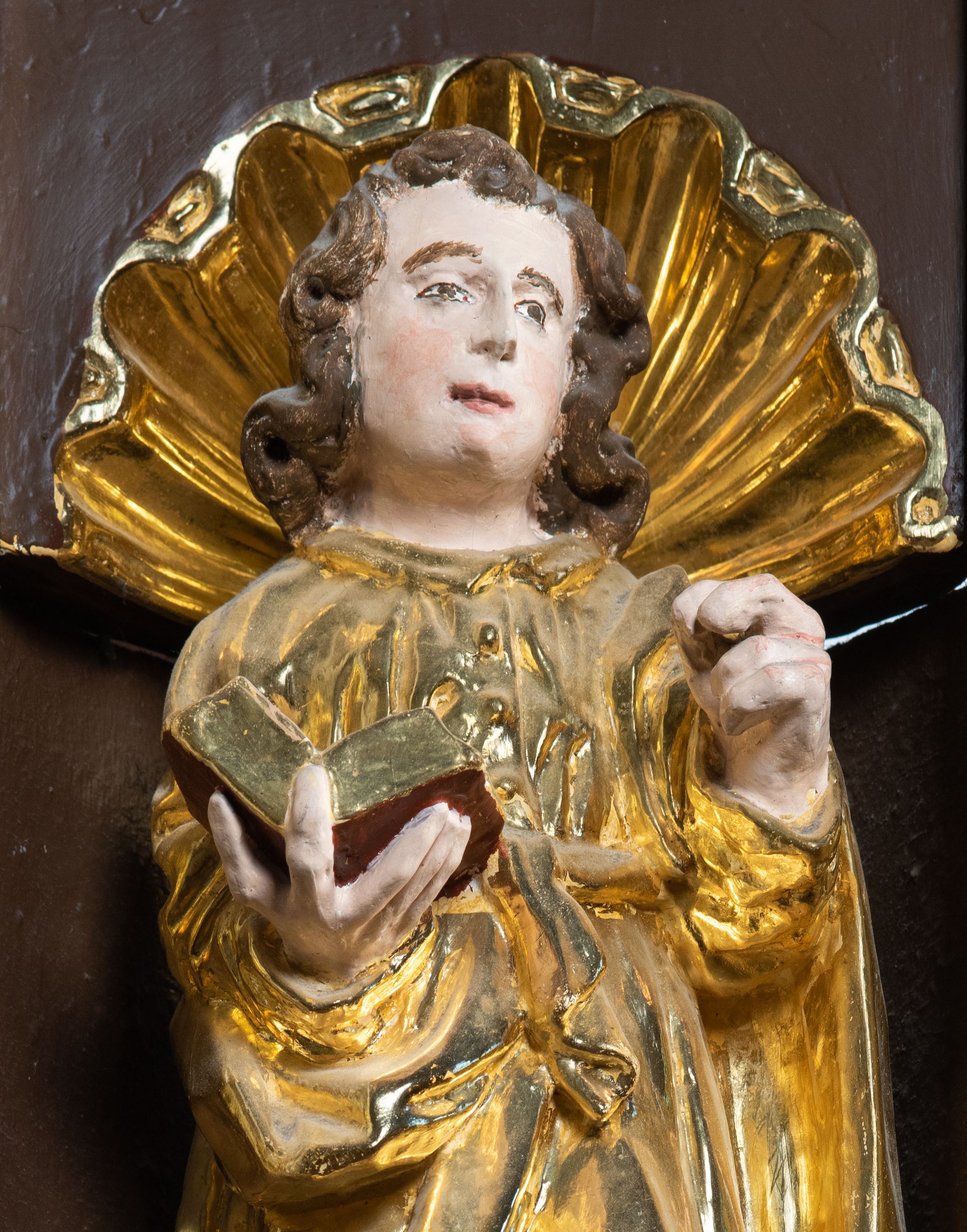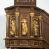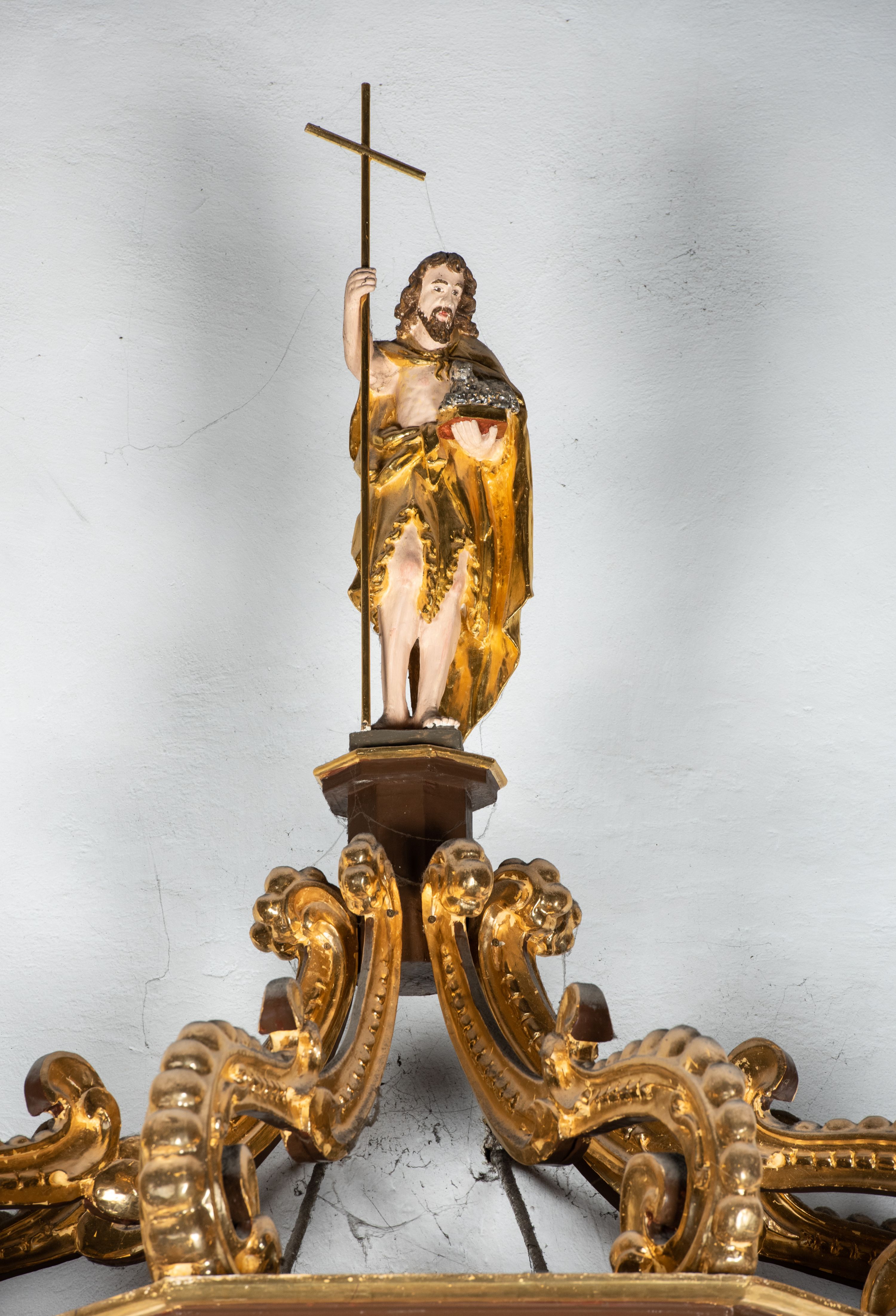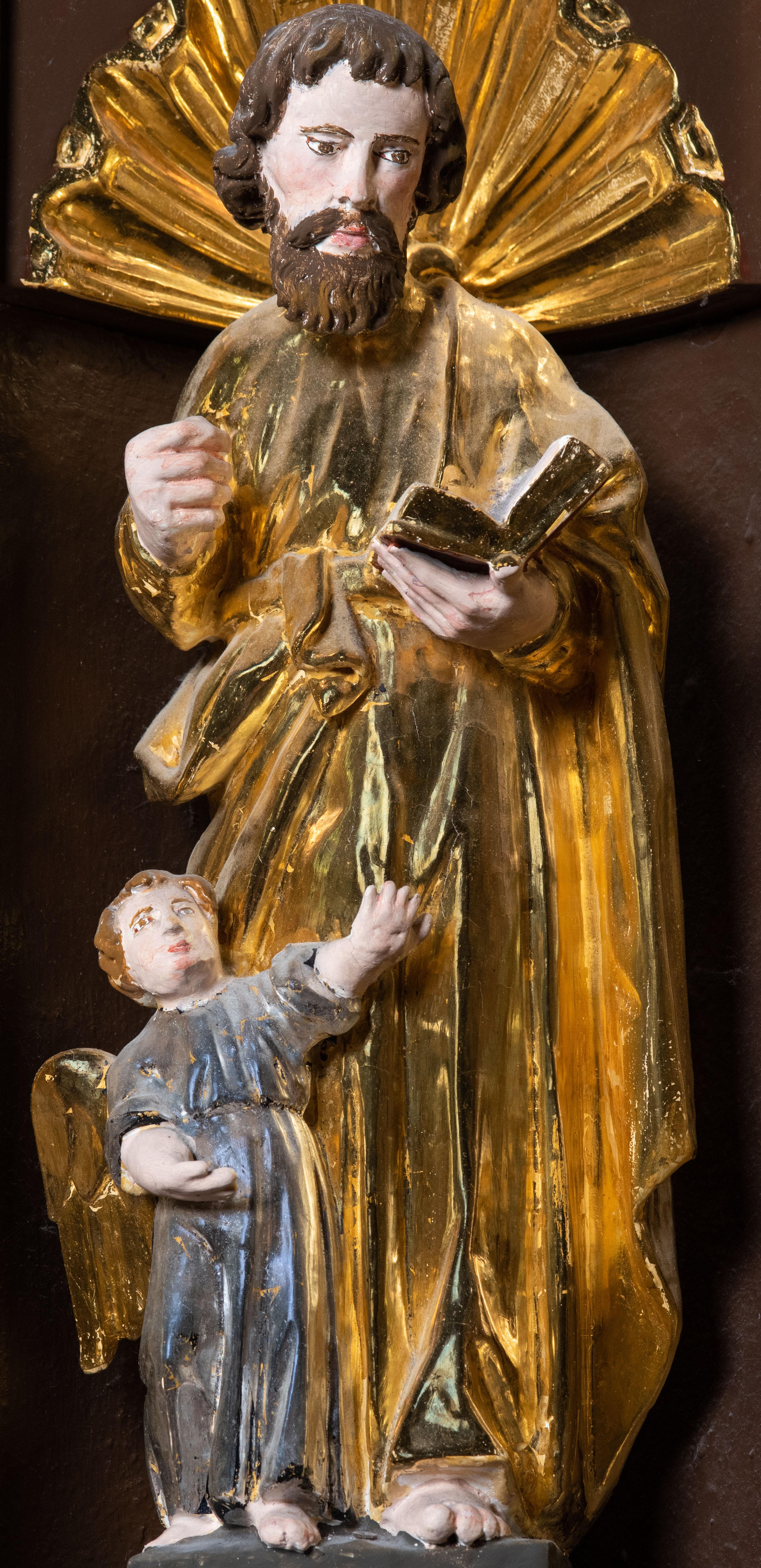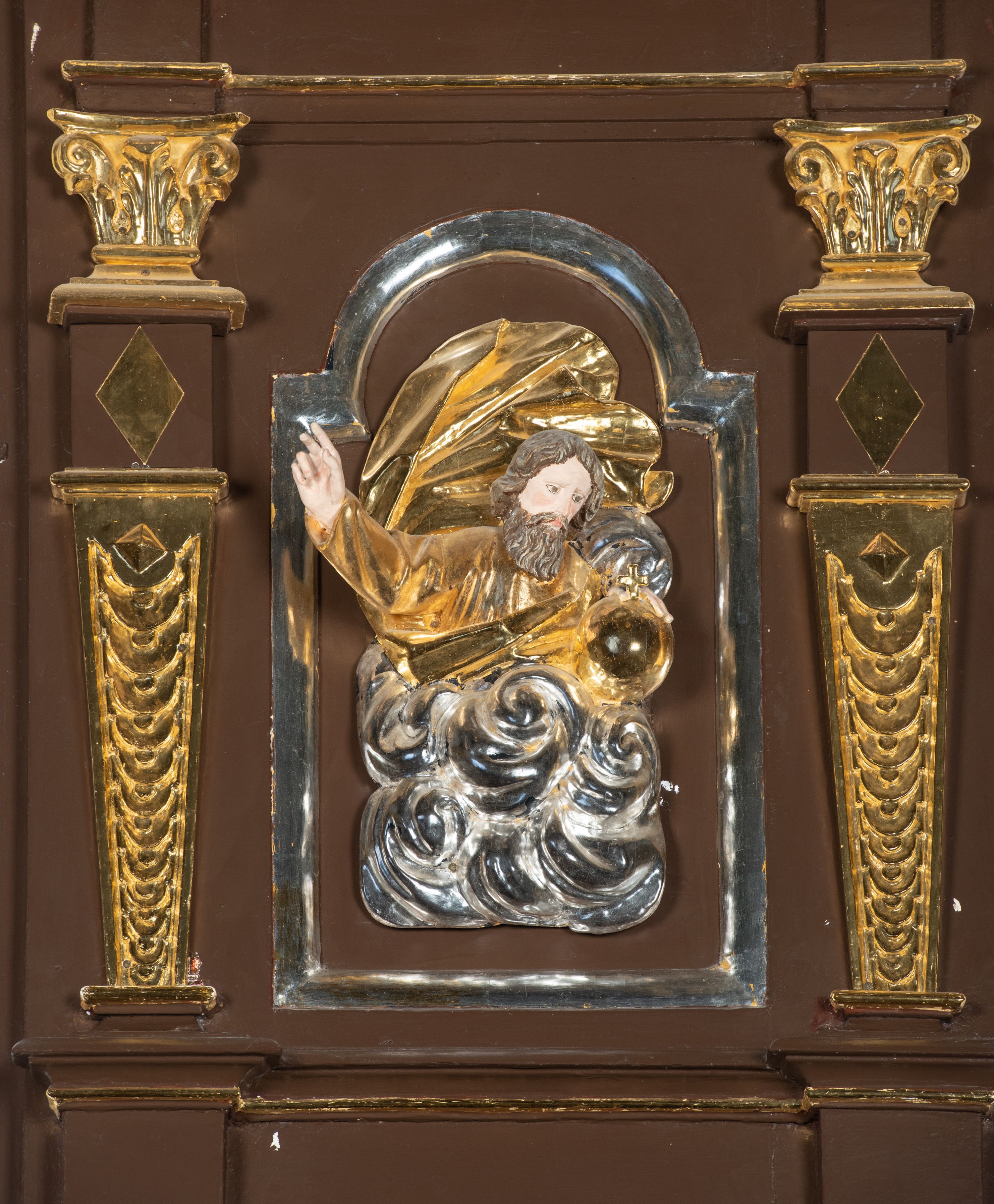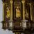 We wnękach rzeźby z przedstawieniami ewangelistów i Chrystusa. Figury drewniane pełnoplastyczne, wydrążone od tyłu, polichromowane, złocone i srebrzone, ustawione na niewielkich prostokątnych podstawach, od lewej: św. Łukasz wsparty prawą nogą na głowie byka, św. Marek wsparty prawą nogą na głowie lwa, św. Jan z orłem przy prawej nodze, Chrystus Salvator Mundi, św. Mateusz z aniołem przy prawej nodze. Ewangeliści trzymają w prawych dłoniach otwarte księgi, z wyjątkiem św. Mateusza, trzymającego kodeks w lewej ręce. Dłonie ewangelistów nieproporcjonalnie duże. Szaty bogato pofałdowane, głęboko cięte.