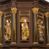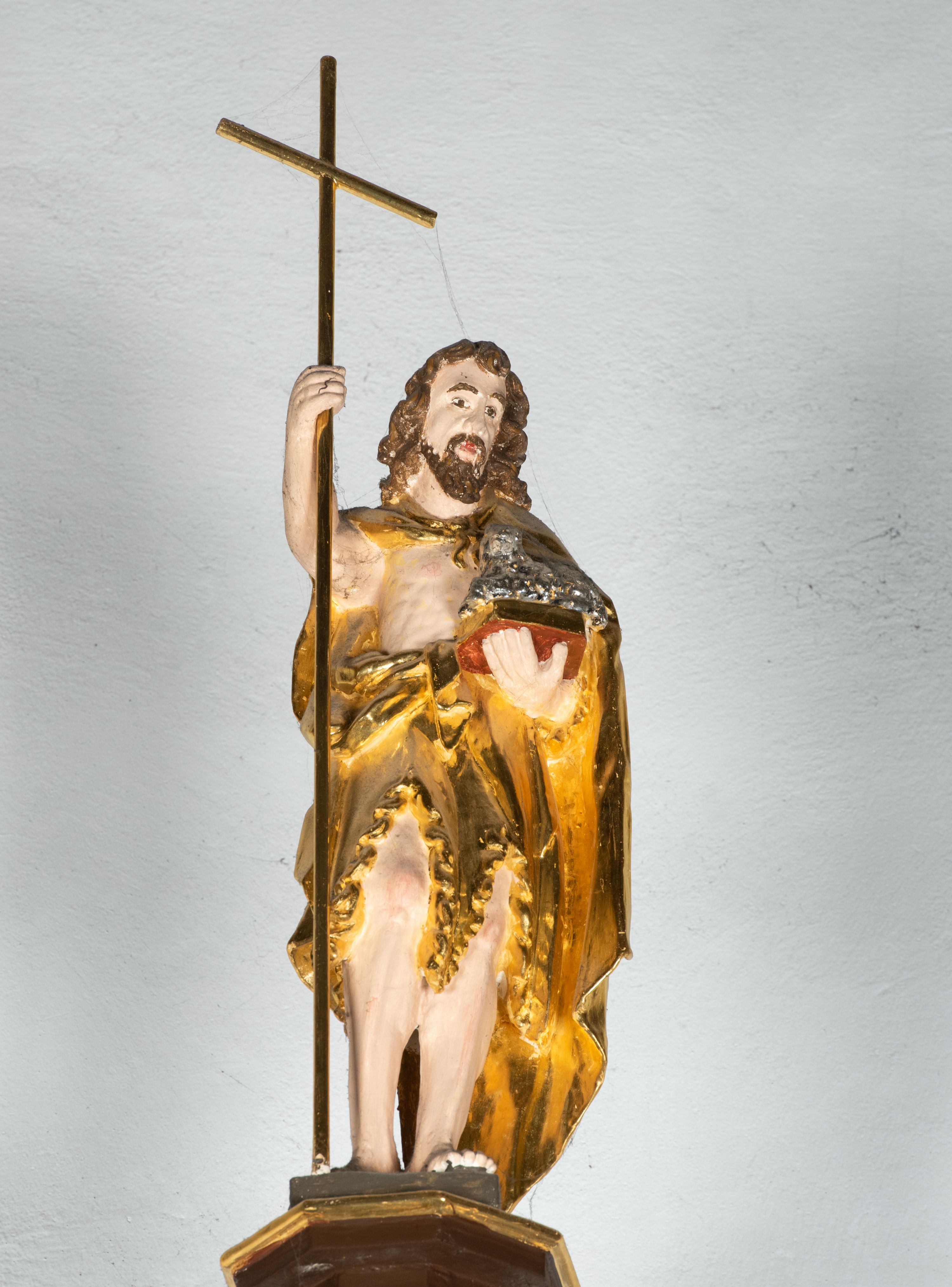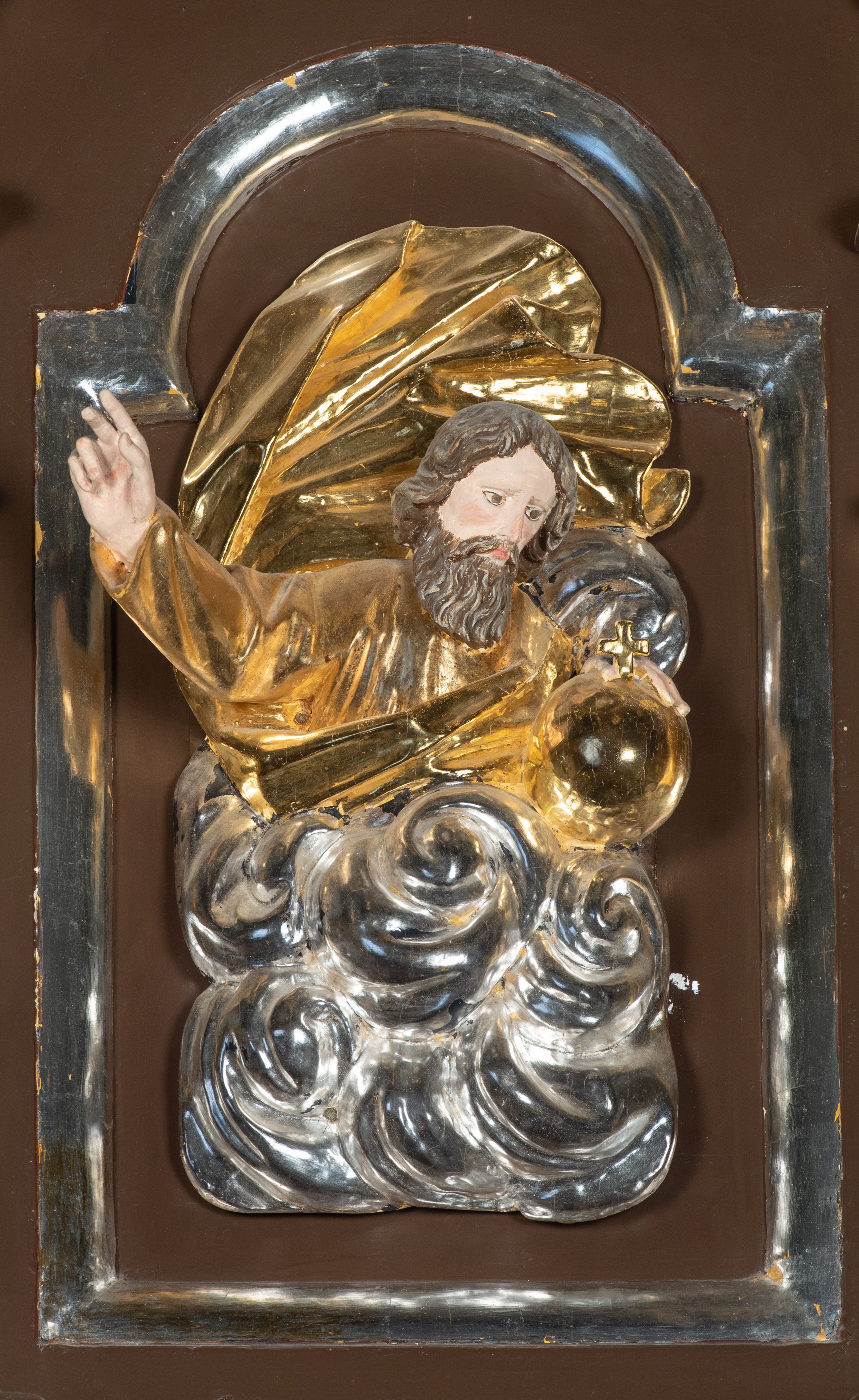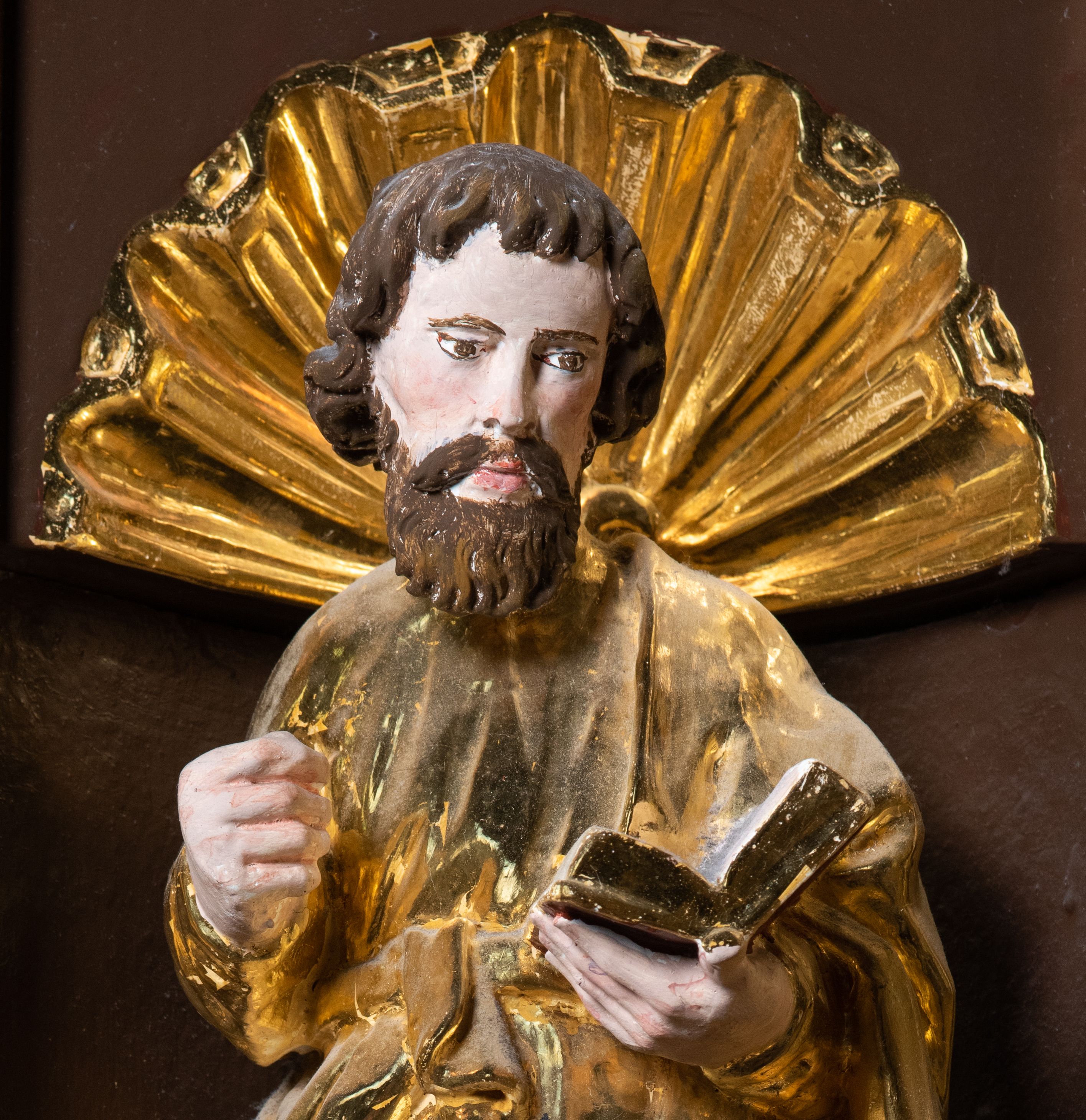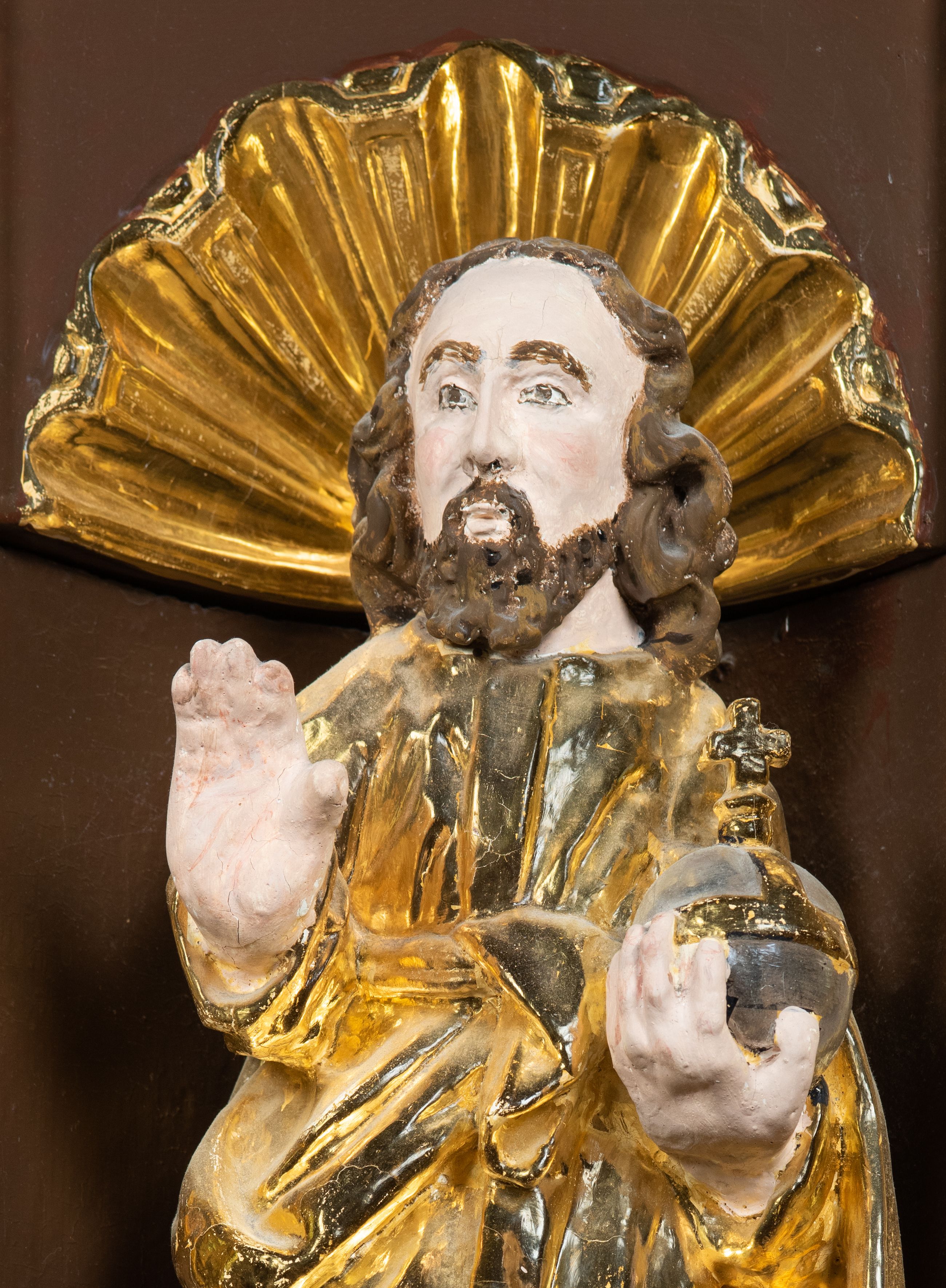 We wnękach rzeźby z przedstawieniami ewangelistów i Chrystusa. Figury drewniane pełnoplastyczne, wydrążone od tyłu, polichromowane, złocone i srebrzone, ustawione na niewielkich prostokątnych podstawach, od lewej: św. Łukasz wsparty prawą nogą na głowie byka, św. Marek wsparty prawą nogą na głowie lwa, św. Jan z orłem przy prawej nodze, Chrystus Salvator Mundi, św. Mateusz z aniołem przy prawej nodze. Ewangeliści trzymają w prawych dłoniach otwarte księgi, z wyjątkiem św. Mateusza, trzymającego kodeks w lewej ręce. Dłonie ewangelistów nieproporcjonalnie duże. Szaty bogato pofałdowane, głęboko cięte.