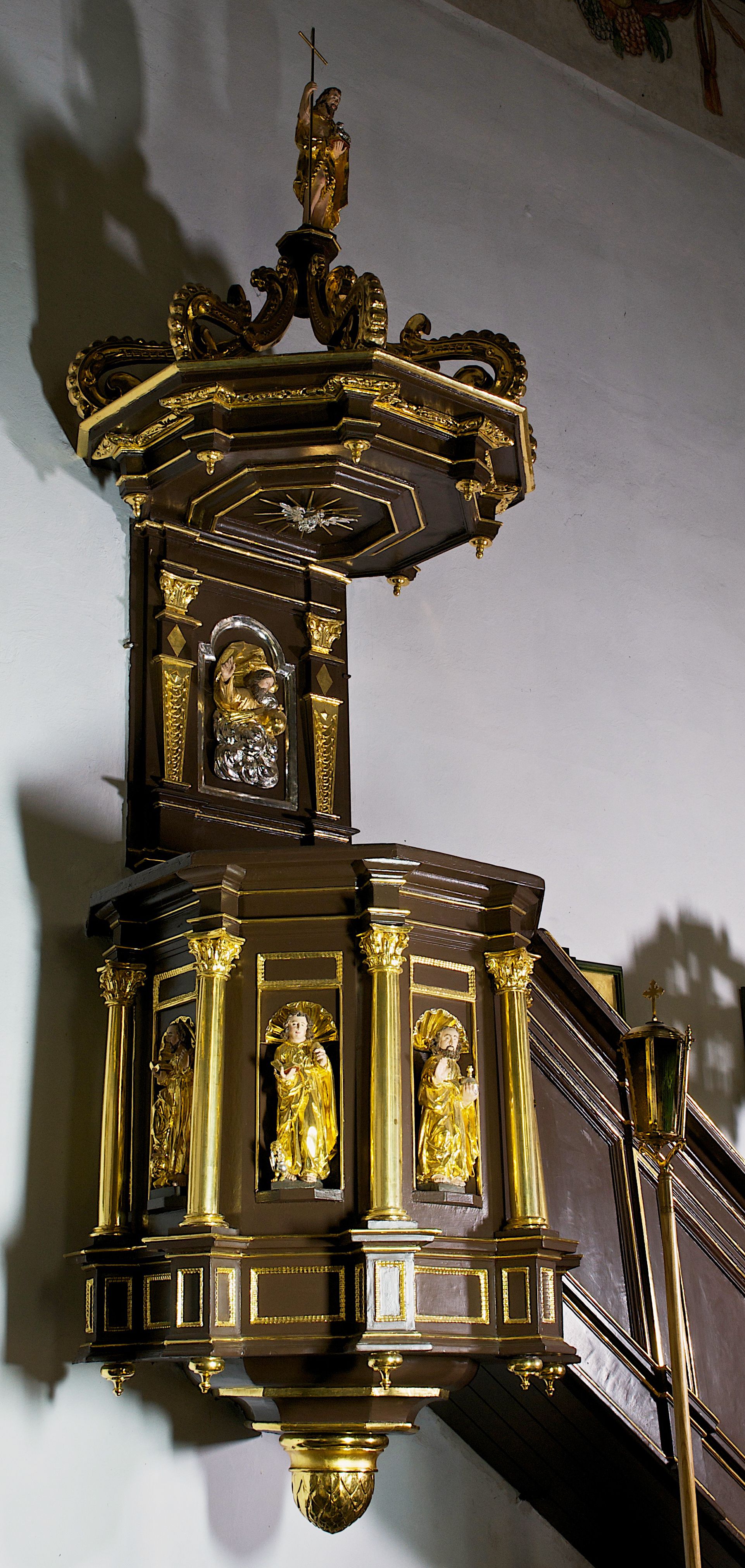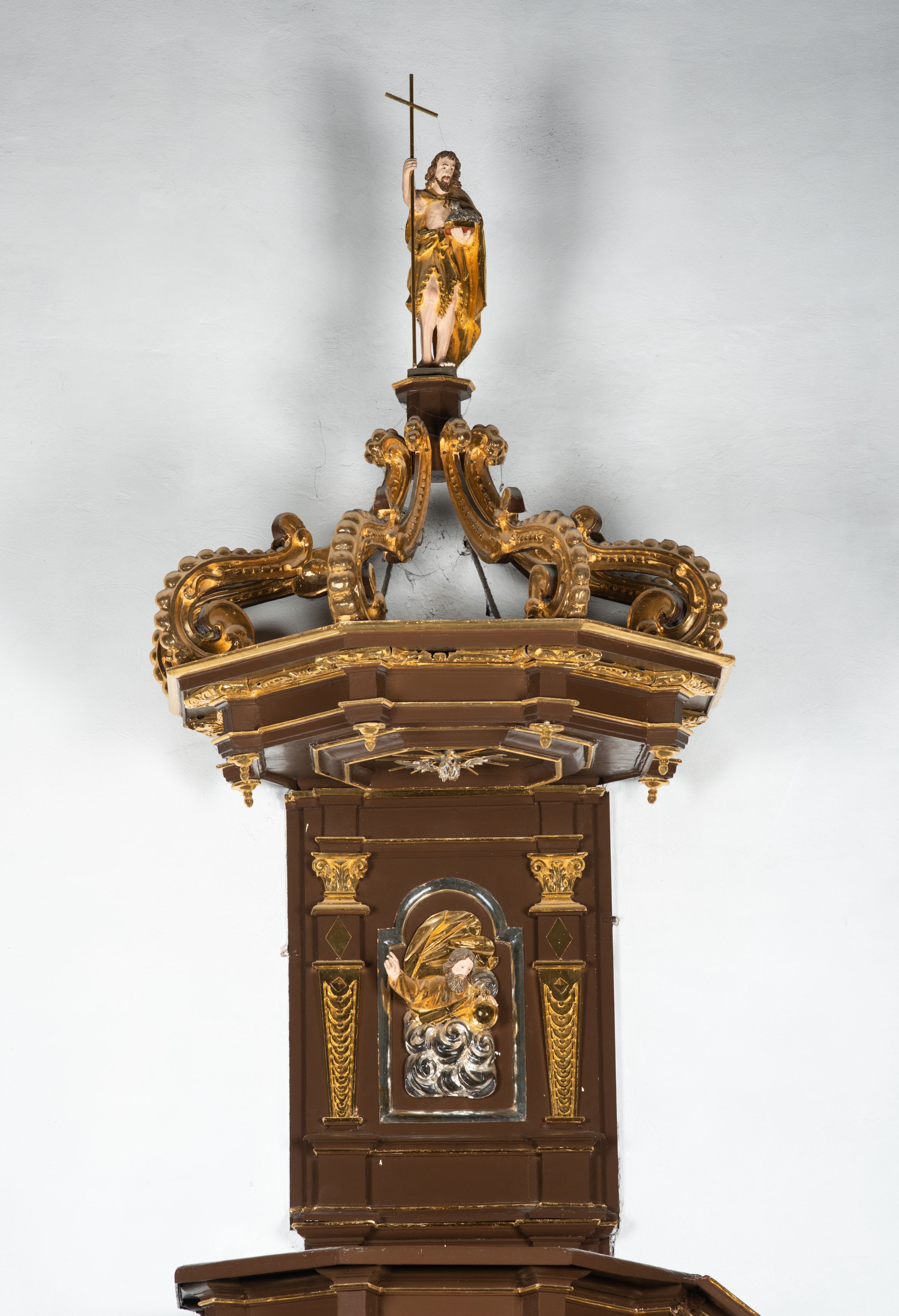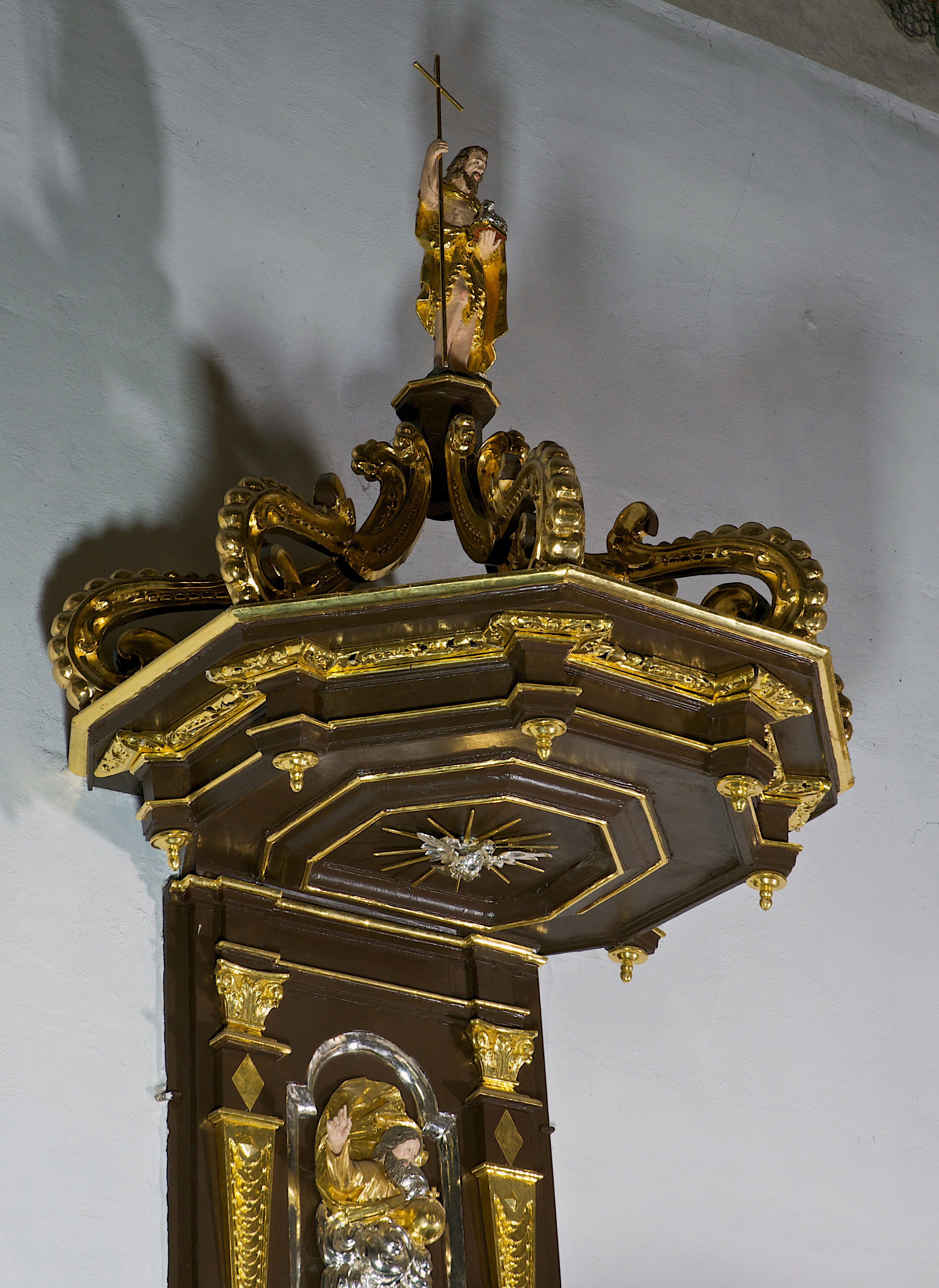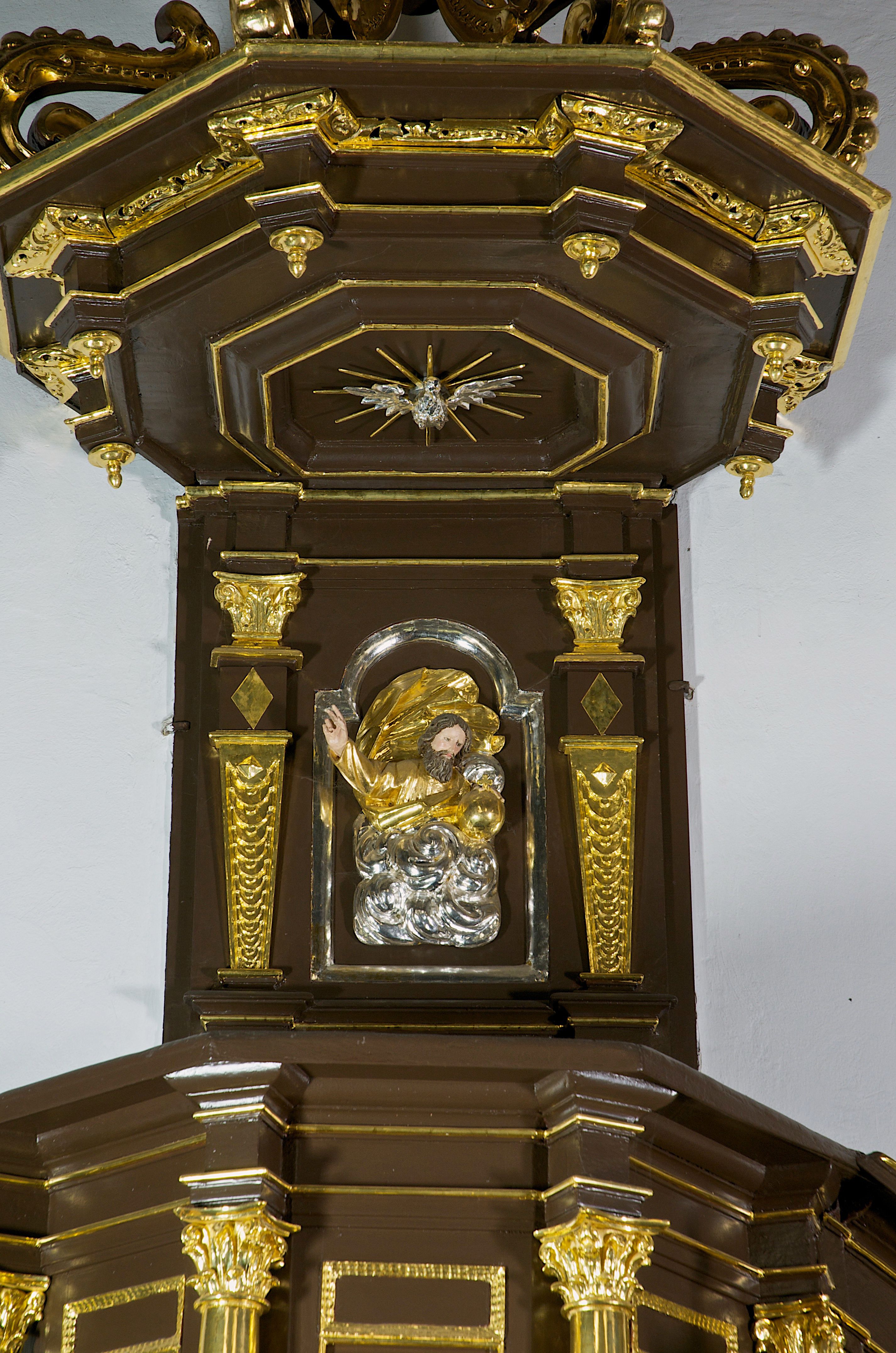 Podstawa kosza bogato profilowana, ozdobiona podwieszoną dekoracyjną szyszką. Schodki ograniczone parapetem z trzema romboidalnymi płycinami w złoconych profilowanych obramieniach. Na filarze przy wejściu na schodki złocona kula z szyszką. Zaplecek w kształcie stojącego prostokąta, w górnej części ujęty zwężającymi się ku dołowi pilastrami wypełnionymi cekinami, zwieńczonymi rombowymi wypustkami i korynckimi kapitelami, które podtrzymują przełamujące się nad nimi belkowanie. Pośrodku zaplecka w prostokątnym obramieniu zamkniętym nadwieszonym łukiem półkolistym płaskorzeźbione popiersie Boga Ojca wyłaniającego się z obłoków. Prawa ręka Boga wzniesiona w geście błogosławieństwa, lewa oparta na globie ziemskim zwieńczonym krzyżem. Tłem dla postaci Boga Ojca jest rozwiana poła płaszcza układająca się niemal półkoliście. Baldachim ośmioboczny. W profilowanym podniebiu, ozdobionym pasem ornamentu małżowinowo-chrząstkowego i profilowanymi wisiorami, gołębica Ducha Świętego na tle glorii utworzonej z prostych promieni o równej długości. Baldachim ozdobiony zamkniętą koroną, którą tworzy pięć esownic pokrytych pasami ornamentu małżowinowo-chrząstkowego. W zwieńczeniu pełnoplastyczna rzeźba przedstawiająca św. Jana Chrzciciela. Figura drewniana, wydrążona z tyłu, polichromowana, złocona i srebrzona, ustawiona na niewielkiej wielobocznej profilowanej podstawie. Święty w prawej ręce trzyma wysoki krzyż, w lewej księgę, na której spoczywa Baranek Boży. Struktura ambony ciemnobrązowa. Kolumny, kapitele, pilastry w zaplecku korona baldachimu, profilowania i ornamenty złocone, z wyjątkiem srebrzonej ramy w zaplecku i gołębicy Ducha Świętego.