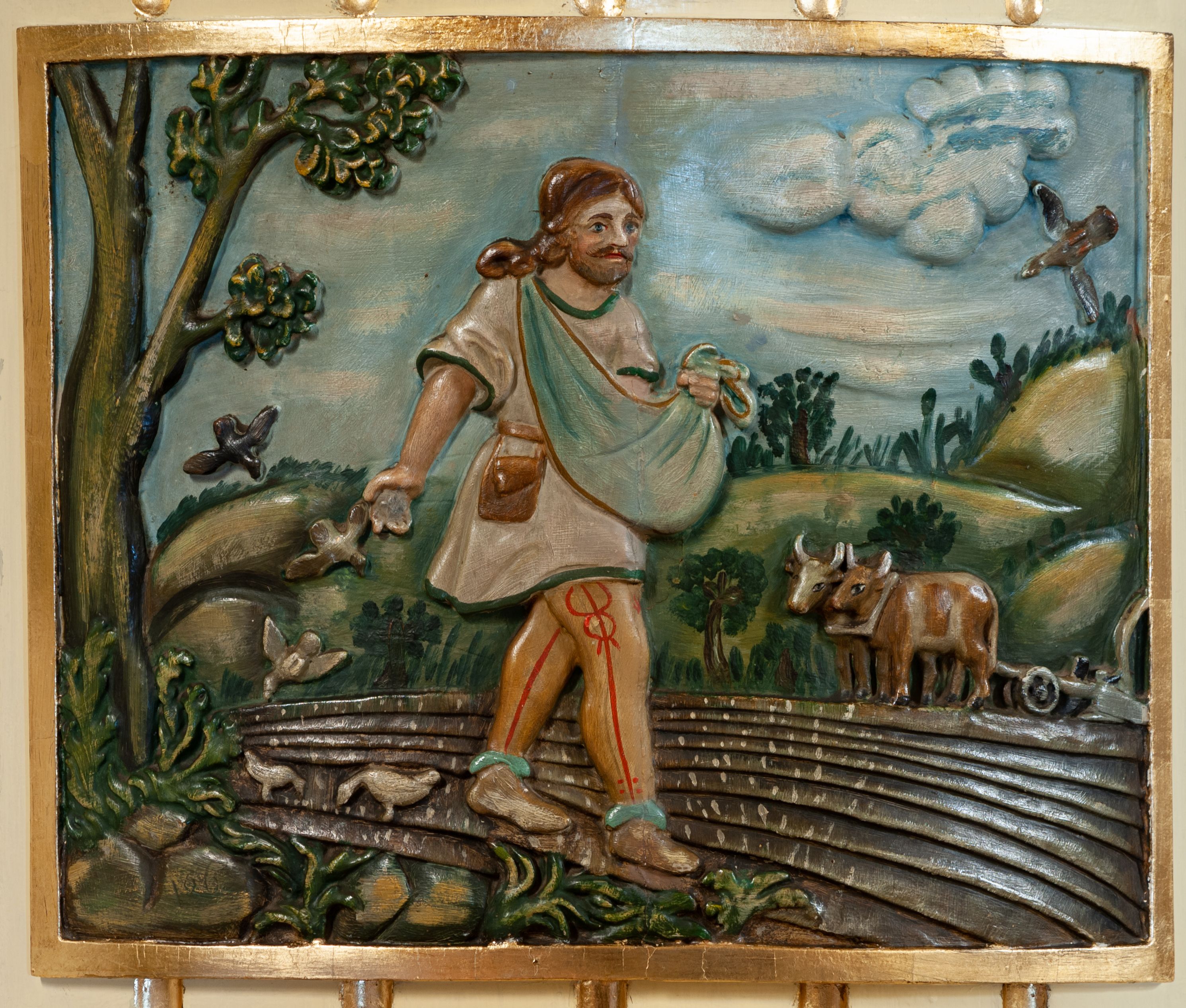 Ambona przyścienna, wisząca, z dostępem z prawej strony w postaci jednobiegowych schodów. Kosz czworoboczny, na planie kwadratu, o wypukłej ściance bocznej, z półwałkiem u dołu i podwieszoną szyszką. Na ściance frontowej kwadratowa płycina ze stylizowaną rozetą w polu. Na lewej ściance bocznej żłobkowanie i płaskorzeźba przedstawiająca Siewcę. Zaplecek w kształcie wydłużonego prostokąta, flankowany dwoma pilastrami, zamknięty profilowanym gzymsem. W polu dwie pionowe płyciny, górna zamknięta łukiem półkolistym, zdobione pojedynczymi motywami ornamentalnymi. Baldachim na planie kwadratu o ściętych narożach, na brzegach zdobiony lambrekinem. Na szczycie krzyż i otwarta księga z monogramami Chrystusa i Marii, ustawione na tle promienistej glorii i obłoków. Na podniebieniu baldachimu gołębica Ducha Świętego na tle promienistej glorii, złożonej z wiązek promieni o nierównej długości. Struktura polichromowana na kolor beżowy, detale jasnozielone i srebrzone, ornamentyka i profilowania złocone. Płaskorzeźba w kształcie poziomego prostokąta, ujęta złoconą ramą. Pośrodku kompozycji mężczyzna zwrócony trzy czwarte w lewo, lewą ręką przytrzymuje płachtę z ziarnem, prawą sieje zboże na zaorane pole. Twarz szeroka, okolona brodą, włosy długie i bujne, opadające na plecy. Ubrany w spodnie górali orawskich, krótką sukmanę oraz torbę skórzaną przy pasku. Po lewej stronie obrazu umieszczone wysokie drzewo oraz ptaki wydziobujące ziarno, po prawej woły zaprzęgnięte do pługa oraz krzyż na wysokim pagórku. W oddali pejzaż wiejski, powyżej błękitne niebo. Kolorystyka ciepła, stonowana. Na kamieniu, po lewej stronie data „1869”.