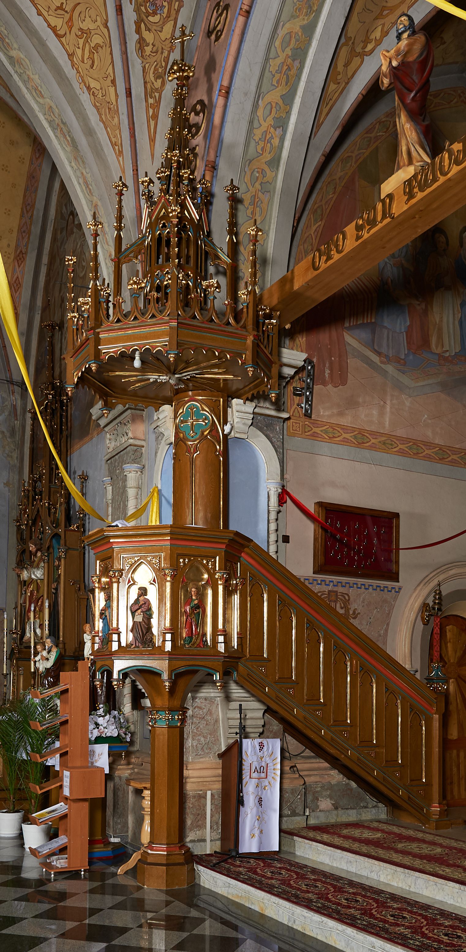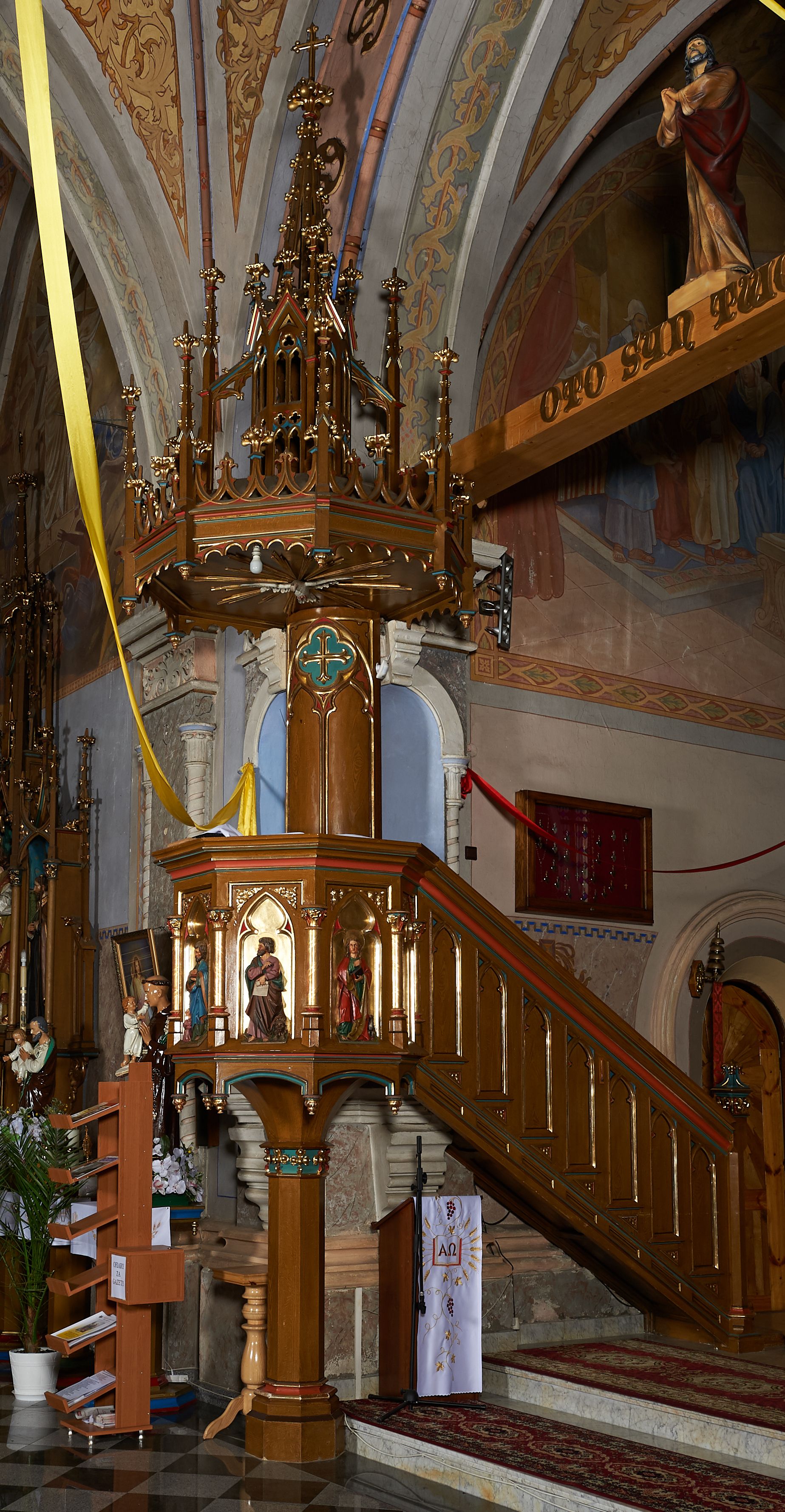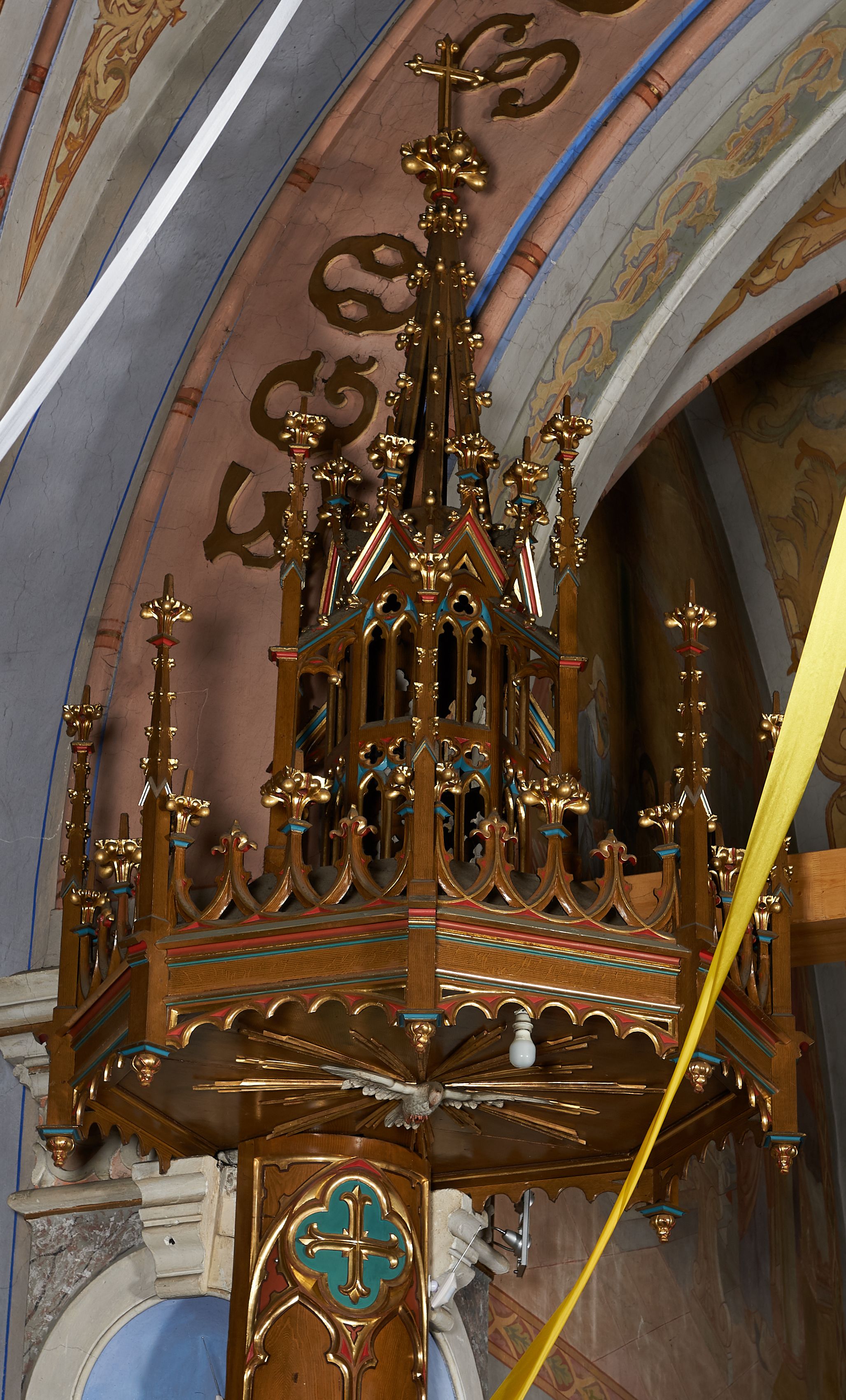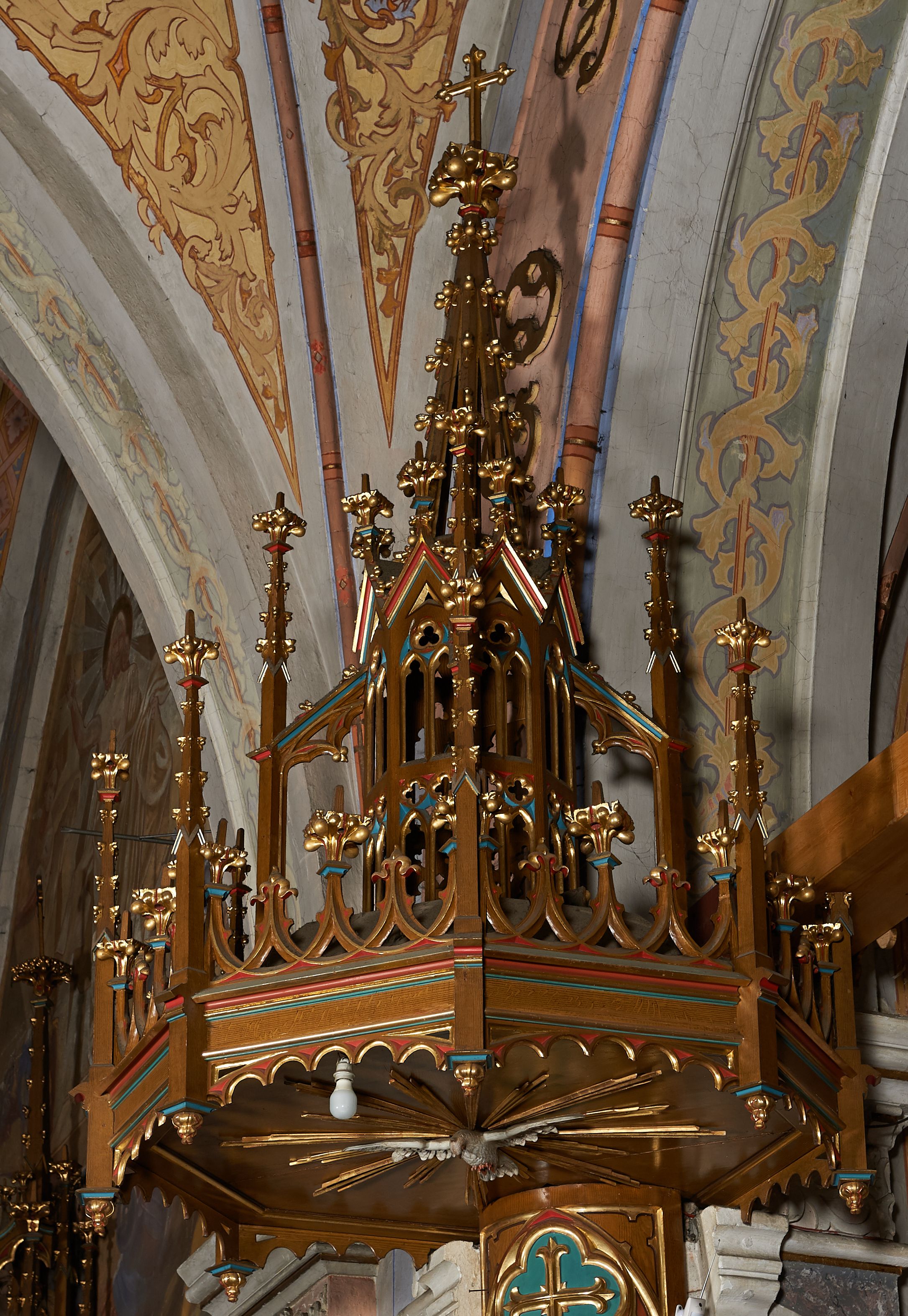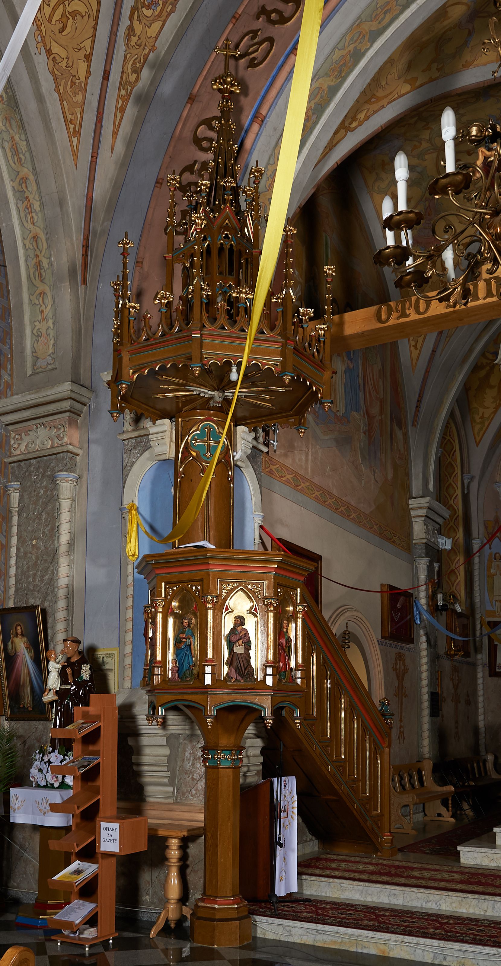 Ambona przyścienna, składająca się z kosza, zaplecka i baldachimu, z dostępem od prawej strony w postaci jednobiegowych schodów z balustradą. Kosz na planie ośmioboku, ścianki dekorowane płycinami wydzielonymi przez półkolumny o kapitelach z dekoracją kwiatową na wielobocznych postumentach podtrzymujących belkowanie, którego wysuniety gzyms stanowi parapet. W polach blendy z płaskorzeźbionymi przedstawieniami czterech ewangelistów. Każdy z nich został ukazany całopostaciowo, w długiej szacie, z księgą lub zwojem w ręce i w towarzystwie symbolu apokaliptycznego. W przyłuczach blend ostrokrzew. Kosz z podwieszeniem z guzów, oparty na ośmiobocznym filarze zwieńczonym pierścieniem z dekoracją w formie rozet, ustawiony na profilowanym cokole. Balustrada dekorowana ostrołukowymi blendami. Zaplecek w kształcie wydłużonego stojącego prostokąta, półokrągły. Dekorowany płyciną z parą blend i czworoliściem z krzyżem równoramiennym. Baldachim ośmioboczny, zwieńczony ażurową wieżyczką z wimpergami, wspartą czterema przyporami, dekorowaną pinaklami, żabkami i astwerkiem; zwieńczoną pinaklem z krzyżem. Na podniebiu płaskorzeźbione przedstawienie gołębicy Ducha Świętego w glorii promienistej. Całość struktury w odcieniu ciemnego drewna, profile i detale niebieskie i czerwone, reszta profilów, wnęki blend z płaskorzeźbami i detale złocone.