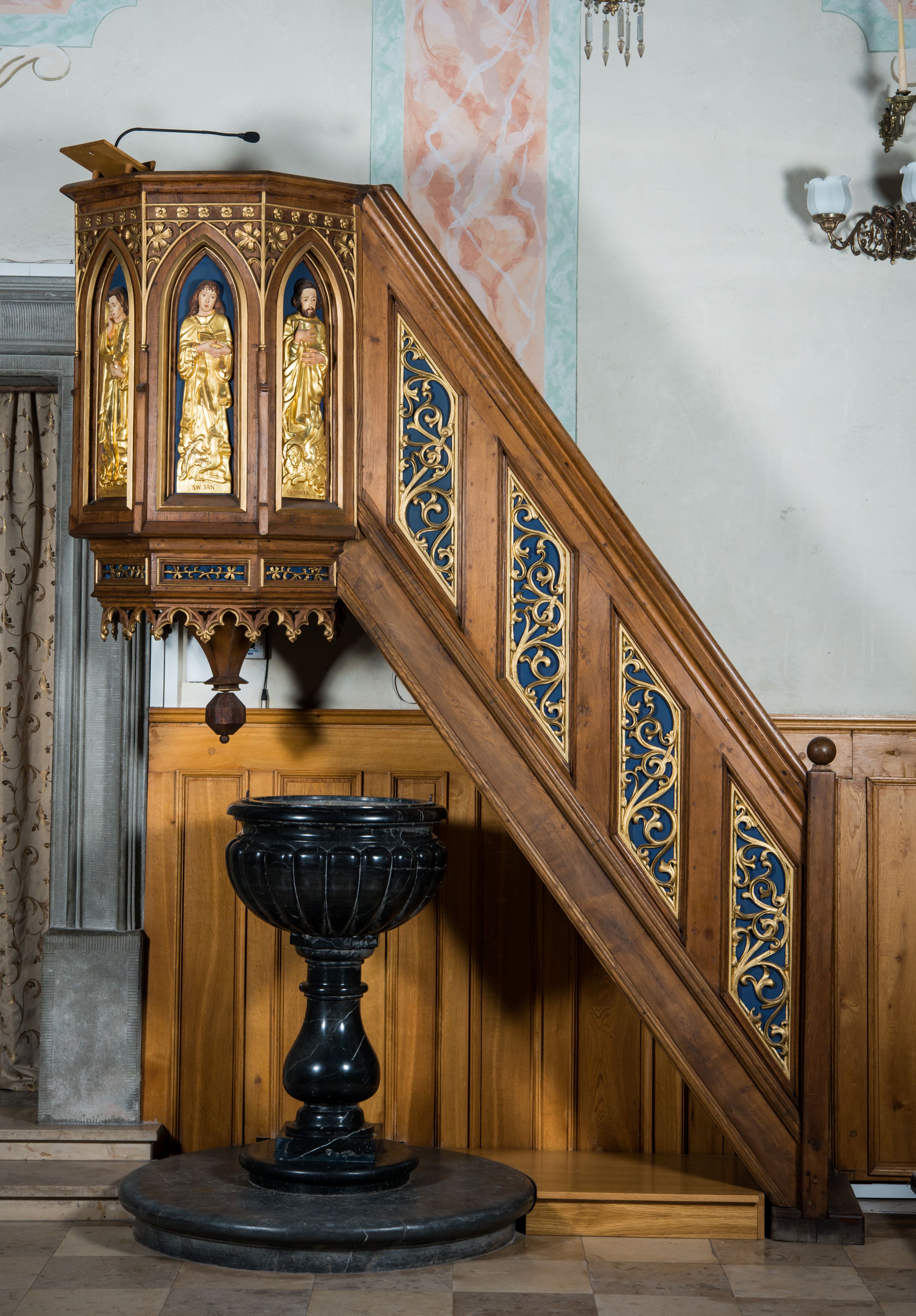 Struktura w kolorze bejcowanego na ciemno drewna; ornamenty, niektóre profile, szaty i atrybuty ewangelistów złocone; nisze malowane na granatowo.