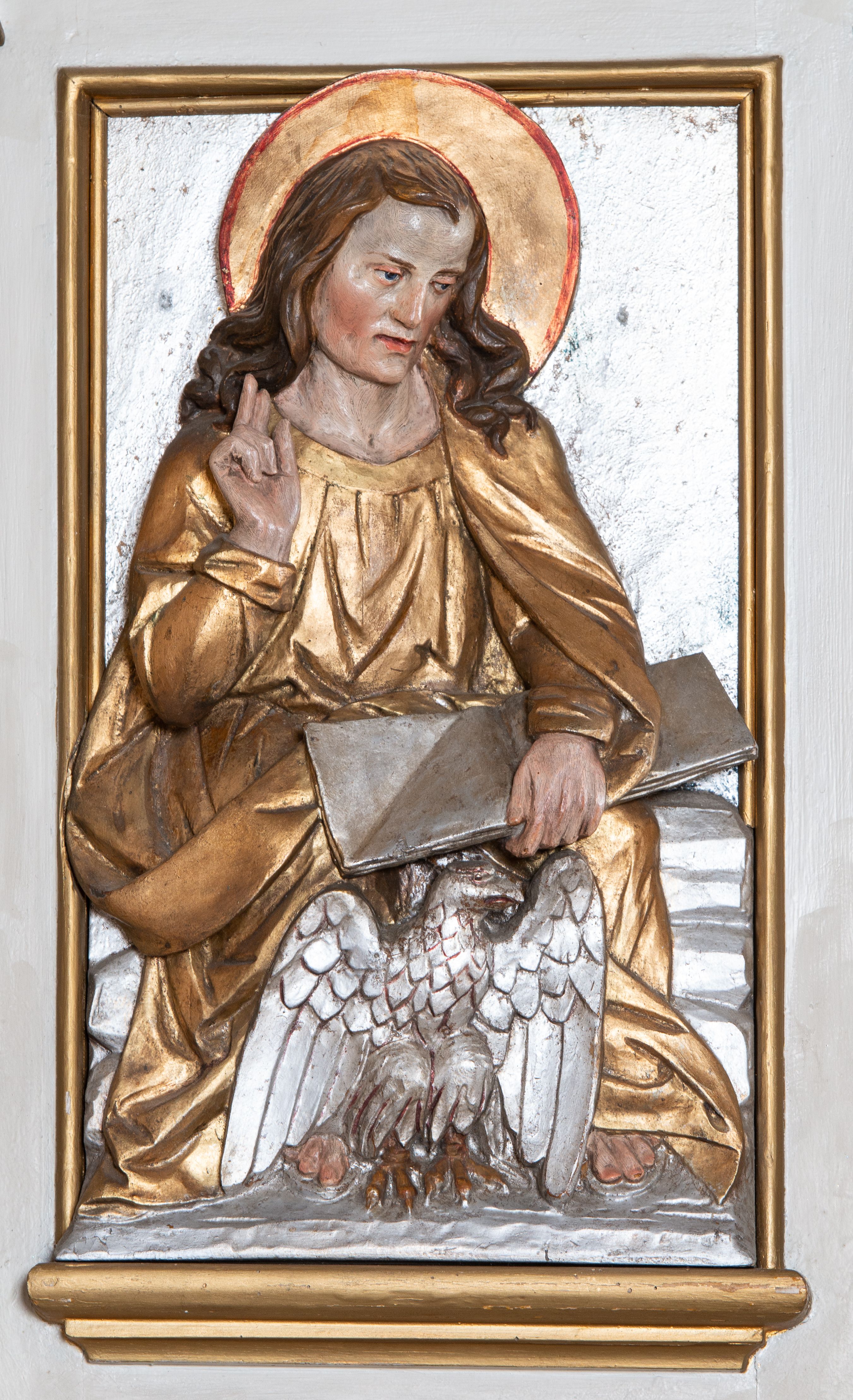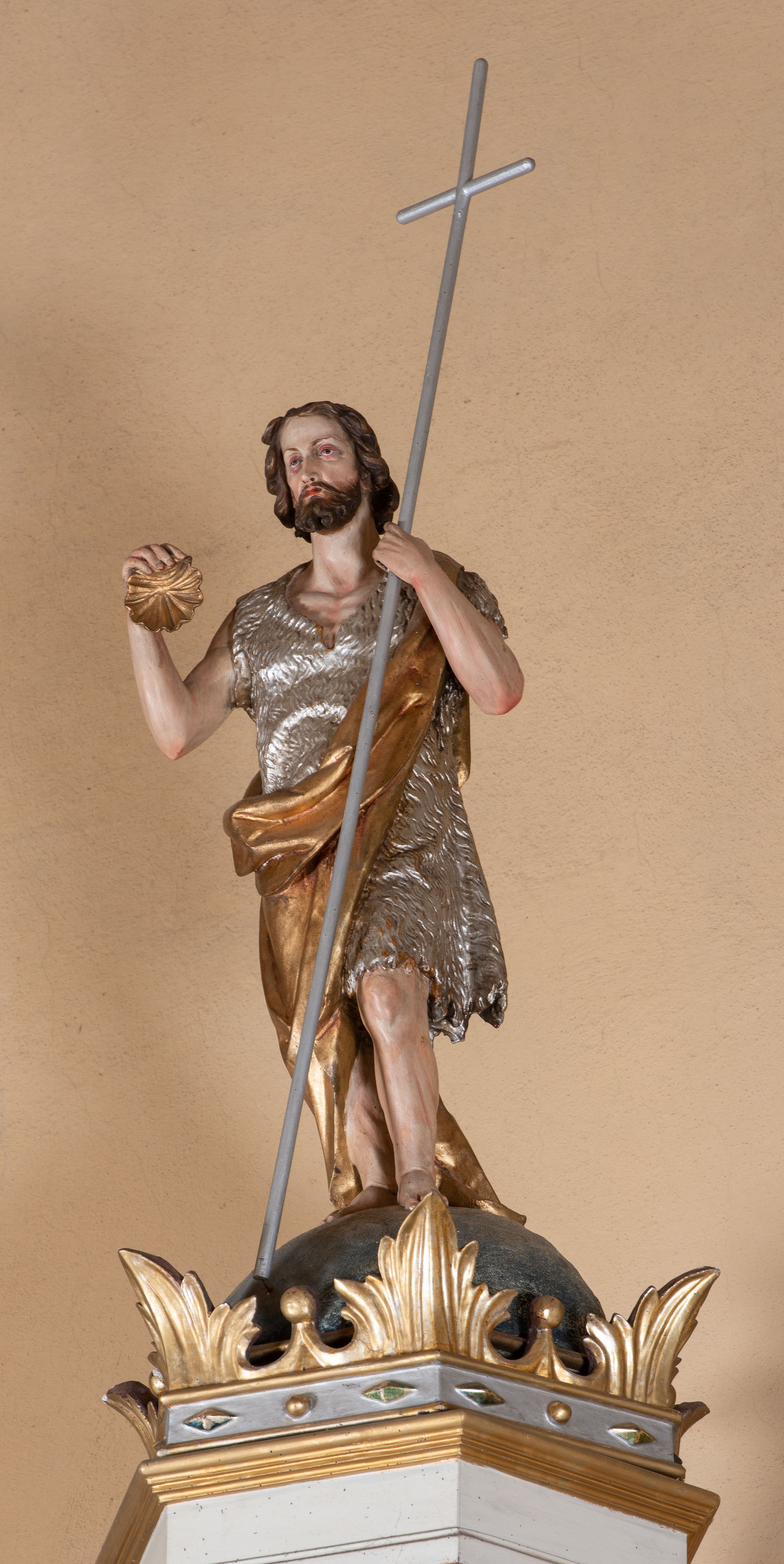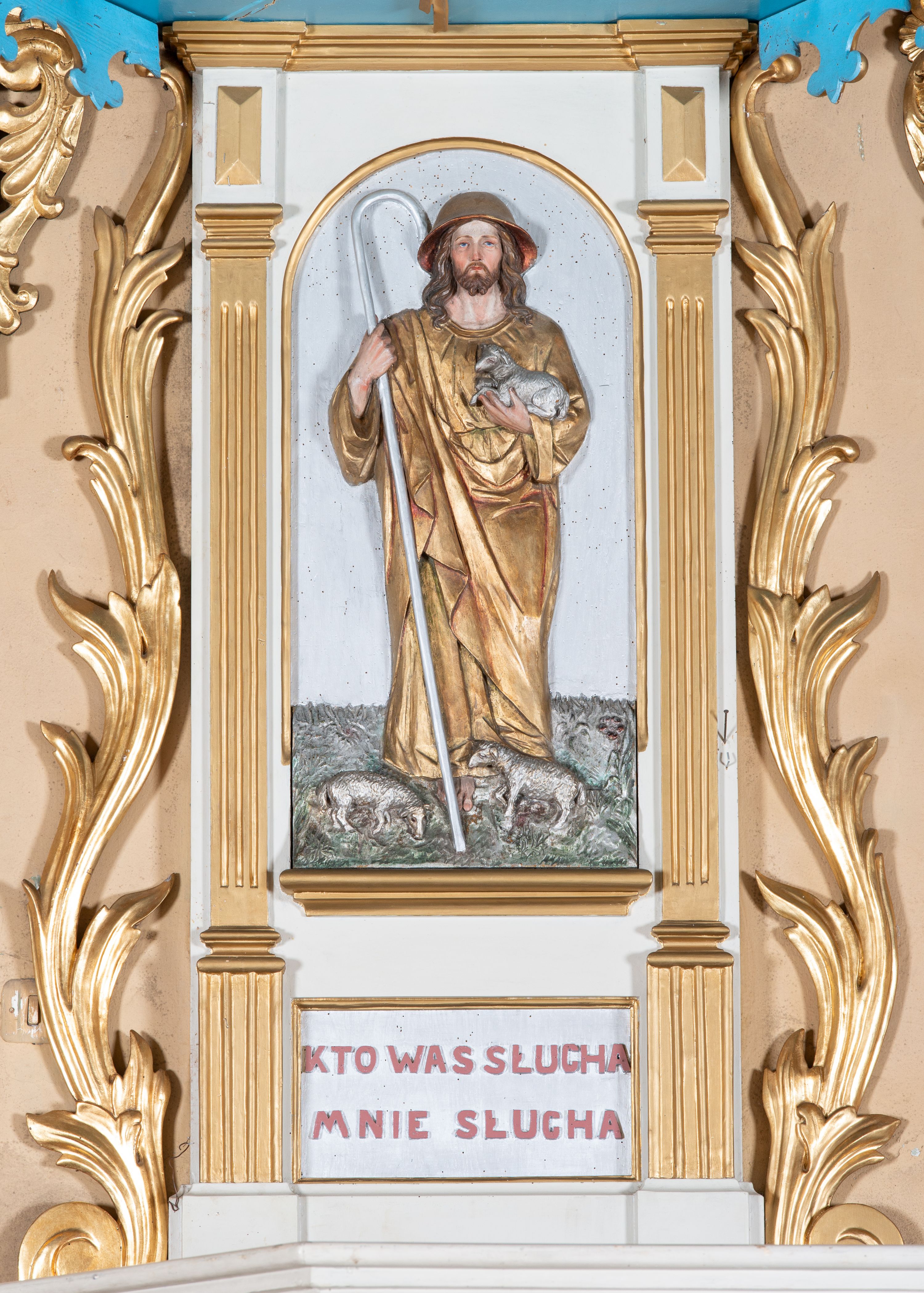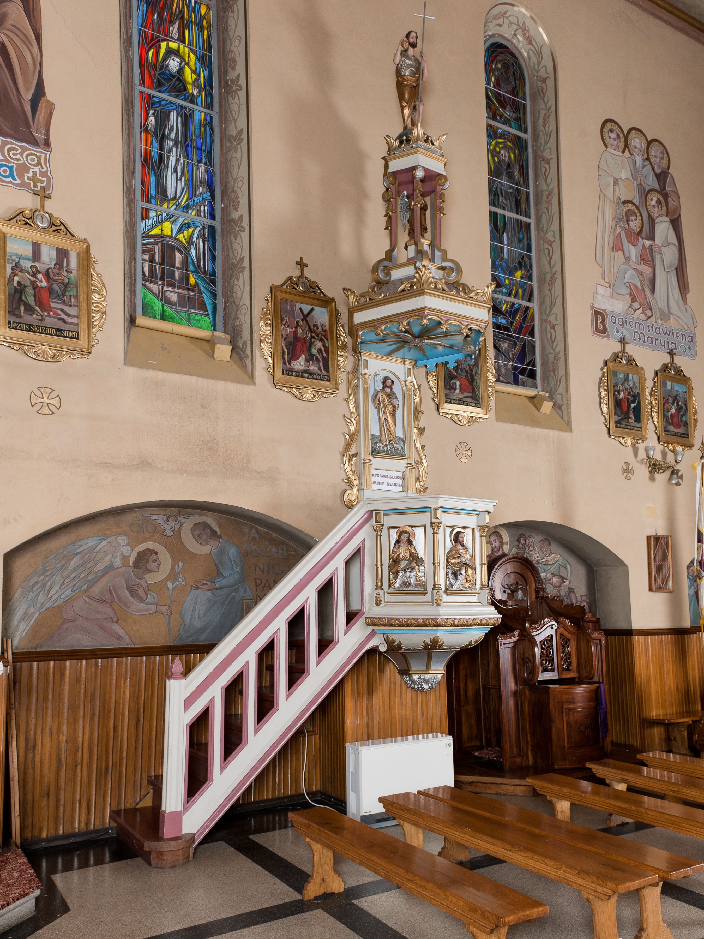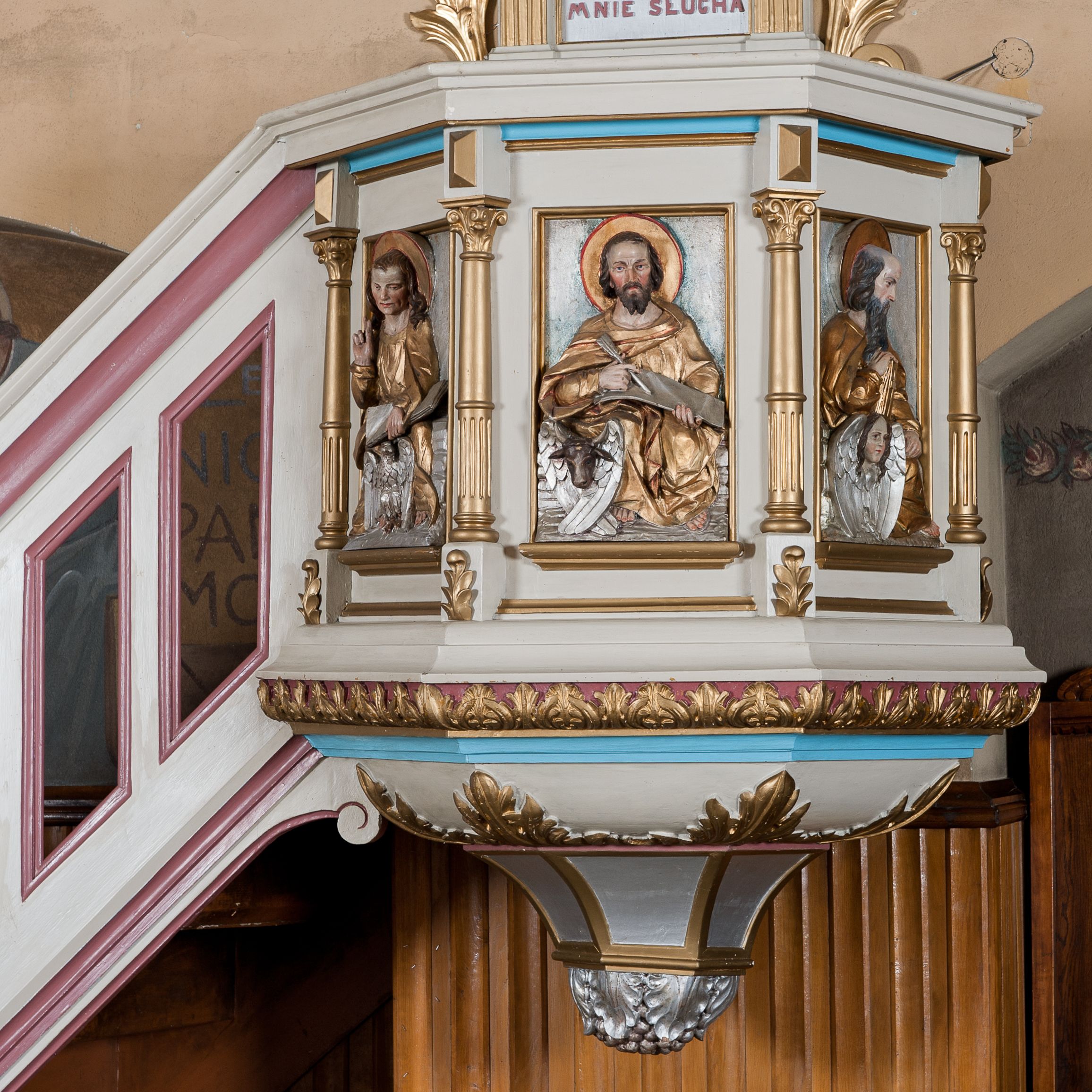 Ambona przyścienna, wisząca, z dostępem od lewej strony w postaci jednobiegowych schodów z balustradą. Kosz na planie sześcioboku na profilowanym cokole i ćwierćwałku; u spodu podwieszony profilowany ostrosłup o ściętym szczycie, zakończony szyszką. Ścianki kosza wydzielone kolumienkami o trzonach dekorowanych do 1/3 wysokości kanelowaniem, o kapitelach korynckich, na cokołach zdobionych liśćmi akantu, dźwigającymi imposty oraz wspólny gzyms stanowiąc parapet. W polach ścianek płyciny z płaskorzeźbionymi półpostaciami czterech ewangelistów, każdy z nich ukazany został z złotej sukni, z identyfikującym go atrybutem, księgą lub zwojem i piórem w ręce – od lewej św. Jan, św. Mateusz, św. Łukasz i św. Marek. Zaplecek w formie wydłużonego prostokąta, ujętego pilastrami podtrzymującymi imposty i wspólny gzyms. W polu płycina w formie stojącego prostokąta zamkniętego łukiem półkolistym z płaskorzeźbionym przedstawieniem Chrystusa Dobrego Pasterza, u spodu płycina z napisem „KTO WAS SŁUCHA / MNIE SŁUCHA”. Chrystus został ukazany w całej postaci, lewą ręką podtrzymując baranka, a prawą laskę pasterską. Ma podłużna, poważną twarz, małe, niebieskie oczy, wąski nos i usta, broda dzieli się w dwa pukle; falowane włosy opadają na ramiona. Jest ubrany w długą, złotą tunikę i złoty płaszcz, na głowie ma złoty kalepusz, czerwony od wewnątrz. Stoi na trawie, u jego stóp dwa srebrzone baranki Zaplecek ujęty uszami w formie falujących liści. Baldachim powtarza kształt kosza, nakryty kopułką pokrytą łuską, z podwieszonym fryzem roślinnym, dekorowany w narożach palmetami. Baldachim stanowi podstawę dla latarni opartej na sześciu spływach wolutowych dekorowanych kampanulami, podtrzymujących belkowanie i kopułkę, stanowiącą cokół dla figury św. Jana Chrzciciela, który stoi w kontrapoście, prawą ręką unosi na wysokość twarzy muszlę, a e lewej trzyma trzyż. Ma podł€żną twarz okoczoną gęstym zarostem, wzniesiony ku górze wzrok, wąski nos i małe usta. Jest ubrany w tunikę ze srerzonego fuyta i złoty płaszcz wywiniety na prawym biodrze i przechodzący przez lewy bark. Wewnątrz latarni figura anioła na postumencie. Został ukazany w całej postaci, z rękami złożonymi na piersi. Ma okrągłą twarz o deliatnych rysach i falowane włosy opadające na kark. Jest ubrany w długa, złotą suknię w szerokomi rękawami. Z pleców wyrastają mu duże, srebrne skrzydła z ptacich piór. Na podniebiu baldachimu gołębica Ducha Świętego w glorii promienistej. Struktura polichromowana na biało, profile na czerwono, detale i ornamentyka złocone.