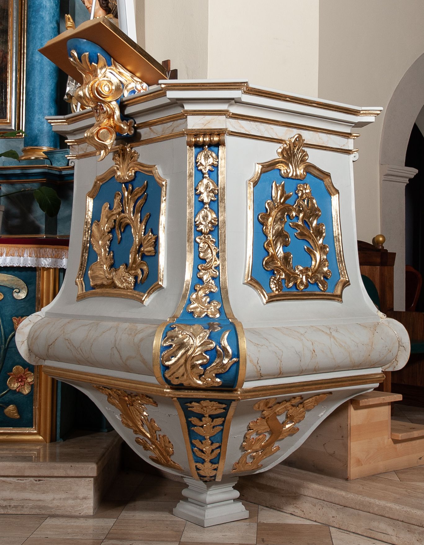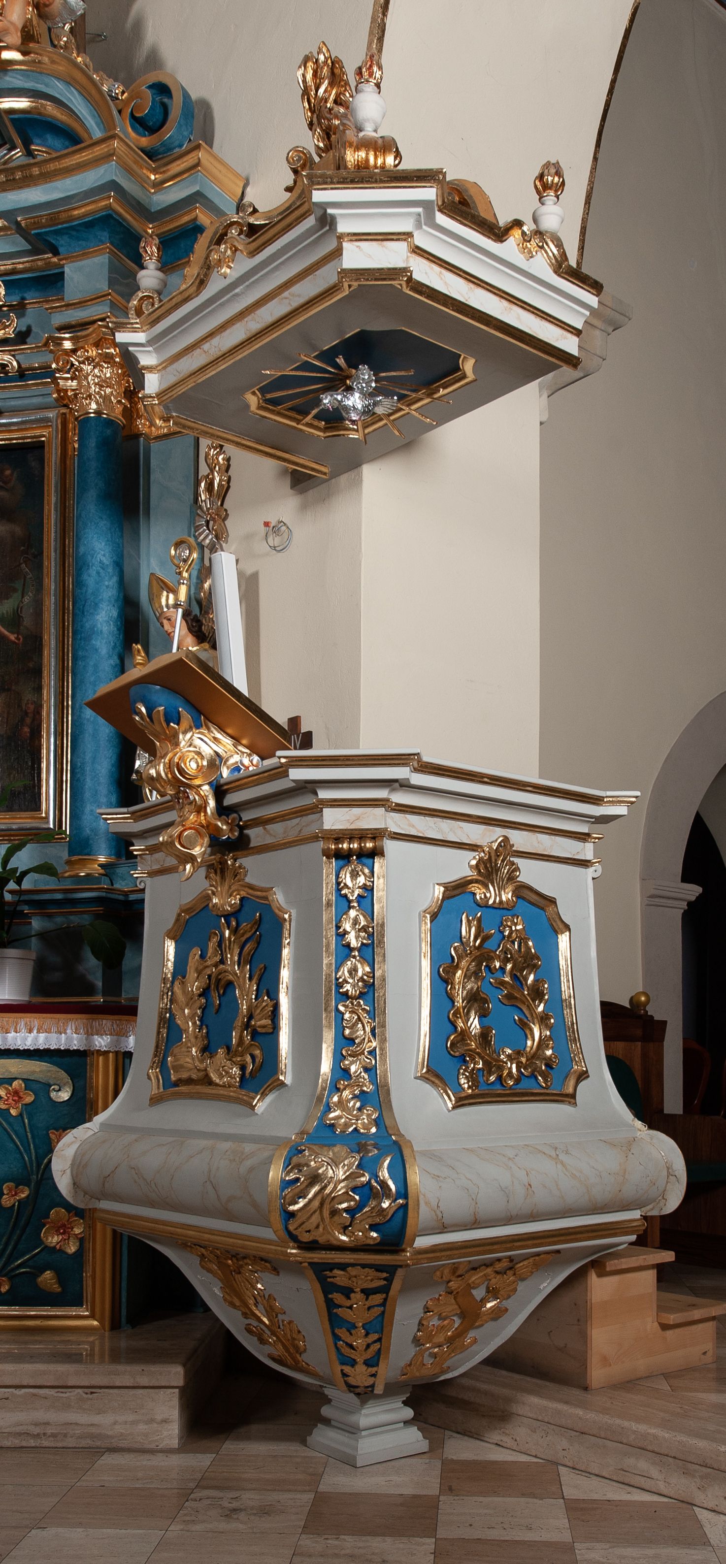Ambona przyścienna, sięgająca ziemi, dostępna od strony prezbiterium. Kosz na planie kwadratu o ściętych narożach; na cokole w formie wałka. U spodu podwieszony sześcian zwężający się ku dołowi ze ściętymi narożami dekorowanymi płaskorzeźbionymi kampanulami; ścianki zdobione wstęgą w otoczeniu liści i kwiatów. Szyszka w kształcie profilowanego cokołu. Ścianki kosza wklęsłe, zwężające się ku górze; w narożach ujęte spływami wolutowymi; dekorowane płycinami o fantazyjnym zarysie zbliżonym do leżącego prostokąta z wklęsłymi narożami, zwieńczonymi wolutami z palmetą. W polach płaskorzeźbiona dekoracja roślinna w postaci liści, palm i kwiatów. Narożne woluty dekorowane kampanulami oraz liśćmi. Kosz zamknięty parapetem w formie niepełnego belkowania, wyłamanego w narożach. Od frontu pulpit oparty na wolucie i półkuli, dekorowanej liśćmi i kwiatami. Baldachim na planie kwadratu o ściętych narożach, którego podstawę stanowi niepełne belkowanie, wyłamane w narożach. Zwieńczenie utworzone z czterech kabłąków w formie wolut dekorowanych liściastymi festonami i wazonami; podtrzymujących cokół z rzeźbionym płomieniem. U spodu baldachimu w płycinie o formie kwadratu o wklęsłych narożach rzeźbiona gołębica Ducha Świętego w glorii promienistej. Struktura polichromowana w kolorze jasnoszarym, wałek i fryz z imitacją marmoryzacji z beżowymi żyłkami; płyciny i naroża niebieskie; ornamentyka, profilowania i kabłąki złocone.