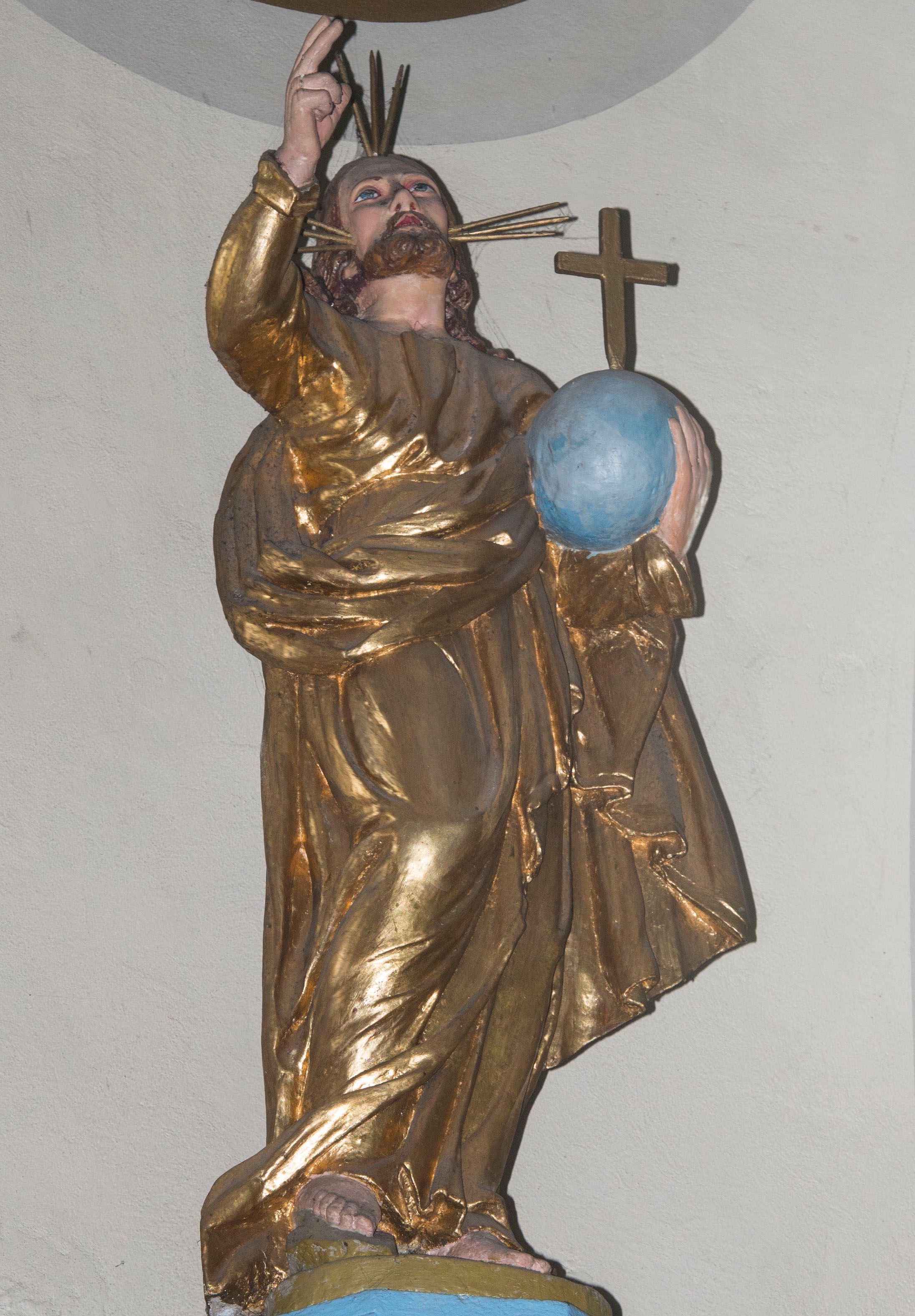Baldachim powtarza pomniejszony plan kosza; dekorowany szyszkami, w podniebieniu lampa w kształcie szyszki. W jego zwieńczeniu umieszczono figurą Chrystusa Zbawiciela Świata (Salvator Mundi) na dwustopniowym cokole. Chrystus stoi w kontrapoście, z prawą nogą ugiętą w kolanie i wspartą na kamieniu. Lewą ręką podtrzymuje kulę ziemską zwieńczoną krzyżem, prawą unosi do góry, czyniąc gest błogosławieństwa. Spogląda do góry, ma ciemną brodę i falowane włosy spływające na ramiona i plecy. Z trzech stron głowy odchodzą wiązki promieni. Chrystus ubrany jest w długą, złotą suknię oraz tego samego koloru płaszcz owinięty wokół prawego biodra i przerzucony przez lewą rękę.