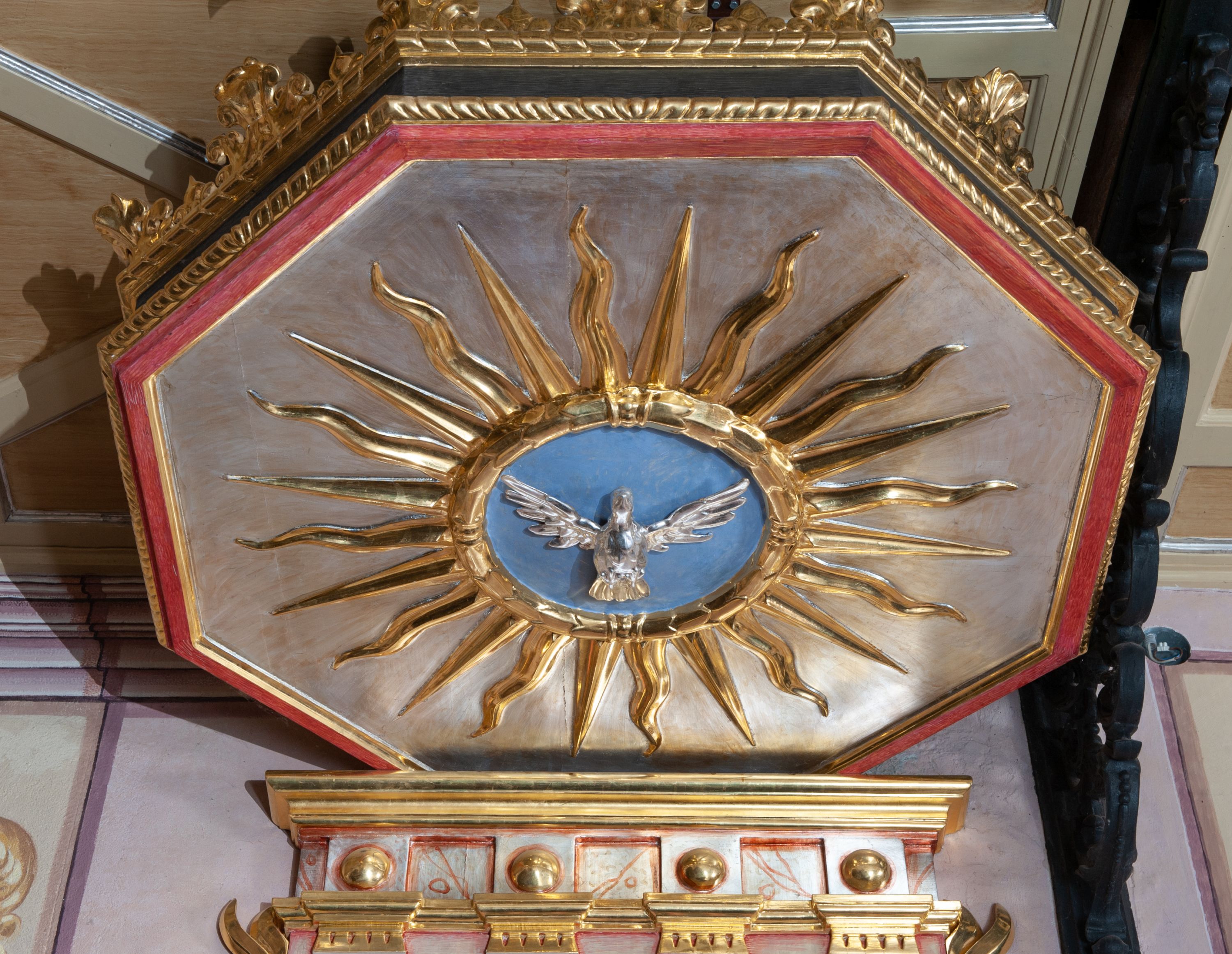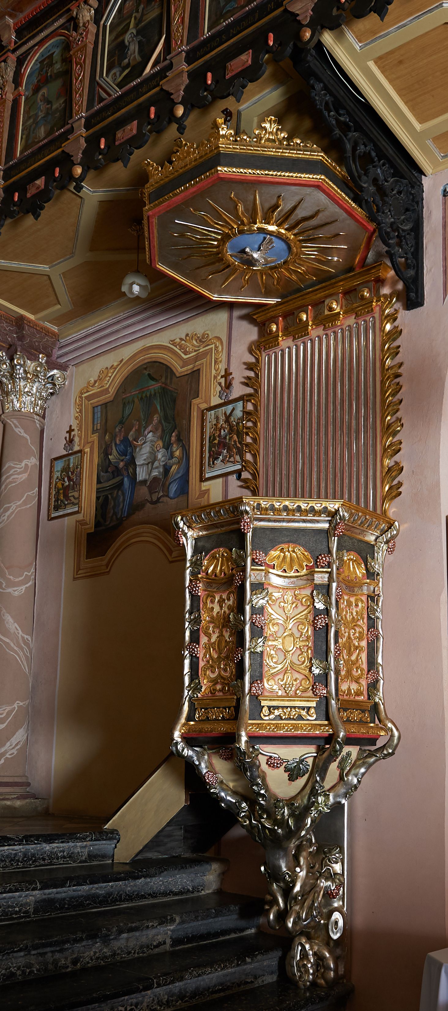 Ambona przyścienna, ustawiona na rzeźbionym konarze, rozwarstwiającym się na pnącza ujmujące kosz. Kosz na planie ośmioboku na cokoliku, u spodu podwieszona półkula. Ścianki wydzielone rzeźbionymi pnączami z winnym gronem. W polach płytkie nisze, wsparte na cokolikach, wypełnione okuciami przechodzącymi w wić roślinną, u góry zamknięte półkoliście z konchami. Ścianki w dwóch trzecich wysokości włącznie z wnękami obiega profilowany gzyms. Parapet kosza w formie gzymsu dekorowany głębokim kimationem. Zaplecek o kształcie stojącego prostokąta wypełnionego kanelurami, zamkniętego fryzem z metopami zdobionymi kulami; ujęty strzępionymi liśćmi palmowymi. Baldachim na planie analogicznym względem kosza, płaski, zwieńczony palmetami; na podniebiu rzeźbiona gołębica Ducha Świętego w medalionie utworzonym z liśćmi wawrzynu, w glorii promienistej. Struktura polichromowana na kolor czarny, podwieszenie kosza na kolor biały; ornamentyka, profilowania i detale złocone, srebrzone oraz polichromowane na czerwono. Ornamentyka na koszu dodatkowo pokryta laserunkiem.