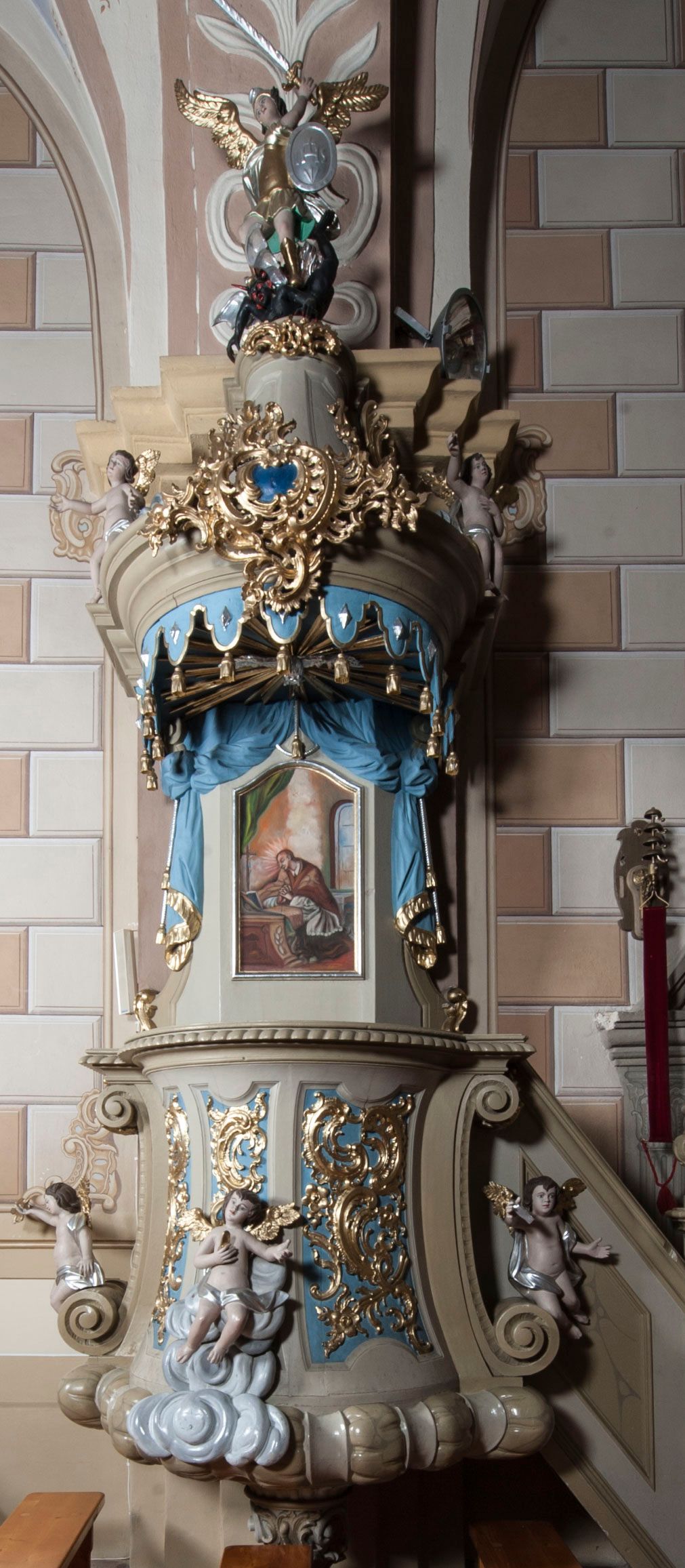 Ambona nadwieszona z dostępem w postaci jednobiegowych schodów usytuowanych z prawej strony kosza. Kosz na rzucie półkolistym, z podwieszoną szyszką u spodu. Ścianki kosza flankowane dwoma spływami wolutowymi. Cokół kosza zaakcentowany szeregiem form przypominających obłoki. Ścianki kosza podzielone na sześć pionowych, prostokątnych, o wciętych półkoliście krótszych bokach, wypełnionych dekoracją z motywów rocaille. Gzyms profilowany, przełamany na osi spływów. Na wolutach spływów oraz pośrodku kosza osadzone trzy figury aniołków. Zaplecek rozszerzający się ku dołowi, flankowany parą spływów; w jego polu obraz w kształcie pionowego prostokąta zamkniętego łukiem wklęsło-wypukłym z przedstawieniem św. Jana Nepomucena. Zaplecek ujęty z boków i zwieńczony spiętą kotarą z frędzlami. Baldachim na planie analogicznym jak kosz, o wysokim, profilowanym dolnym brzegu, obwiedziony od dołu lambrekinem z frędzlami. W polu podniebienia baldachimu gołębica Ducha Świętego na tle promienistej glorii, z przodu na brzegu baldachimu kartusz z motywu rocaille. Podniebienie baldachimu w kolorze niebieskim, na polu gołębica Ducha Świętego na tle promienistej glorii, z przodu rocaille'owy kartusz. Szczyt baldachimu w formie wysokiego postumentu, na którym ustawiona rzeźba Michała Archanioła zwyciężającego szatana. Po bokach postumentu dwa rzeźbione aniołki. Święty Michał Archanioł ukazany w pozycji stojącej o esowato wygiętej sylwetce, z prawą ręką uniesioną wysoko ku górze, w której trzyma płomienisty miecz, w lewej owalna tarcza z monogramem Chrystusa i trzema gwoździami, lewą stopą depcze leżącego szatana. Ubrany w strój legionisty rzymskiego, skrzydła złocone, szeroko rozłożone. Szatan ukazany w monstrualnej postaci, w pozycji leżącej na brzuchu, z lewą nogą uniesioną wysoko ku górze. Postać polichromowana na czarno, detale (oczy, usta, rogi, paznokcie) na czerwono. Aniołki ukazane w poruszonych pozach, przepasane srebrną chustką, z szeroko rozłożonymi złoconymi skrzydłami. Balustrada schodów zamknięta od dołu cokołem i od góry profilowanym gzymsem, zdobiona w polu romboidalną płyciną, zakończona słupkiem z wazonem płomienistym na szczycie. Struktura ambony polichromowana na kolor jasno i ciemnobeżowy, detale i płyciny na kolor niebieski, ornamentyka złocona.