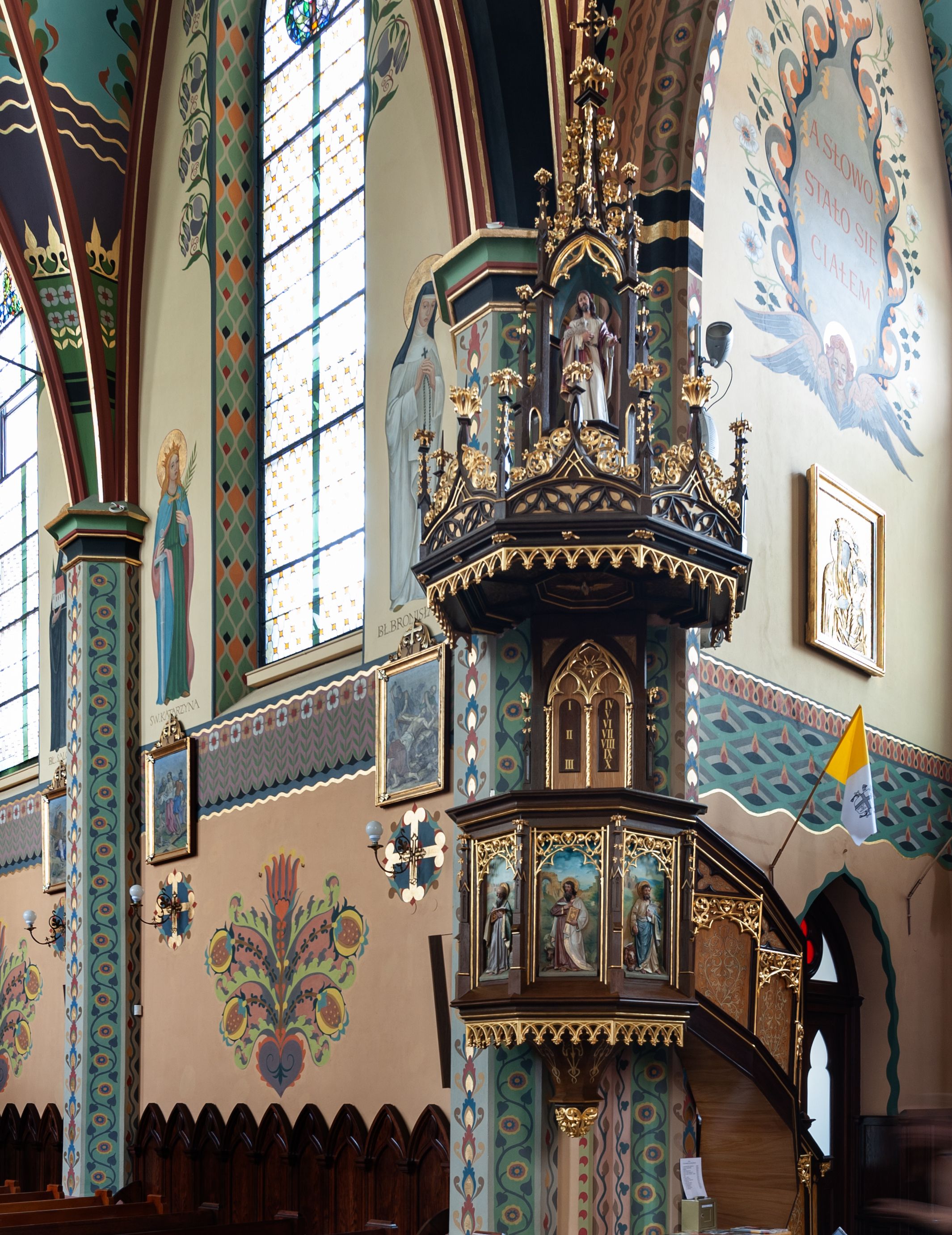 Ambona neogotycka, zawieszona na narożnym filarze nawy głównej i północnego ramienia transeptu. Na ambonę prowadzą schody z lekko skręconą balustradą przylegającą do północnej strony prezbiterium. Balustrada artykułowana romboidalnymi płycinami podzielonymi na pola w kształcie trapezu i małego trójkąta. W polach obu płycin białe dekoracje ze stylizowanej wici akantu; płyciny trapezowe u góry zdobione rzeźbioną, ażurową dekoracją stylizowanego astwerku. Kosz na planie sześcioboku ujęty od góry i od dołu profilowanym gzymsem. Podstawa ośmioboczna, zwężająca się ku dołowi, ujęta pozłacanym i ażurowym ornamentem roślinnym. Boki kosza z czterema płycinami, flankowanymi wąskimi filarkami ze szkarpami i zwieńczonymi pinaklami. W polach płycin ukazane są płaskorzeźbione wizerunki ewangelistów, od lewej strony: św. Mateusza, św. Jana, św. Łukasza i św. Marka. Ewangeliści przedstawieni w postawie stojącej z księgami i piórami do pisania w dłoniach. U ich stóp znajdują się odpowiadające im atrybuty. Sylwetki polichromowane, ukazane na tle malowanego pejzażu. Płyciny zwieńczone rzeźbioną, ażurową dekoracją astwerku. Zaplecek prostokątny ujęty dwoma sterczynami wspartymi na niewielkich konsolkach. W polu zaplecka ostrołukowa arkada z polem przedzielonym maswerkową dekoracją wspartą na trzech półkolumienkach. W polu dwie tablice Dekalogu. Baldachim ambony rozłożysty, powtarzający plan kosza. Podniebie podzielone promieniście odchodzącymi listwami, pośrodku ośmioboczne pole z płaskorzeźbioną gołębicą Ducha Świętego. W zwieńczeniu architektoniczna aedicula wsparta na czterech kolumnach z głęboką wnęką, w której umieszczona jest rzeźba Chrystusa. Aedicula zwieńczona jest wysoką sterczyną zakończoną łacińskim krzyżem. Baldachim zamknięty fryzem wypełnionym astwerkiem i ażurowym ornamentem z wolutowo skręconej wici roślinnej. W narożach sterczyny z żabkami i kwiatonami. Spód kosza i baldachimu zdobione są rzeźbionymi arkadkami. Struktura ambony malowana w kolorze ciemnobrązowym, płyciny i balustrady jasnobrązowe, detale architektoniczne i ornamentyka złocone.