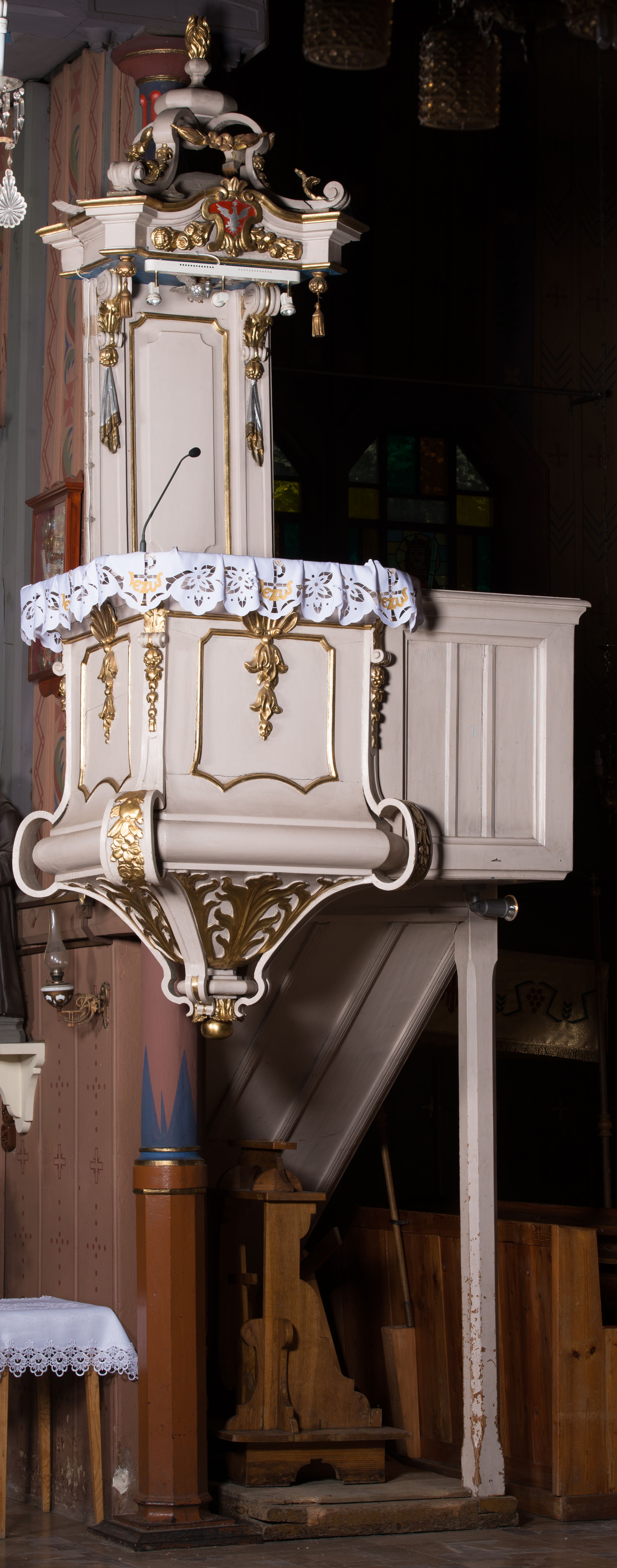 Ambona pochodzi z wyposażenia poprzedniego kościoła. Powstała zapewne w czwartej ćwierci XVIII wieku. Została przeniesiona do nowo wybudowanej świątyni w 1888 roku. W tym czasie została nieco przekształcona. Struktura ambony jest typowa dla XVIII wieku.
