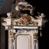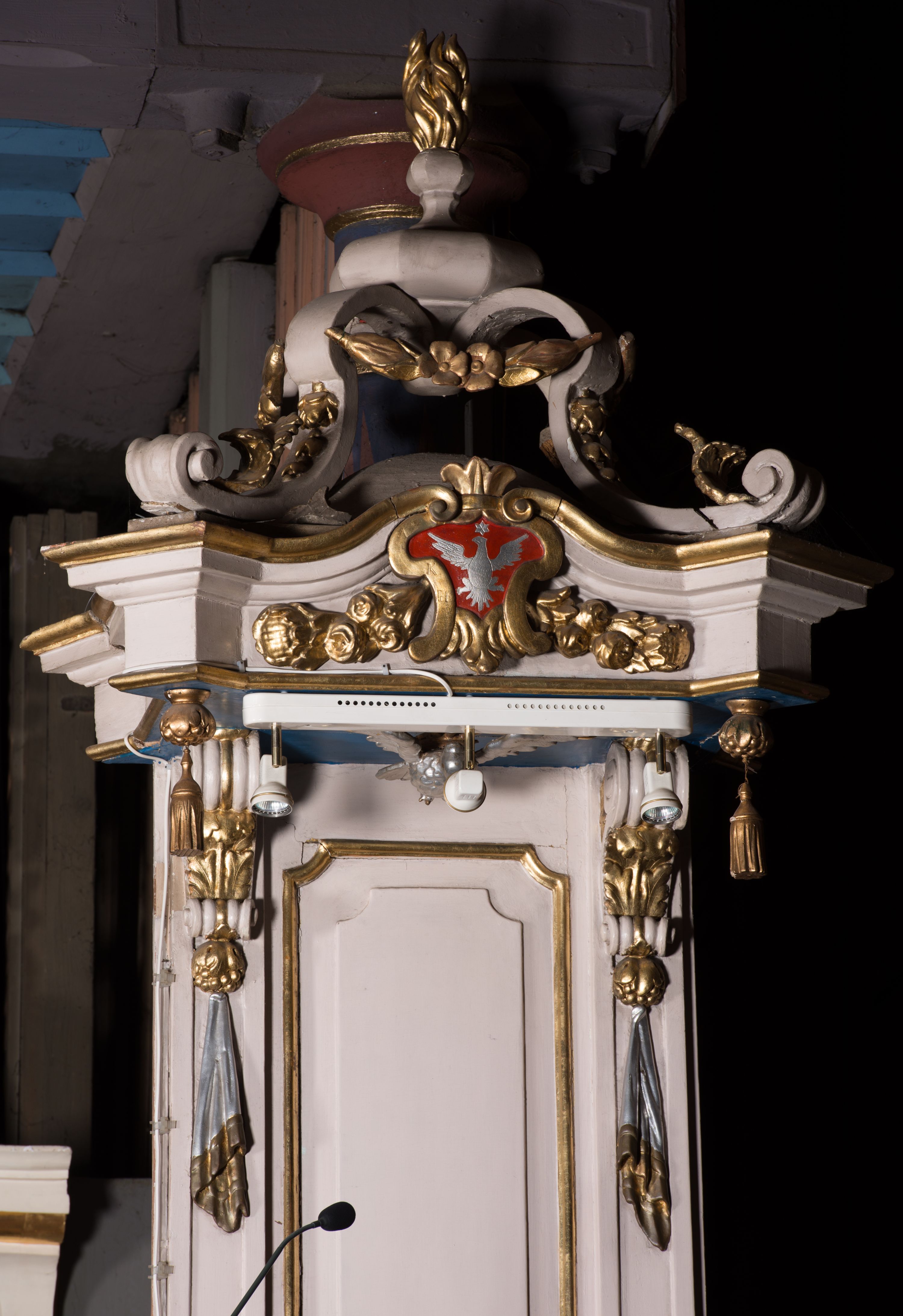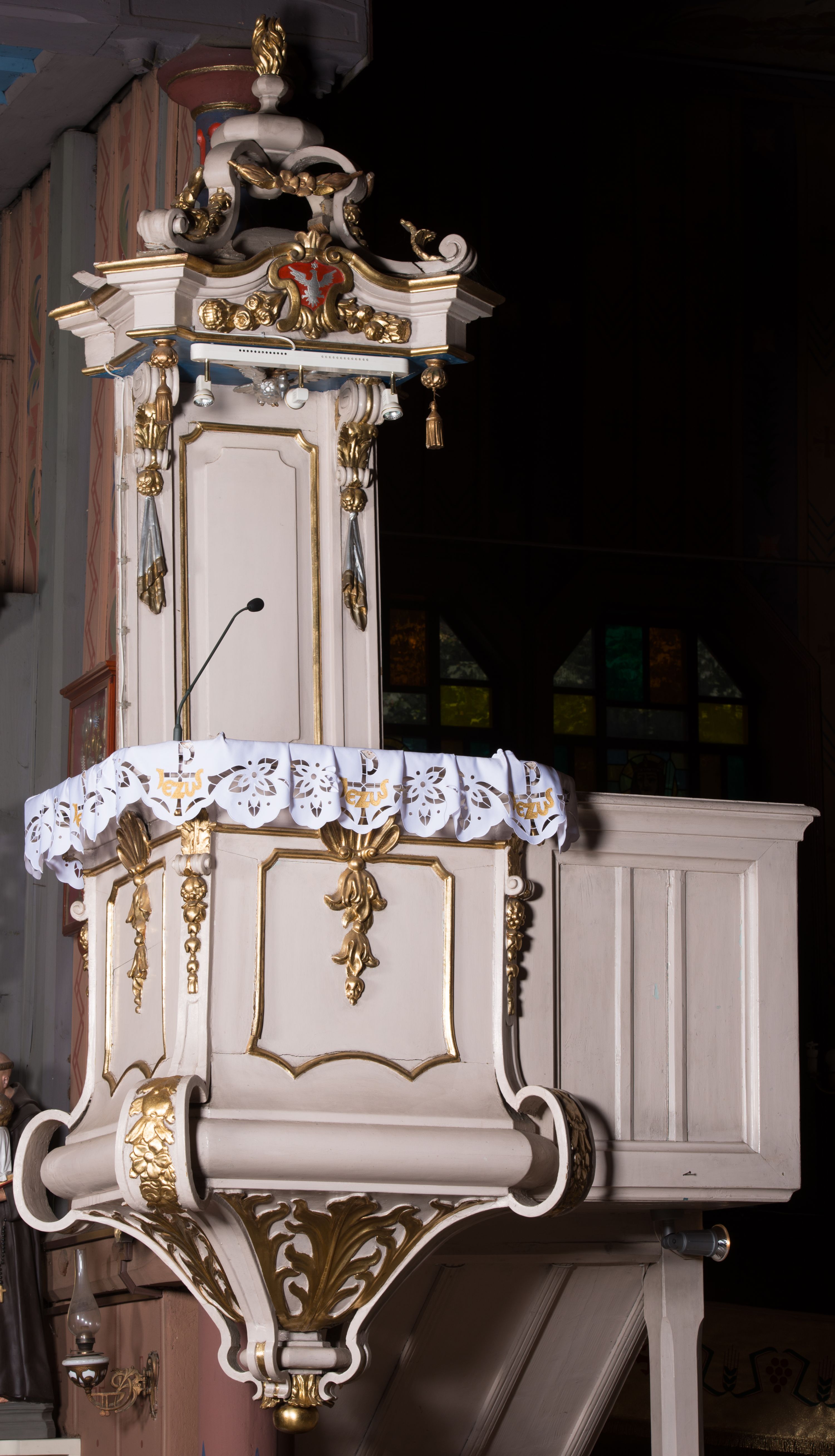 Ambona przyścienna, wisząca, z dostępem w postaci dobudowanych do kosza jednobiegowych schodów z podestem i pełną balustradą, po prawej stronie. Kosz na planie kwadratu o ściętych narożach, na cokole w formie spłaszczonego wałka, z podwieszeniem w postaci ostrosłupa o wklęsłych bokach dekorowanych liśćmi, w narożach ujętego taśmami, zakończonego szyszką. Kosz z pilastrami w narożach, których trzony przechodzą w spływy wolutowe, w partii cokołu przyjmując kształt cęgi, dekorowane są kampanulami i zwisami roślinnymi. Pilastry podtrzymują belkowanie, którego gzyms tworzy parapet kosza. Ścianki zdobione płycinami o kształcie zbliżonym do kwadratu o wklęsłych narożach, zwieńczonymi muszlami z kampanulami. Zaplecek wąski, wydłużony, flankowany lizenami zakończonymi konsolami, dekorowanymi akantem z podwieszonymi pąkami i tkaniną. W polu płycina o kształcie stojącego prostokąta o wklęsłych narożach. Baldachim na planie kwadratu o ściętych narożach, z dołączonymi w ich miejsce impostami z podwieszonymi chwostami. Na frontowej ściance zakończonej dwoma wolutowymi fragmentami gzymsu kartusz z malowanym wizerunkiem niezidentyfikowanego herbu (w czerwonym polu srebrny orzeł z gwiazdą nad głową). Na krawędzi kartusza sygle „K” i „PI”. Kartusz ujęty zwisami kwiatowymi. Na baldachimie cztery kabłąki podtrzymujące wazon, dekorowane kampanulami i ornamentem roślinnym. Na podniebieniu gołębica Ducha Świętego w glorii promienistej. Struktura polichromowana w kolorze białym, profile i ornamentyka złocone, detal srebrzony.