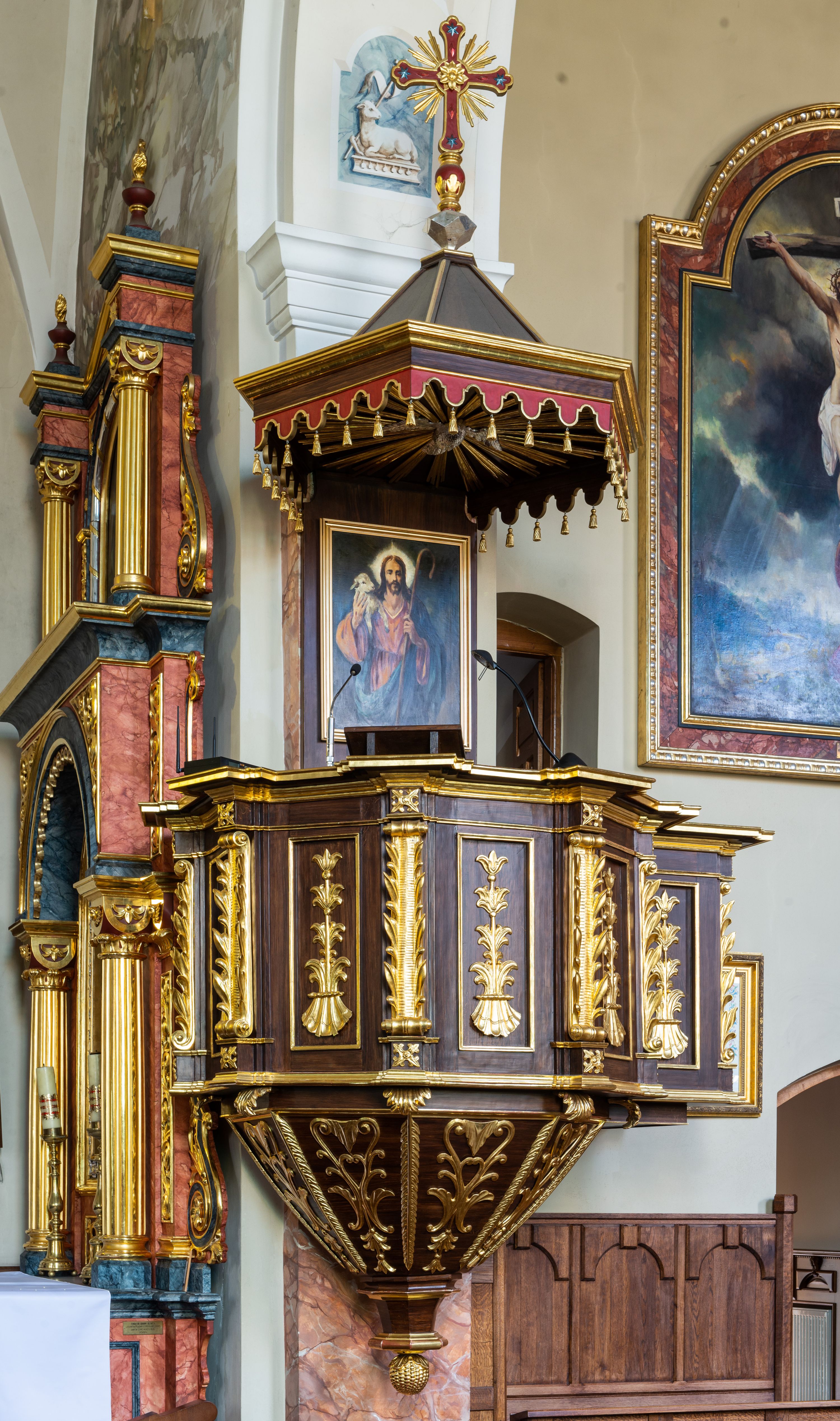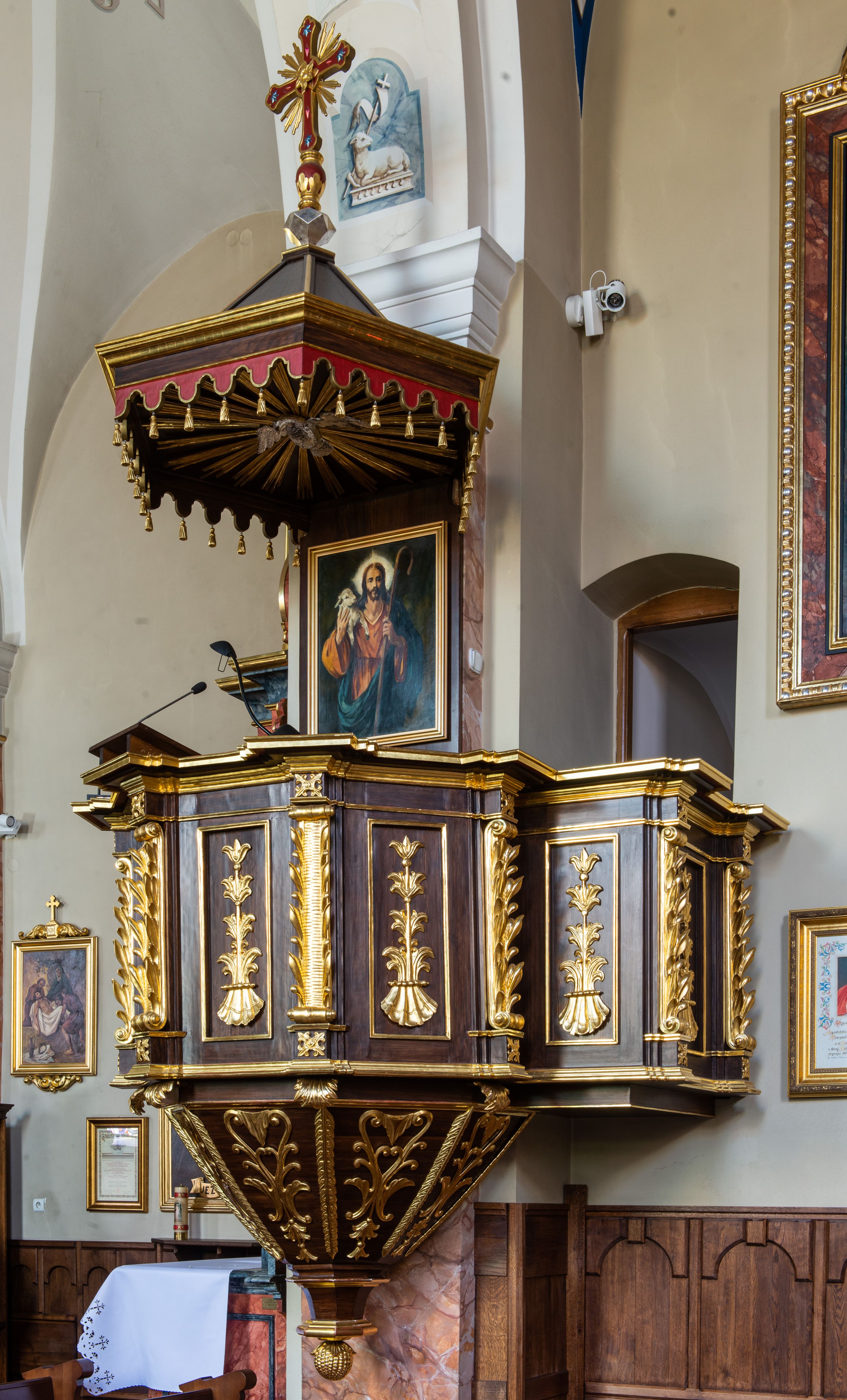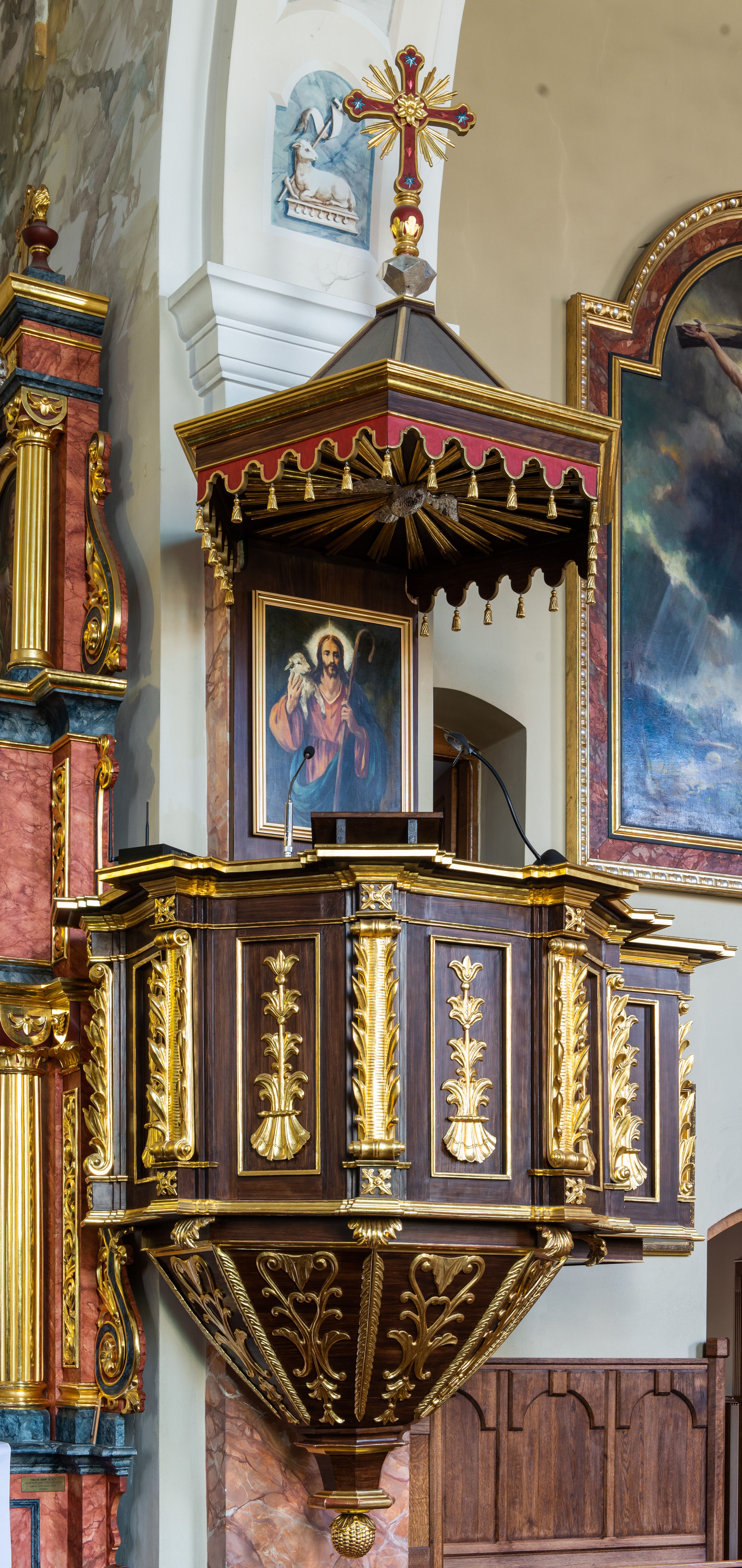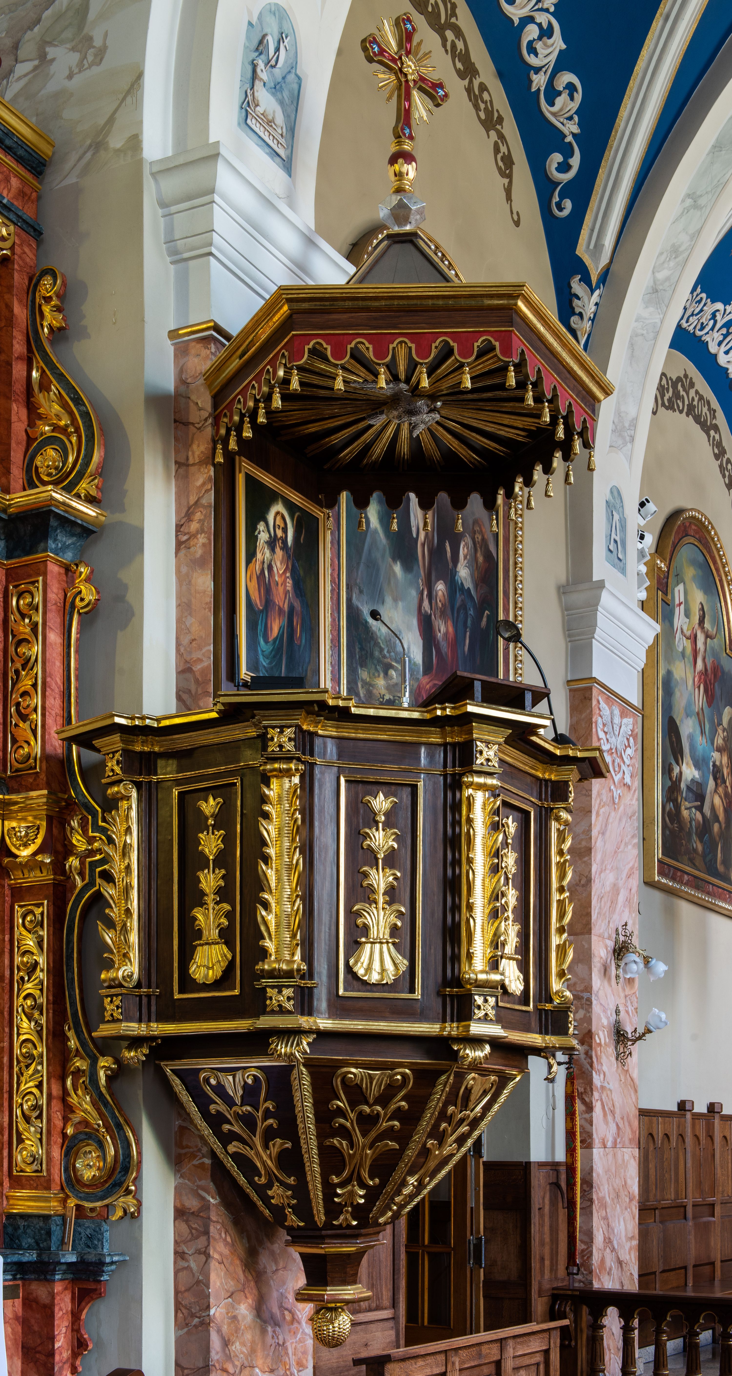 Kosz na planie sześcioboku z podwieszeniem w postaci sześciobocznego stożka zakończonego szyszką. Ścianki kosza flankowane pilastrami podtrzymującymi niepełne belkowanie, zamknięte gzymsem wyłamanym na osi podpór tworzące parapet ambony. Ścianki podstawy dekorowane fantazyjną wicią roślinną złożoną ze stylizowanych liści akantu i kampanul. Ścianki kosza ozdobione prostokątnymi płycinami w złoconych, profilowanych ramach; w polu dekorowane stylizowaną, pionową wicią utworzoną z kampanul wyrastających z muszli. Pilastry ustawione na niskich cokolikach zdobionych rozetami, z trzonami z szerokim pasem utworzonym z liści o ostrych zakończeniach.