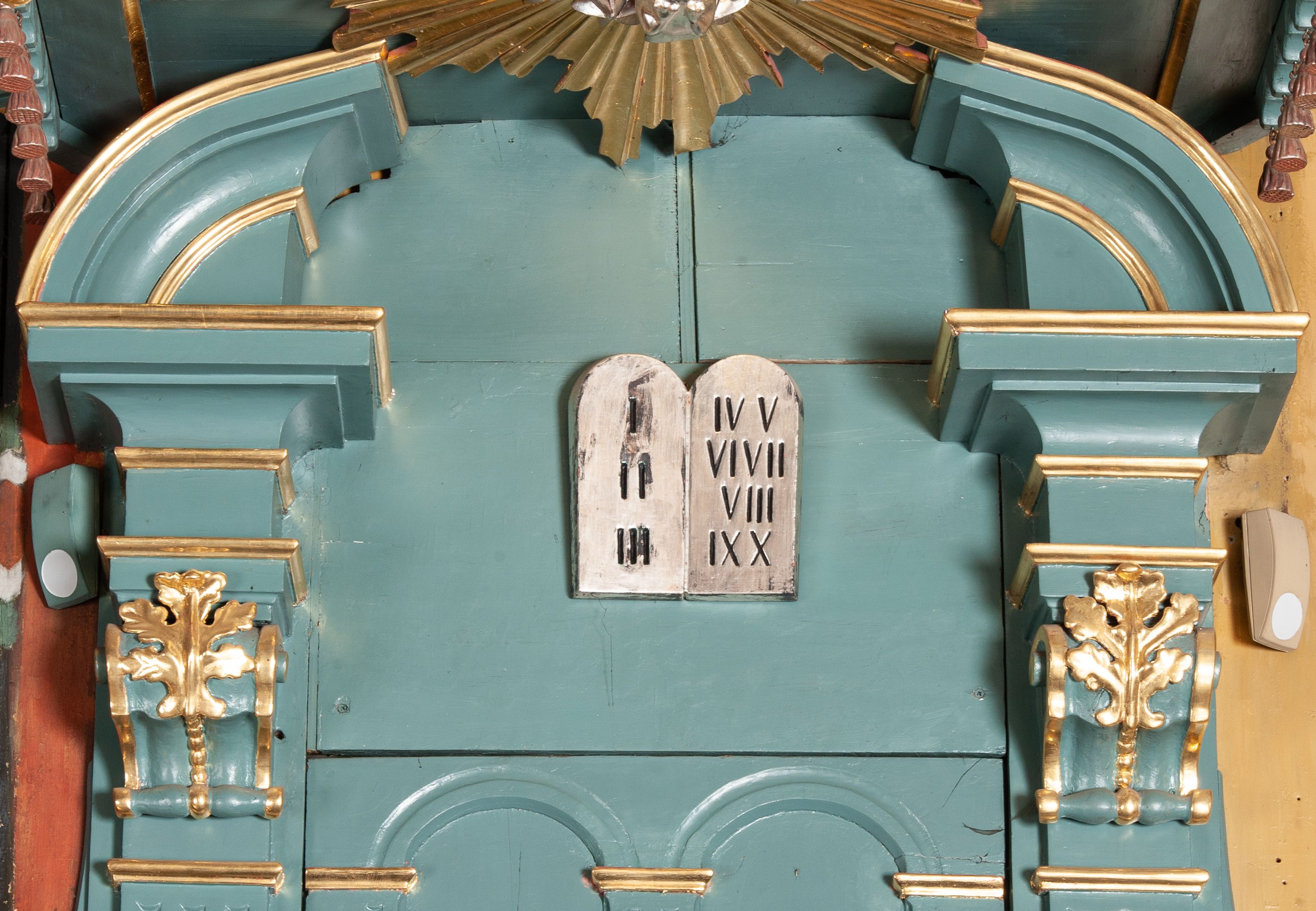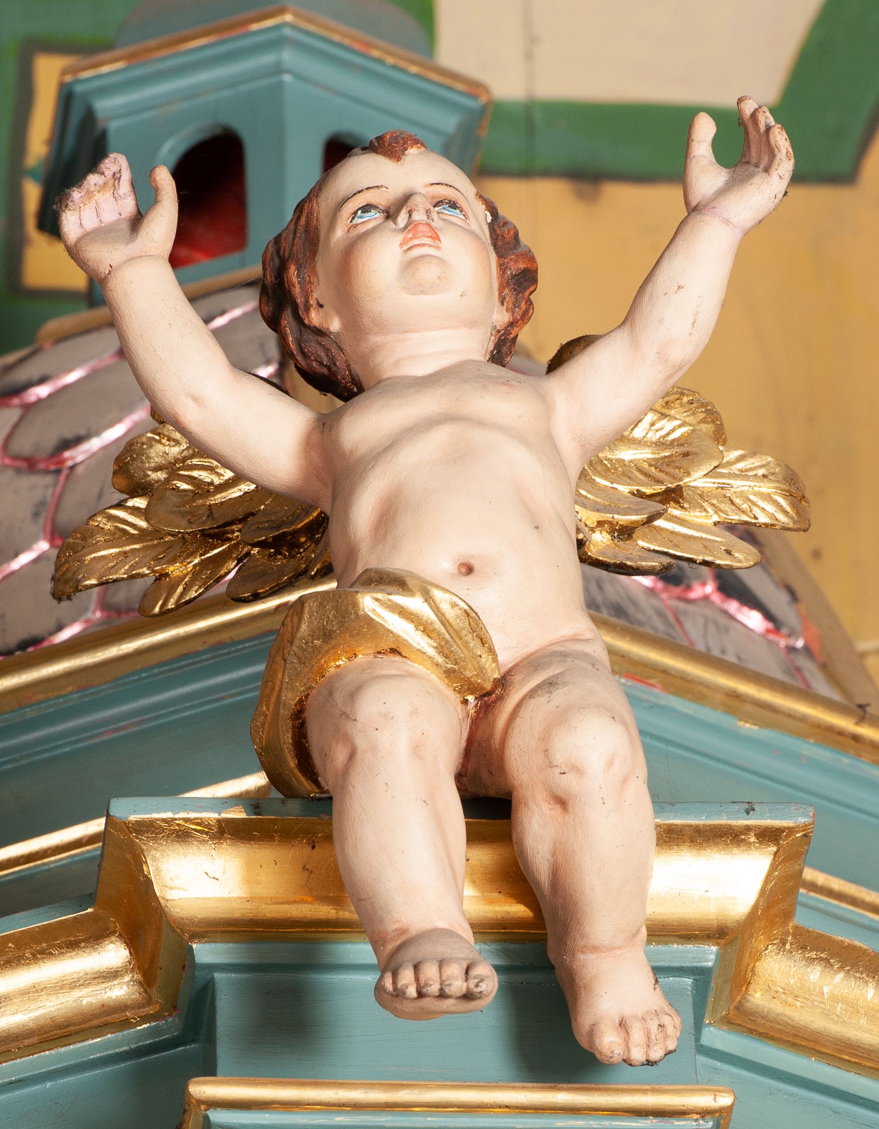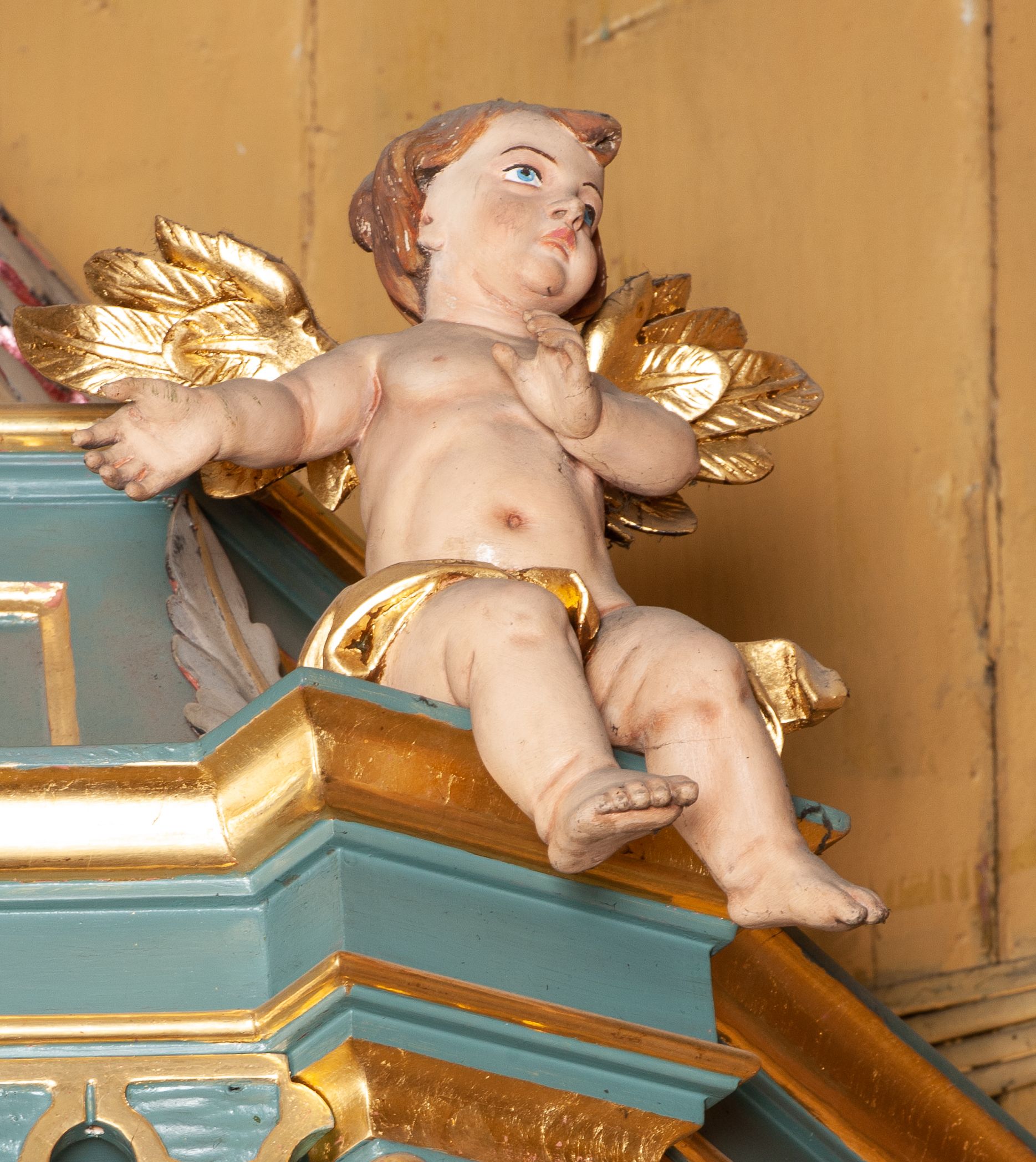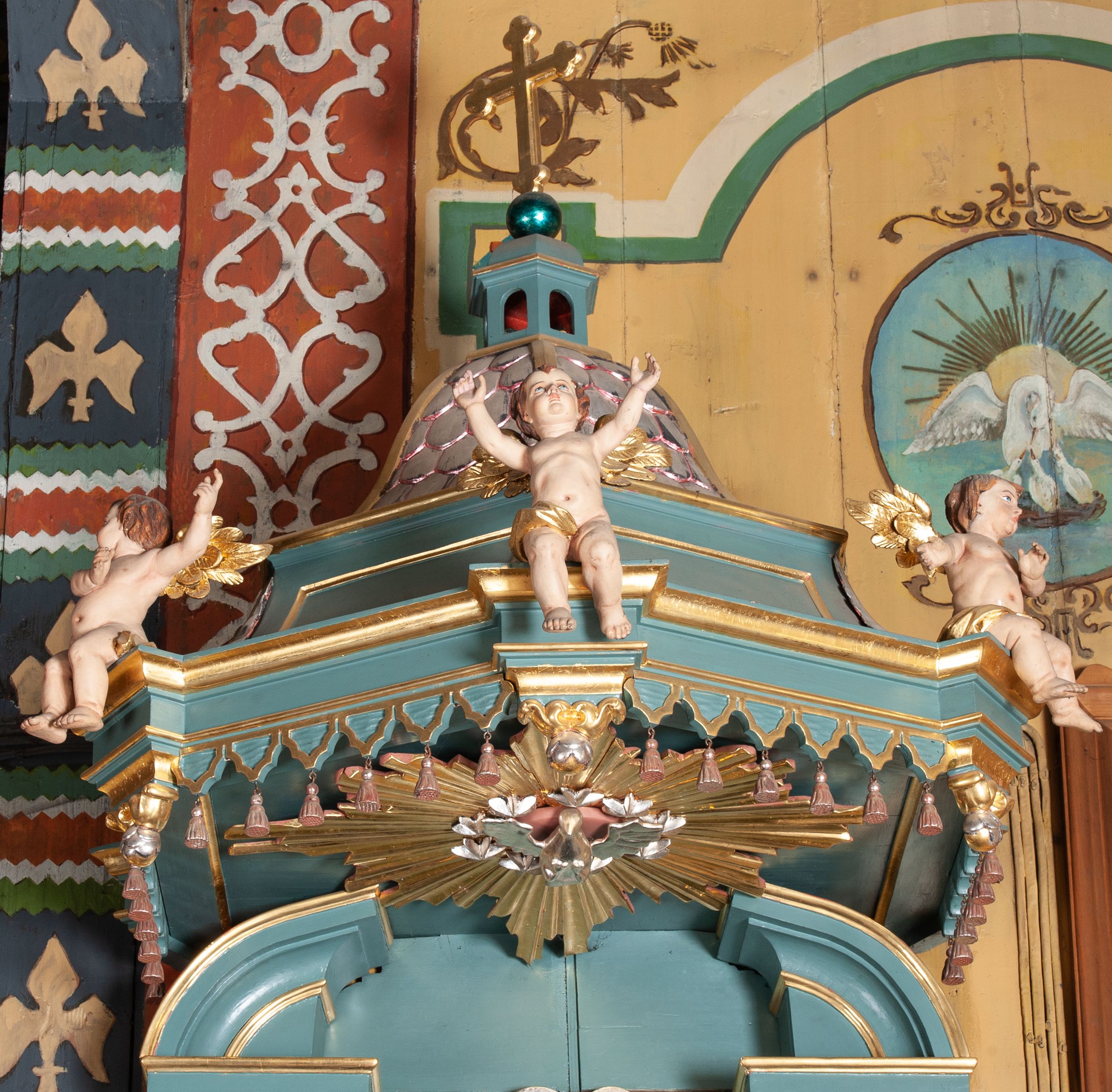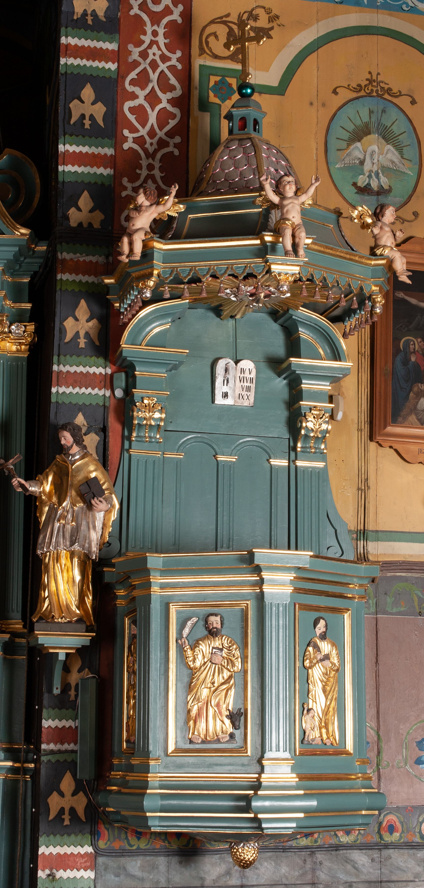 Struktura polichromowana w kolorze szaro-niebieskim, profile i ornamentyka złocone.
