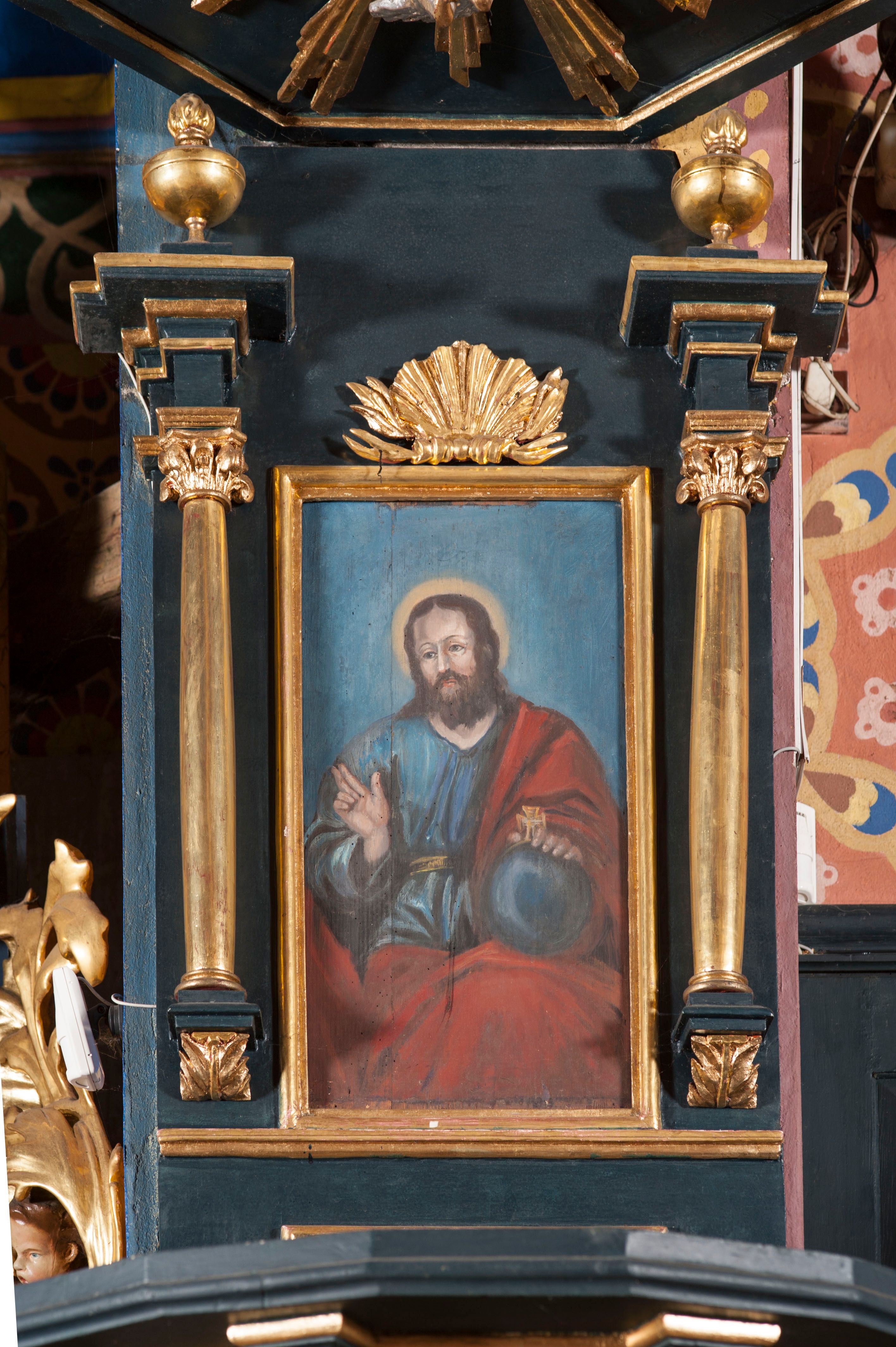 Ambona przyścienna, wisząca, z dostępem przez drzwi od strony zakrystii. Kosz wieloboczny, na cokole, z podwieszeniem w postaci ośmiu kabłąków, zakończonych szyszką. Ścianki kosza wydzielone kolumienkami podtrzymującymi wyłamane na ich osi belkowanie z silnie wysuniętym gzymsem tworzącym parapet. W polach nisze z płaskorzeźbionymi przedstawieniami ewangelistów. Po prawej stronie do kosza dobudowany ćwierćkolisty podest z pełną balustradą. Zaplecek wąski, ujęty dwiema kolumienkami stojącymi na wspornikach, podtrzymującymi imposty, na których stoją wazoniki. W dolnej części płycina. W polu obraz w formie stojącego prostokąta, ujęty ramą zakończoną muszlą, z przedstawieniem Chrystusa w typie Salvator Mundi. Baldachim na planie ośmioboku, w formie belkowania, na którym ustawione są kabłąki, podtrzymujące figurę anioła grającego na trąbie. Na podniebiu baldachimu figura gołębicy Ducha Świętego w glorii promienistej. Struktura polichromowana w kolorze niebiesko-zielonym; kolumienki, profile i ornamentyka złocone.