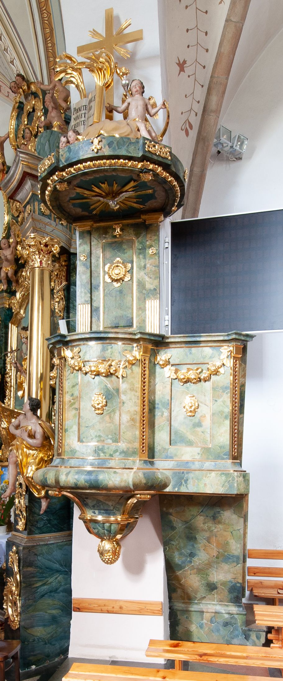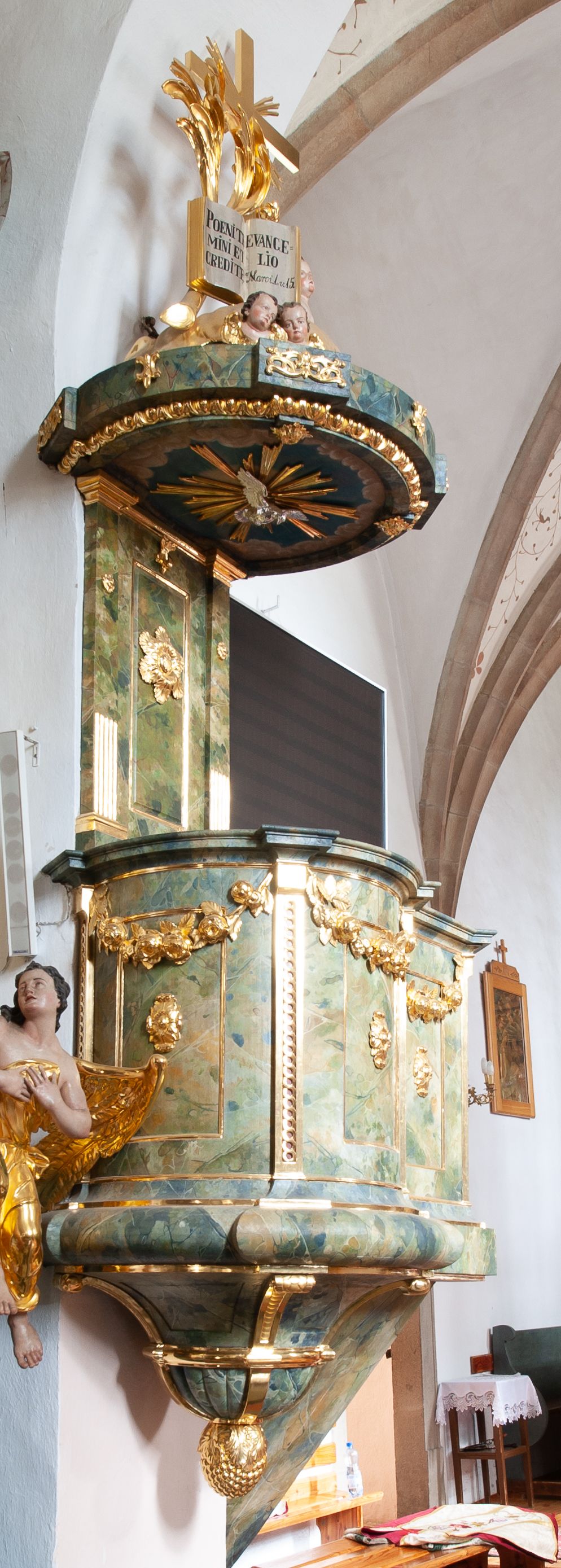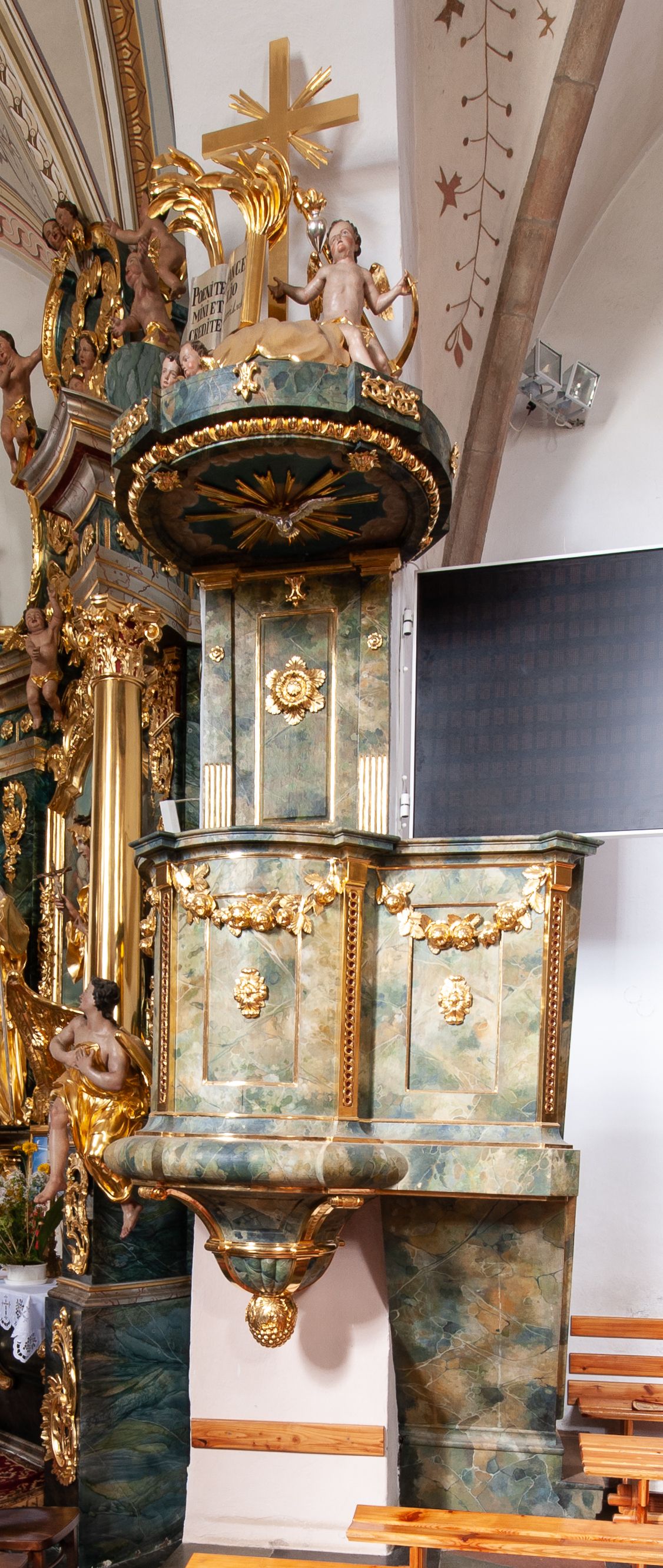 Ambona przyścienna, wisząca, z dostępem od strony prezbiterium w formie podestu i jednobiegowych schodów z pełną balustradą. Kosz na rzucie ściętego koła, na spłaszczonym wałku, z podwieszeniem o formie zbliżonej do stożka o wklęsłych bokach, ujętego czterema wolutami i pierścieniem, zakończonego szyszką. Ścianki kosza wydzielone wąskimi pilastrami, o trzonach dekorowanych plecionką, dźwigającymi gzyms stanowiący parapet, wyłamany na ich osi. W ich polach płyciny z rozetami, pod gzymsem podwieszone kwiatowe girlandy. Zaplecek wąski, flankowany dwoma pilastrami, kanelowanymi w dolnej partii trzonów, z rozetami w górnej. W polu płycina w formie stojącego prostokąta z dużą rozetą w środku, nad nią klucz. Baldachim na planie analogicznym do kosza, dekorowany kimationem oraz ornamentem roślinnym. Na nim rzeźbiony fragment skały z dwiema uskrzydlonymi główkami anielskimi, na którym leży otwarta księga z napisem „POENITE / MINI ET / CREDITE / EVANGE/LIO Marci 1. v(ersum) 15.”; za nią ustawione liście palm i duży krzyż, z promieniami na skrzyżowaniu belek. Obok, na skale siedzi putto, za nim gorejące serce i kotwica. Na podniebieniu baldachimu gołębica Ducha Świętego w glorii promienistej. Struktura ambony polichromowana na sposób imitujący marmoryzację w kolorze żółto-zielonym, detale i ornamentyka złocone.