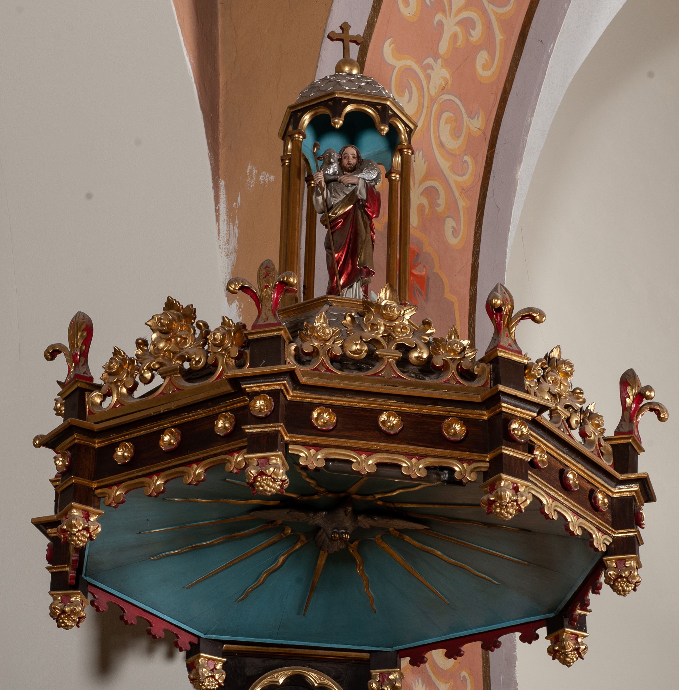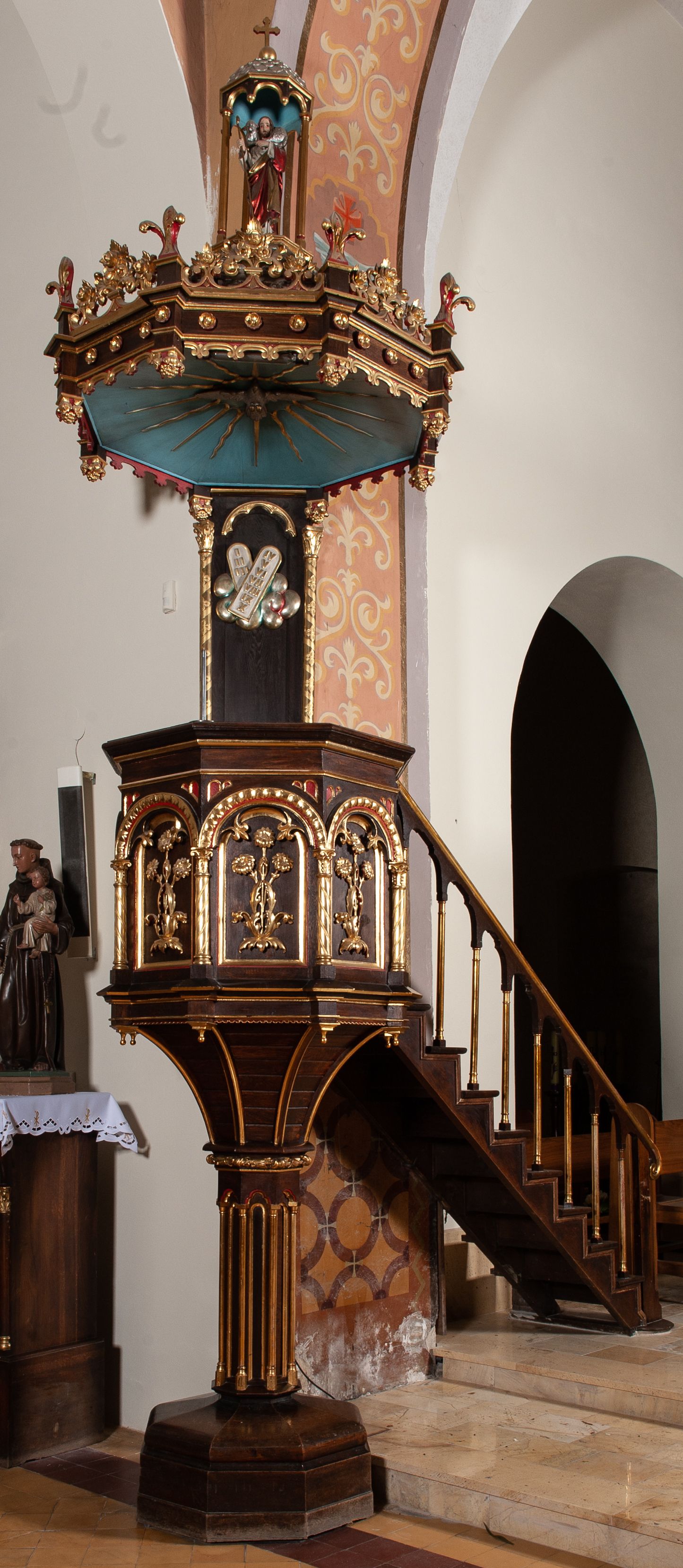 Ambona przyścienna, stojąca z dostępem w postaci jednobiegowych schodów z prawej strony, wsparta na ośmiobocznej podstawie przechodzącej w trzon zdobiony fryzem arkadkowym z kolumienkami. Kosz ośmioboczny, zamknięty profilowanym parapetem, dekorowany arkadami zamkniętymi łukiem półkolistym wspartym na skręconych kolumnach ujmujących krawędzie kosza. Wewnątrz arkad płyciny z aplikowanym motywem bukietów kwiatowych. Zaplecek w kształcie stojącego prostokąta, flankowany dwiema smukłymi kolumienkami. W polu, w płytkiej niszy dwie, rzeźbione tablice dekalogu umieszczone na obłokach. Baldachim na planie analogicznym do kosza, szerszy od niego, od dołu ujęty krenelażem, od góry rzeźbionym ornamentem ze spiętych wolut i kwiatonów, w podniebiu na jasnobłękitnym tle rzeźbiona gołębica Ducha Świętego otoczona promieniami. W zwieńczeniu figura Dobrego Pasterza pod niewielkim baldachimem, nakrytym kopułą, zakończoną krzyżem. Struktura malowana w kolorze naturalnego drewna, ornamentyka złocona, detale czerwone i srebrzone.