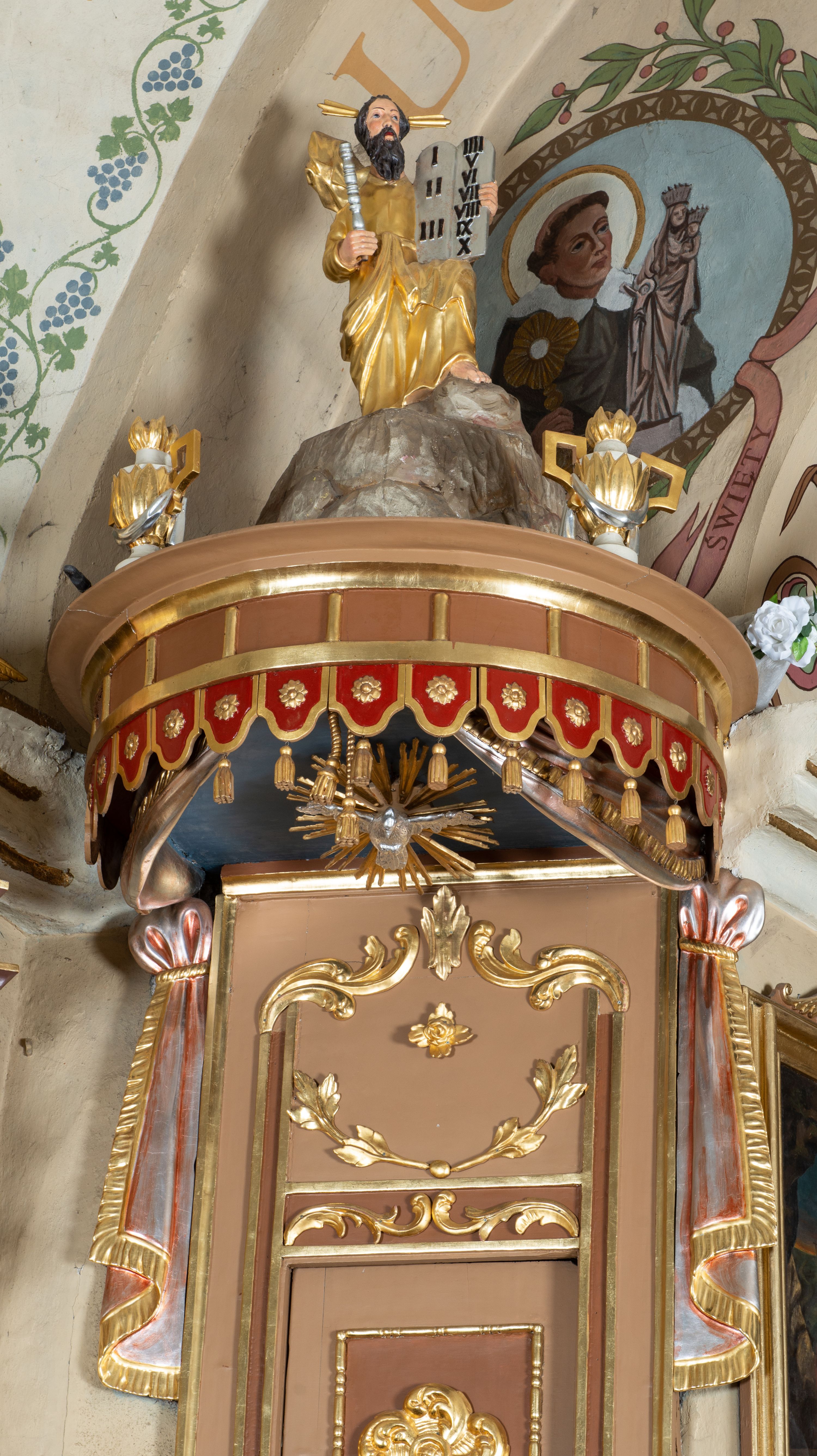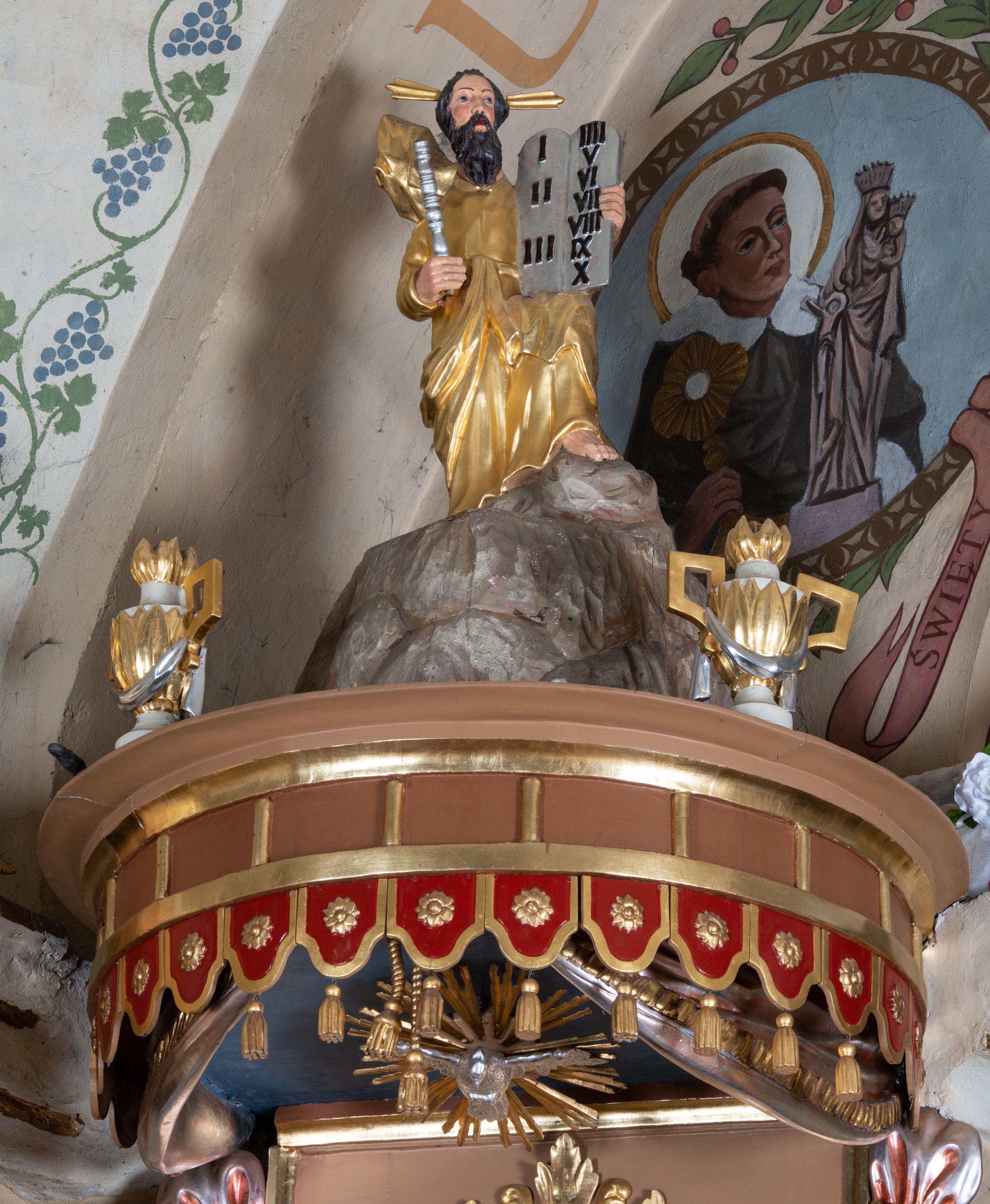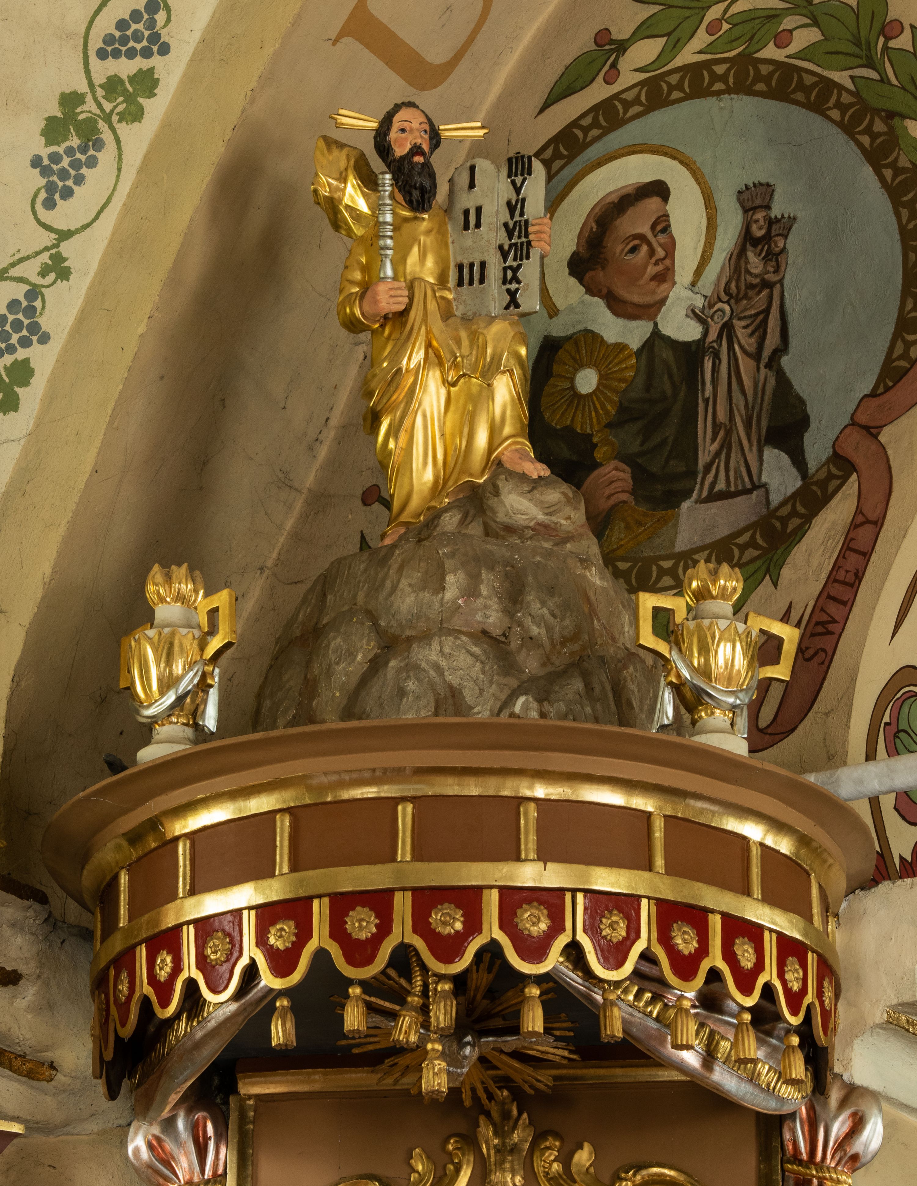 W zwieńczeniu na wysokiej skale ustawiona jest rzeźba Mojżesza, ukazana frontalnie, z lewą nogą wspartą na skale, z tablicą przykazań w lewym ręku i laską w prawej. Mojżesz ubrany w długą, złotą suknię z długim rękawem. Twarz podłużna, okolona długą, ciemnobrązową brodą i krótkimi, ciemnobrązowymi włosami.