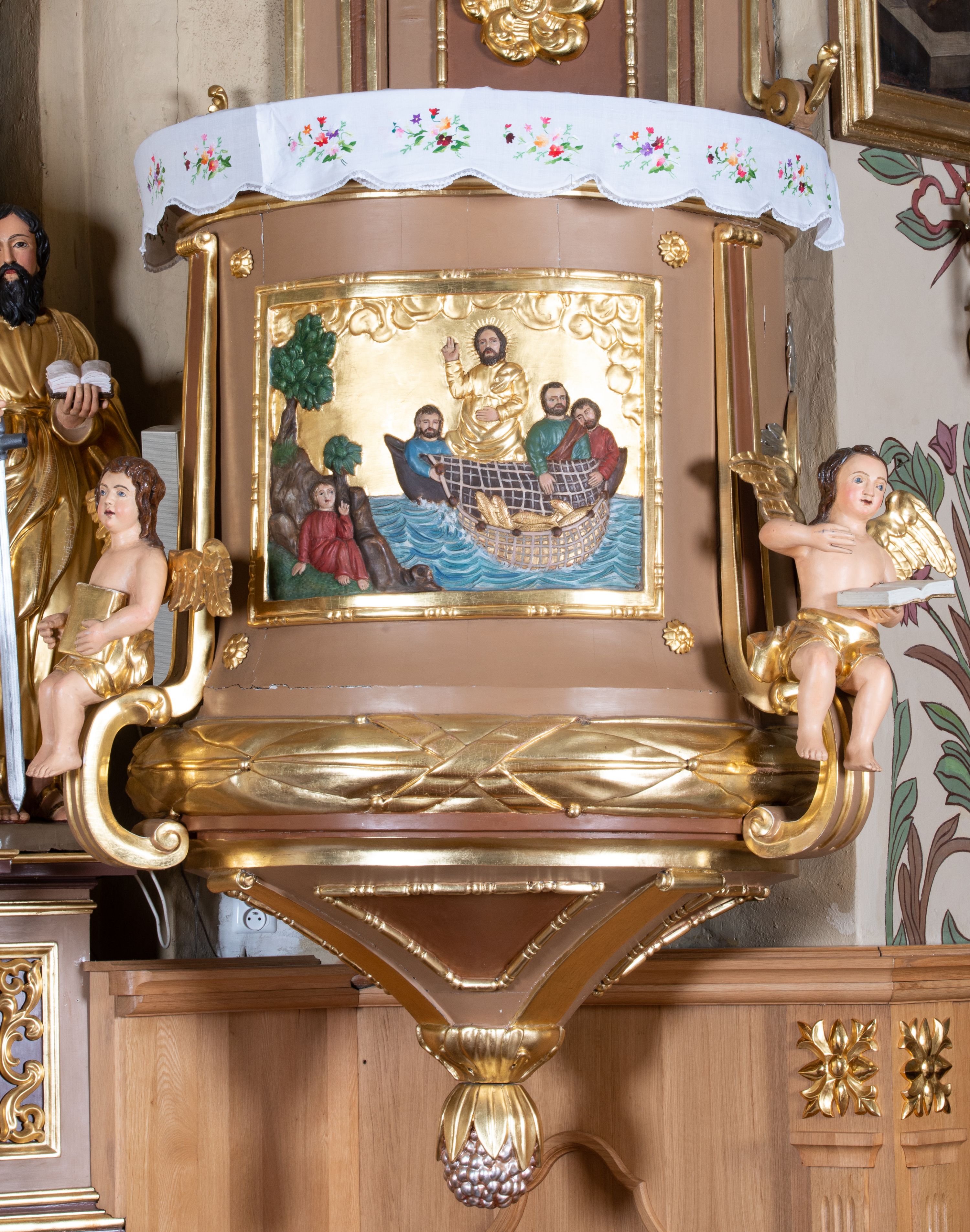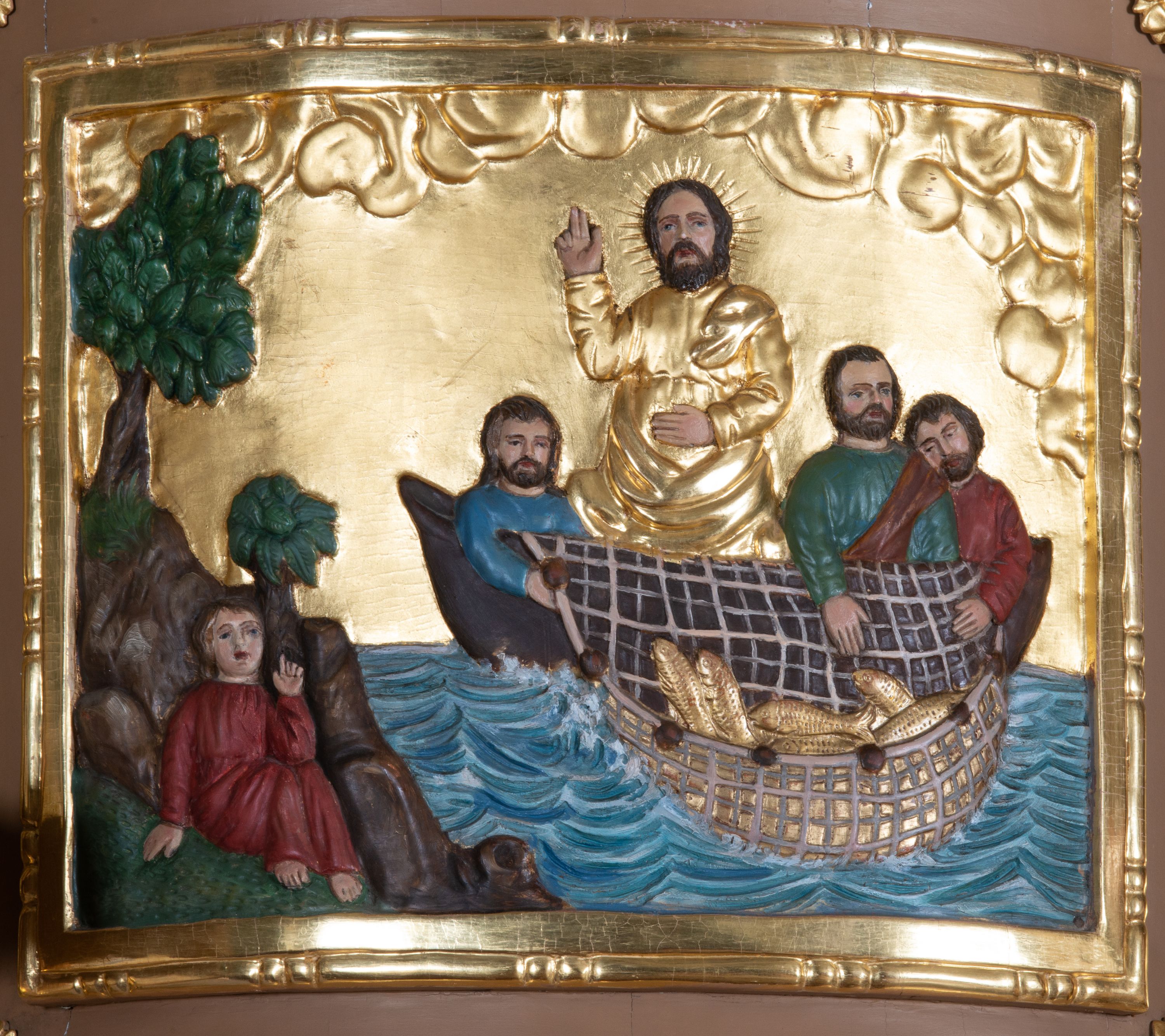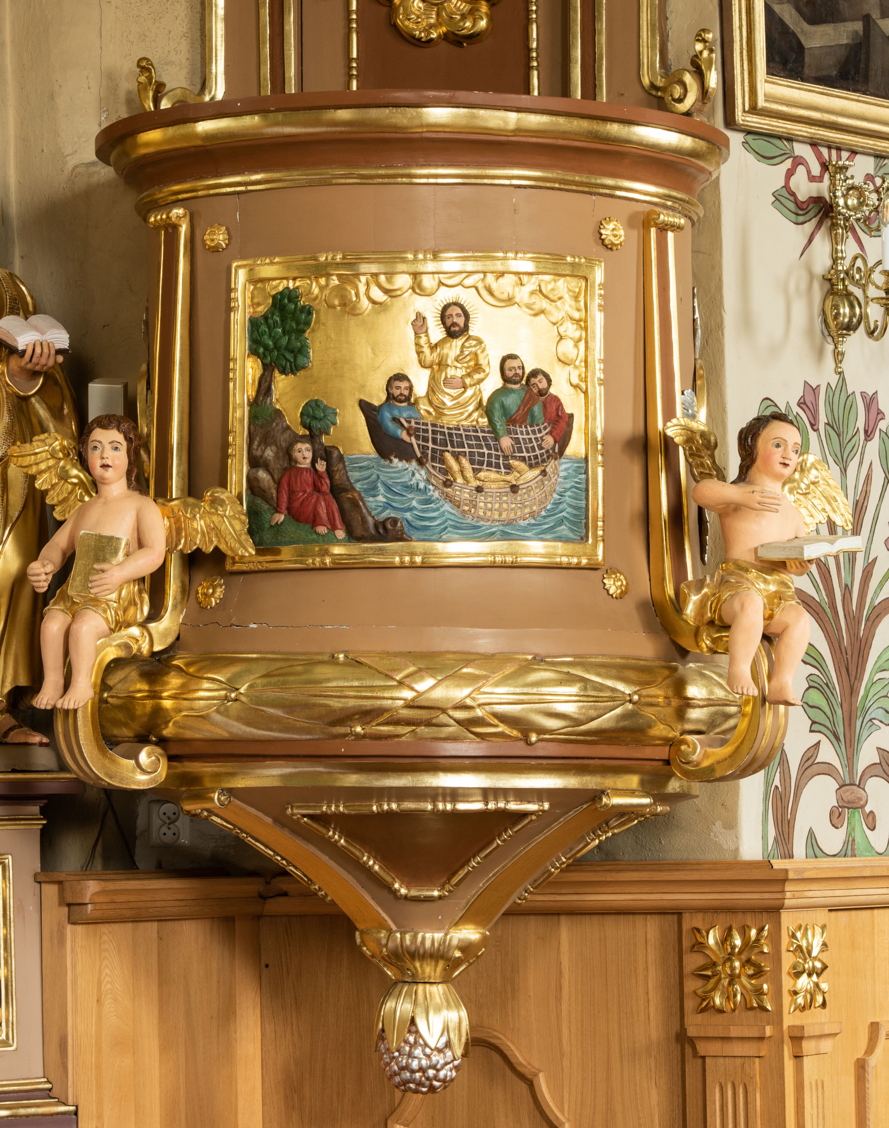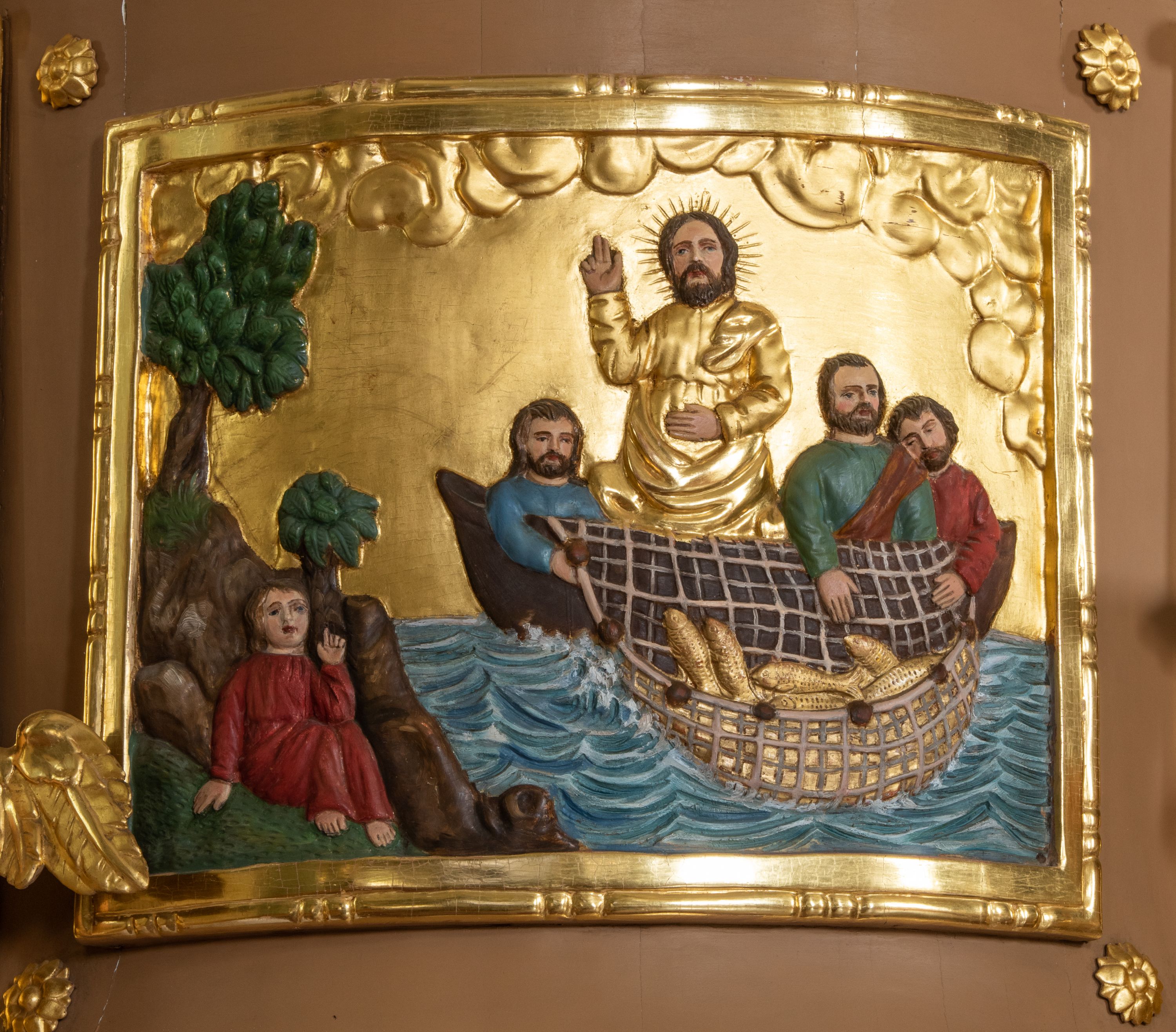Płaskorzeźba na ściance frontowej kosza z przedstawieniem Połowu ryb. Kompozycja wielopostaciowa z ukazaniem po prawej stronie Jezusa nauczającego w łodzi oraz trzech uczniów wyciągających sieć pełną ryb. Po lewej stronie na brzegu siedząca postać jednego z uczniów. Uczniowie ubrani w długie suknie z długimi rękawami w kolorach: czerwonym, niebieskim i zielonym. Jezus ubrany jest w długą, złotą suknię z długim rękawem i złoty płaszcz. Krajobraz ukazany sumarycznie z wyraźnie zaznaczonymi falami morskimi. Tło złocone, ze złoconymi obłokami.