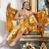 Figura ukazana w pozycji siedzącej, frontalnie, z głową skierowaną w lewo i nogami zwróconymi w drugą stronę. Prawą rękę ma złożoną na piersi, lewą wyciągniętą w bok. Twarz ma szczupłą, o migdałowatych oczach, zadartym nosie i rozchylonych ustach, okoloną kręconymi, ciemnobrązowymi włosami, opadającymi na ramiona. Anioł ubrany jest w złoconą szatę opasującą ciało, przepasaną w talii, zawiniętą na lewym ramieniu, odsłaniającą część torsu, lewą nogę. Skrzydła ma złocone, duże i złożone po bokach postaci. Polichromia ciała naturalistyczna.