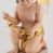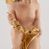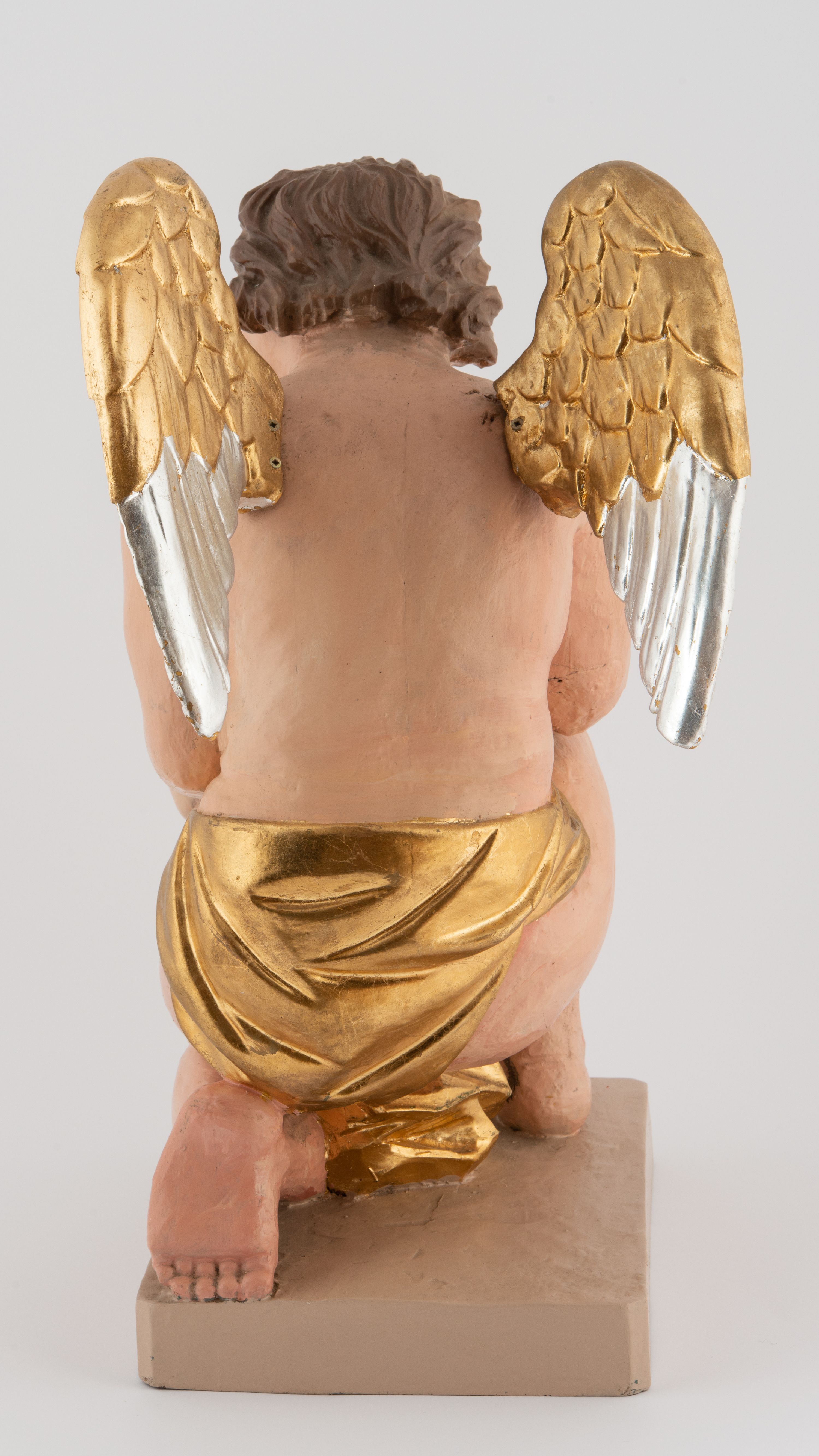 Pełnoplastyczna figura uskrzydlonego anioła ustawiona na niskim prostopadłościennym, beżowym cokole o ściętych narożach. Anioł zwrócony w lewo, klęczący na lewej nodze, z głową pochyloną delikatnie do przodu, z girlandą w dłoniach. Twarz okrągła o pełnych policzkach, z długim nosem i dużymi oczami. Włosy średniej długości, brązowe, zawinięte w duże loki do tyłu i z jednym kosmykiem na czole. Wokół bioder ma założoną złotą chustę. Polichromia w odsłoniętych partiach ciała naturalistyczna, końcówki skrzydeł srebrzone.