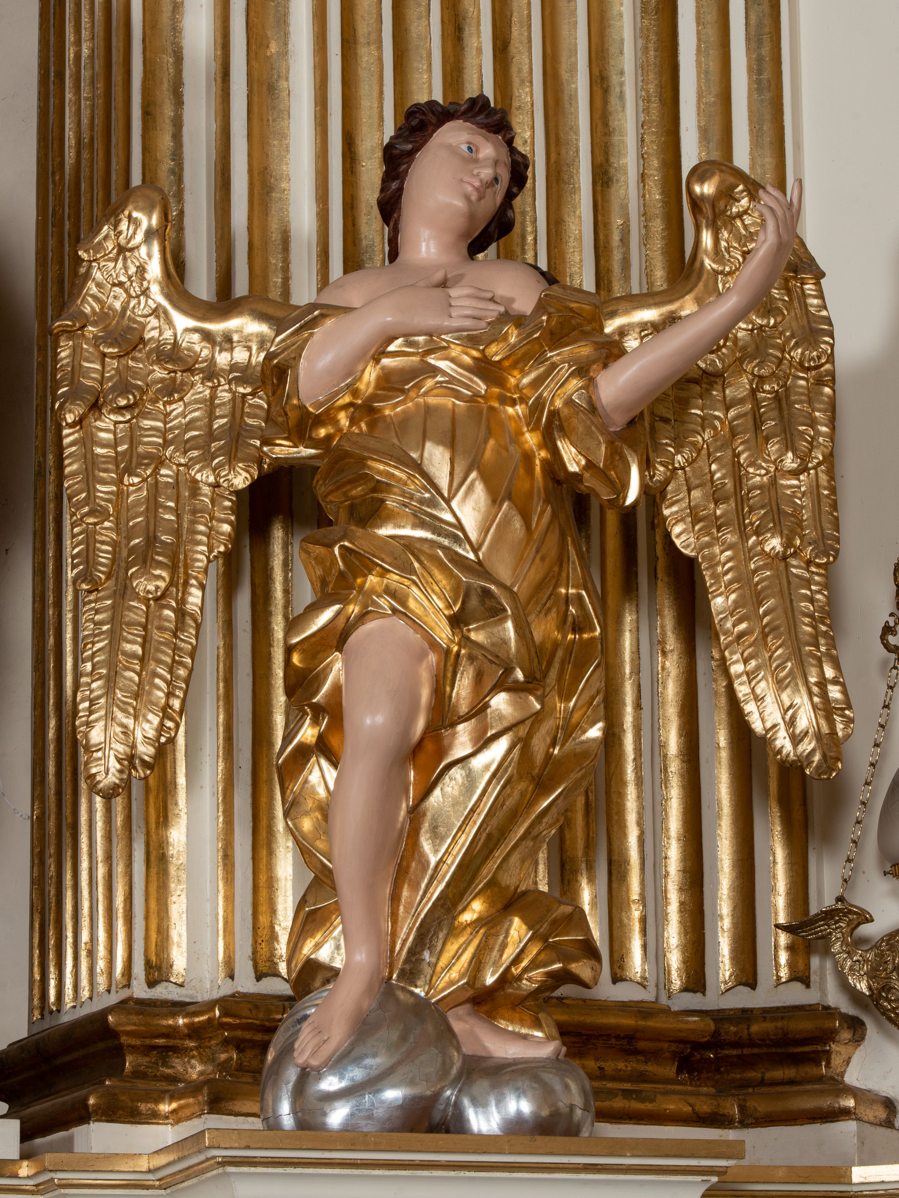 Figura anioła jest ścięta i drążona z tyłu. Ustawiono ją na rzeźbionym obłoku. Anioł ujęty został frontalnie w kontrapoście, z głową zwróconą w lewo. Prawą rękę ma złożoną na piersi, a uniesioną lewą zwróconą w bok. Ma owalną twarz okoloną krótkimi, kręconymi włosami, okrągłe, niebieskie oczy, pełne usta, mały nos. Anioł ubrany jest w tunikę z szerokimi rękawami, odsłaniającą ramiona i prawe kolano. Na prawej nodze widoczny jest fragment zawiniętego płaszcza. Skrzydła anioła są złożone. Ciało zostało polichromowane naturalnie, natomiast suknia, płaszcz i skrzydła wyzłocono, a obłok posrebrzono.