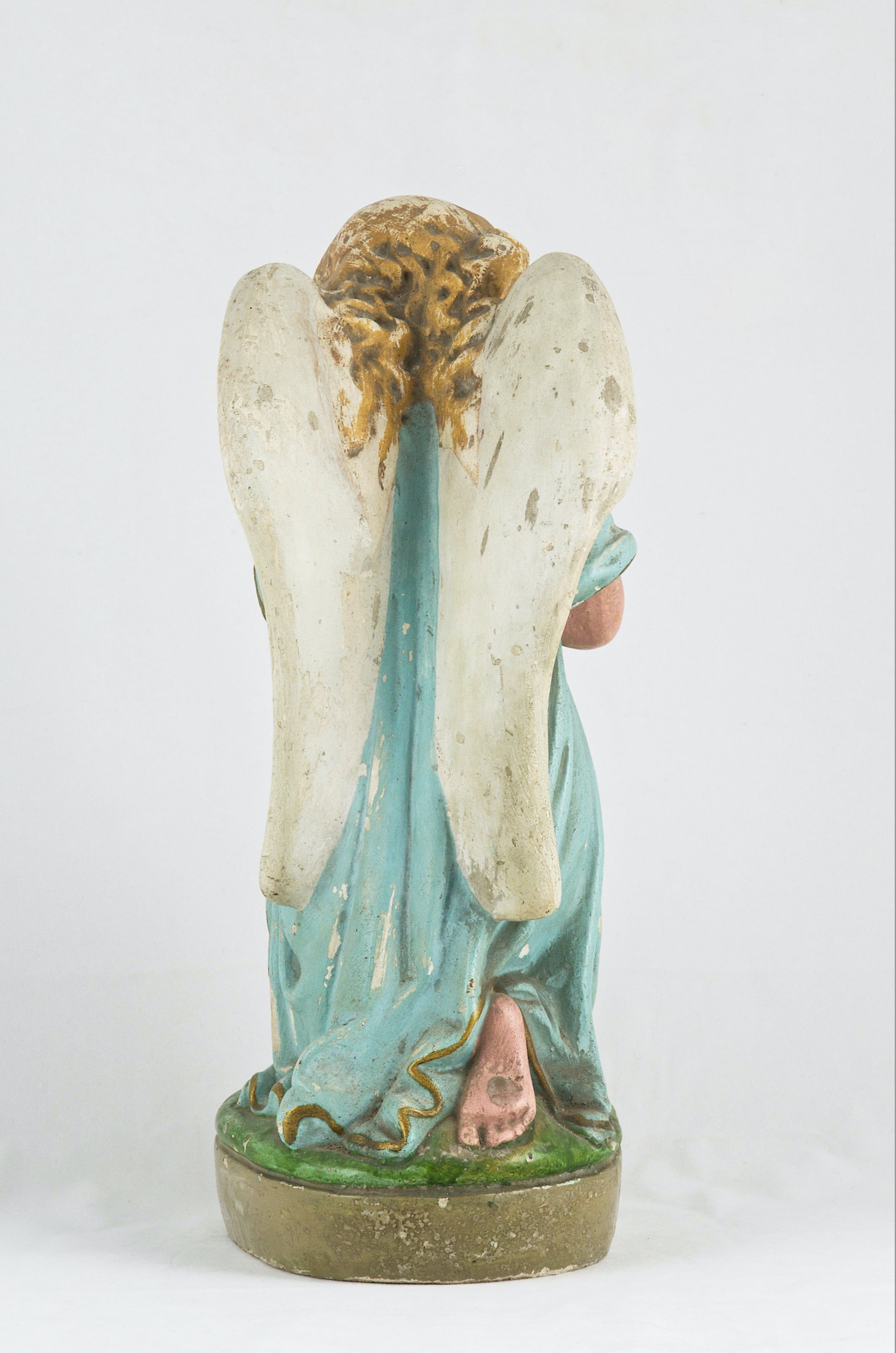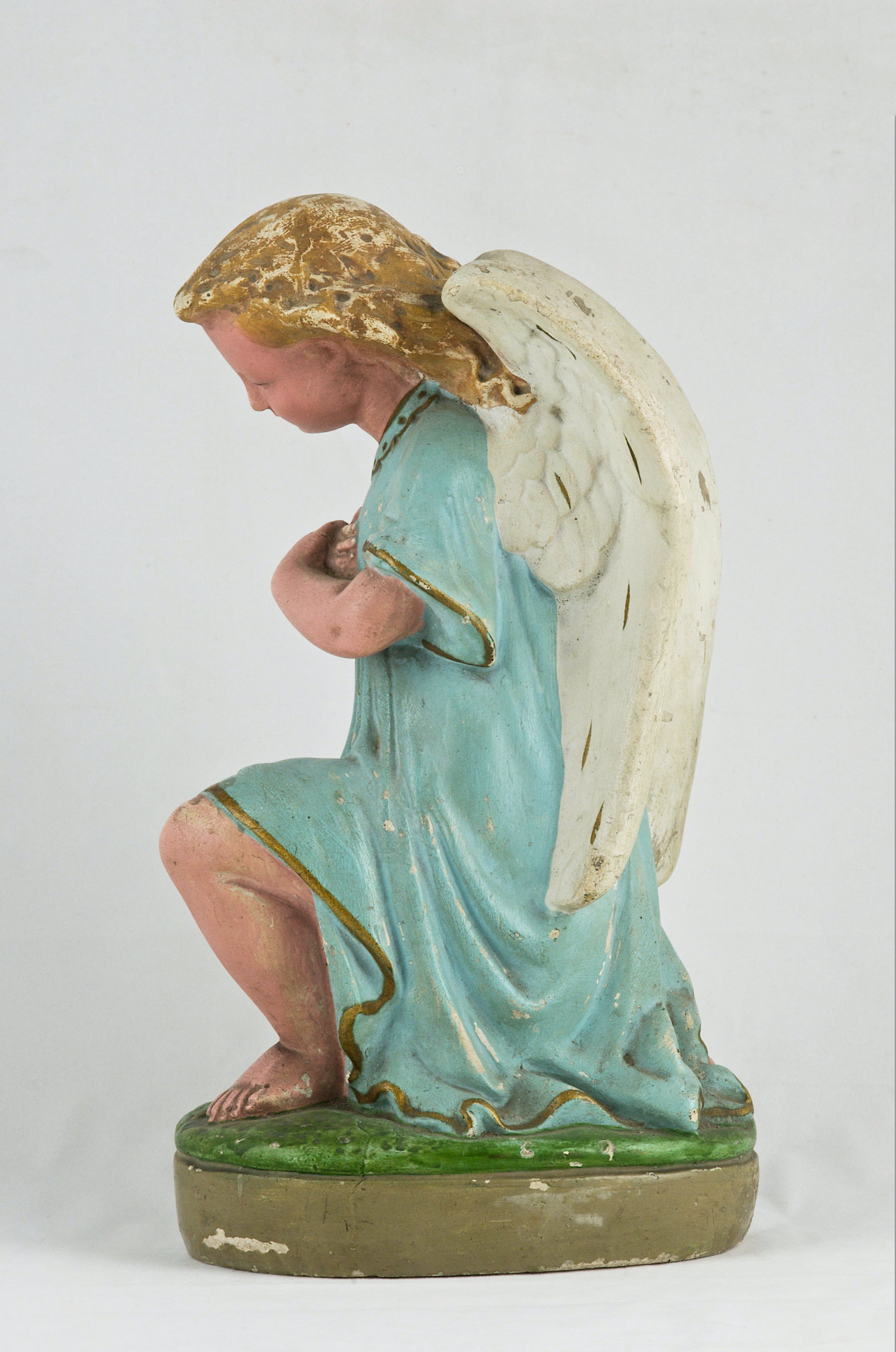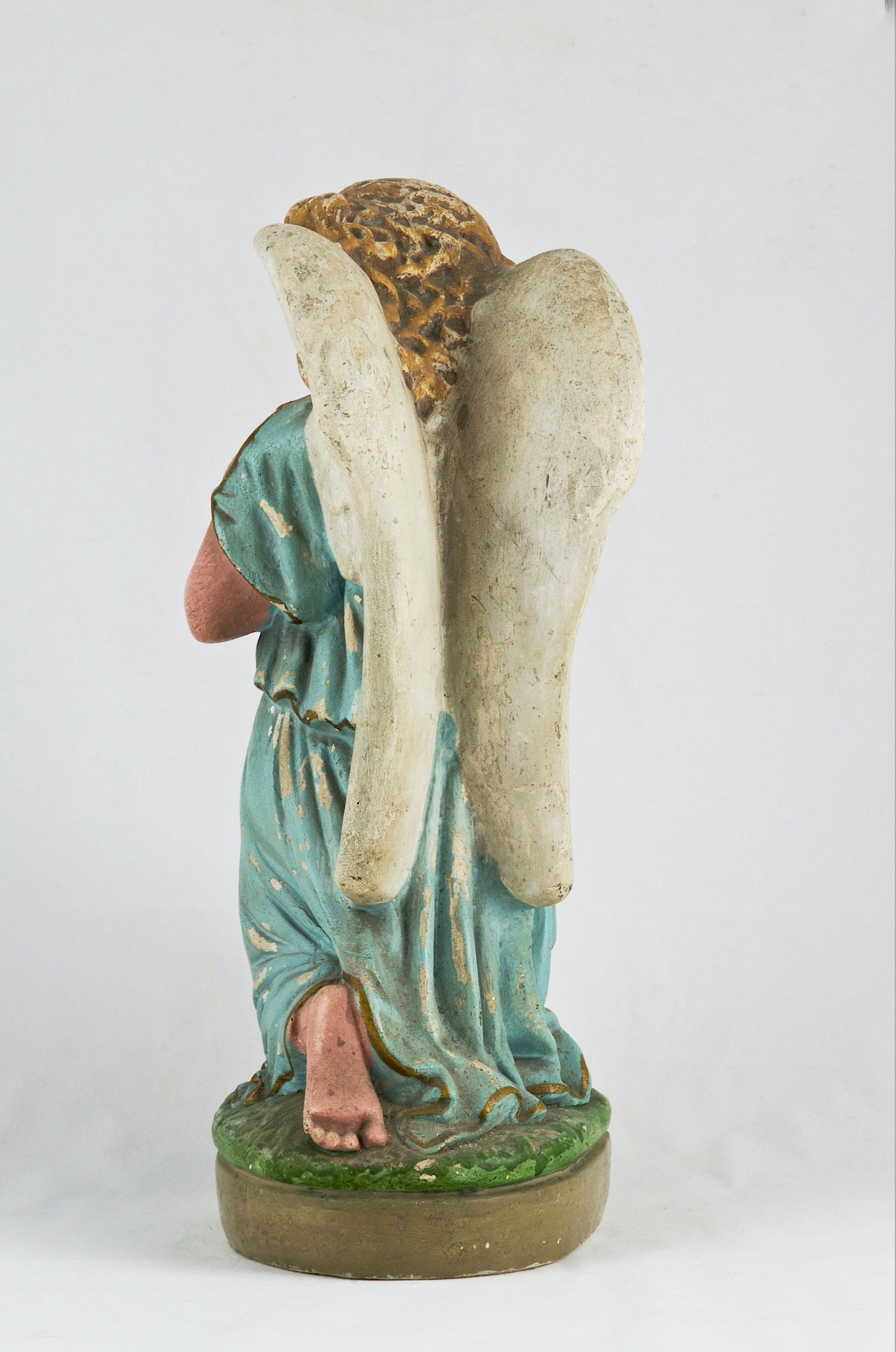 Dwudziestowieczna figurka anioła pełniła funkcję dekoracyjną albo była częścią większej sceny figuralnej.